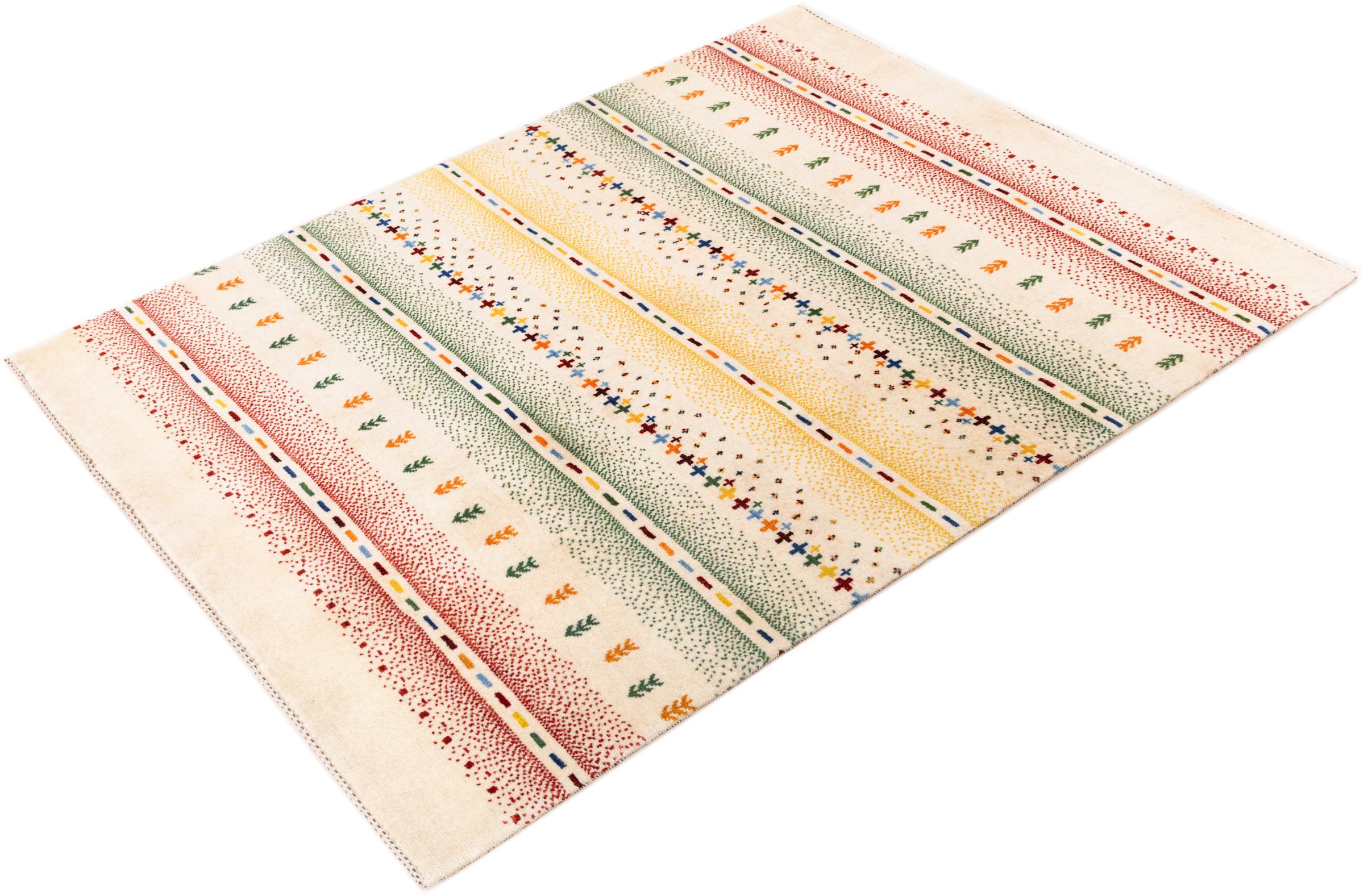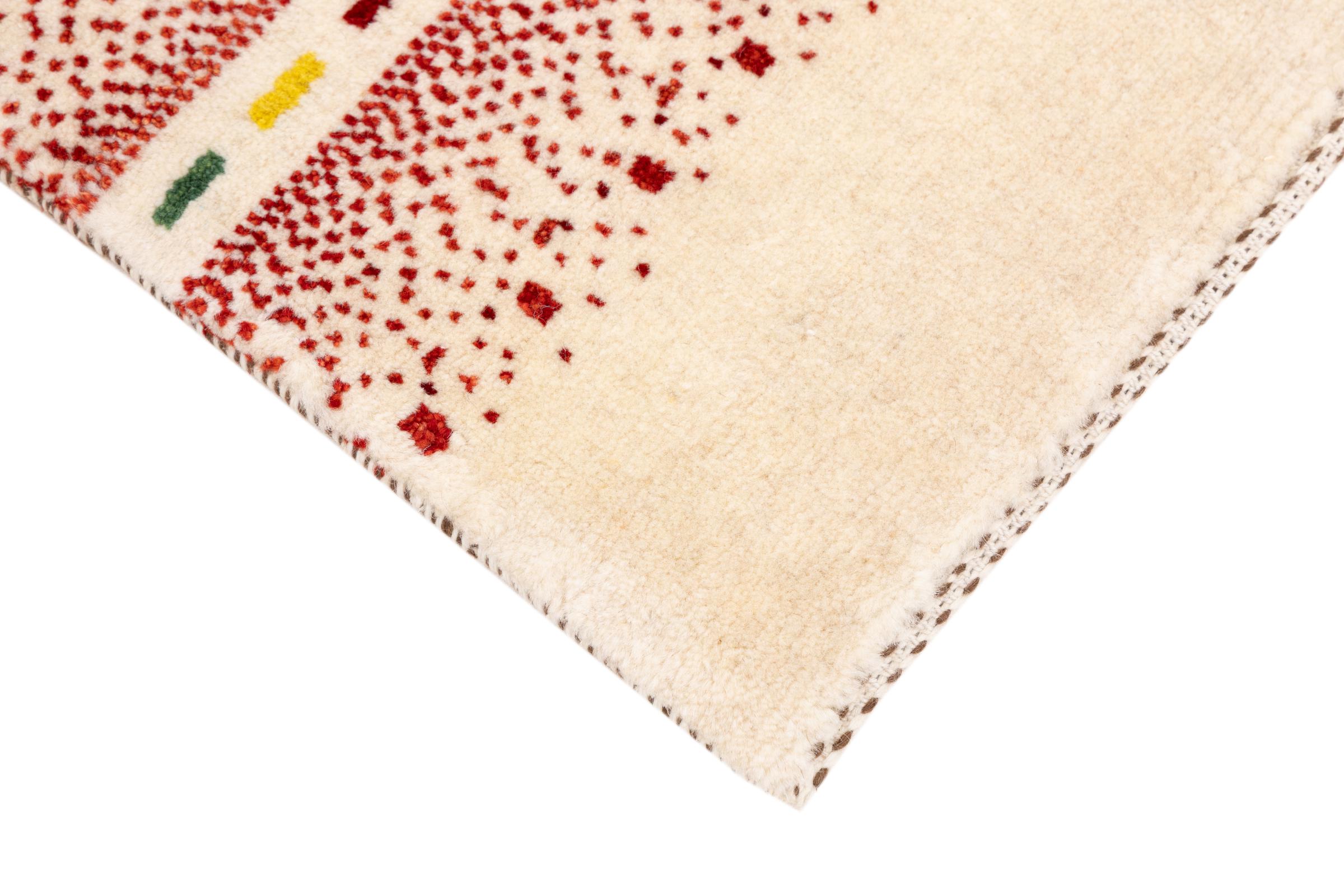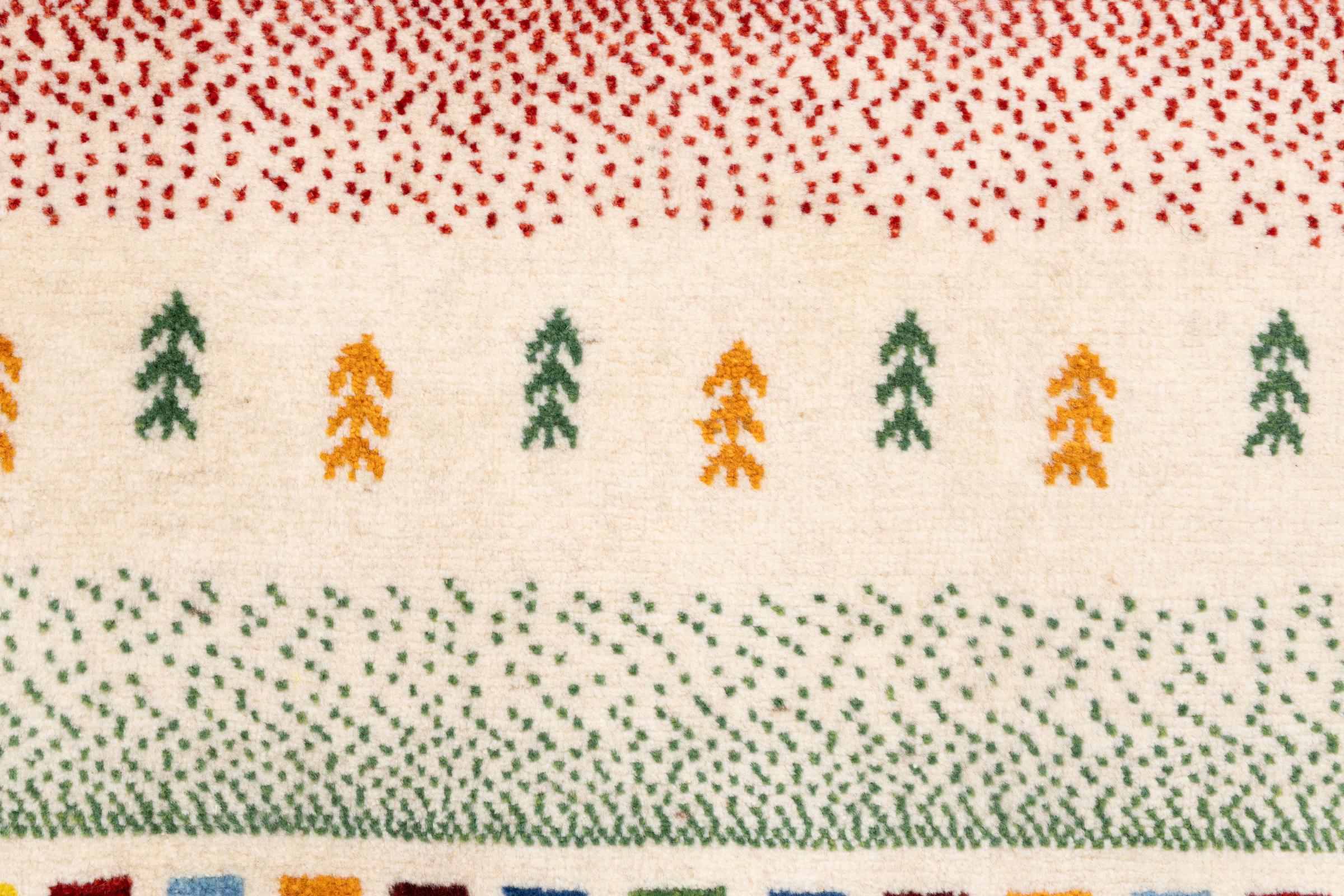 Dette smukke tæppe er en persisk Gabbeh og er en af ​​de højeste kvalitet Gabbeh tæpper. Tæpper er knyttet af nomader eller semi-nomader i Iran ved hjælp af traditionelt håndværk. De enkle motiver og mønstre er for det meste inspireret af nomadernes umiddelbare omgivelser. F.eks. Kan kameler, træer eller buske findes på traditionelle tæpper. Persiske Gabbeh-tæpper er lavet af uld fra lokale fårbesætninger. Ulden er derfor for det meste spundet for hånd. Hver af disse orientalske tæpper udgør en unik karakter af århundreder gammel kultur.