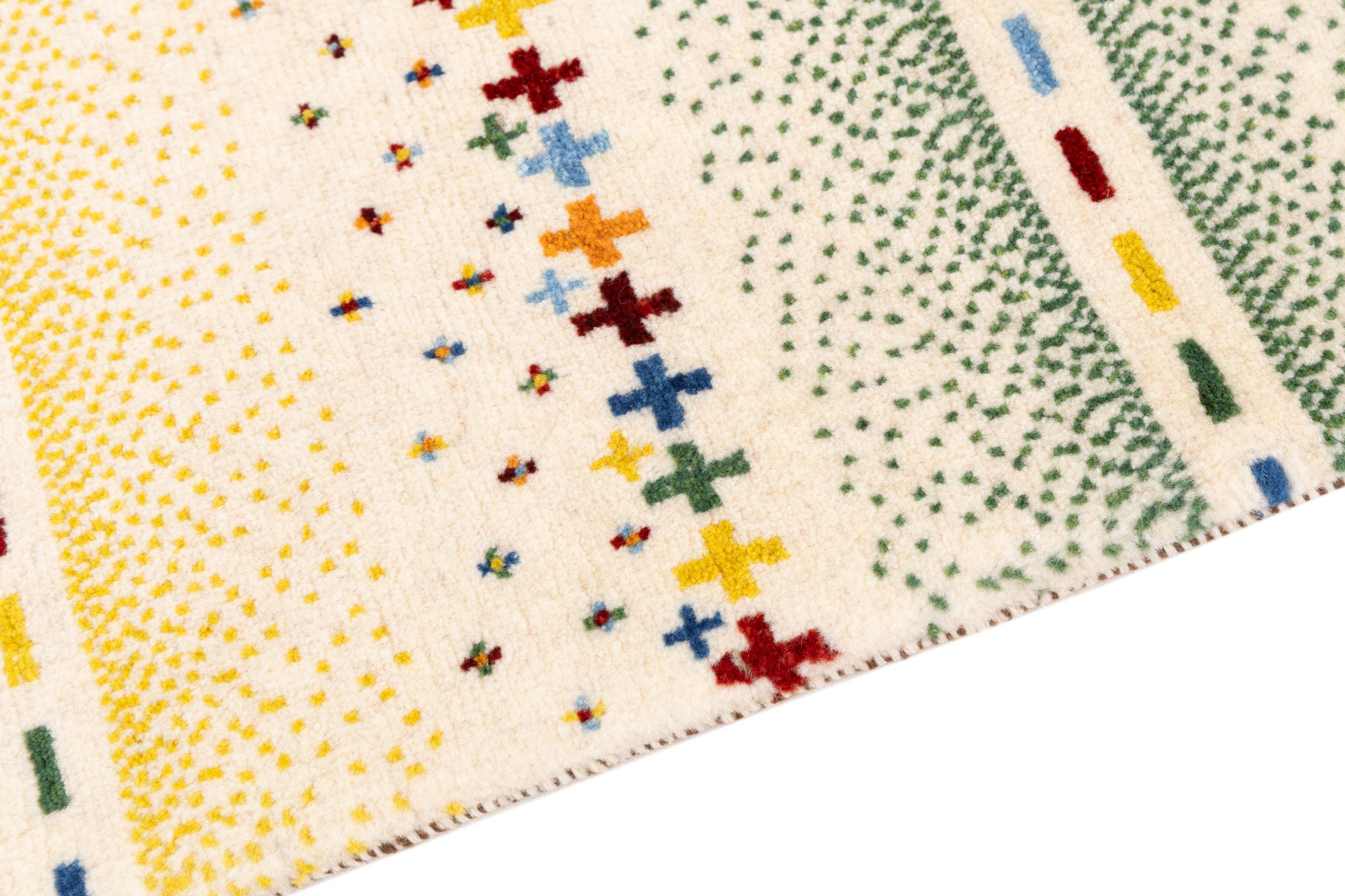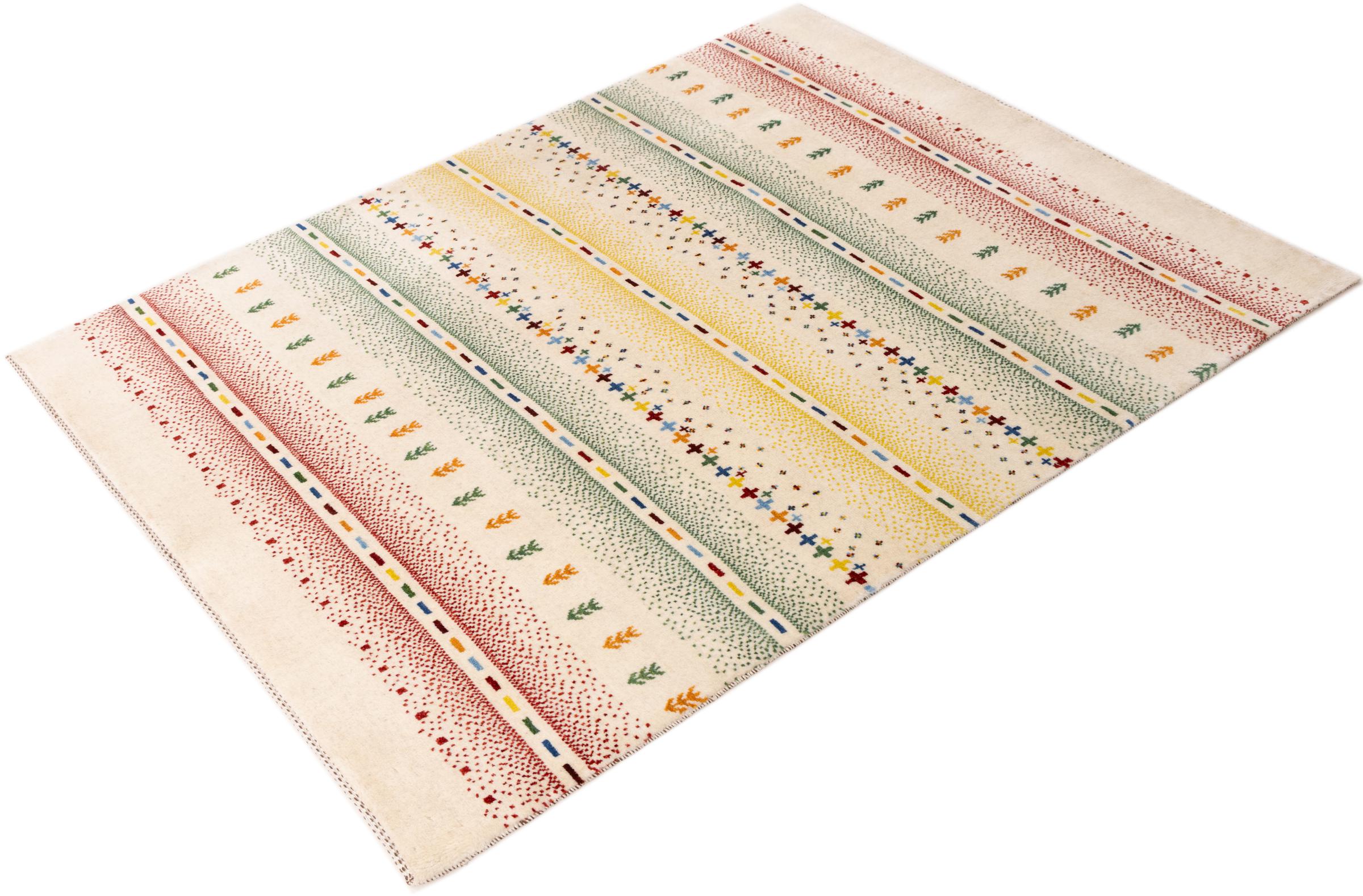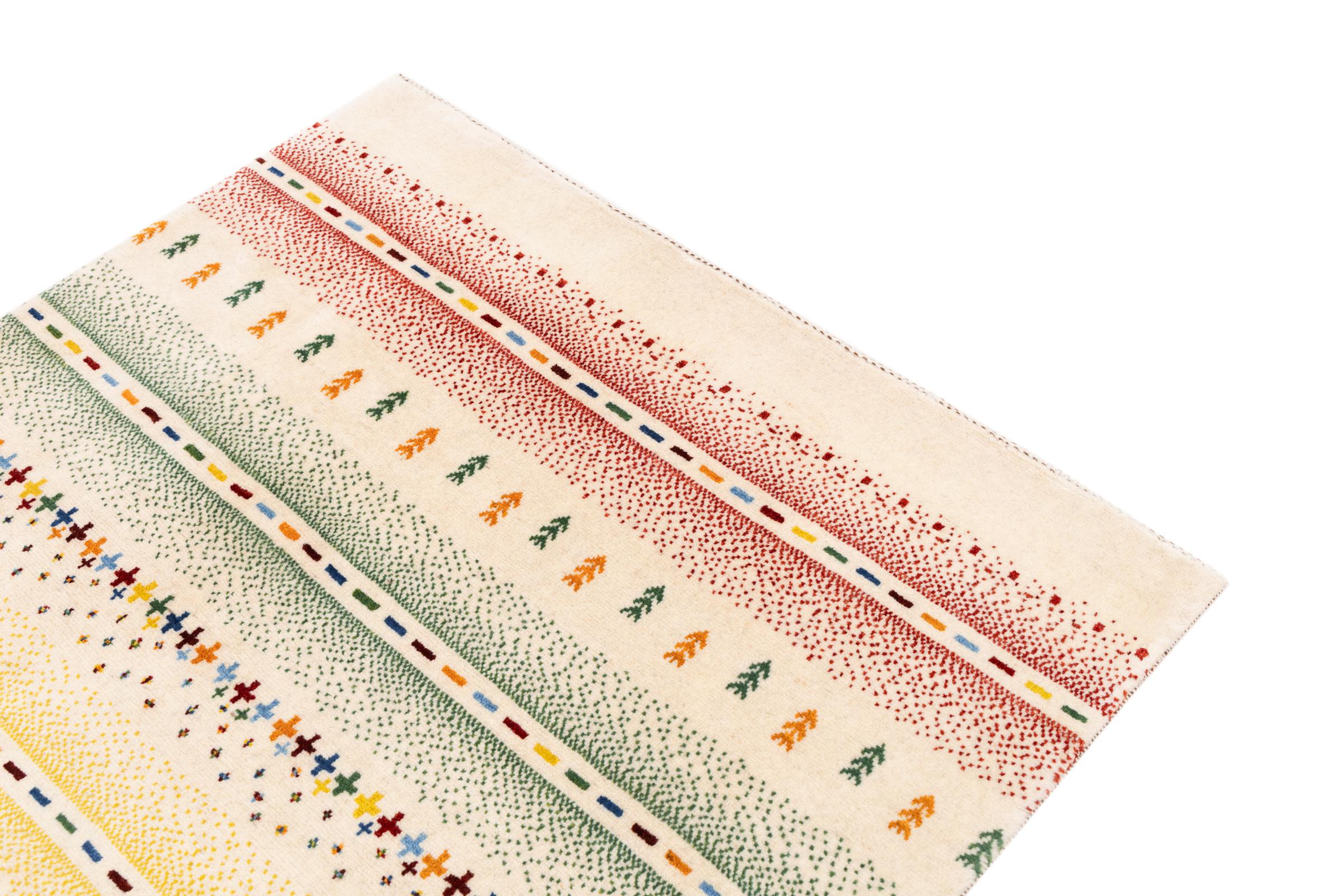 Dette smukke tæppe er en persisk Gabbeh og er en af ​​de højeste kvalitet Gabbeh tæpper. Tæpper er knyttet af nomader eller semi-nomader i Iran ved hjælp af traditionelt håndværk. De enkle motiver og mønstre er for det meste inspireret af nomadernes umiddelbare omgivelser. F.eks. Kan kameler, træer eller buske findes på traditionelle tæpper. Persiske Gabbeh-tæpper er lavet af uld fra lokale fårbesætninger. Ulden er derfor for det meste spundet for hånd. Hver af disse orientalske tæpper udgør en unik karakter af århundreder gammel kultur.