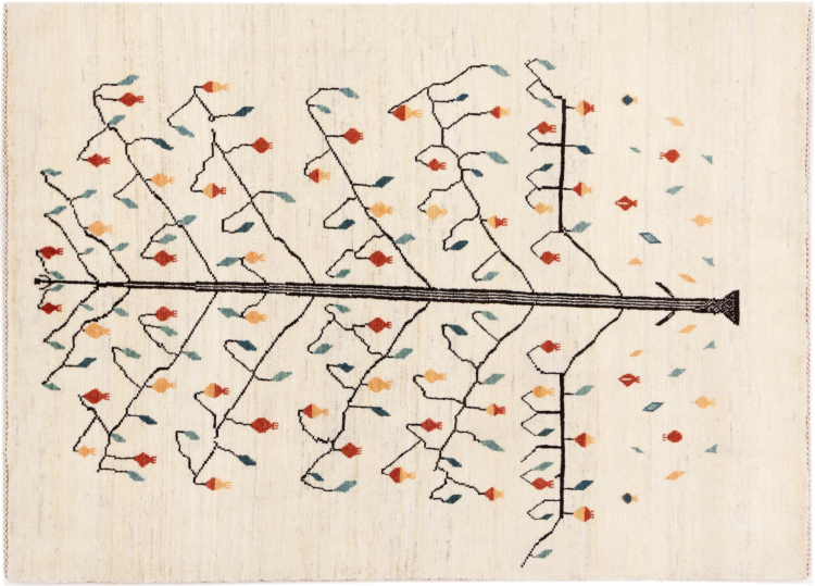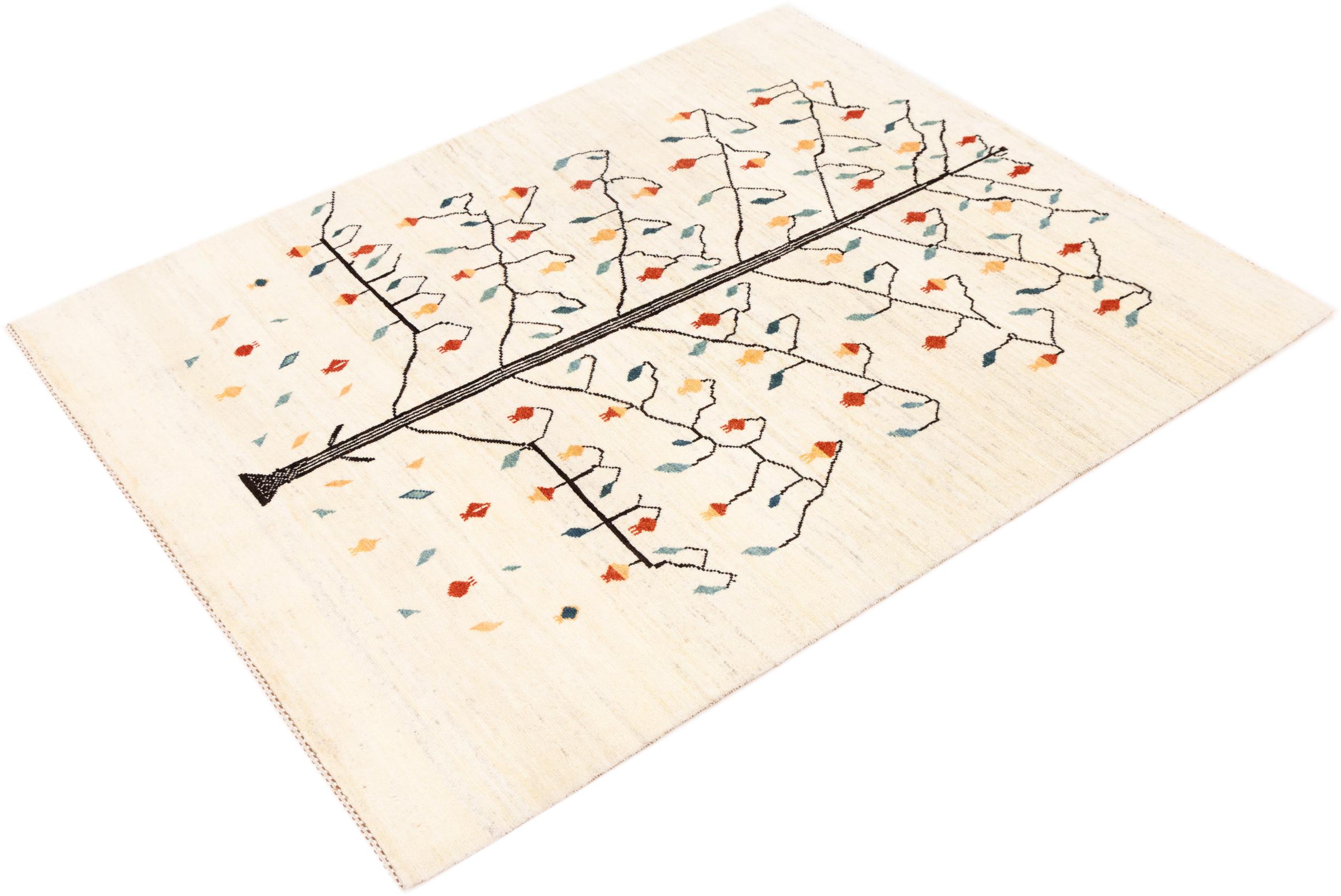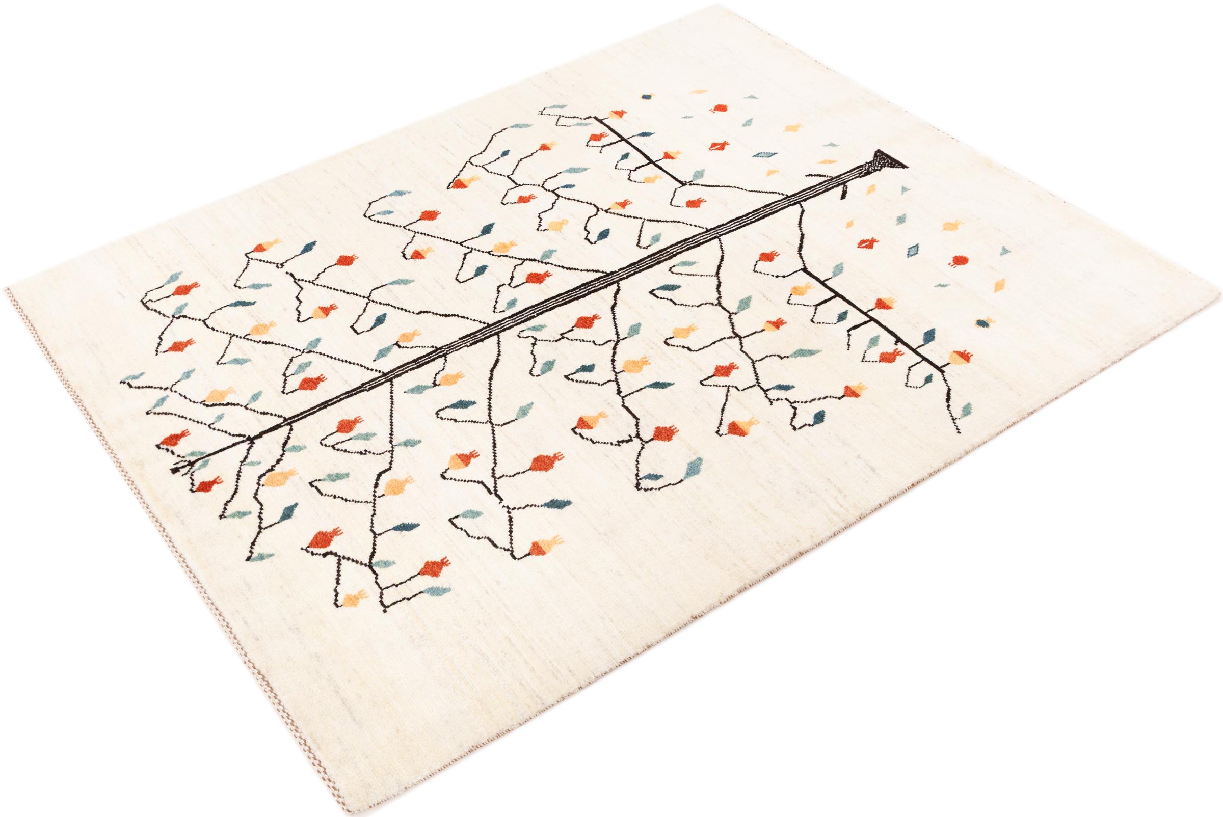 Dette smukke tæppe er en persisk Gabbeh og er en af ​​de højeste kvalitet Gabbeh tæpper. Tæpper er knyttet af nomader eller semi-nomader i Iran ved hjælp af traditionelt håndværk. De enkle motiver og mønstre er for det meste inspireret af nomadernes umiddelbare omgivelser. F.eks. Kan kameler, træer eller buske findes på traditionelle tæpper. Persiske Gabbeh-tæpper er lavet af uld fra lokale fårbesætninger. Ulden er derfor for det meste spundet for hånd. Hver af disse orientalske tæpper udgør en unik karakter af århundreder gammel kultur.