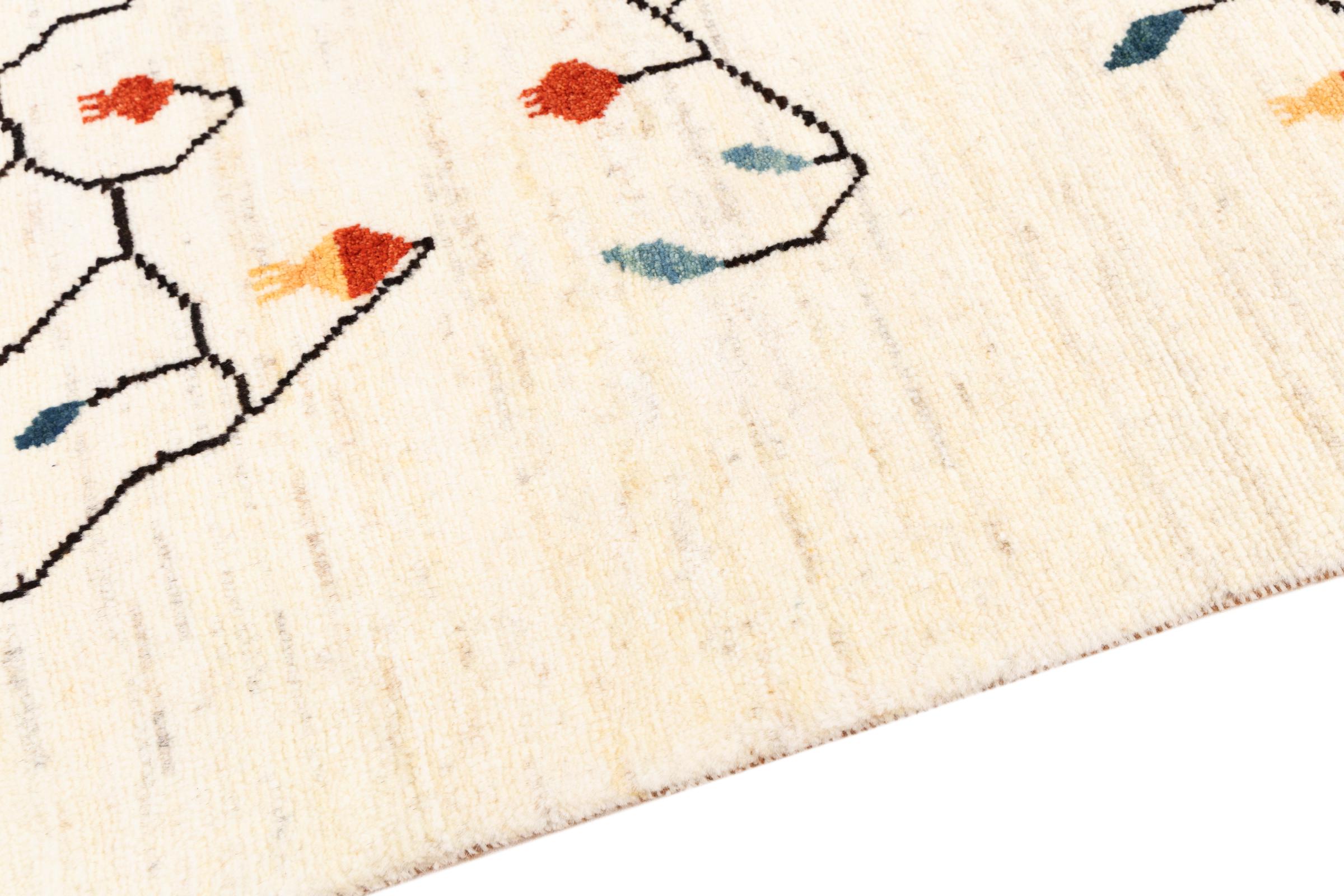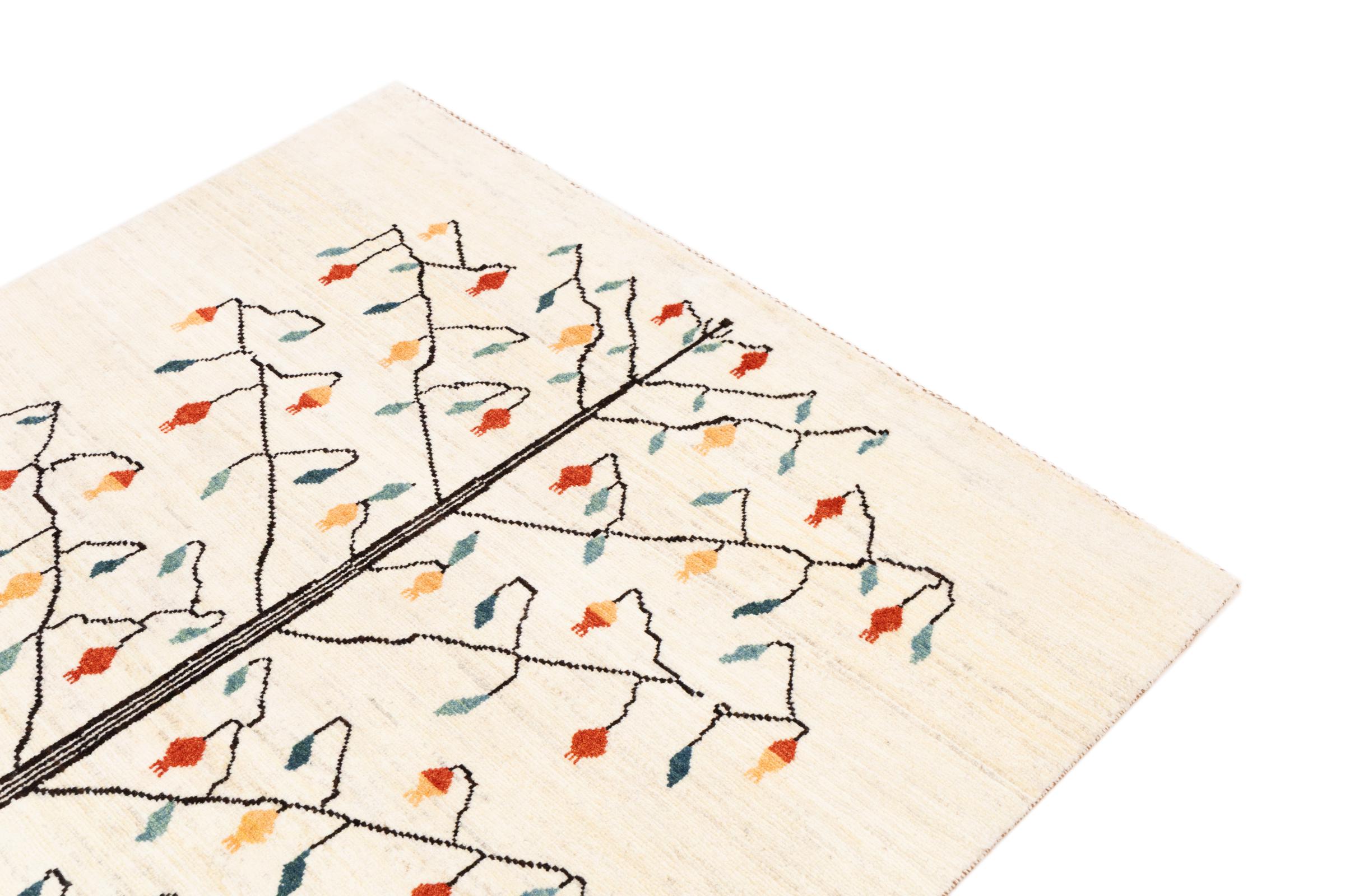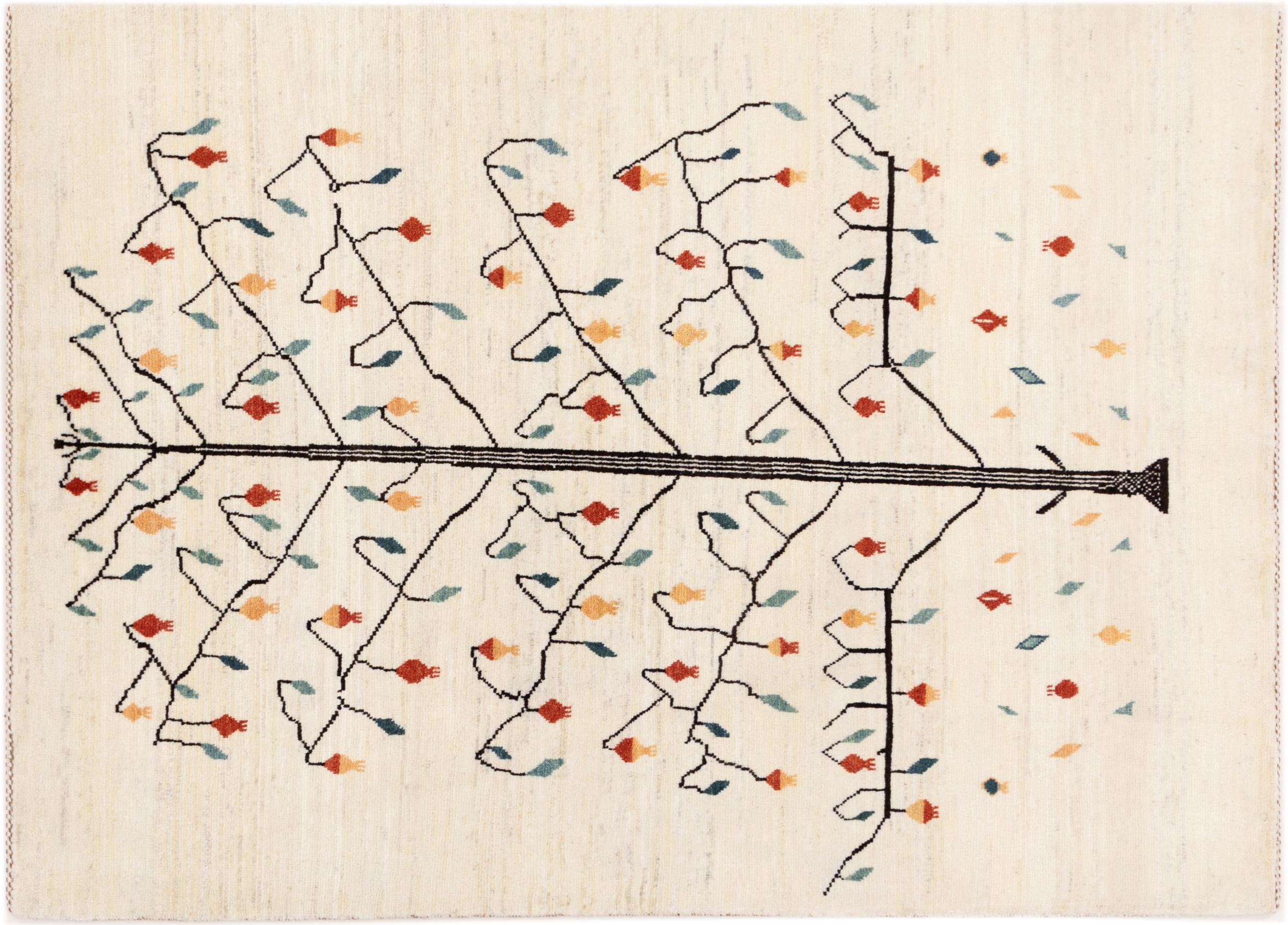 Dette smukke tæppe er en persisk Gabbeh og er en af ​​de højeste kvalitet Gabbeh tæpper. Tæpper er knyttet af nomader eller semi-nomader i Iran ved hjælp af traditionelt håndværk. De enkle motiver og mønstre er for det meste inspireret af nomadernes umiddelbare omgivelser. F.eks. Kan kameler, træer eller buske findes på traditionelle tæpper. Persiske Gabbeh-tæpper er lavet af uld fra lokale fårbesætninger. Ulden er derfor for det meste spundet for hånd. Hver af disse orientalske tæpper udgør en unik karakter af århundreder gammel kultur.