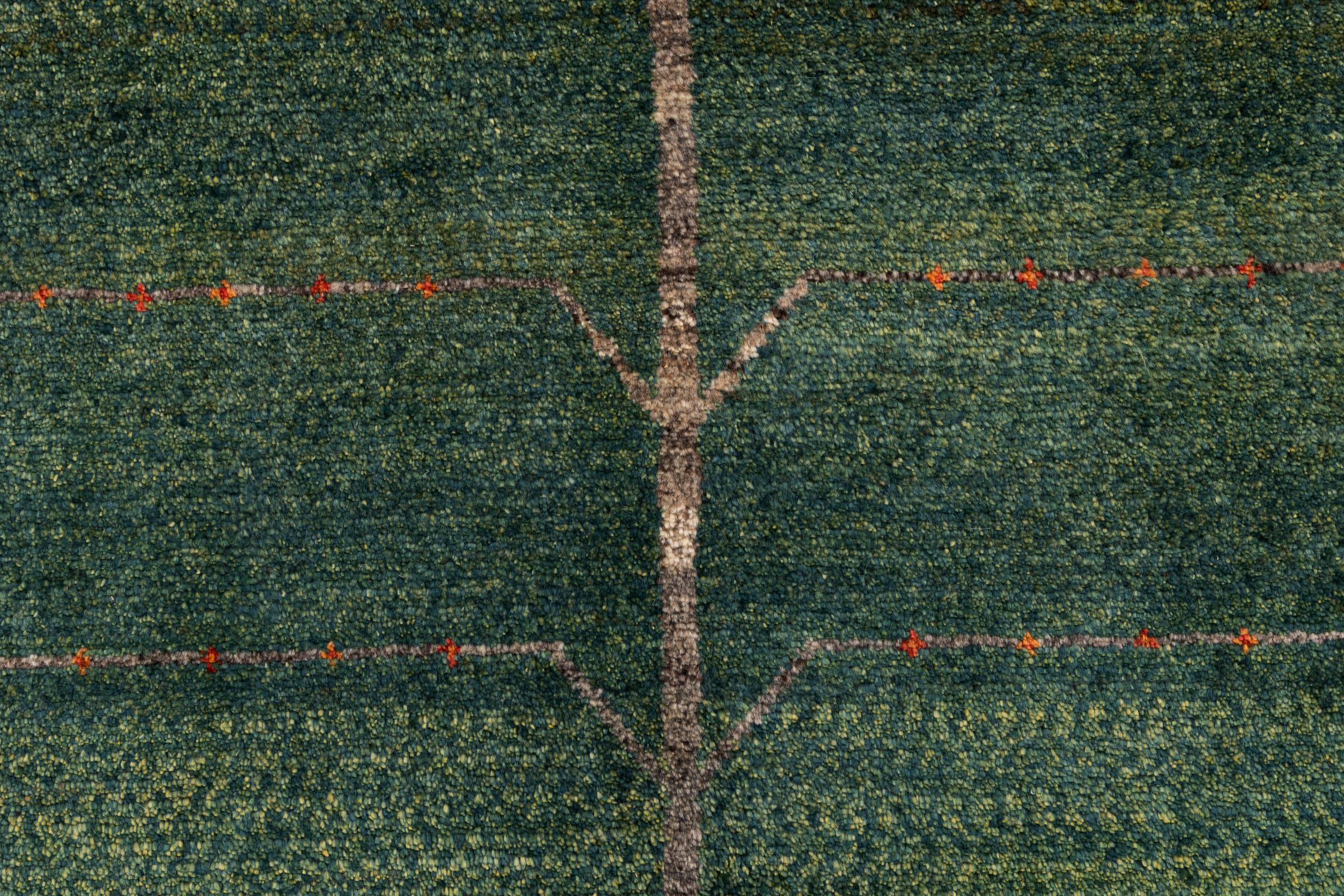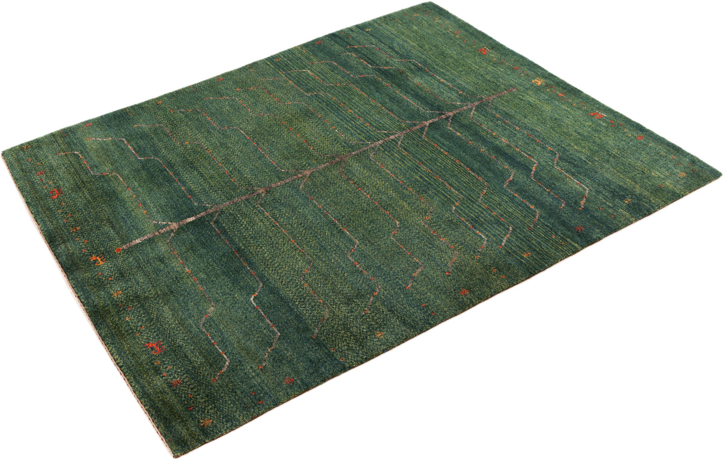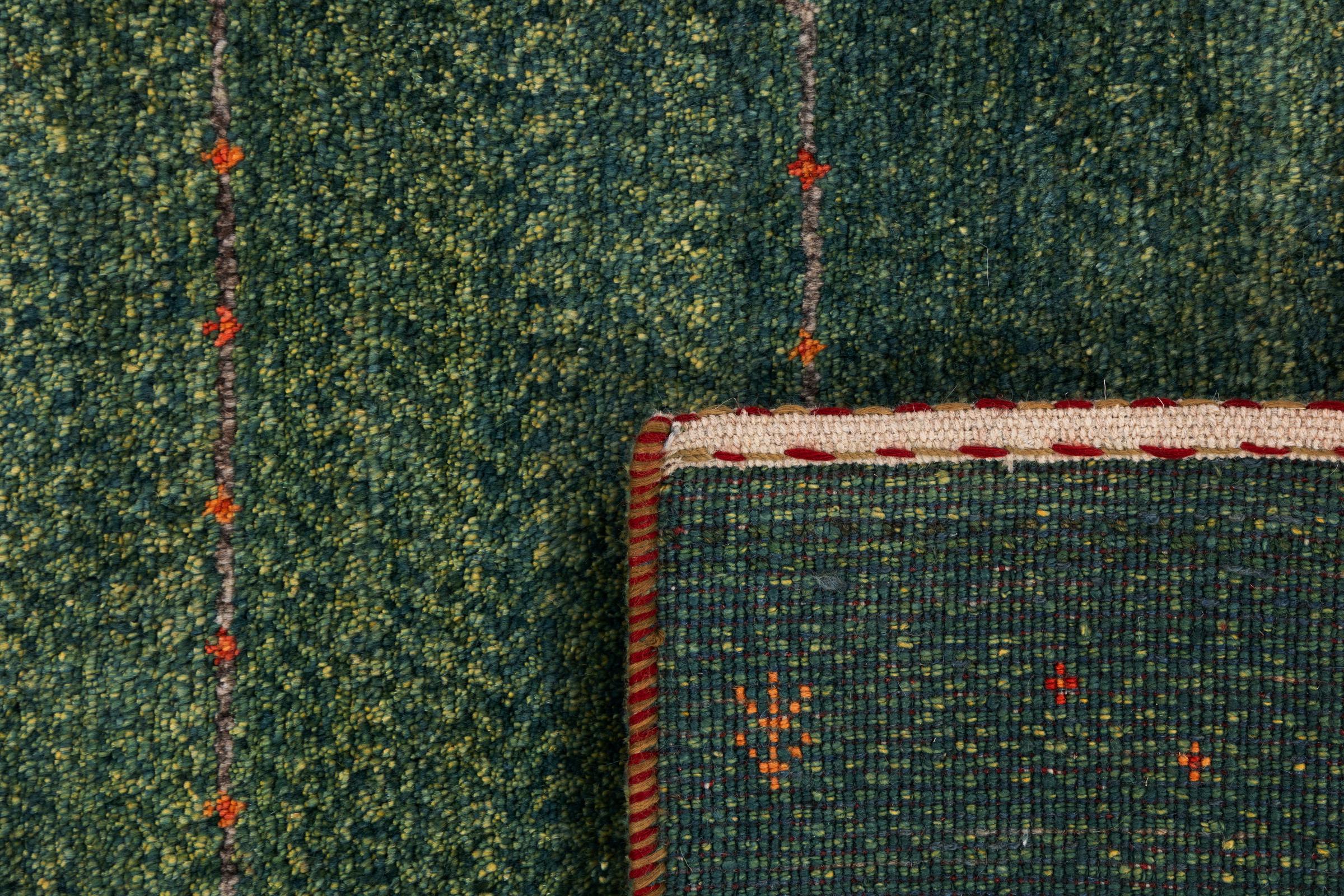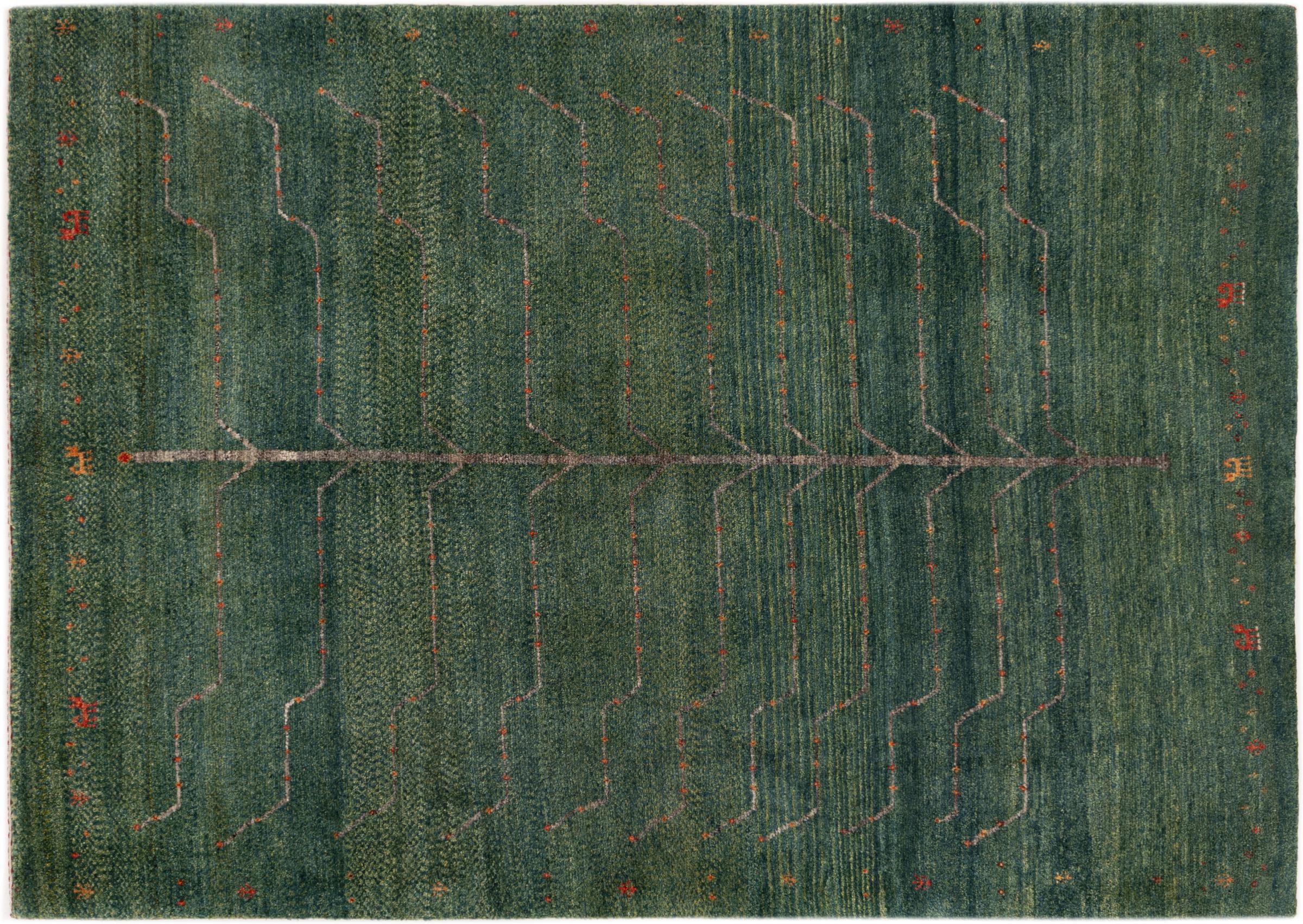 Dette smukke tæppe er en persisk Gabbeh og er en af ​​de højeste kvalitet Gabbeh tæpper. Tæpper er knyttet af nomader eller semi-nomader i Iran ved hjælp af traditionelt håndværk. De enkle motiver og mønstre er for det meste inspireret af nomadernes umiddelbare omgivelser. F.eks. Kan kameler, træer eller buske findes på traditionelle tæpper. Persiske Gabbeh-tæpper er lavet af uld fra lokale fårbesætninger. Ulden er derfor for det meste spundet for hånd. Hver af disse orientalske tæpper udgør en unik karakter af århundreder gammel kultur.
