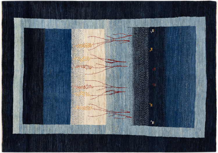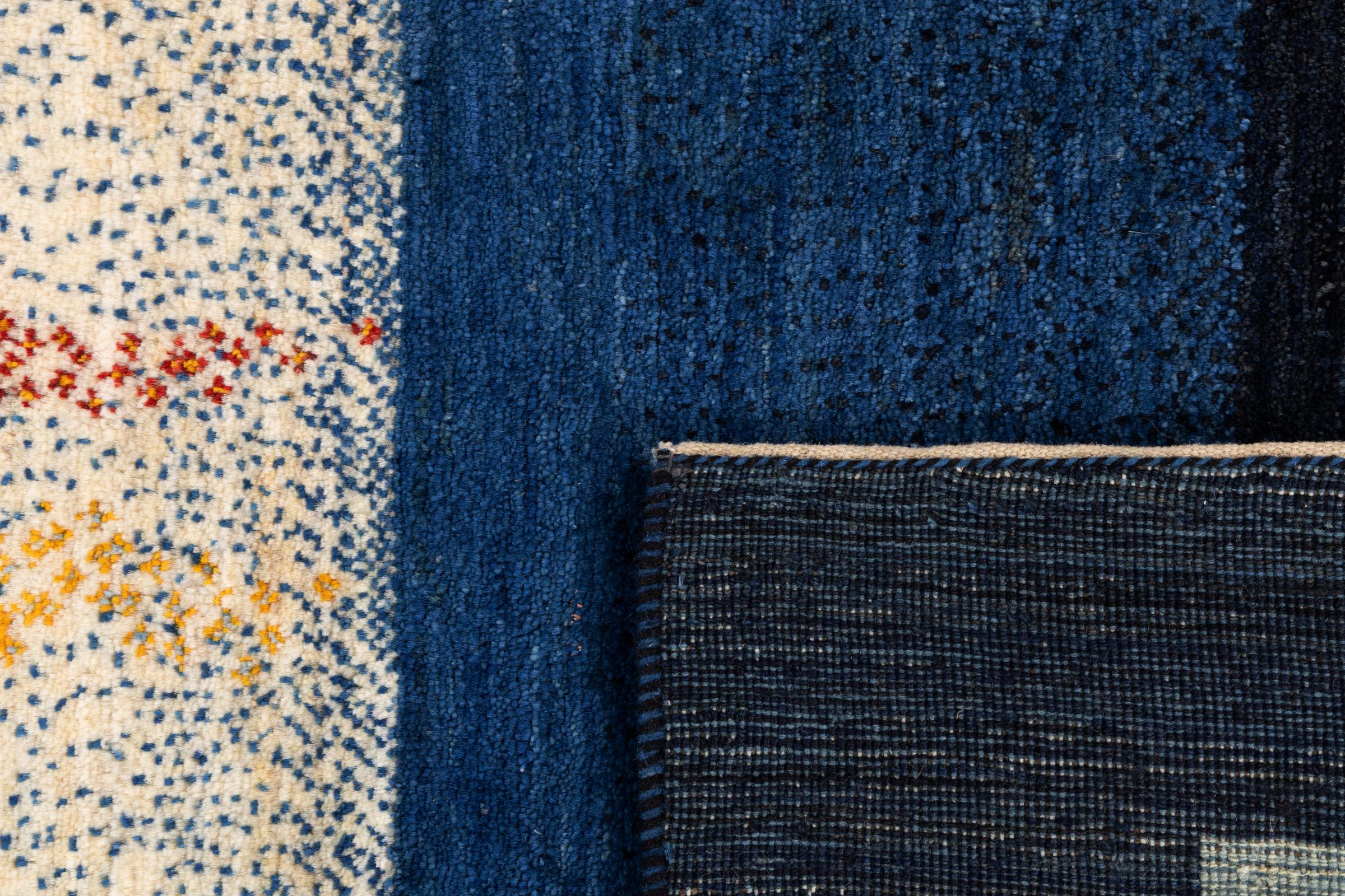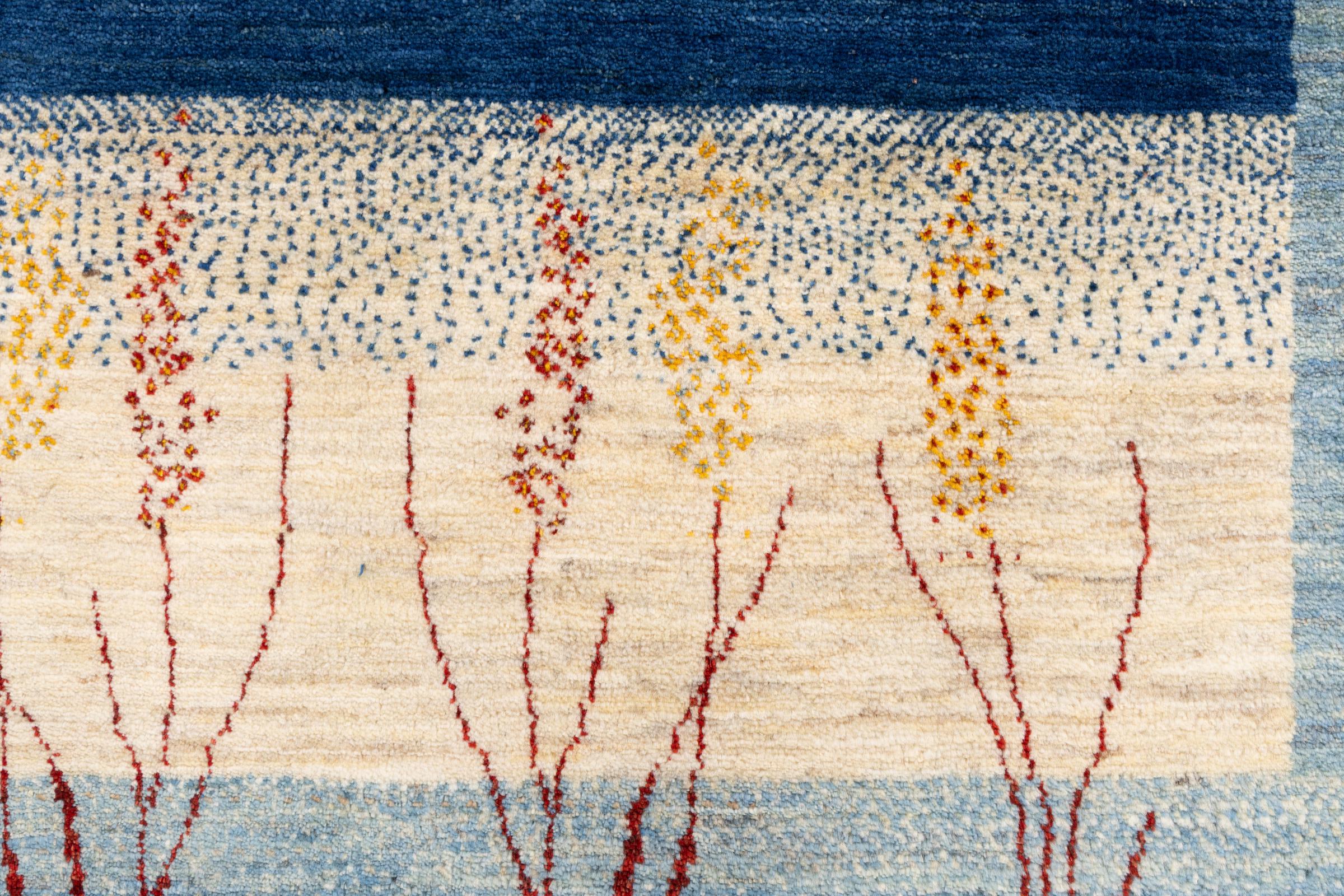 Dette smukke tæppe er en persisk Gabbeh og er en af ​​de højeste kvalitet Gabbeh tæpper. Tæpper er knyttet af nomader eller semi-nomader i Iran ved hjælp af traditionelt håndværk. De enkle motiver og mønstre er for det meste inspireret af nomadernes umiddelbare omgivelser. F.eks. Kan kameler, træer eller buske findes på traditionelle tæpper. Persiske Gabbeh-tæpper er lavet af uld fra lokale fårbesætninger. Ulden er derfor for det meste spundet for hånd. Hver af disse orientalske tæpper udgør en unik karakter af århundreder gammel kultur.