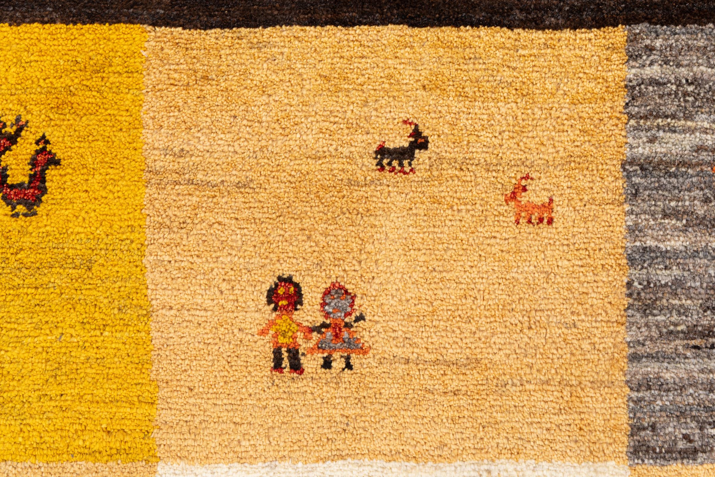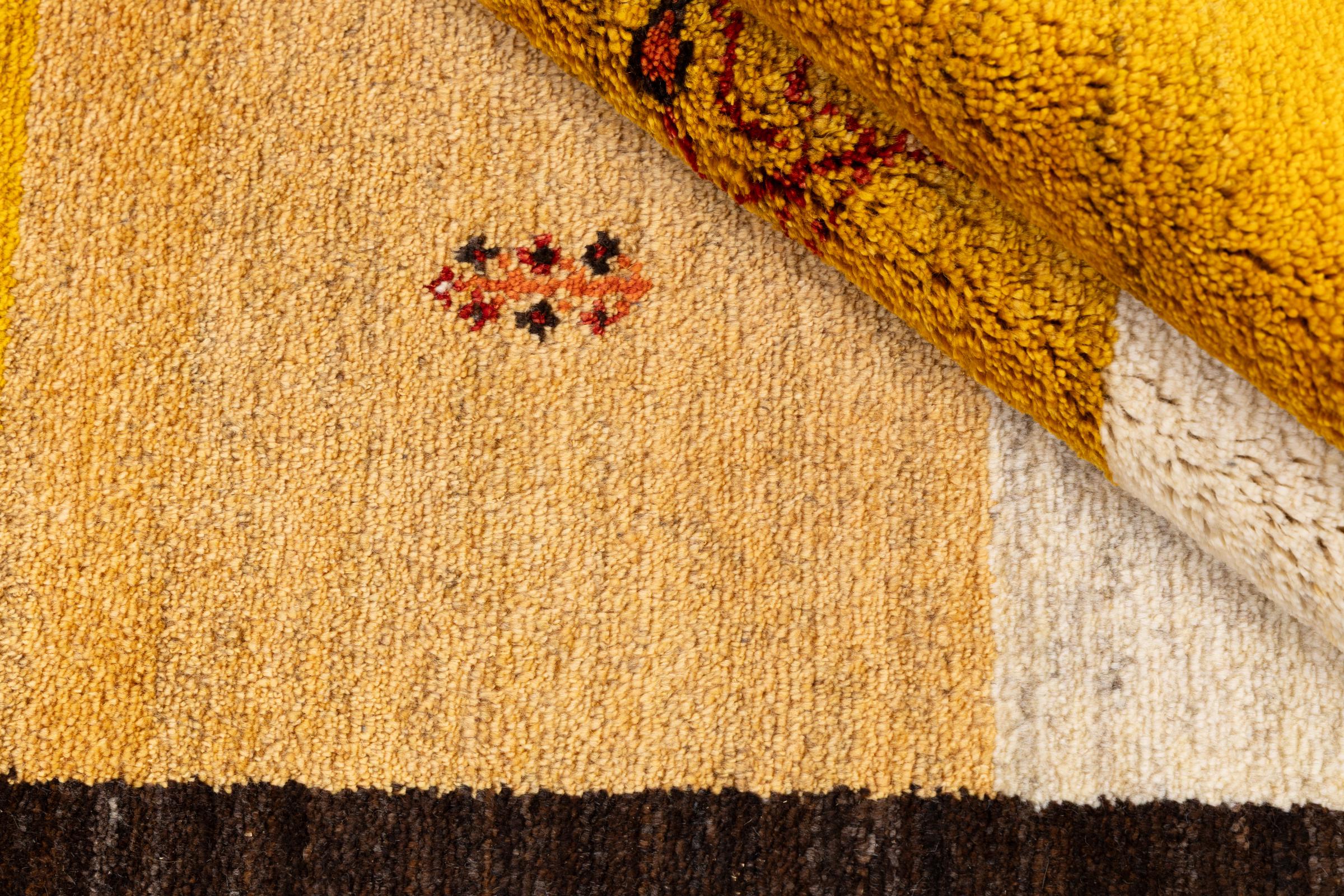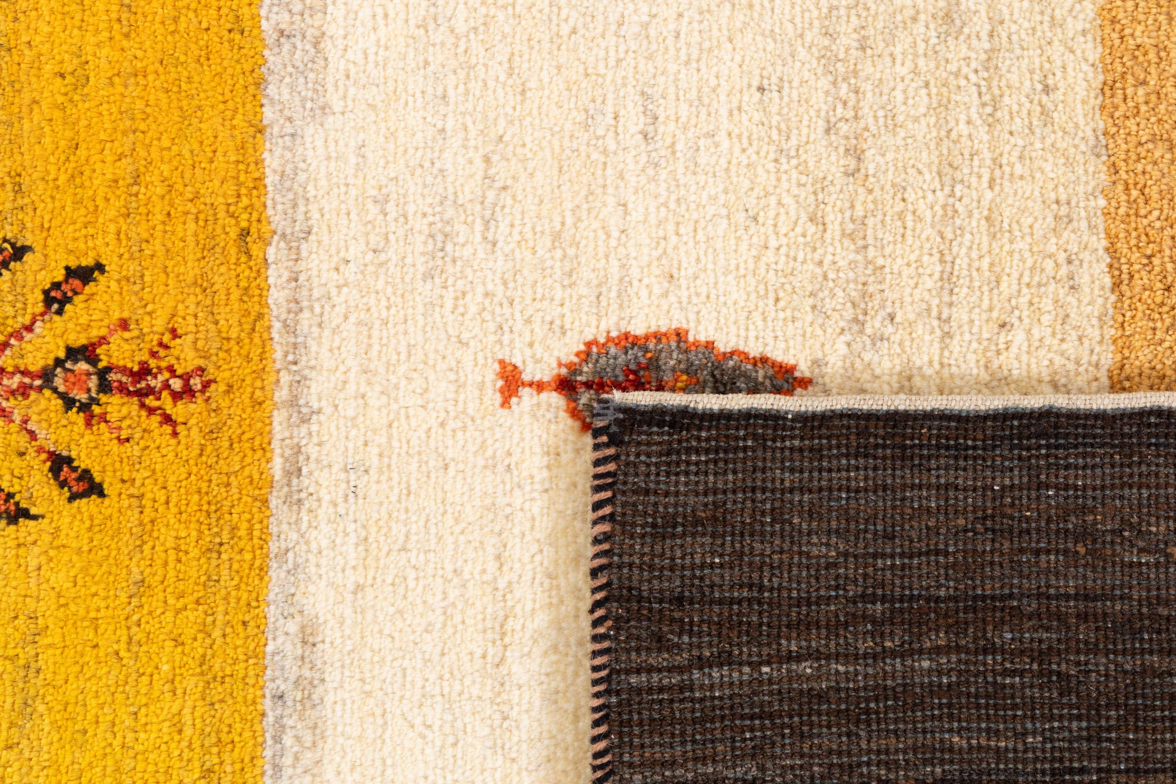 Dette smukke tæppe er en persisk Gabbeh og er en af ​​de højeste kvalitet Gabbeh tæpper. Tæpper er knyttet af nomader eller semi-nomader i Iran ved hjælp af traditionelt håndværk. De enkle motiver og mønstre er for det meste inspireret af nomadernes umiddelbare omgivelser. F.eks. Kan kameler, træer eller buske findes på traditionelle tæpper. Persiske Gabbeh-tæpper er lavet af uld fra lokale fårbesætninger. Ulden er derfor for det meste spundet for hånd. Hver af disse orientalske tæpper udgør en unik karakter af århundreder gammel kultur.