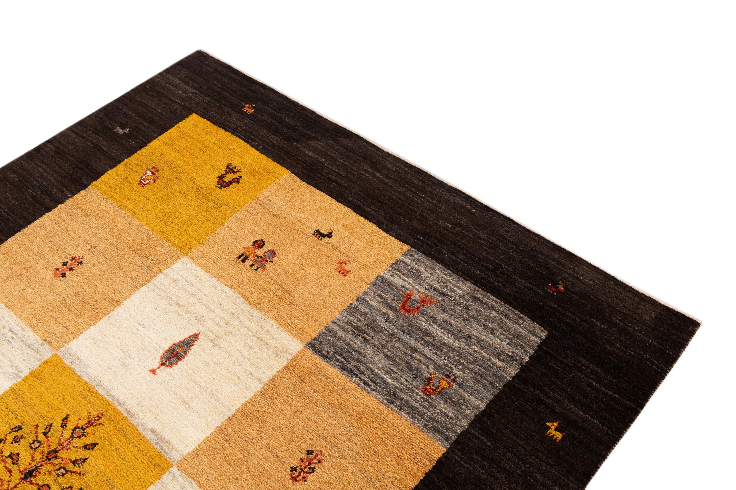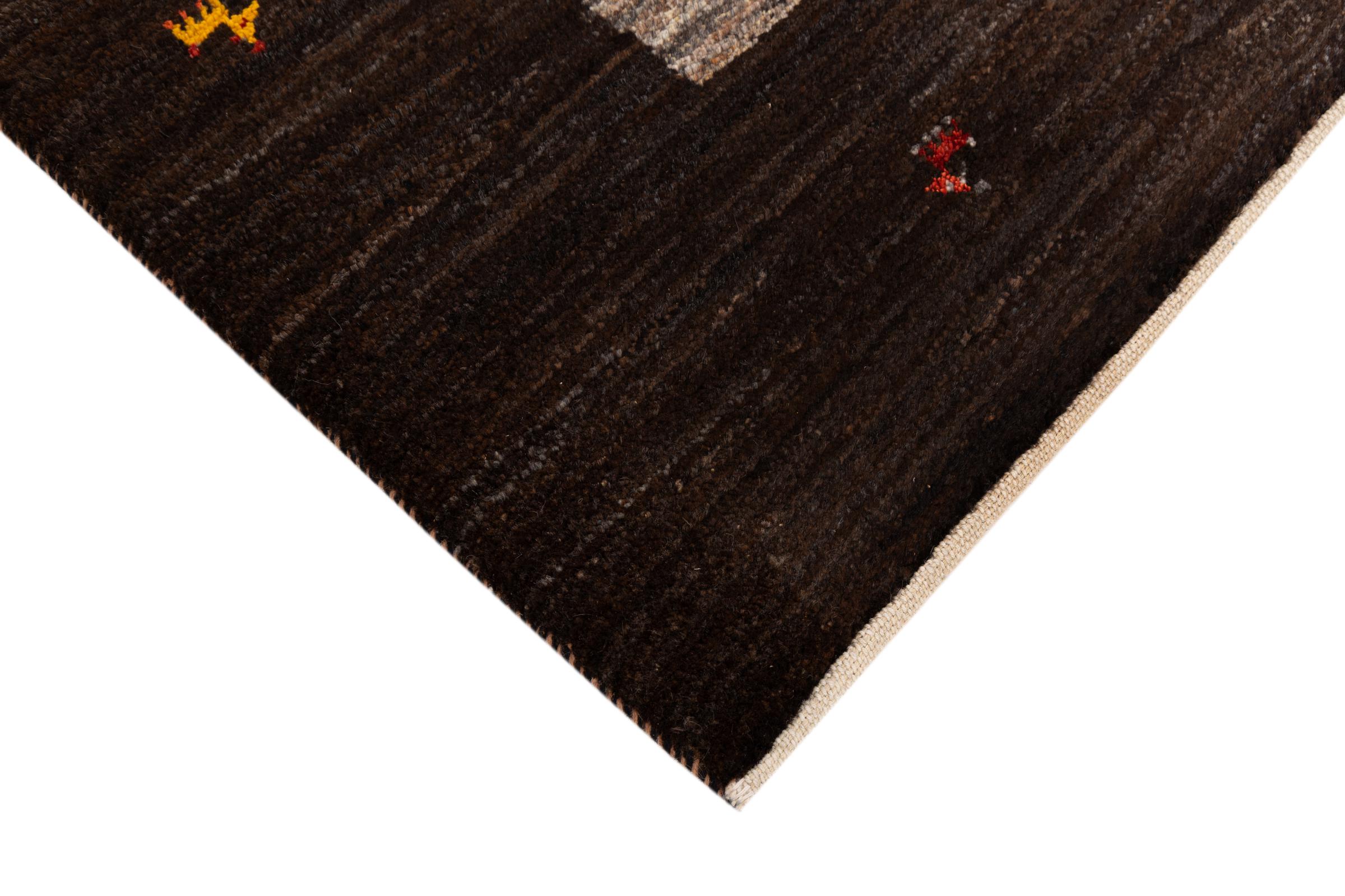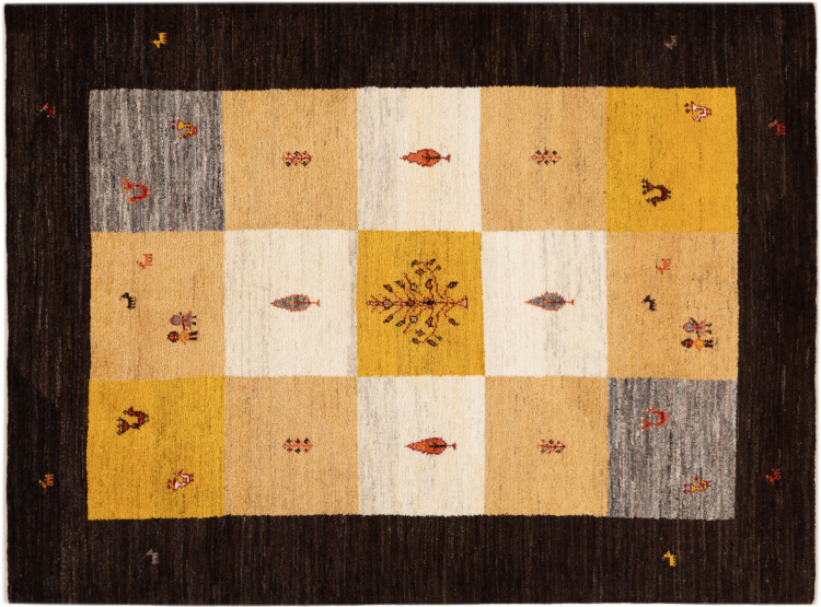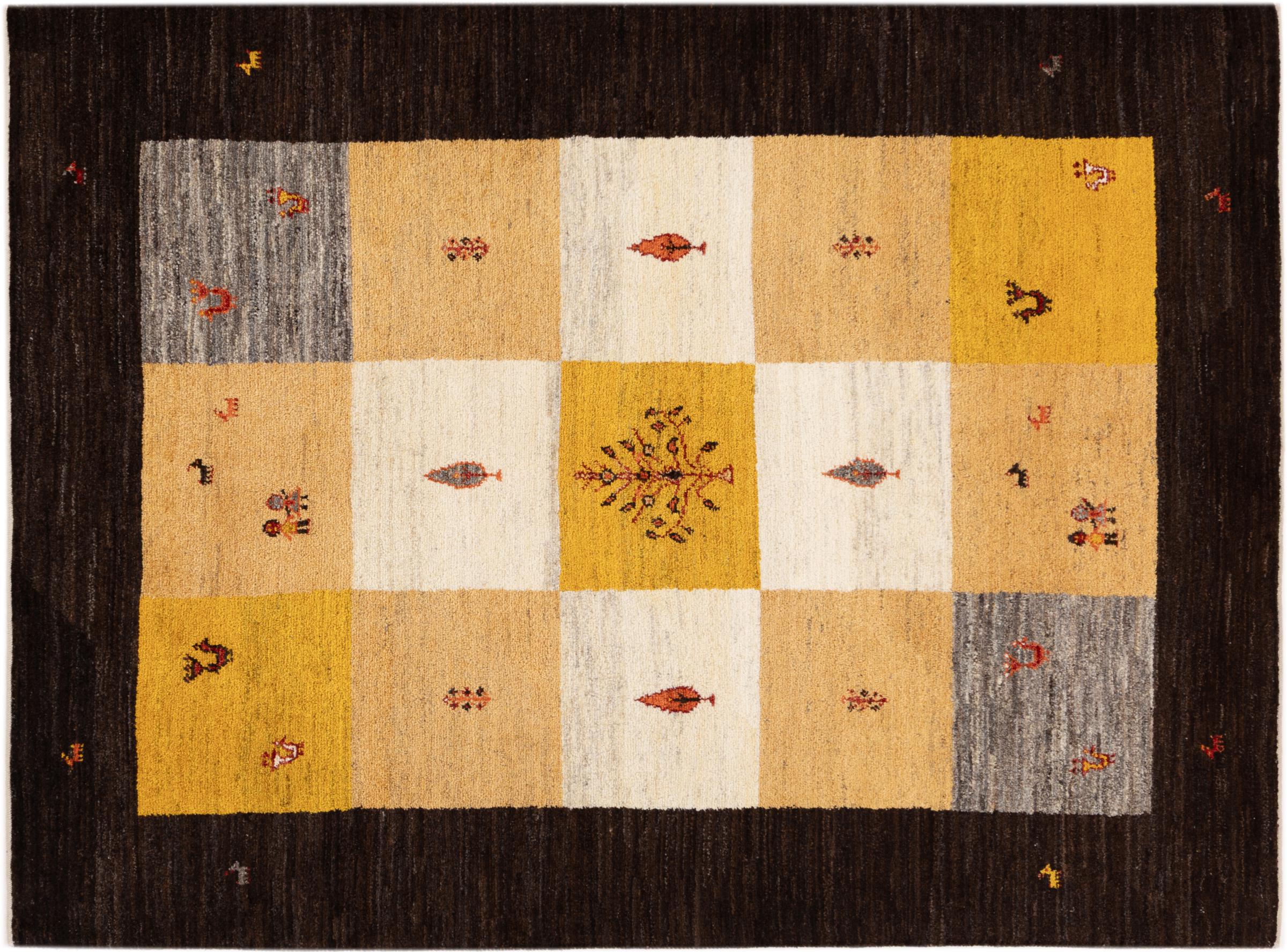 Dette smukke tæppe er en persisk Gabbeh og er en af ​​de højeste kvalitet Gabbeh tæpper. Tæpper er knyttet af nomader eller semi-nomader i Iran ved hjælp af traditionelt håndværk. De enkle motiver og mønstre er for det meste inspireret af nomadernes umiddelbare omgivelser. F.eks. Kan kameler, træer eller buske findes på traditionelle tæpper. Persiske Gabbeh-tæpper er lavet af uld fra lokale fårbesætninger. Ulden er derfor for det meste spundet for hånd. Hver af disse orientalske tæpper udgør en unik karakter af århundreder gammel kultur.