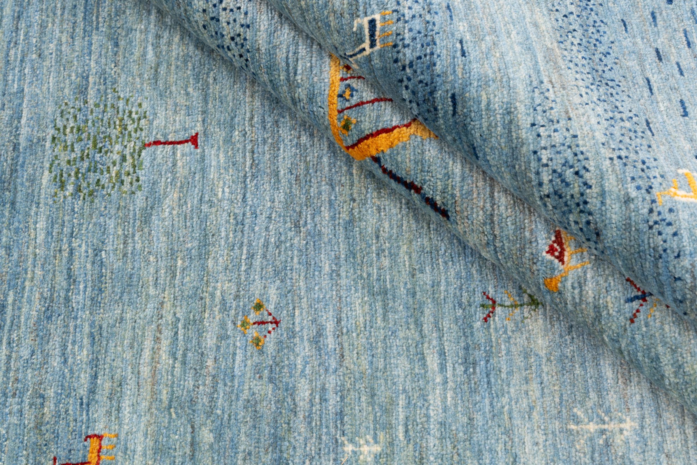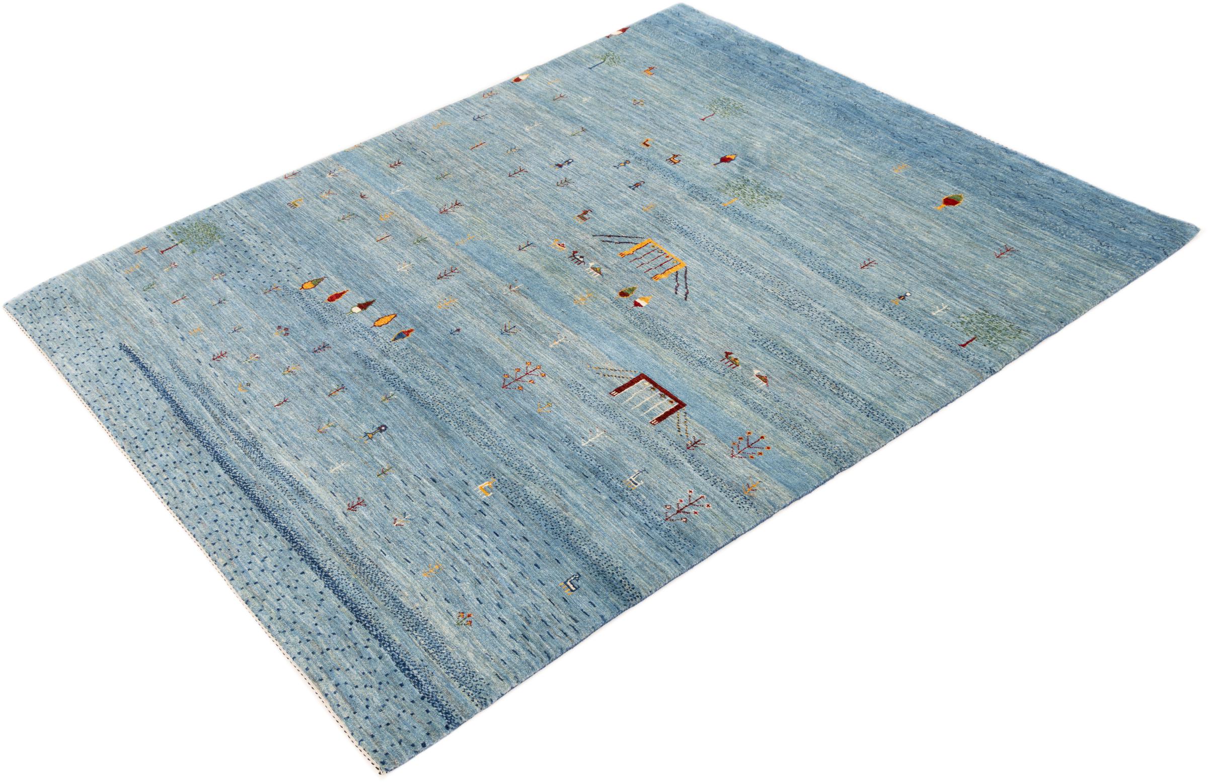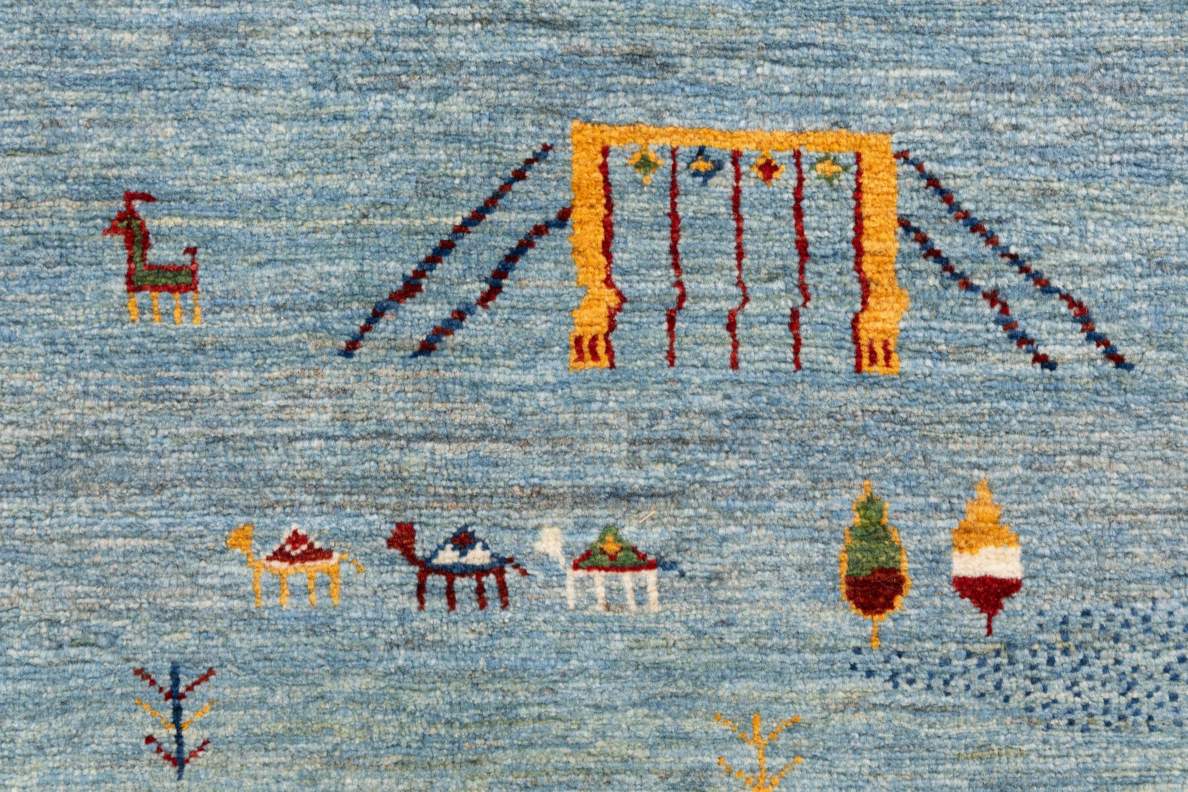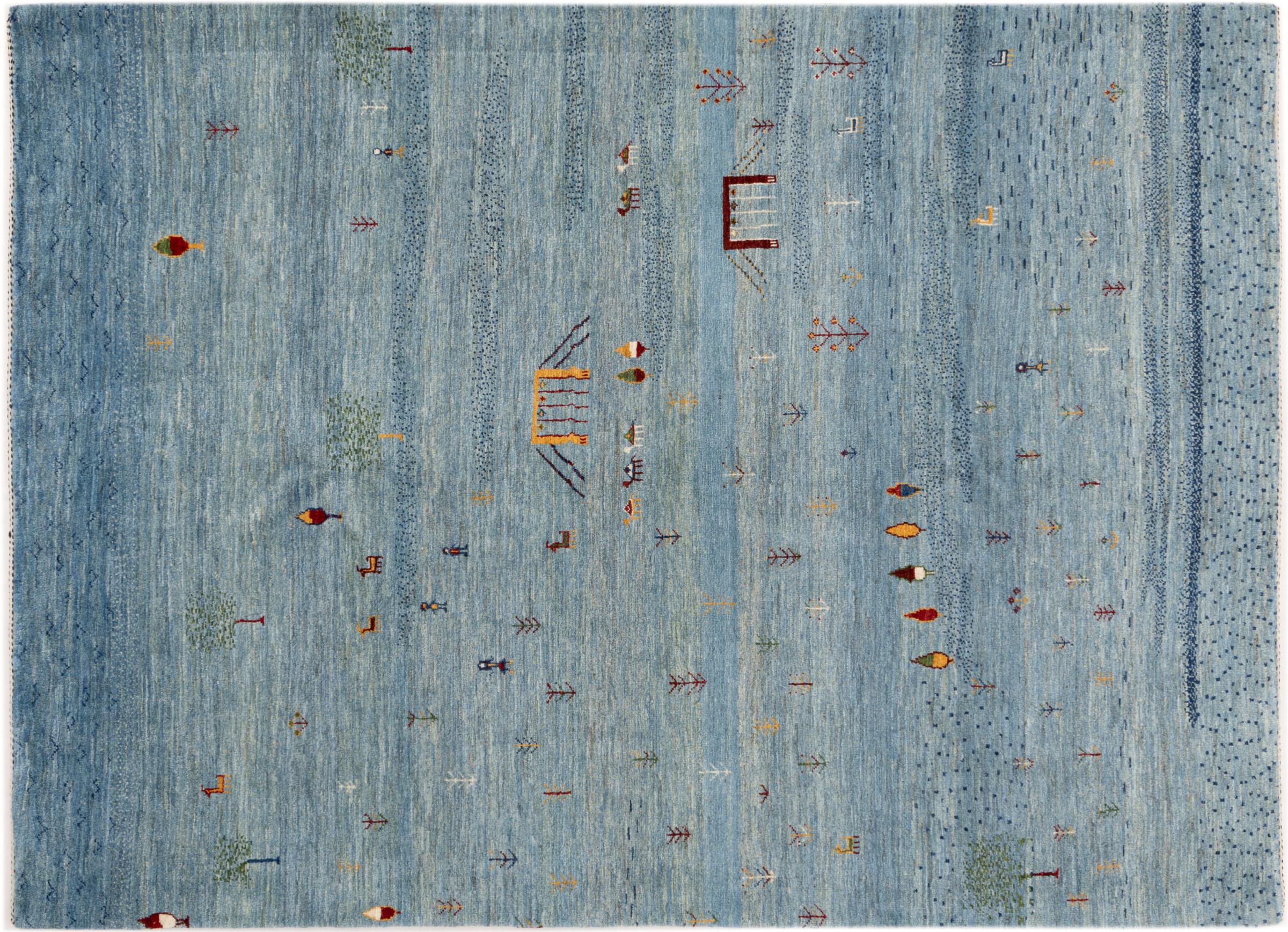 Dette smukke tæppe er en persisk Gabbeh og er en af ​​de højeste kvalitet Gabbeh tæpper. Tæpper er knyttet af nomader eller semi-nomader i Iran ved hjælp af traditionelt håndværk. De enkle motiver og mønstre er for det meste inspireret af nomadernes umiddelbare omgivelser. F.eks. Kan kameler, træer eller buske findes på traditionelle tæpper. Persiske Gabbeh-tæpper er lavet af uld fra lokale fårbesætninger. Ulden er derfor for det meste spundet for hånd. Hver af disse orientalske tæpper udgør en unik karakter af århundreder gammel kultur.