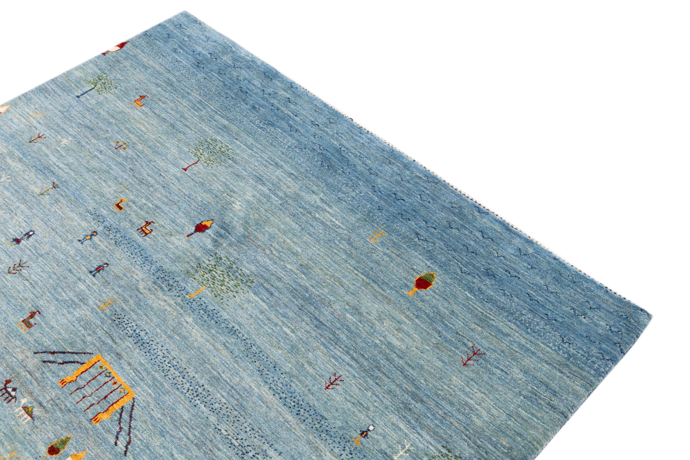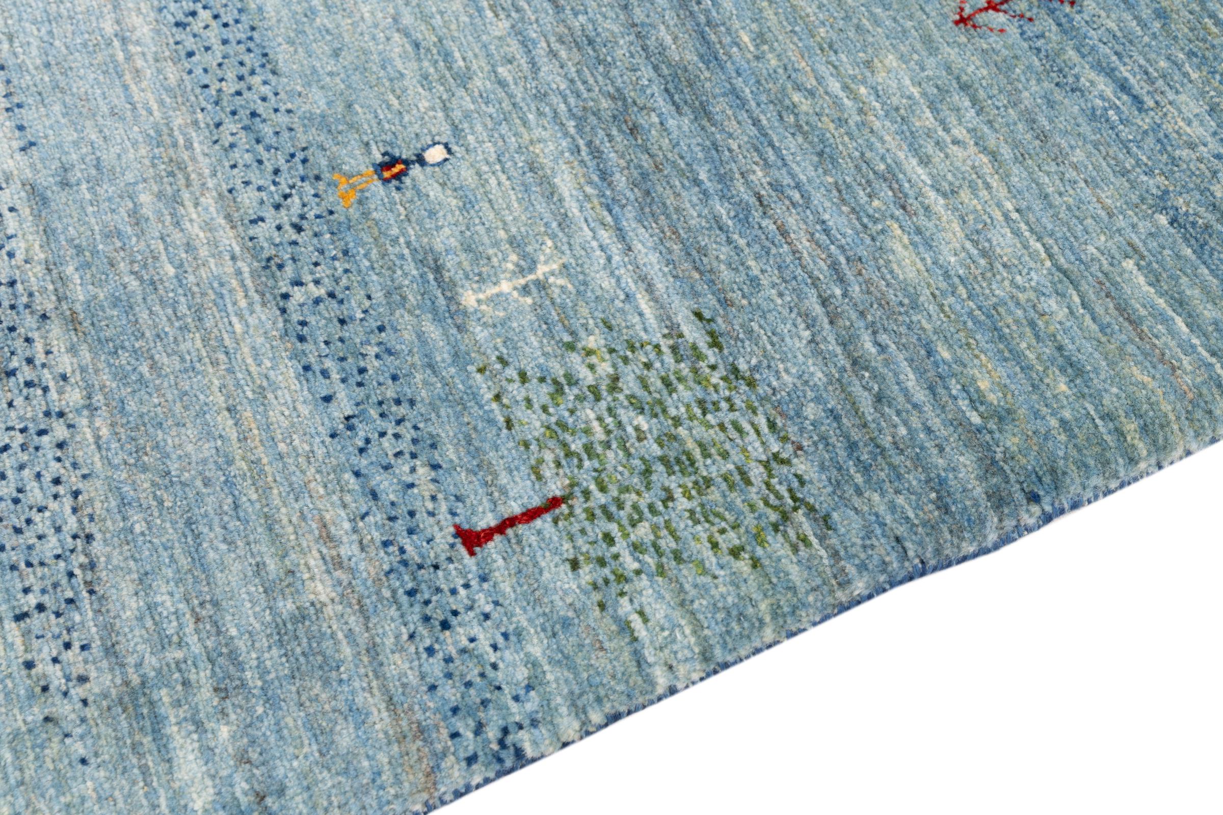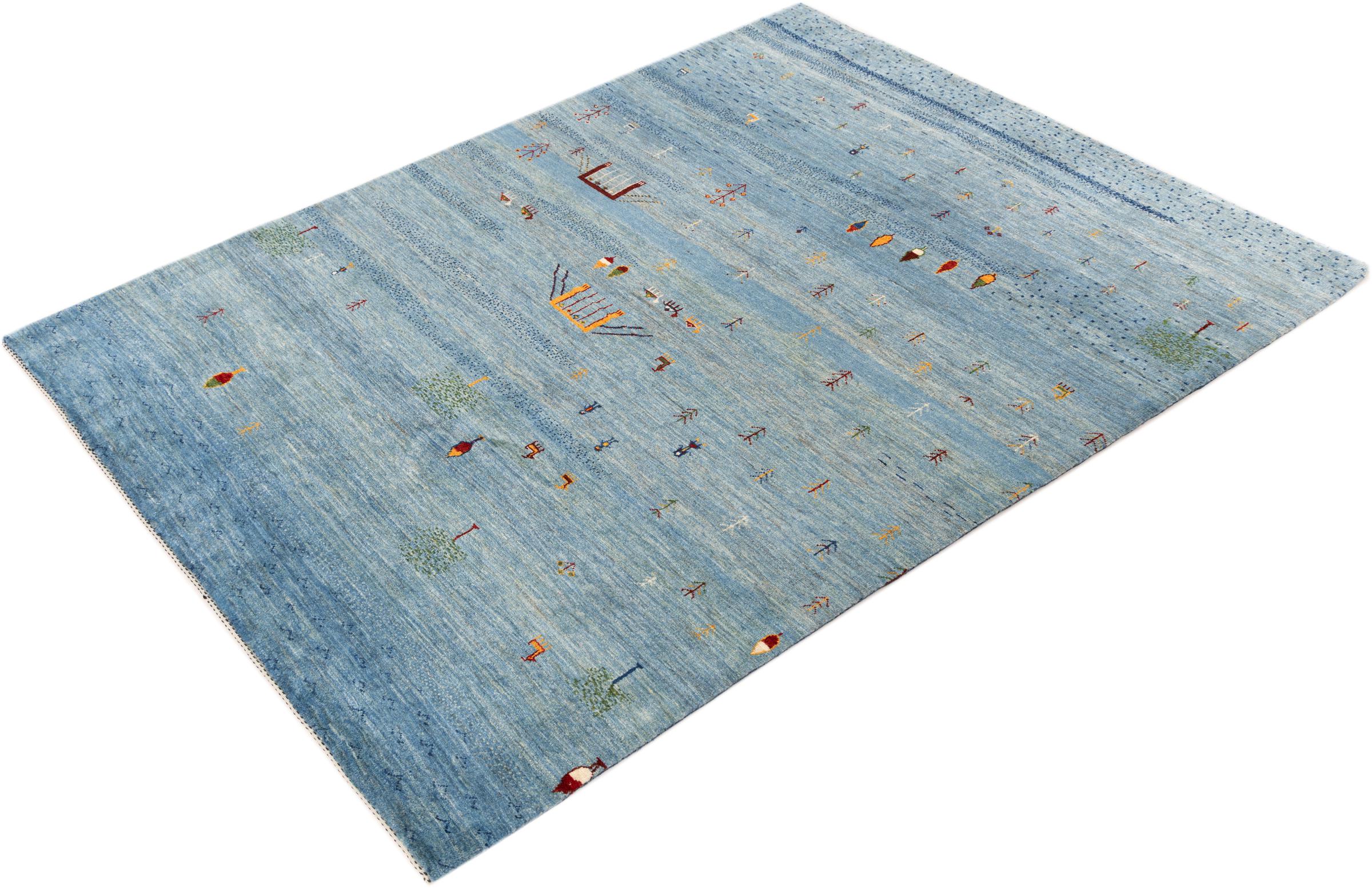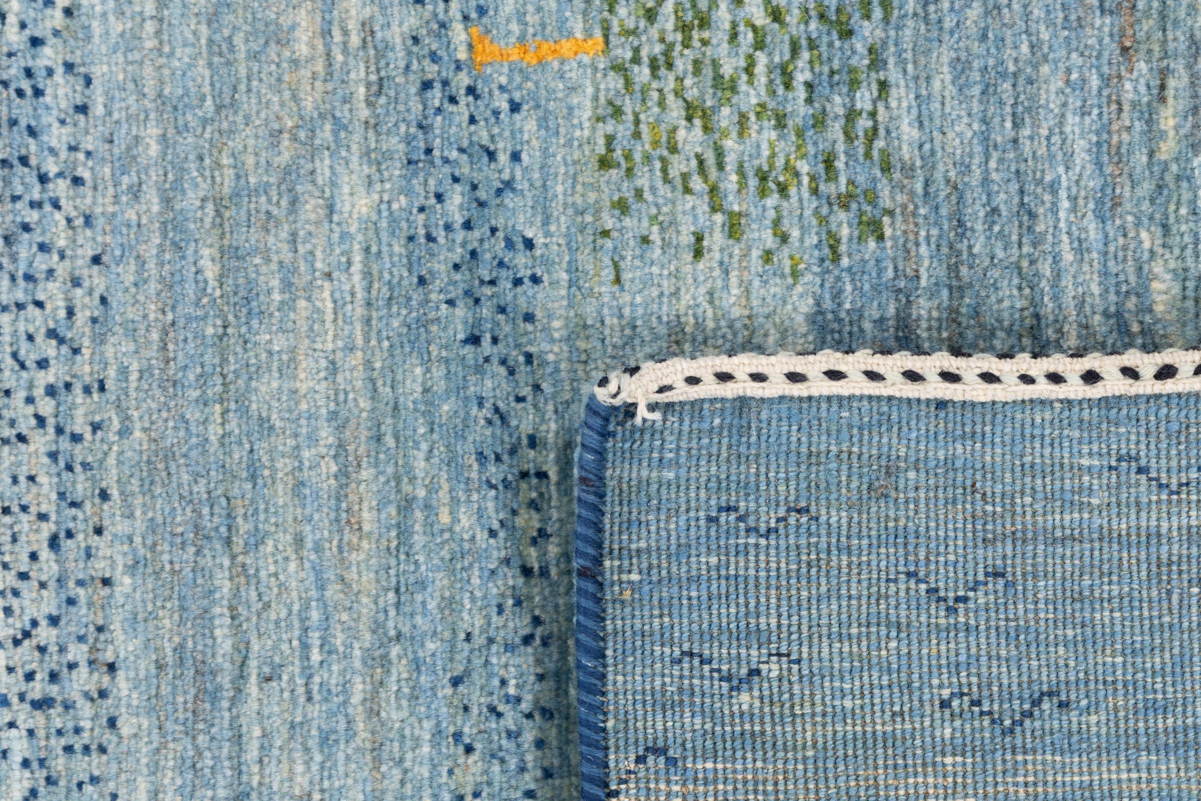 Dette smukke tæppe er en persisk Gabbeh og er en af ​​de højeste kvalitet Gabbeh tæpper. Tæpper er knyttet af nomader eller semi-nomader i Iran ved hjælp af traditionelt håndværk. De enkle motiver og mønstre er for det meste inspireret af nomadernes umiddelbare omgivelser. F.eks. Kan kameler, træer eller buske findes på traditionelle tæpper. Persiske Gabbeh-tæpper er lavet af uld fra lokale fårbesætninger. Ulden er derfor for det meste spundet for hånd. Hver af disse orientalske tæpper udgør en unik karakter af århundreder gammel kultur.
