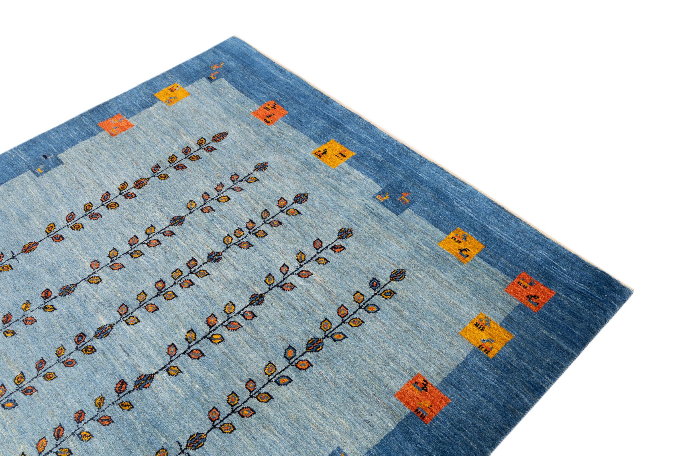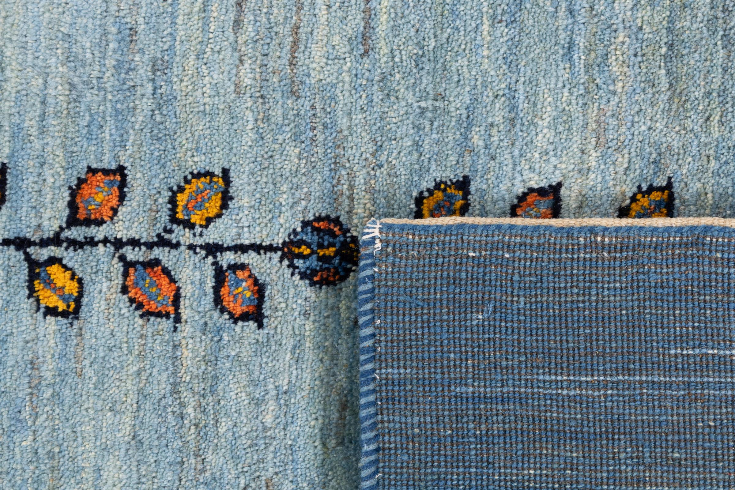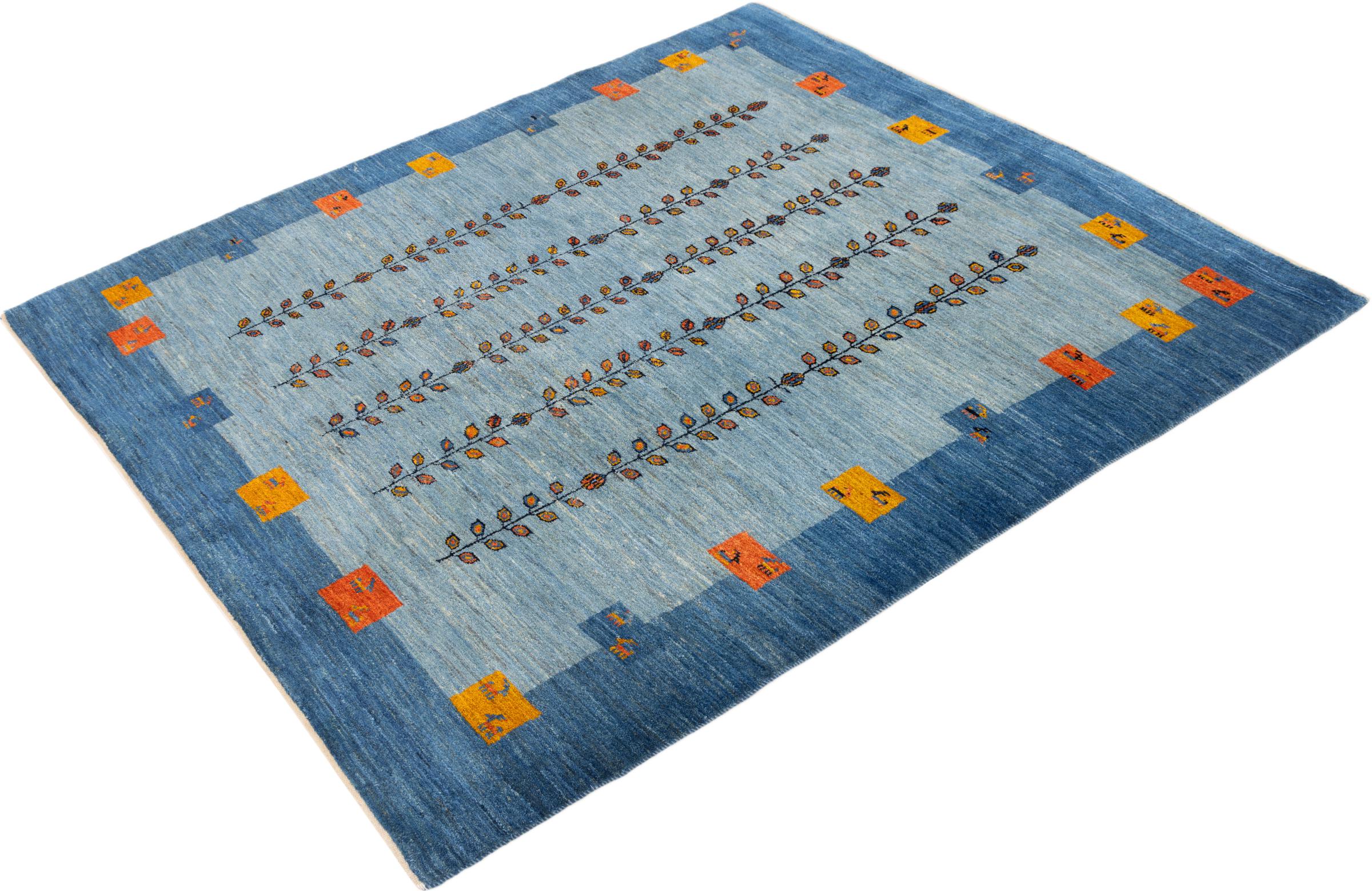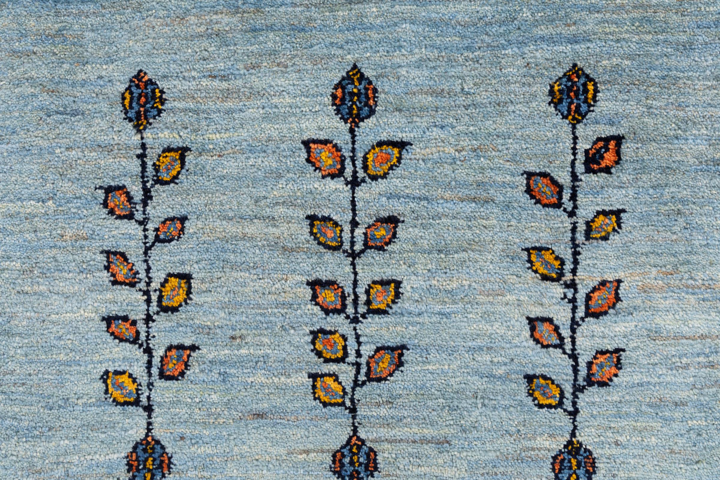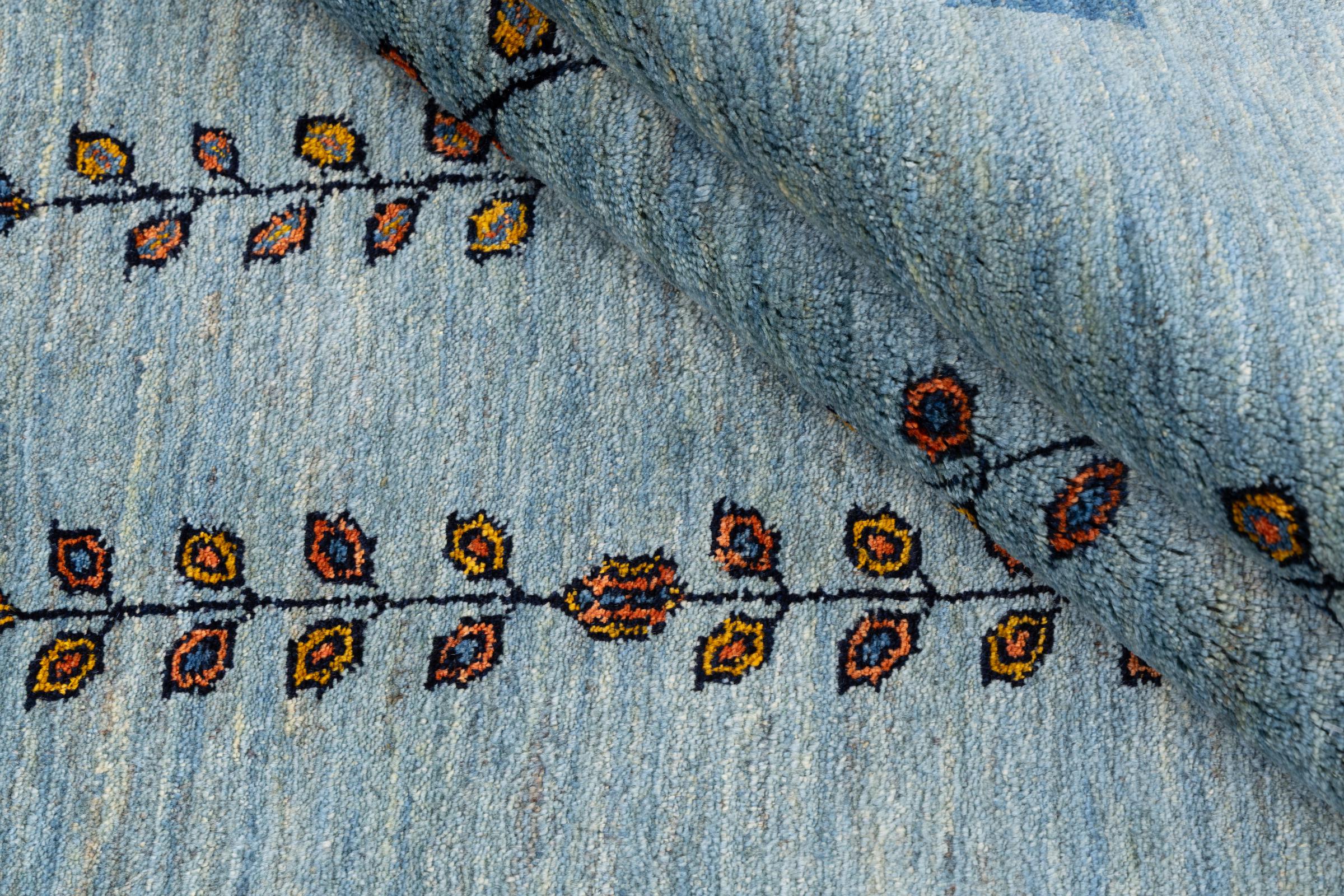 Dette smukke tæppe er en persisk Gabbeh og er en af ​​de højeste kvalitet Gabbeh tæpper. Tæpper er knyttet af nomader eller semi-nomader i Iran ved hjælp af traditionelt håndværk. De enkle motiver og mønstre er for det meste inspireret af nomadernes umiddelbare omgivelser. F.eks. Kan kameler, træer eller buske findes på traditionelle tæpper. Persiske Gabbeh-tæpper er lavet af uld fra lokale fårbesætninger. Ulden er derfor for det meste spundet for hånd. Hver af disse orientalske tæpper udgør en unik karakter af århundreder gammel kultur.