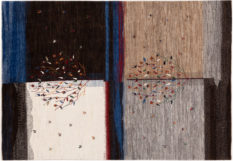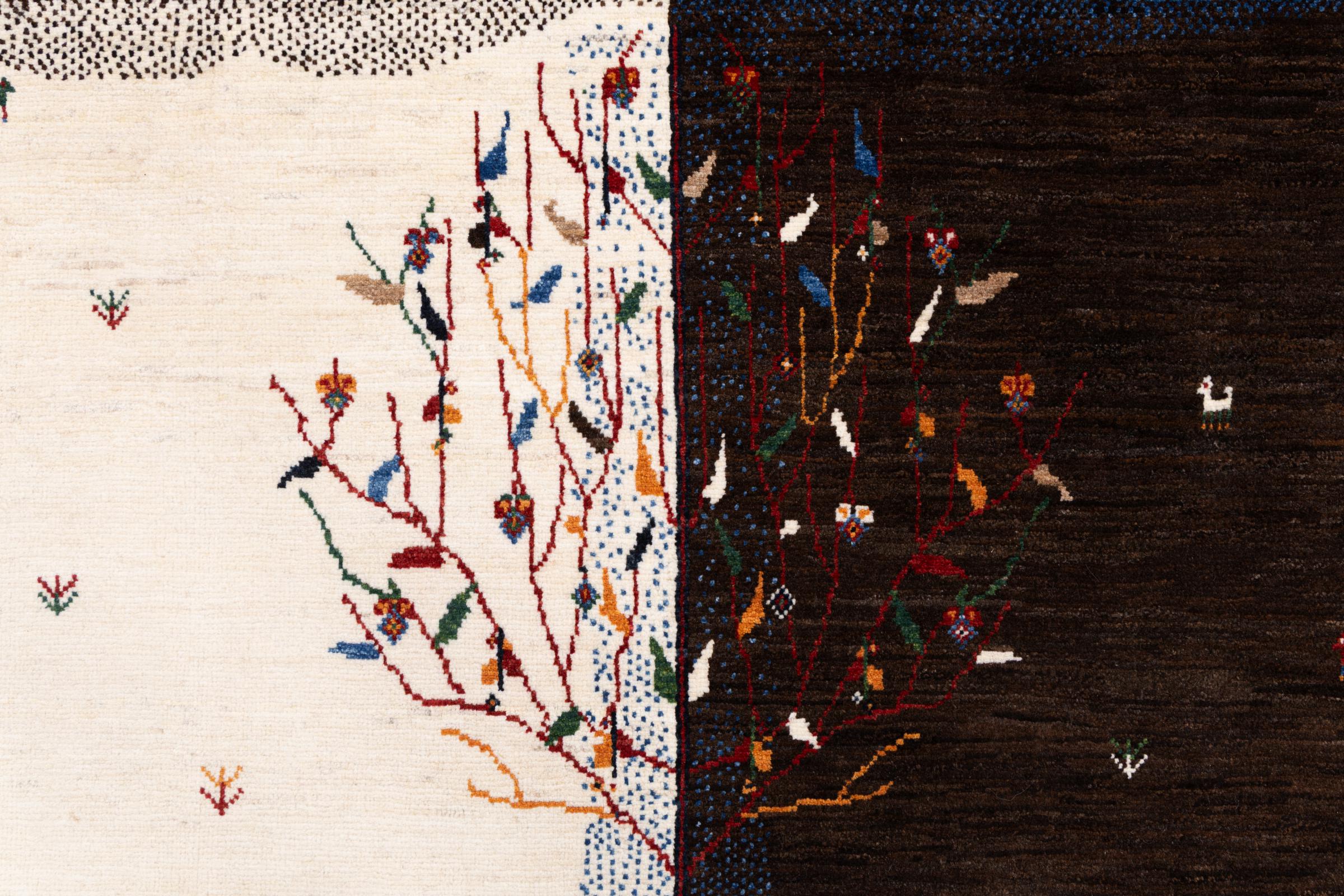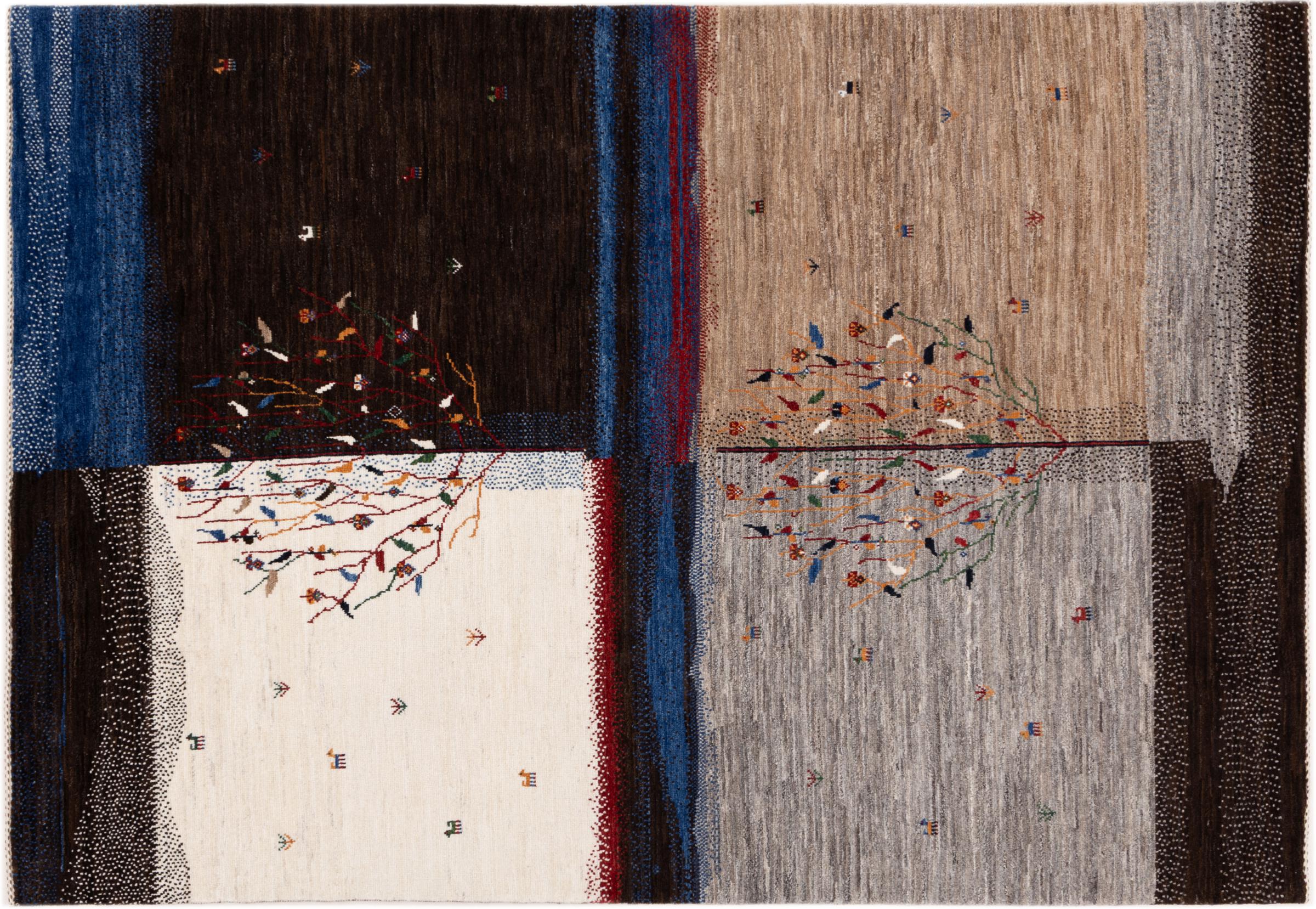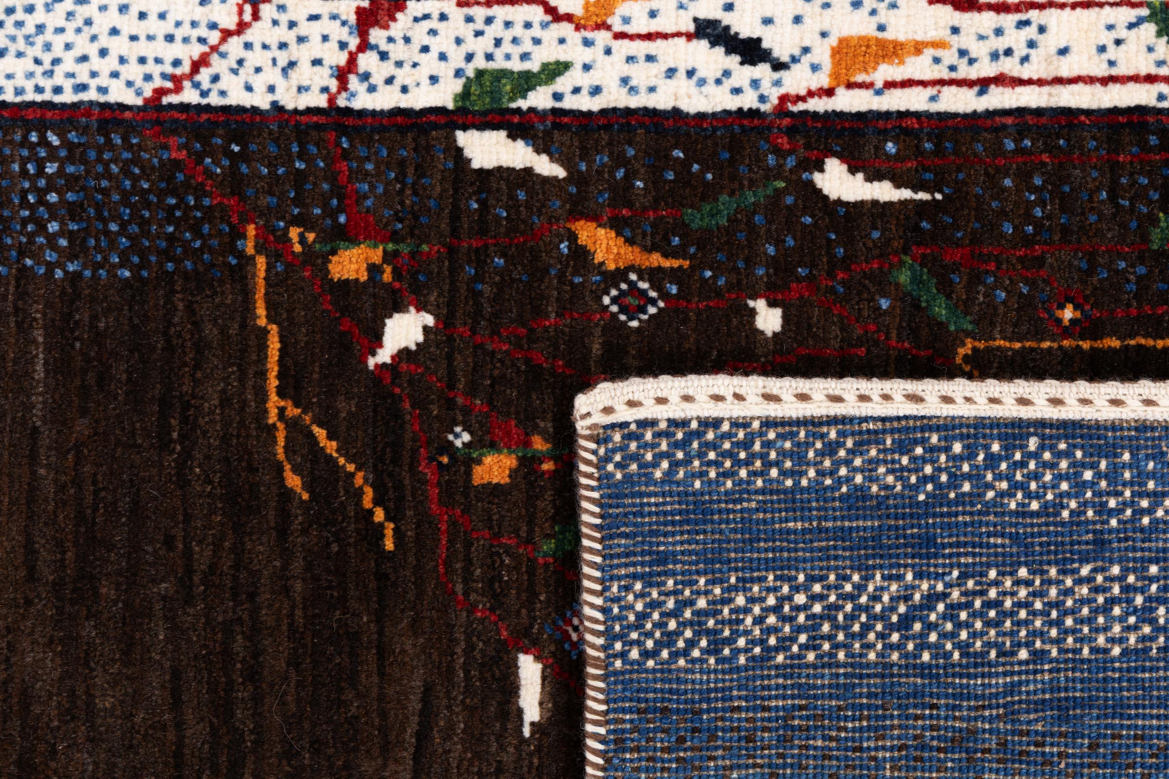 Dette smukke tæppe er en persisk Gabbeh og er en af ​​de højeste kvalitet Gabbeh tæpper. Tæpper er knyttet af nomader eller semi-nomader i Iran ved hjælp af traditionelt håndværk. De enkle motiver og mønstre er for det meste inspireret af nomadernes umiddelbare omgivelser. F.eks. Kan kameler, træer eller buske findes på traditionelle tæpper. Persiske Gabbeh-tæpper er lavet af uld fra lokale fårbesætninger. Ulden er derfor for det meste spundet for hånd. Hver af disse orientalske tæpper udgør en unik karakter af århundreder gammel kultur.
