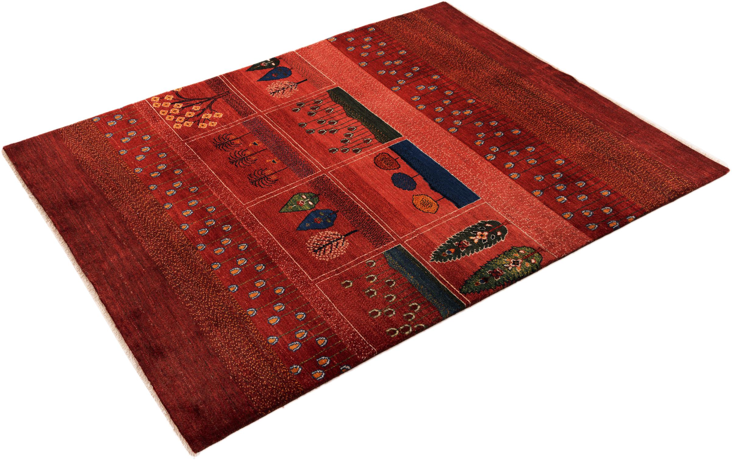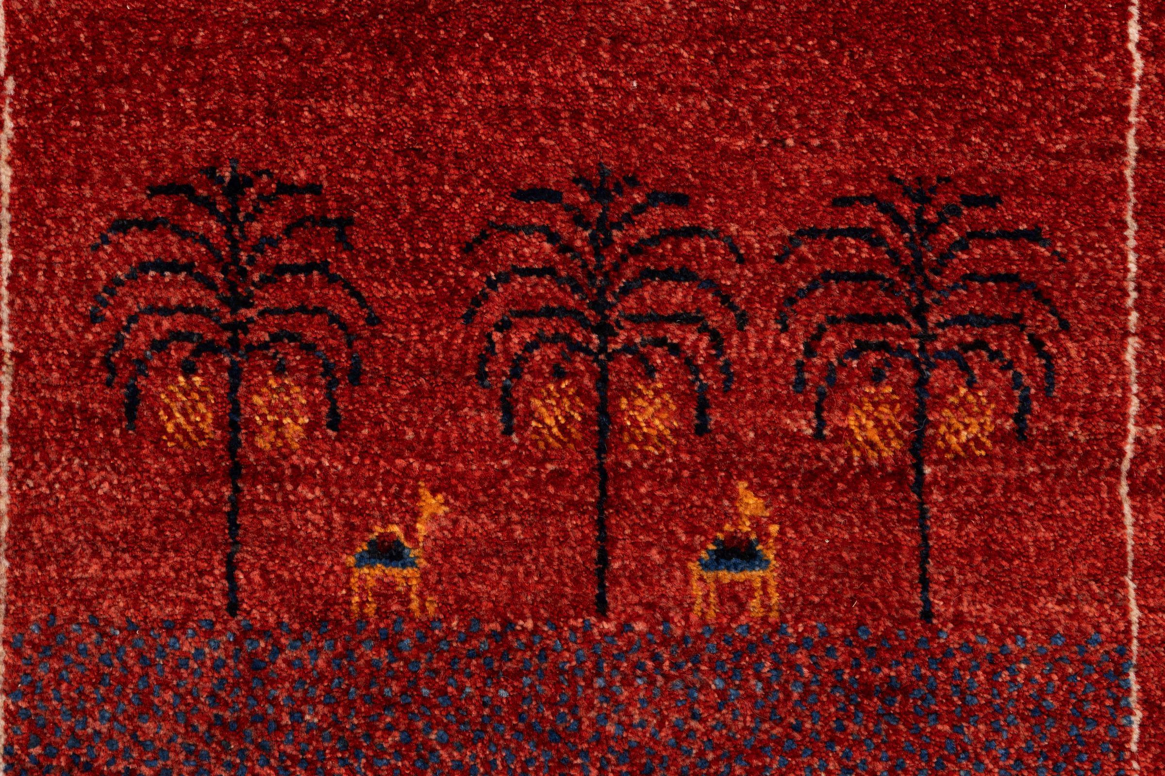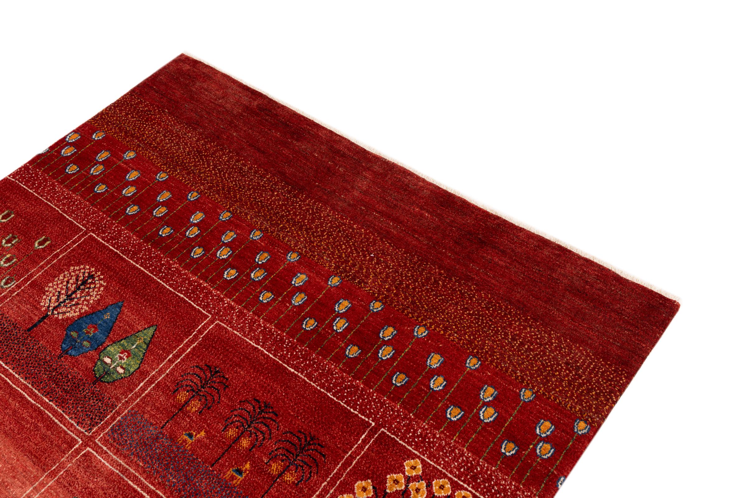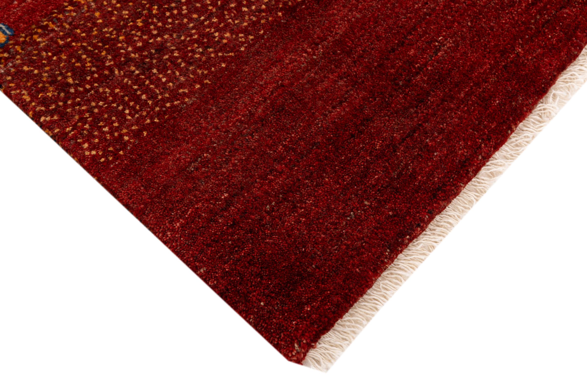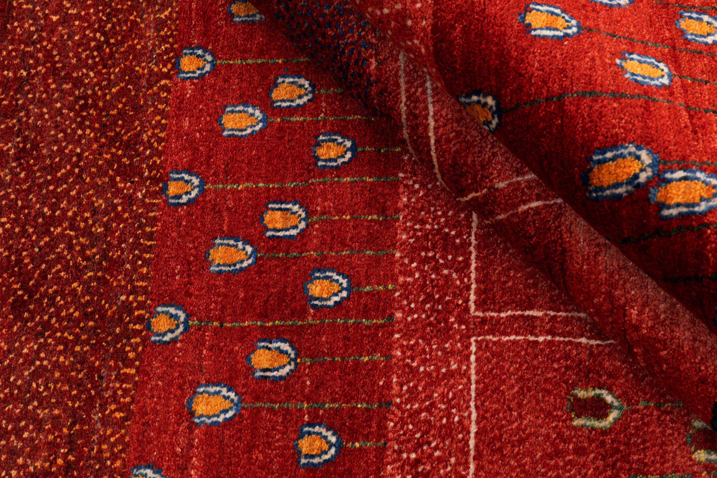 Dette smukke tæppe er en persisk Gabbeh og er en af ​​de højeste kvalitet Gabbeh tæpper. Tæpper er knyttet af nomader eller semi-nomader i Iran ved hjælp af traditionelt håndværk. De enkle motiver og mønstre er for det meste inspireret af nomadernes umiddelbare omgivelser. F.eks. Kan kameler, træer eller buske findes på traditionelle tæpper. Persiske Gabbeh-tæpper er lavet af uld fra lokale fårbesætninger. Ulden er derfor for det meste spundet for hånd. Hver af disse orientalske tæpper udgør en unik karakter af århundreder gammel kultur.