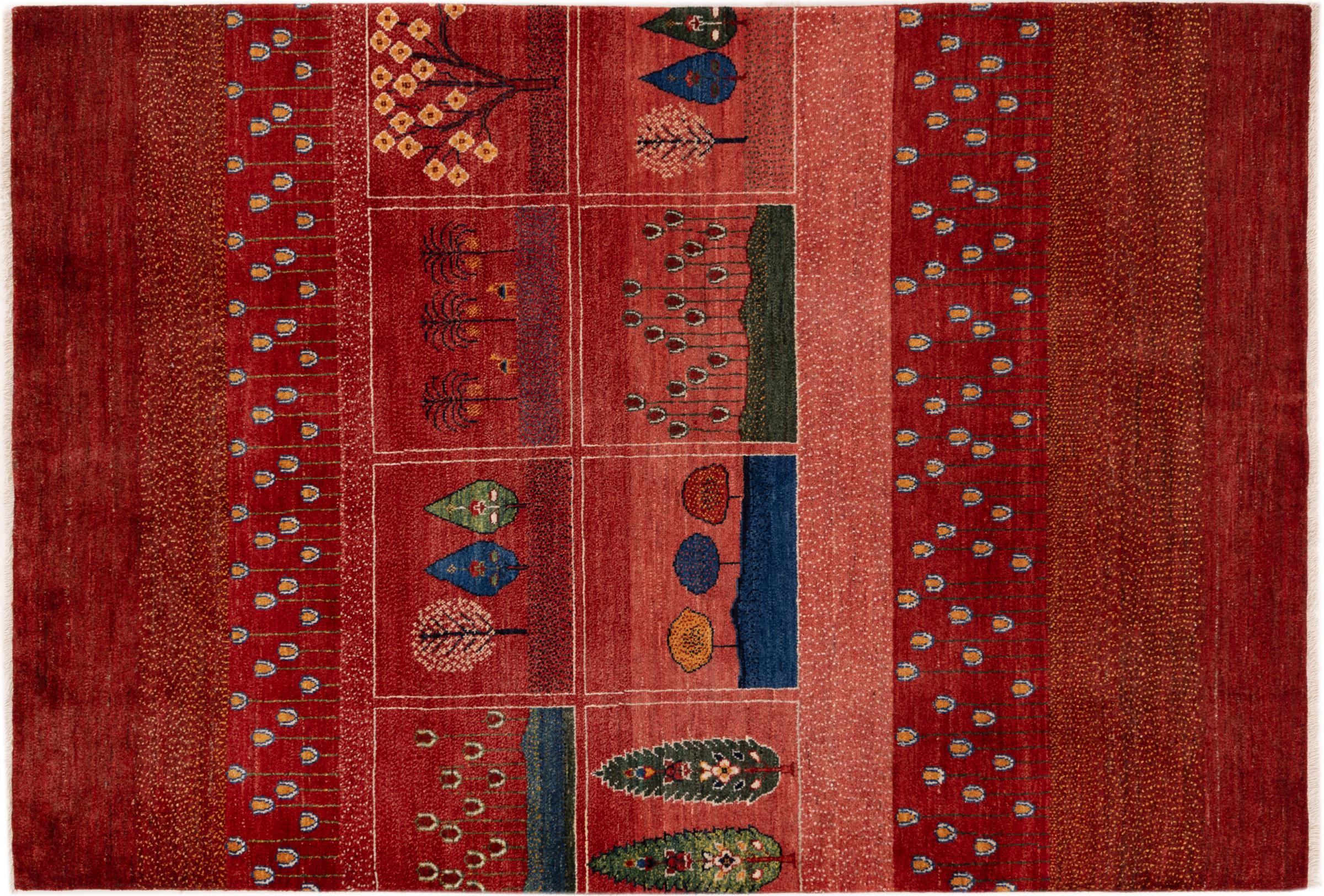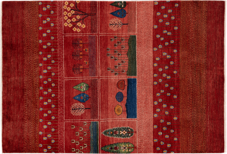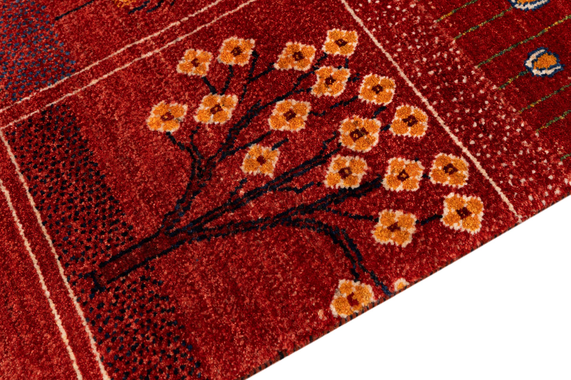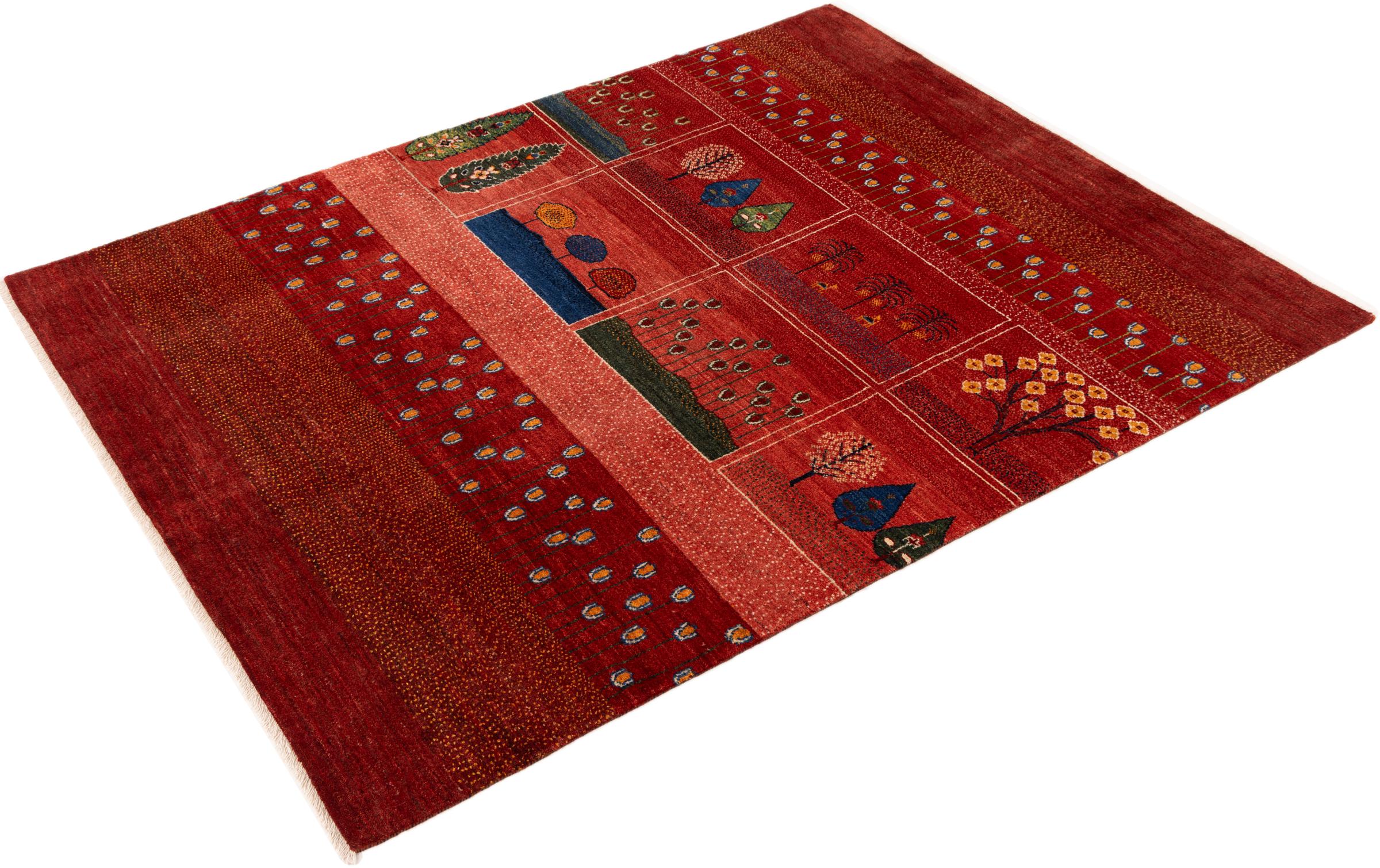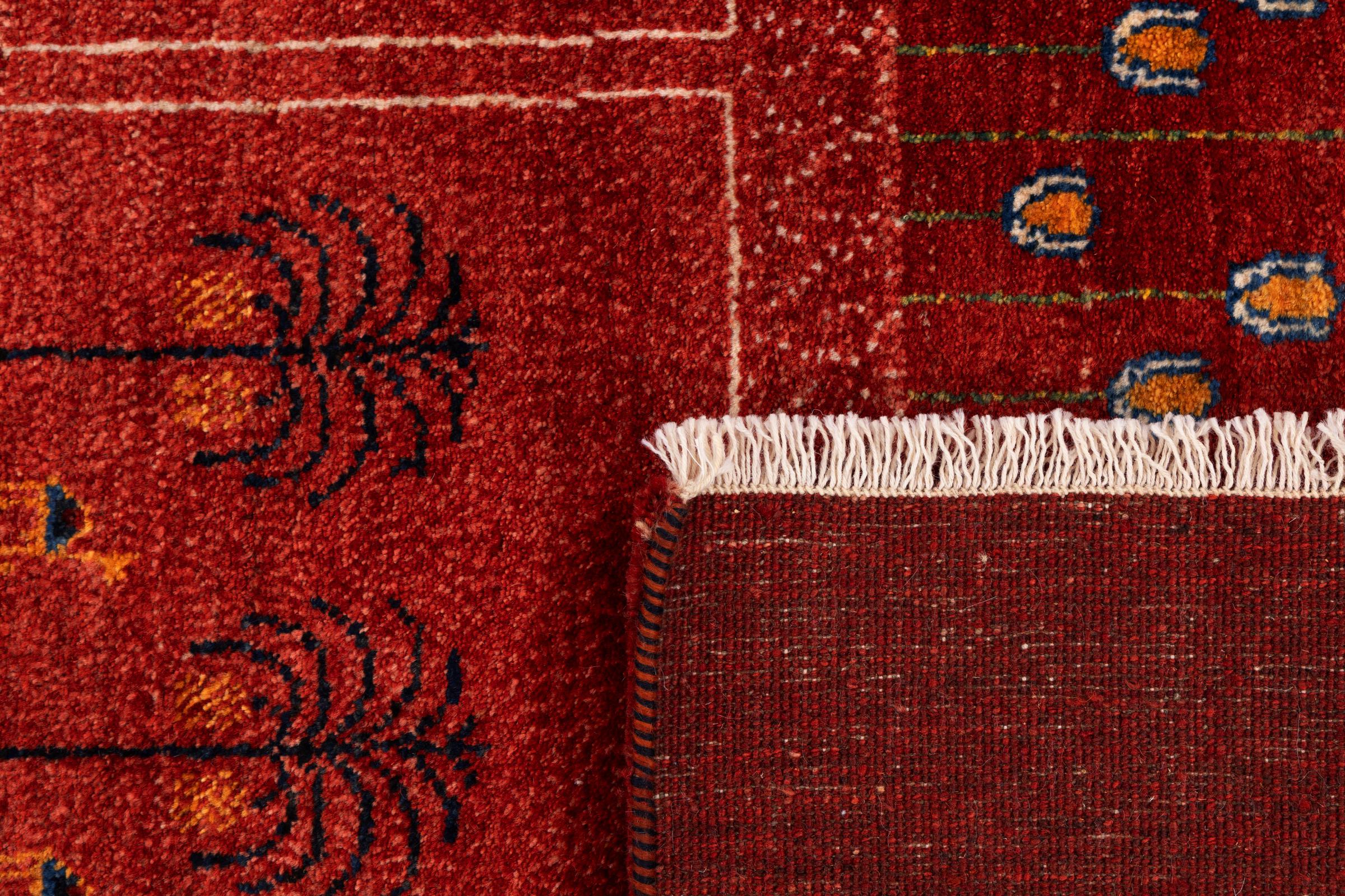 Dette smukke tæppe er en persisk Gabbeh og er en af ​​de højeste kvalitet Gabbeh tæpper. Tæpper er knyttet af nomader eller semi-nomader i Iran ved hjælp af traditionelt håndværk. De enkle motiver og mønstre er for det meste inspireret af nomadernes umiddelbare omgivelser. F.eks. Kan kameler, træer eller buske findes på traditionelle tæpper. Persiske Gabbeh-tæpper er lavet af uld fra lokale fårbesætninger. Ulden er derfor for det meste spundet for hånd. Hver af disse orientalske tæpper udgør en unik karakter af århundreder gammel kultur.