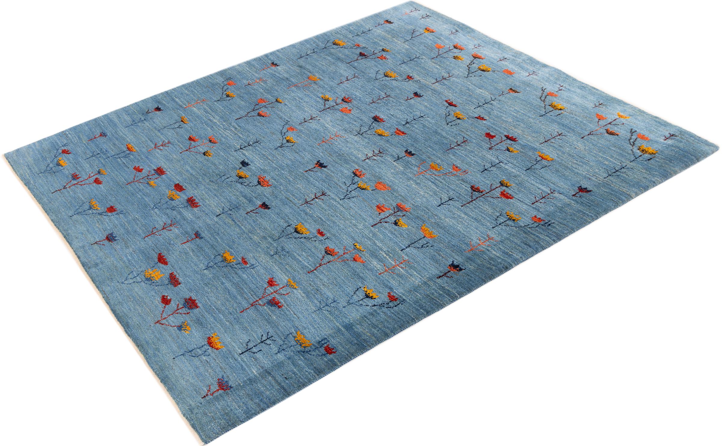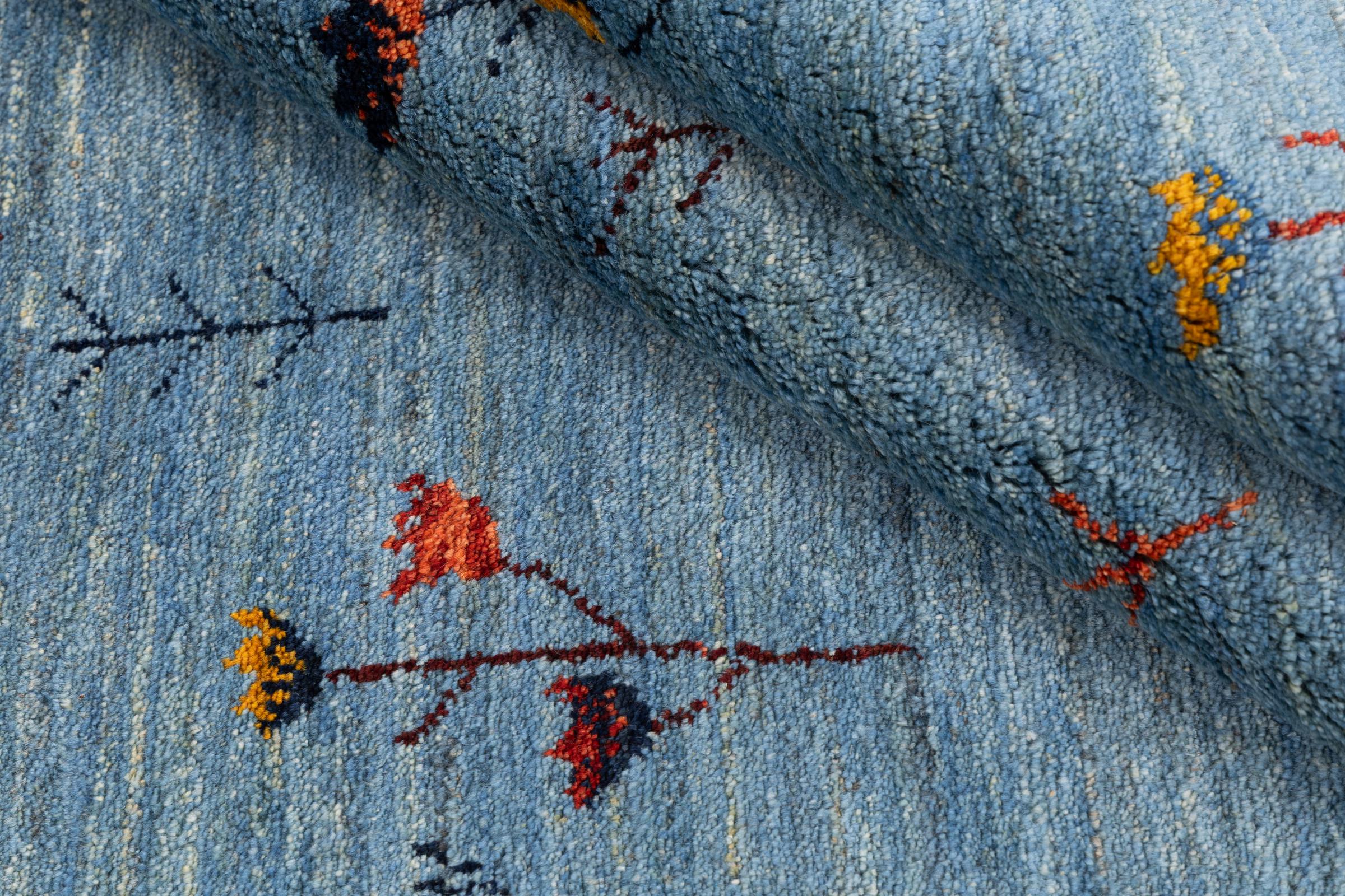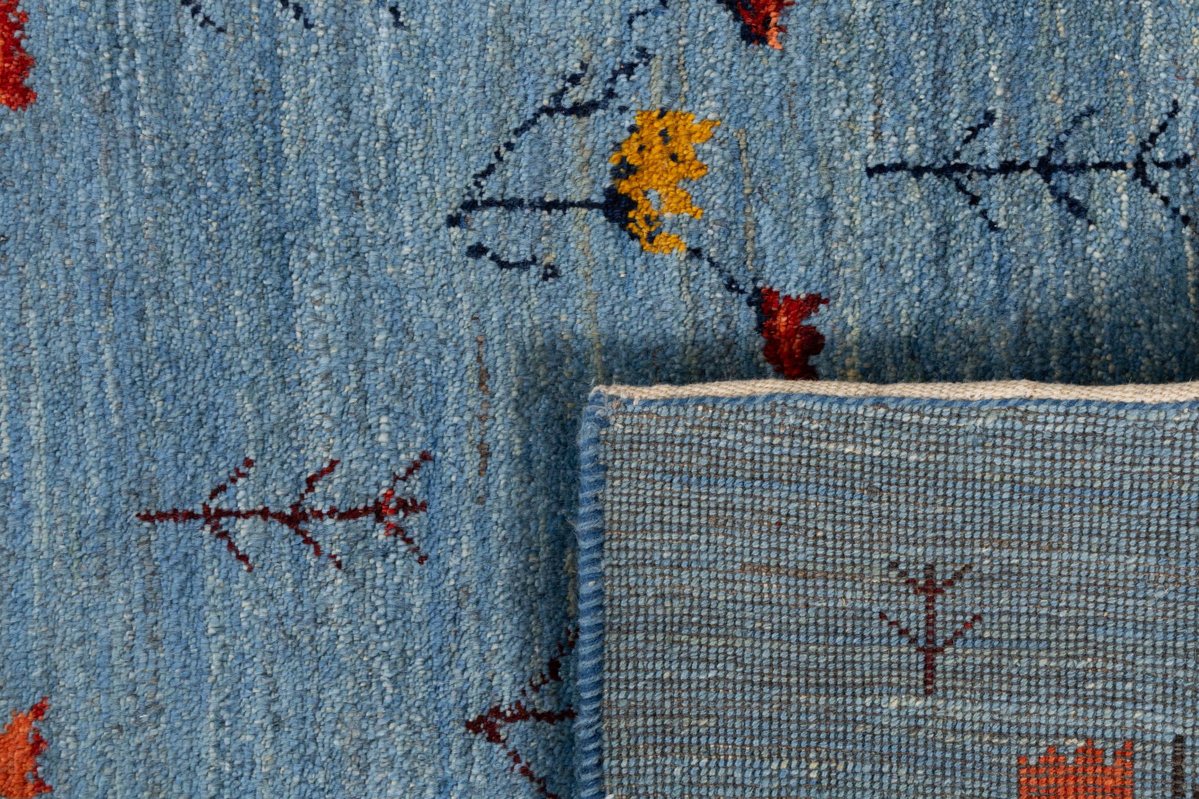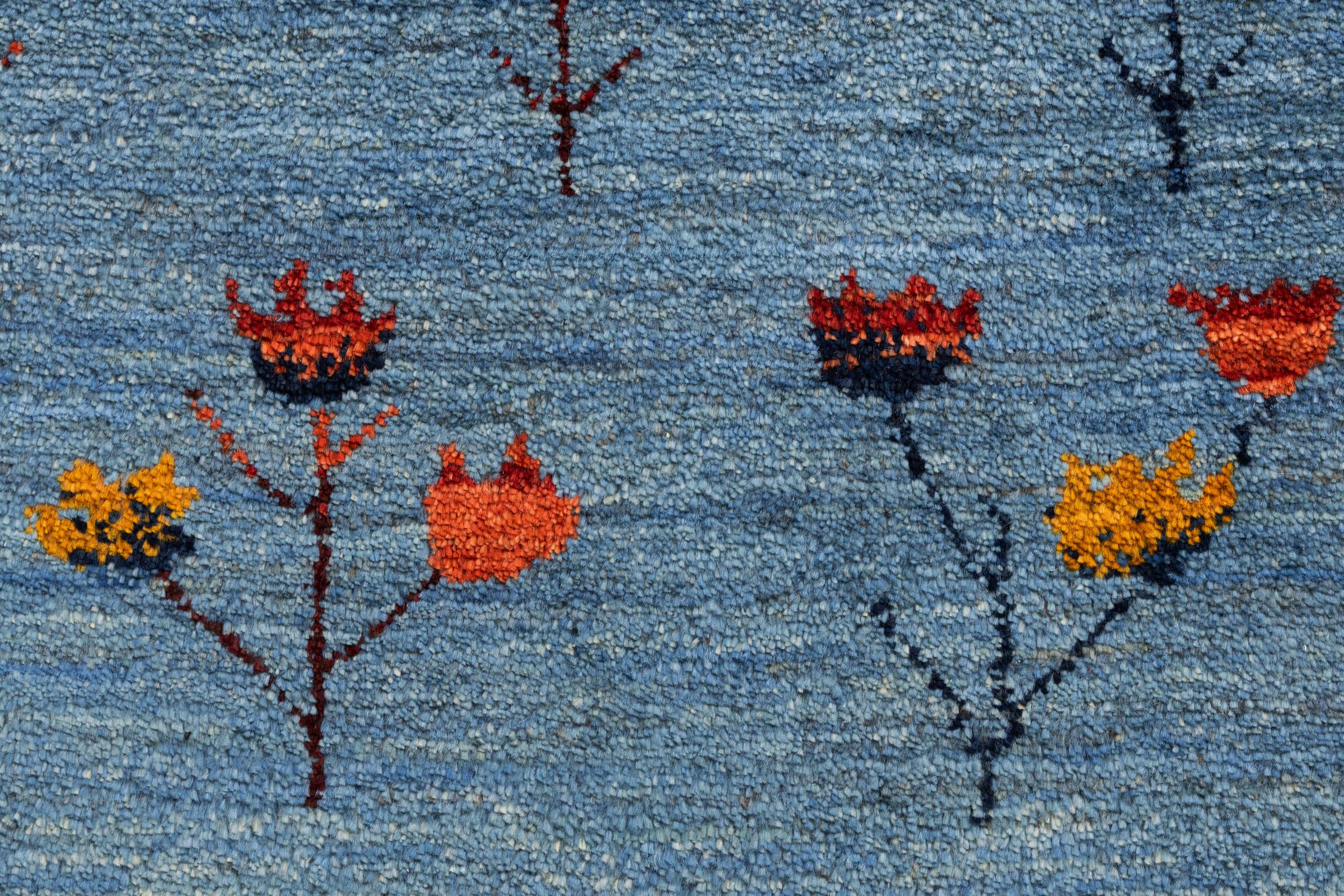 Dette smukke tæppe er en persisk Gabbeh og er en af ​​de højeste kvalitet Gabbeh tæpper. Tæpper er knyttet af nomader eller semi-nomader i Iran ved hjælp af traditionelt håndværk. De enkle motiver og mønstre er for det meste inspireret af nomadernes umiddelbare omgivelser. F.eks. Kan kameler, træer eller buske findes på traditionelle tæpper. Persiske Gabbeh-tæpper er lavet af uld fra lokale fårbesætninger. Ulden er derfor for det meste spundet for hånd. Hver af disse orientalske tæpper udgør en unik karakter af århundreder gammel kultur.