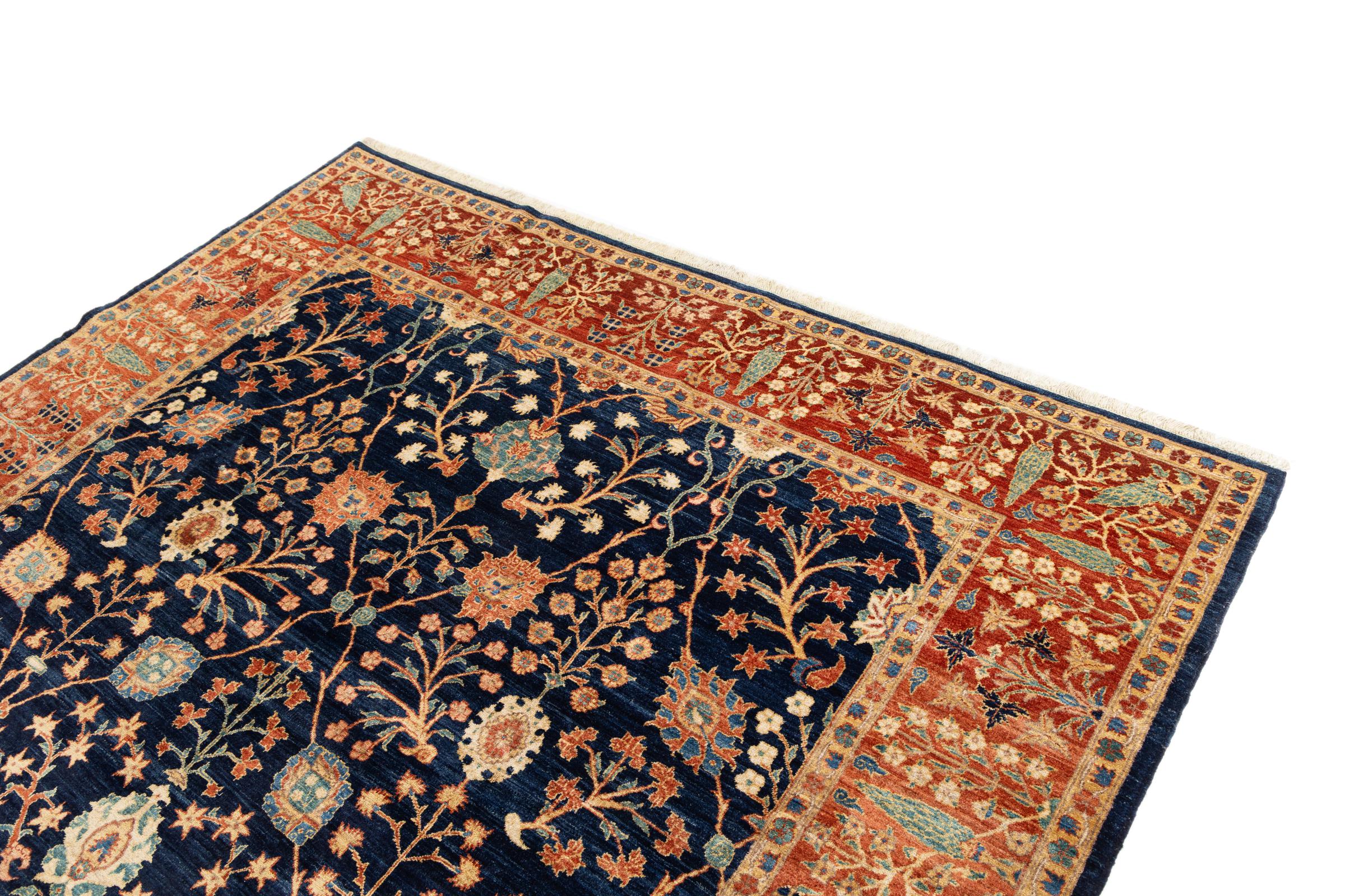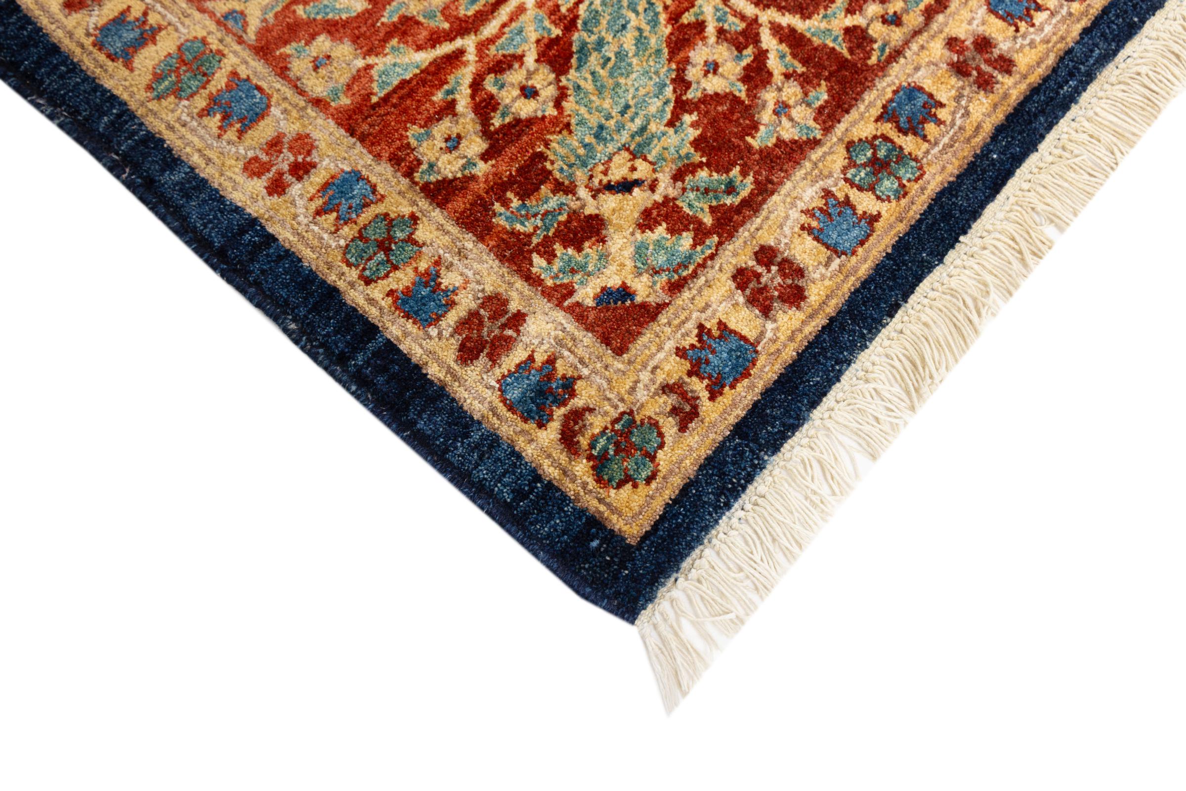 Dette smukke tæppe er en persisk Gabbeh og er en af ​​de højeste kvalitet Gabbeh tæpper. Tæpper er knyttet af nomader eller semi-nomader i Iran ved hjælp af traditionelt håndværk. De enkle motiver og mønstre er for det meste inspireret af nomadernes umiddelbare omgivelser. F.eks. Kan kameler, træer eller buske findes på traditionelle tæpper. Persiske Gabbeh-tæpper er lavet af uld fra lokale fårbesætninger. Ulden er derfor for det meste spundet for hånd. Hver af disse orientalske tæpper udgør en unik karakter af århundreder gammel kultur.