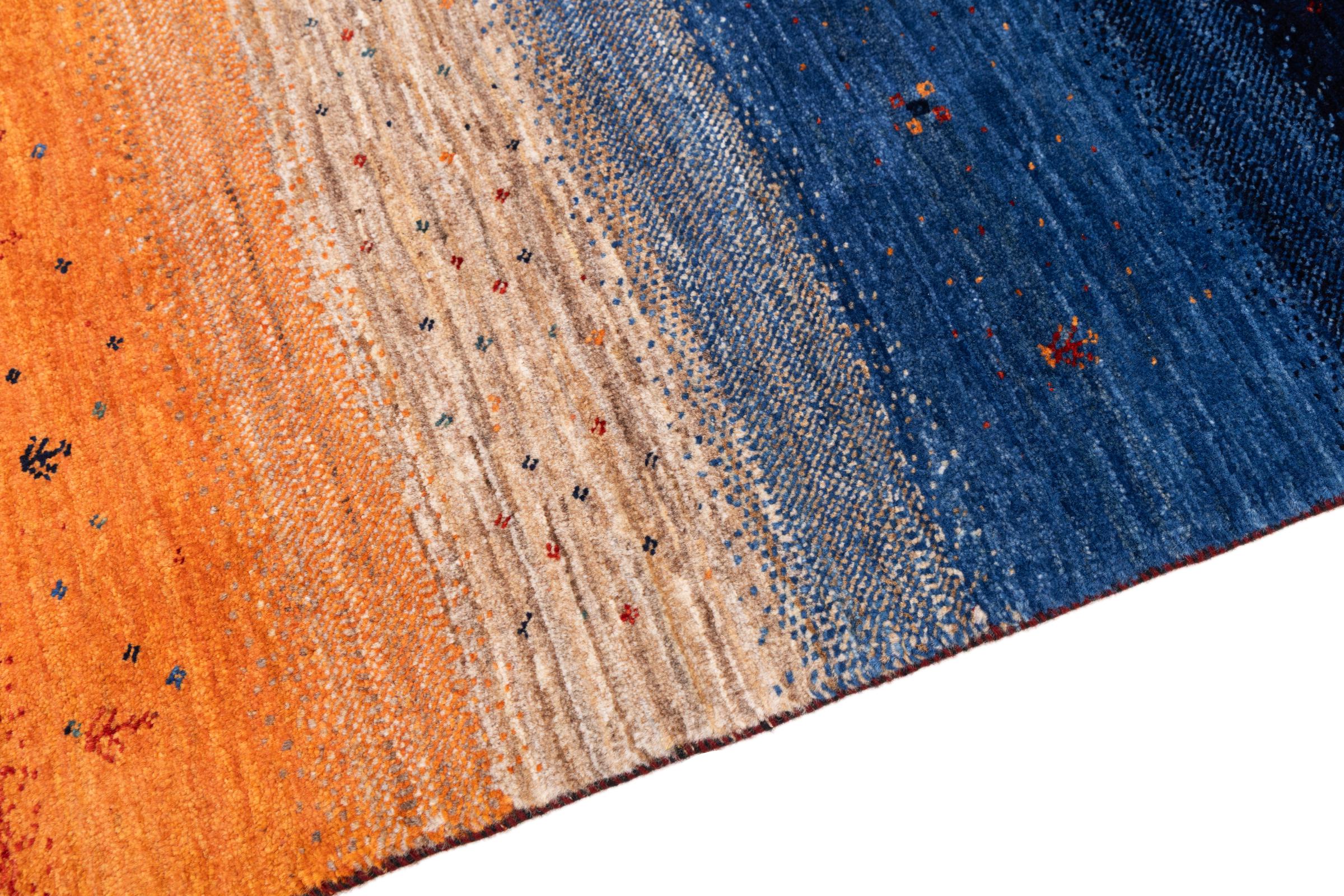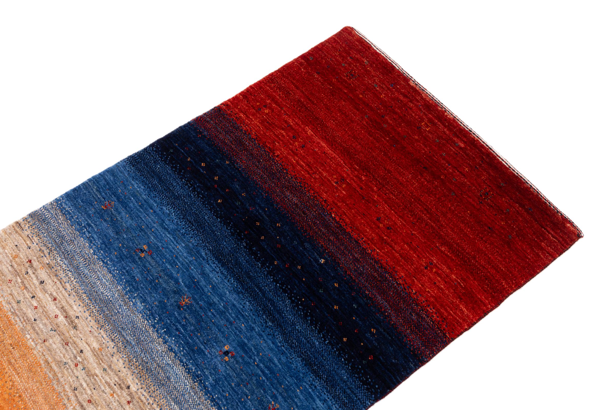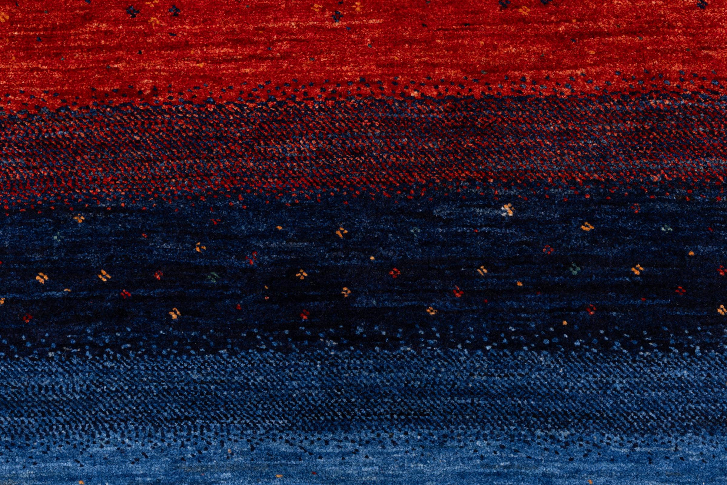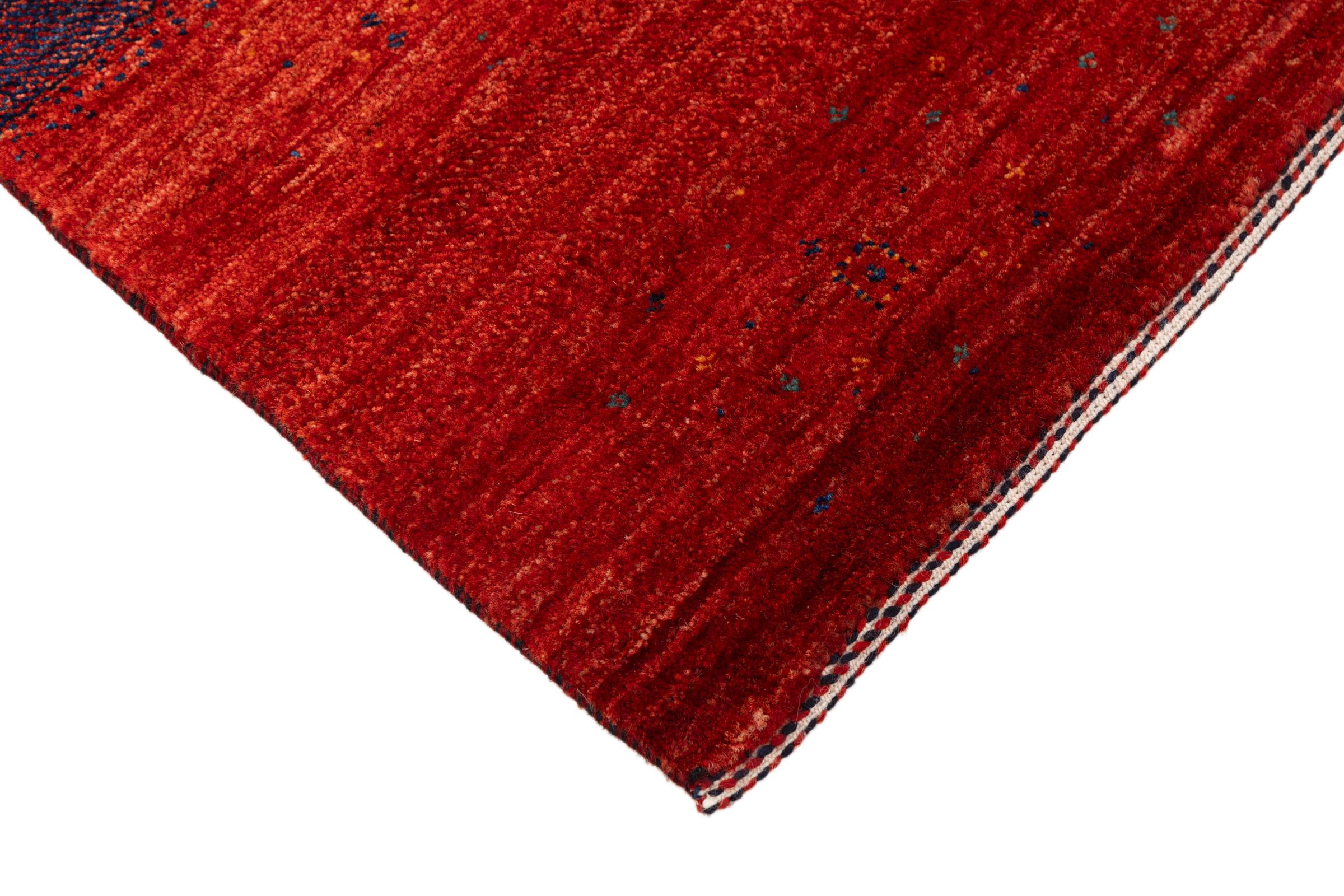 Dette smukke tæppe er en persisk Gabbeh og er en af ​​de højeste kvalitet Gabbeh tæpper. Tæpper er knyttet af nomader eller semi-nomader i Iran ved hjælp af traditionelt håndværk. De enkle motiver og mønstre er for det meste inspireret af nomadernes umiddelbare omgivelser. F.eks. Kan kameler, træer eller buske findes på traditionelle tæpper. Persiske Gabbeh-tæpper er lavet af uld fra lokale fårbesætninger. Ulden er derfor for det meste spundet for hånd. Hver af disse orientalske tæpper udgør en unik karakter af århundreder gammel kultur.