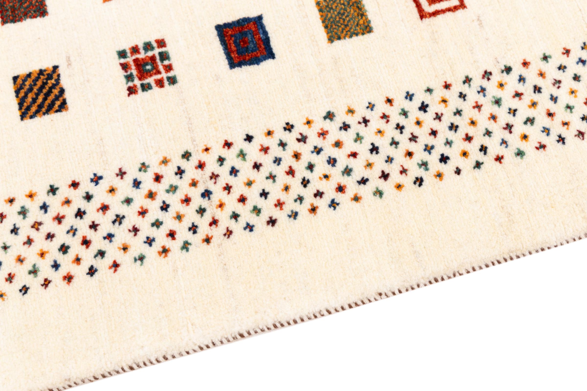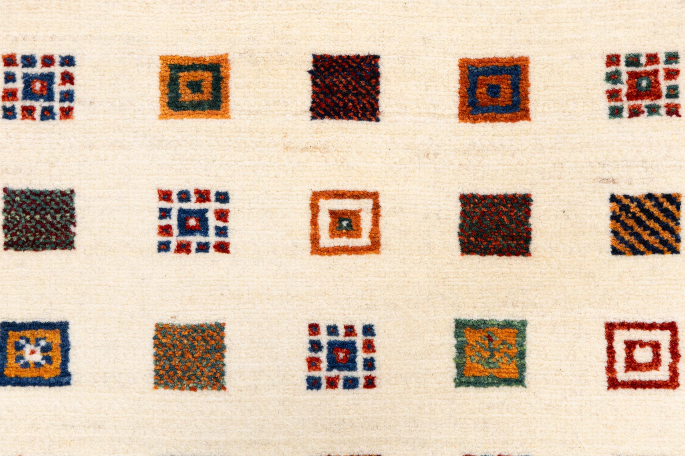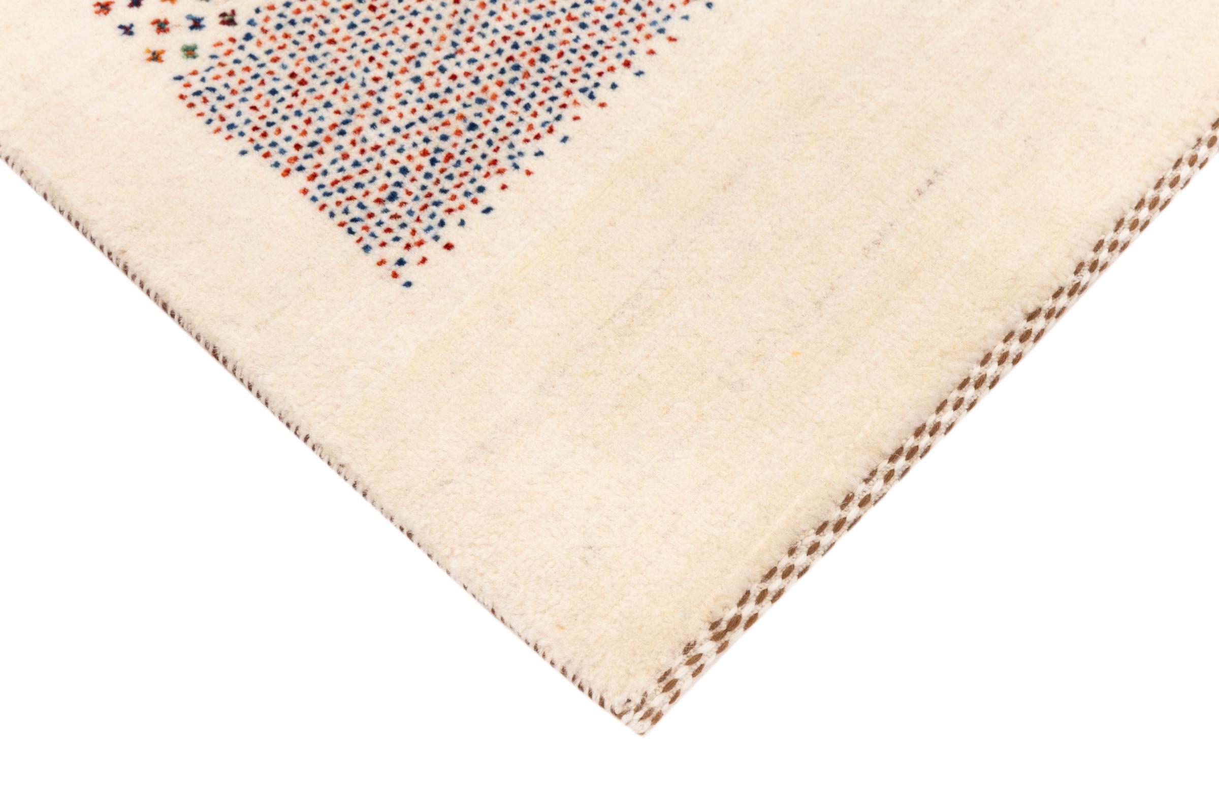Dette smukke tæppe er en persisk Gabbeh og er en af ​​de højeste kvalitet Gabbeh tæpper. Tæpper er knyttet af nomader eller semi-nomader i Iran ved hjælp af traditionelt håndværk. De enkle motiver og mønstre er for det meste inspireret af nomadernes umiddelbare omgivelser. F.eks. Kan kameler, træer eller buske findes på traditionelle tæpper. Persiske Gabbeh-tæpper er lavet af uld fra lokale fårbesætninger. Ulden er derfor for det meste spundet for hånd. Hver af disse orientalske tæpper udgør en unik karakter af århundreder gammel kultur.