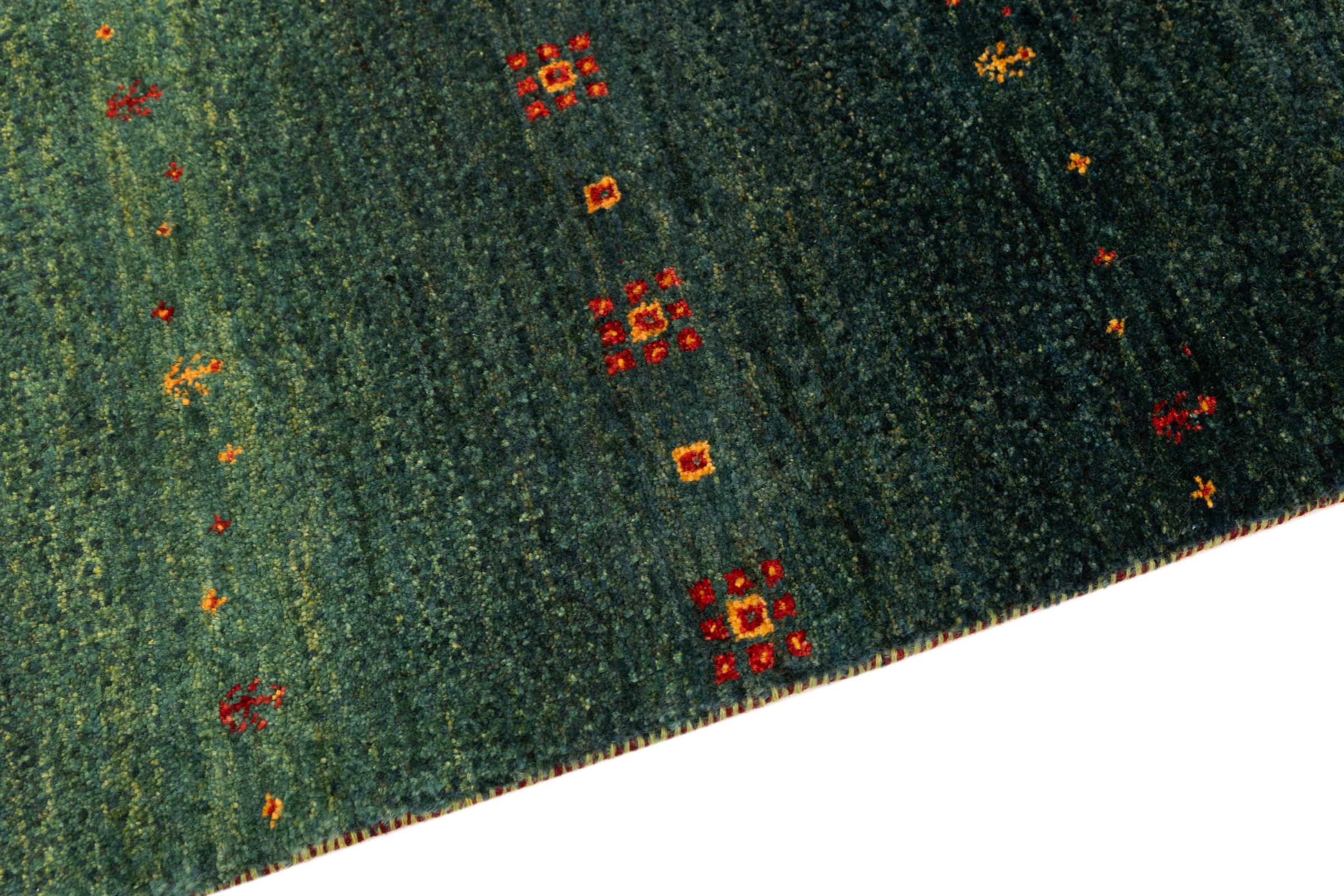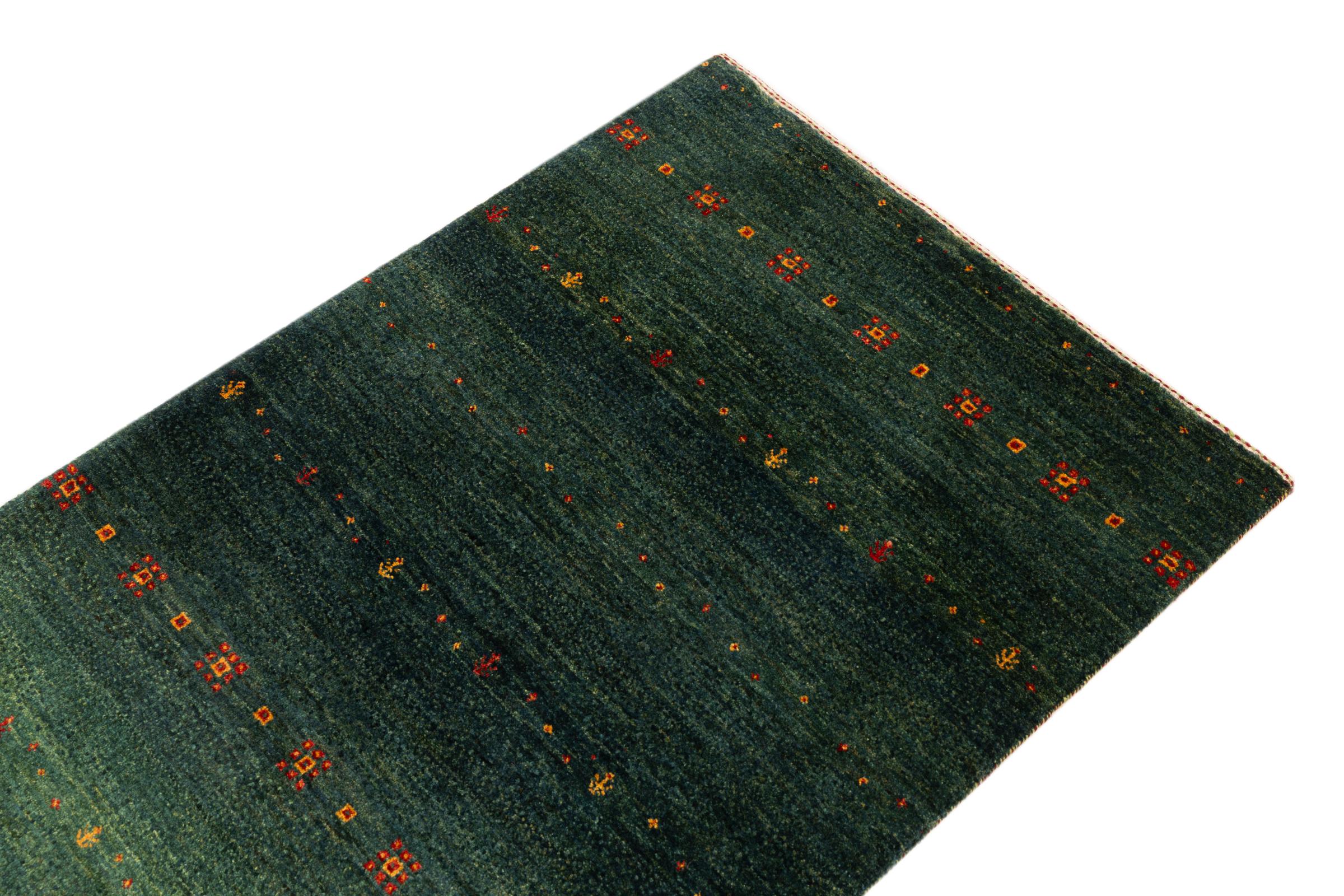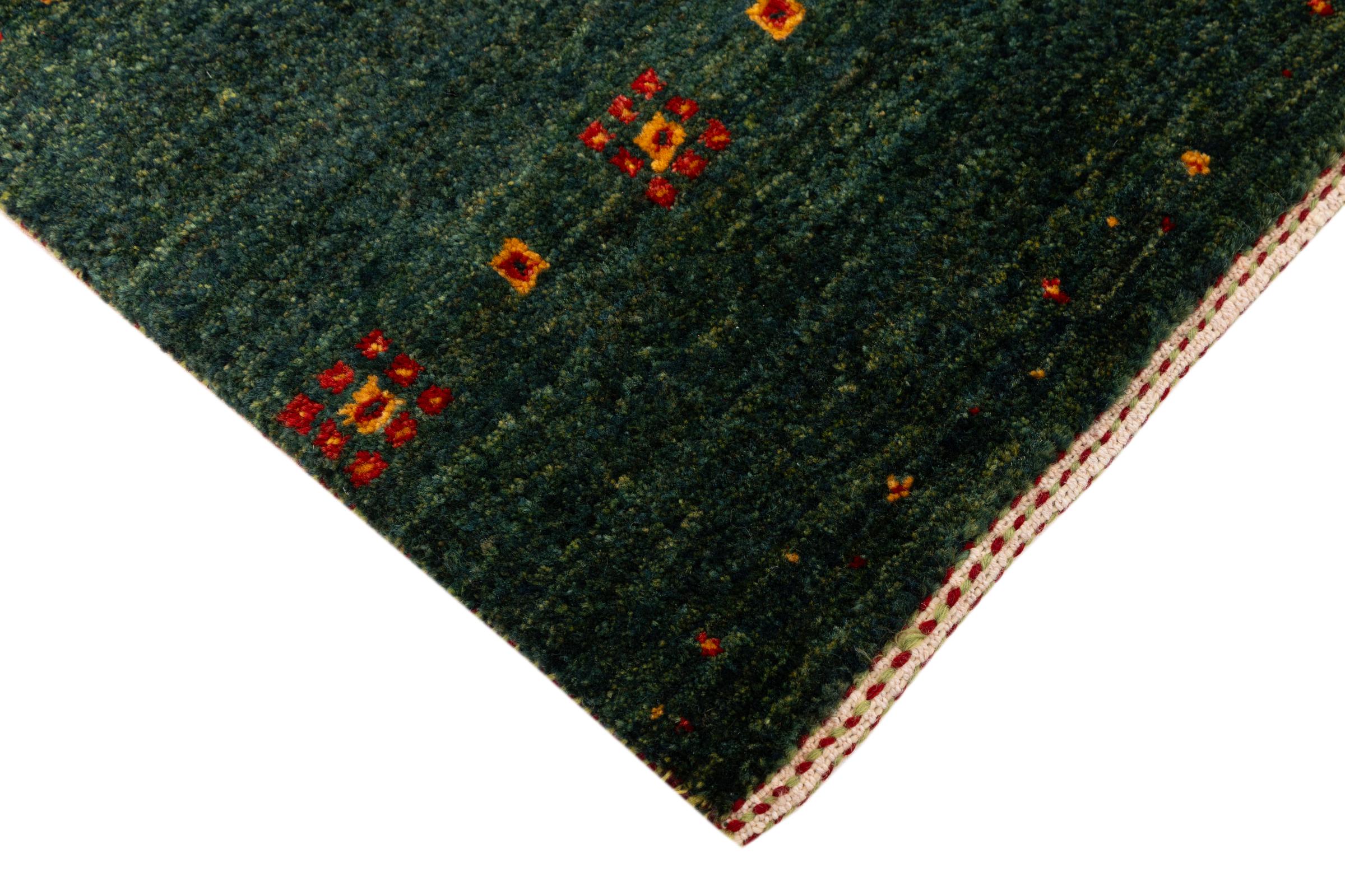 Dette smukke tæppe er en persisk Gabbeh og er en af ​​de højeste kvalitet Gabbeh tæpper. Tæpper er knyttet af nomader eller semi-nomader i Iran ved hjælp af traditionelt håndværk. De enkle motiver og mønstre er for det meste inspireret af nomadernes umiddelbare omgivelser. F.eks. Kan kameler, træer eller buske findes på traditionelle tæpper. Persiske Gabbeh-tæpper er lavet af uld fra lokale fårbesætninger. Ulden er derfor for det meste spundet for hånd. Hver af disse orientalske tæpper udgør en unik karakter af århundreder gammel kultur.