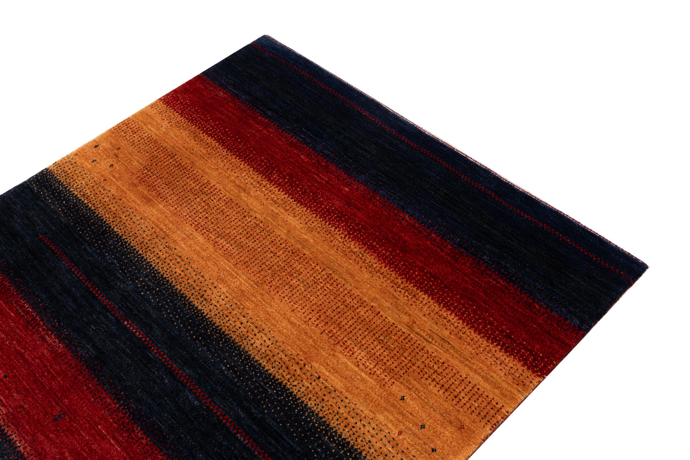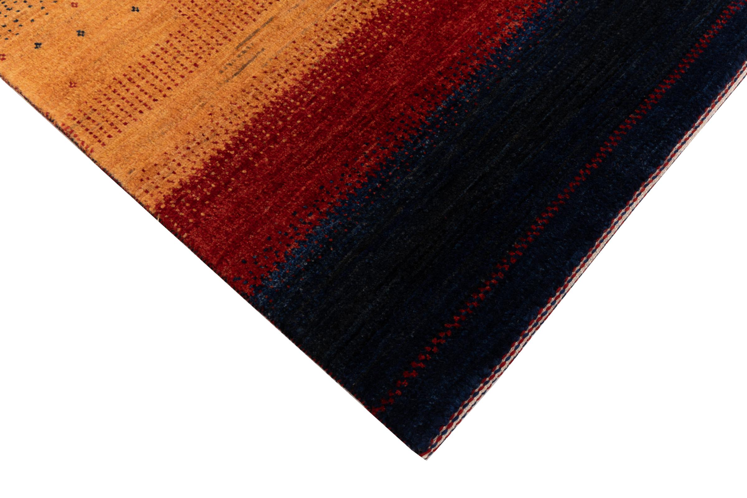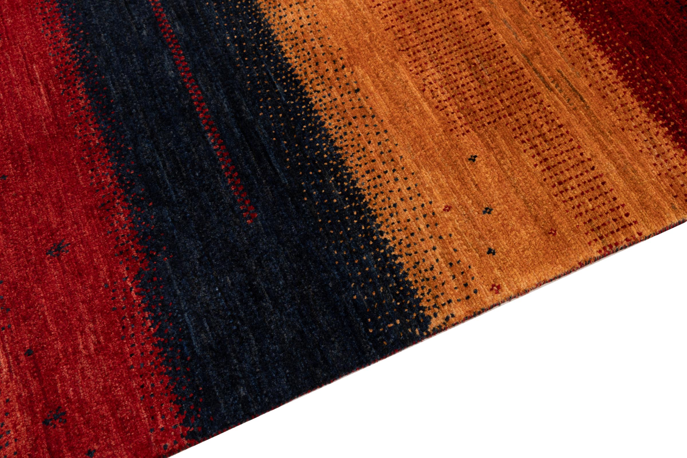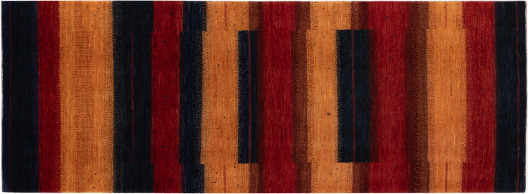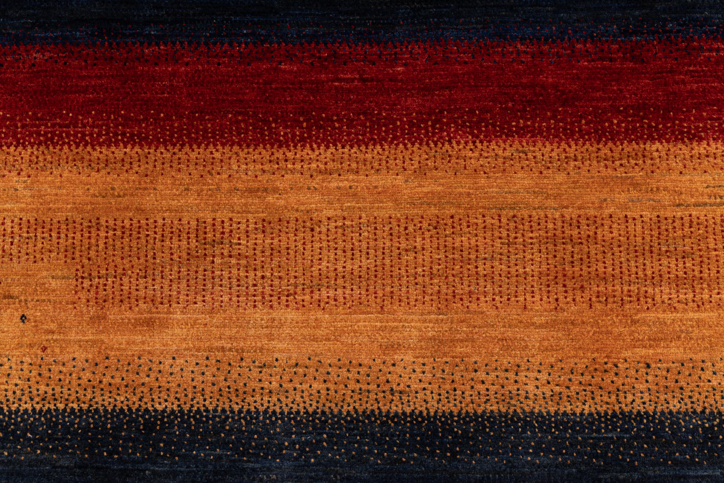 Dette smukke tæppe er en persisk Gabbeh og er en af ​​de højeste kvalitet Gabbeh tæpper. Tæpper er knyttet af nomader eller semi-nomader i Iran ved hjælp af traditionelt håndværk. De enkle motiver og mønstre er for det meste inspireret af nomadernes umiddelbare omgivelser. F.eks. Kan kameler, træer eller buske findes på traditionelle tæpper. Persiske Gabbeh-tæpper er lavet af uld fra lokale fårbesætninger. Ulden er derfor for det meste spundet for hånd. Hver af disse orientalske tæpper udgør en unik karakter af århundreder gammel kultur.