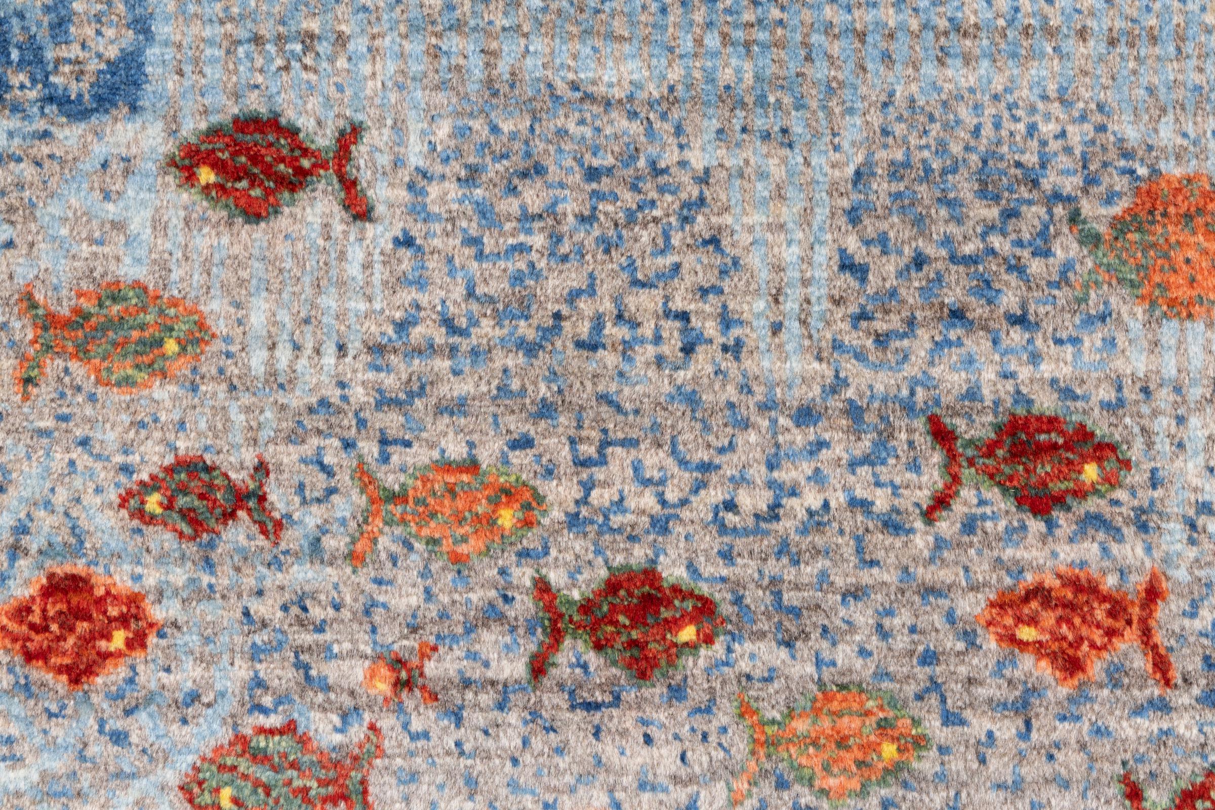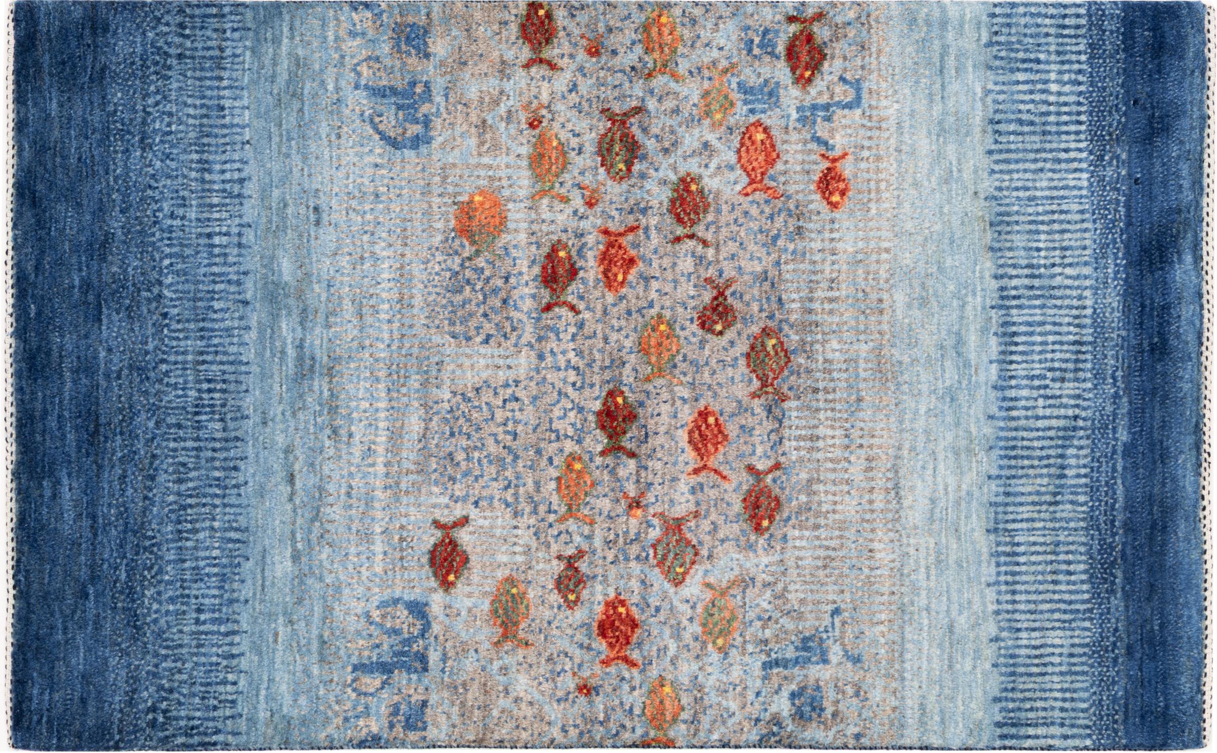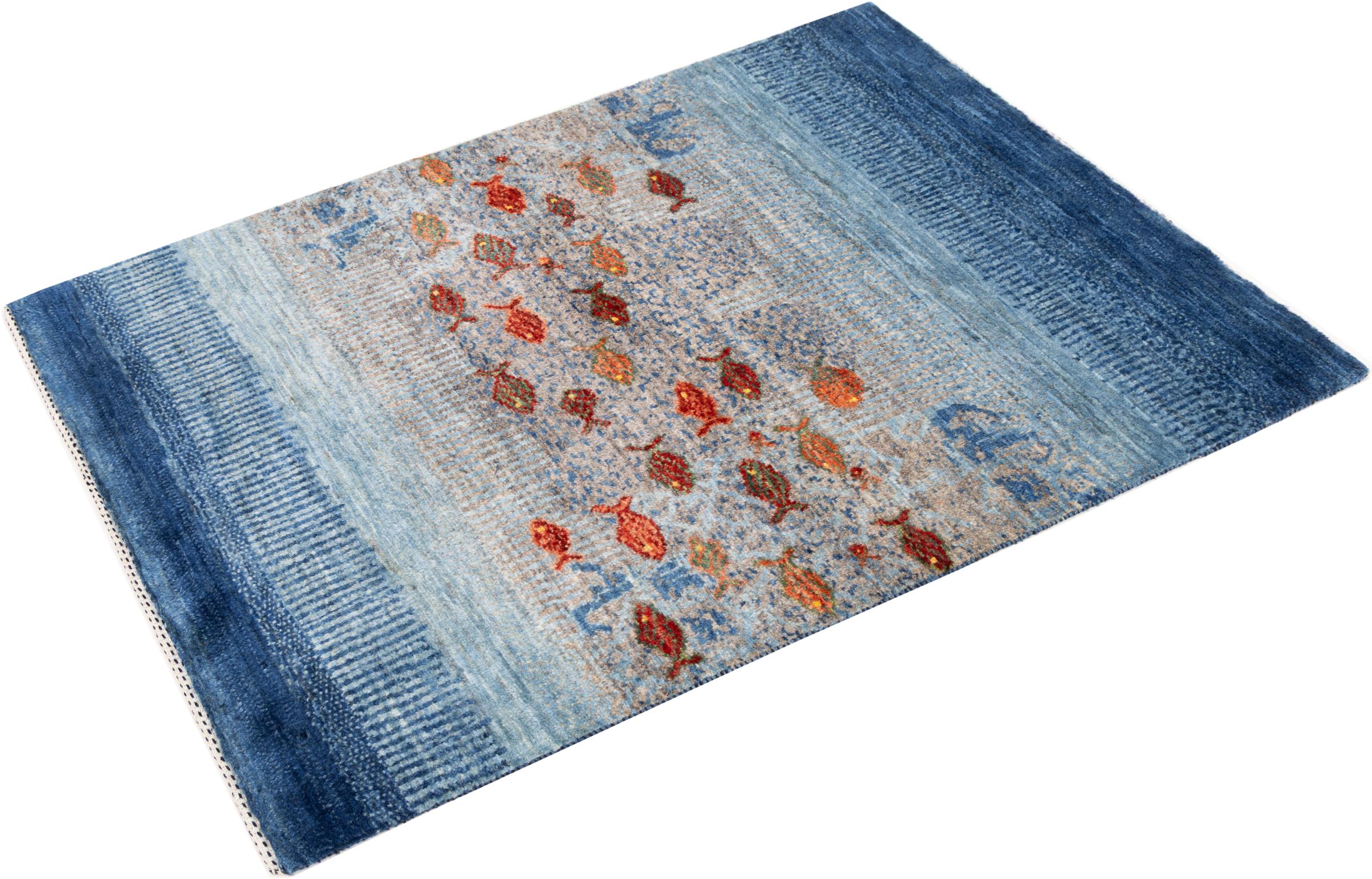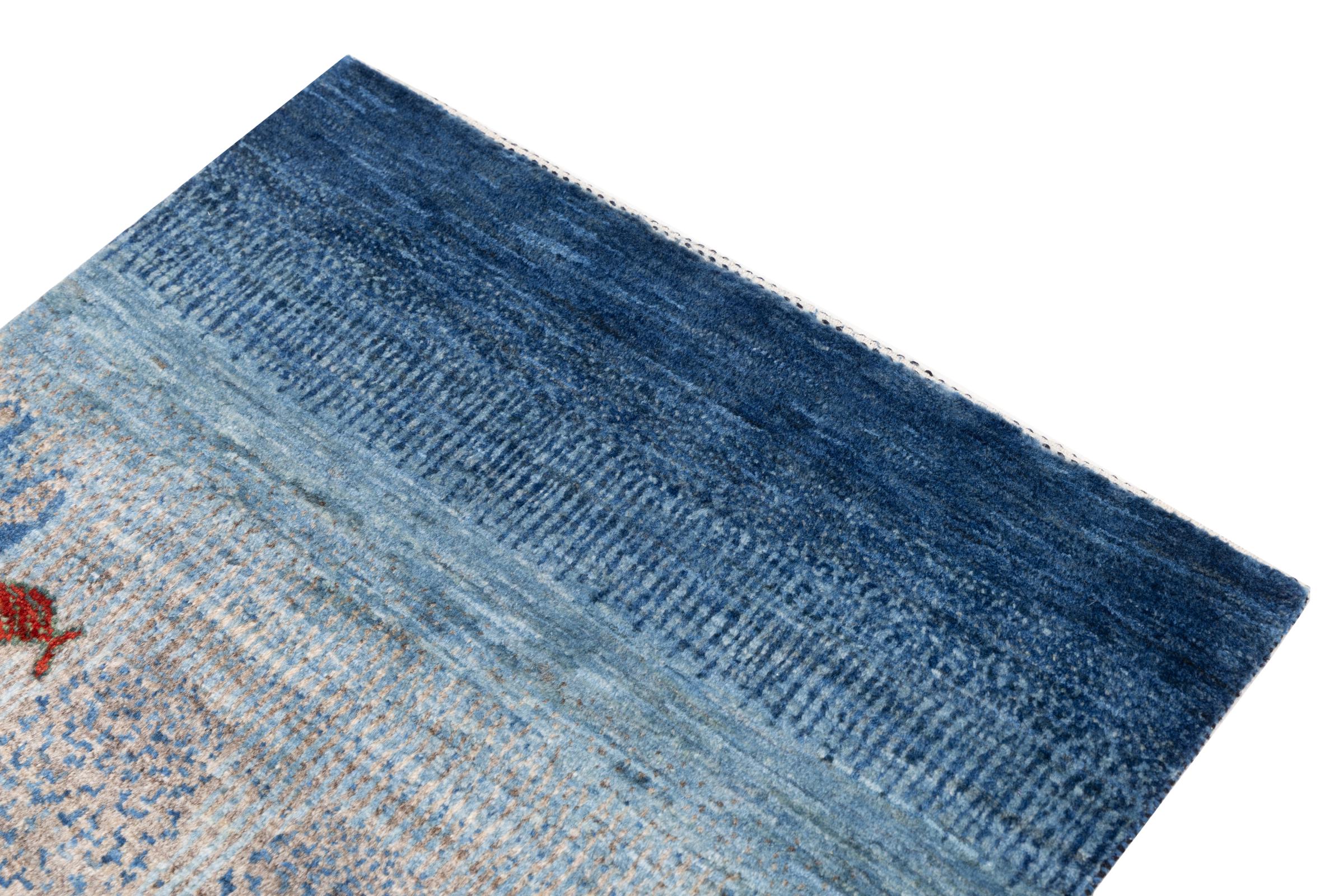 Dette smukke tæppe er en persisk Gabbeh og er en af ​​de højeste kvalitet Gabbeh tæpper. Tæpper er knyttet af nomader eller semi-nomader i Iran ved hjælp af traditionelt håndværk. De enkle motiver og mønstre er for det meste inspireret af nomadernes umiddelbare omgivelser. F.eks. Kan kameler, træer eller buske findes på traditionelle tæpper. Persiske Gabbeh-tæpper er lavet af uld fra lokale fårbesætninger. Ulden er derfor for det meste spundet for hånd. Hver af disse orientalske tæpper udgør en unik karakter af århundreder gammel kultur.