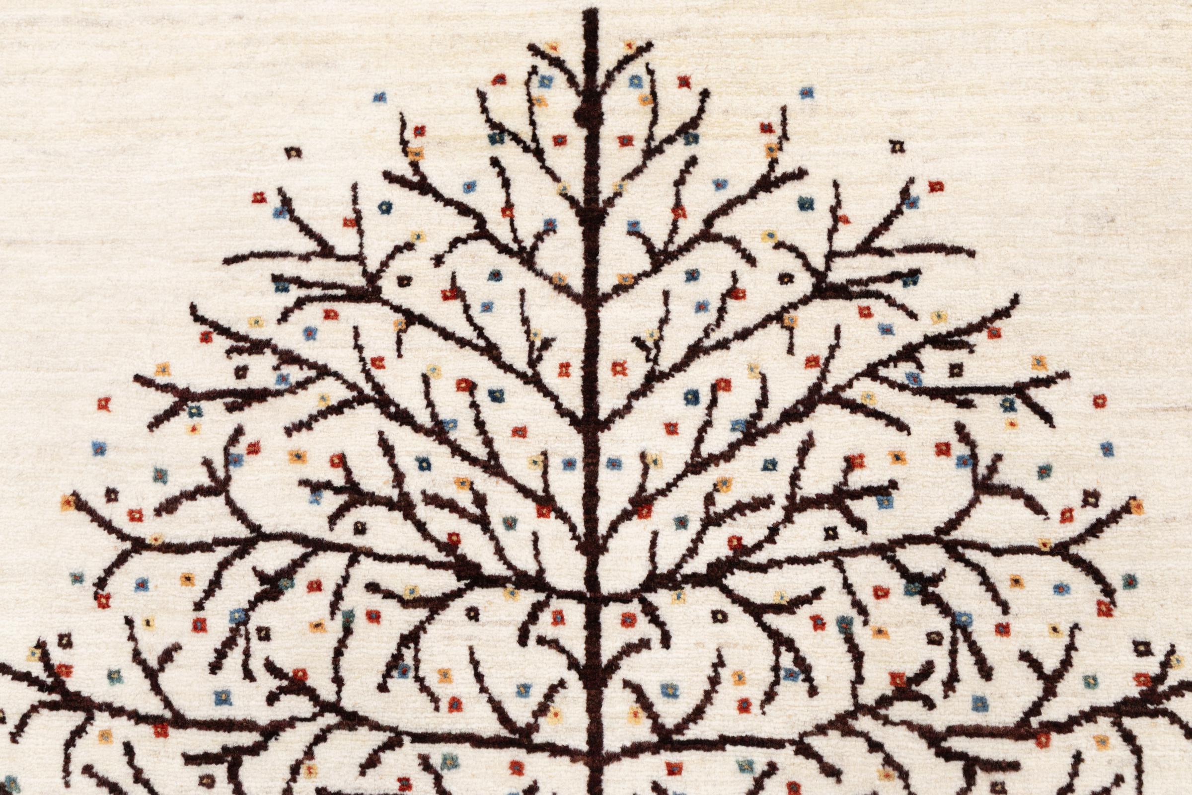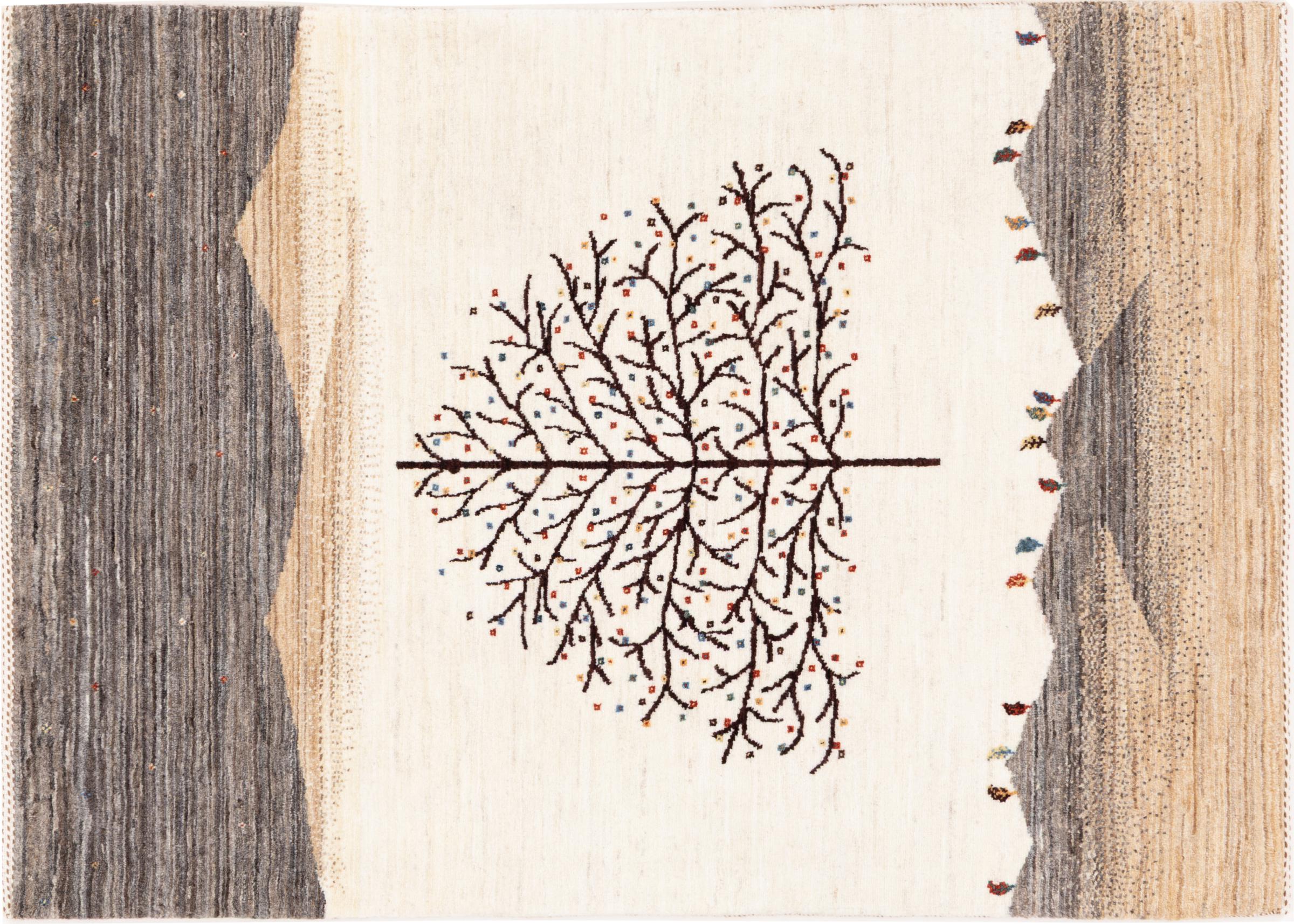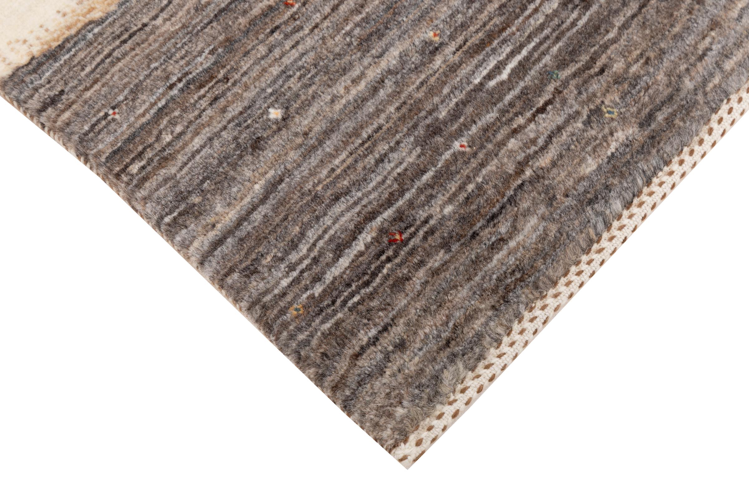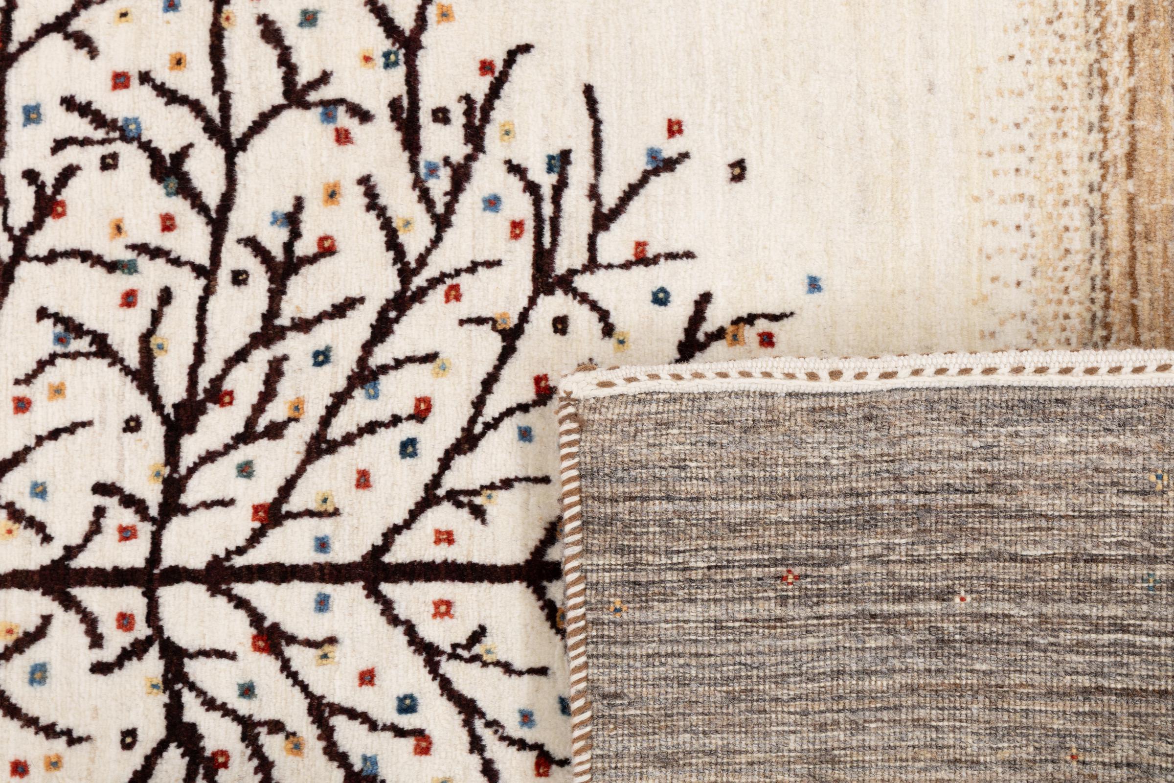 Dette smukke tæppe er en persisk Gabbeh og er en af ​​de højeste kvalitet Gabbeh tæpper. Tæpper er knyttet af nomader eller semi-nomader i Iran ved hjælp af traditionelt håndværk. De enkle motiver og mønstre er for det meste inspireret af nomadernes umiddelbare omgivelser. F.eks. Kan kameler, træer eller buske findes på traditionelle tæpper. Persiske Gabbeh-tæpper er lavet af uld fra lokale fårbesætninger. Ulden er derfor for det meste spundet for hånd. Hver af disse orientalske tæpper udgør en unik karakter af århundreder gammel kultur.