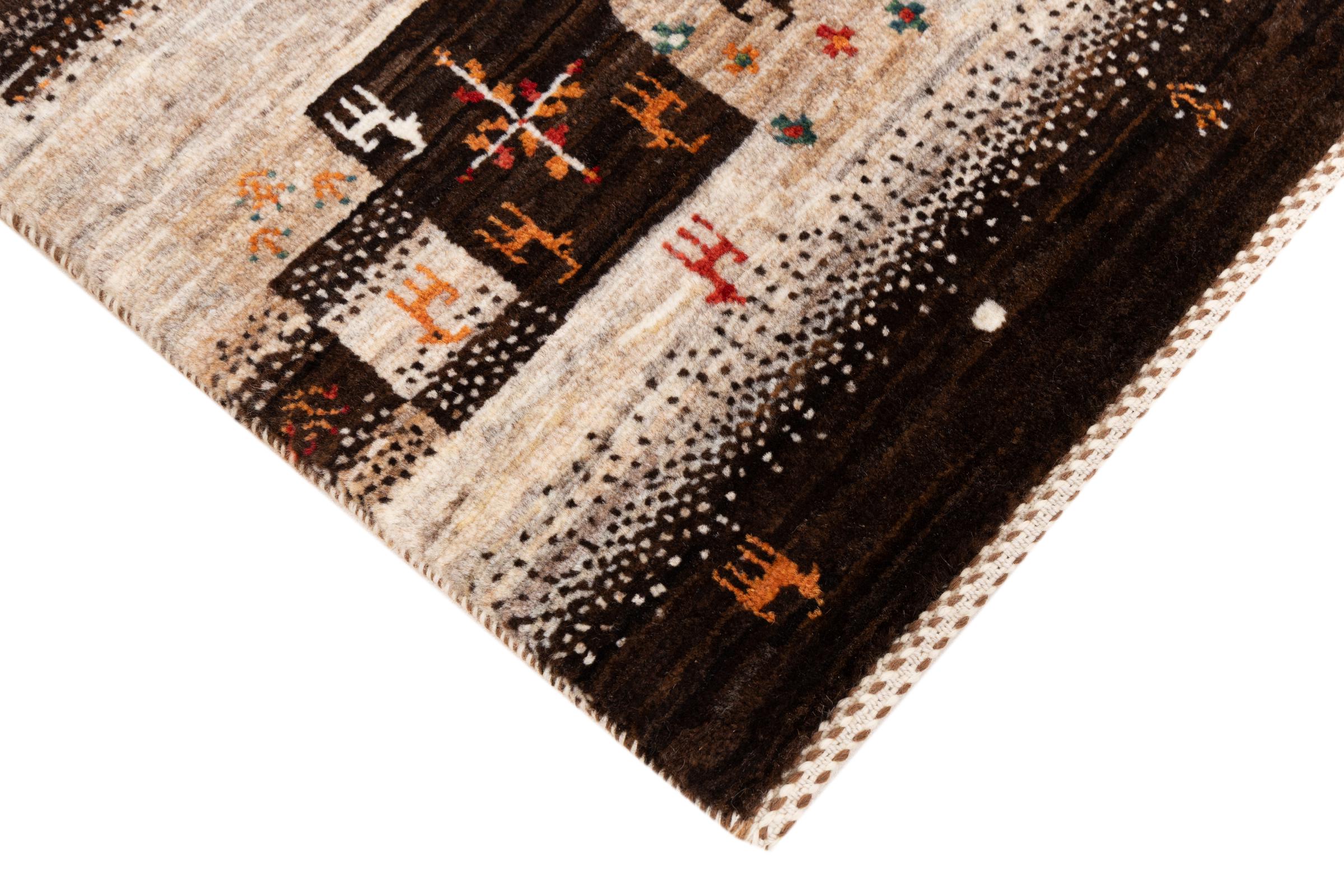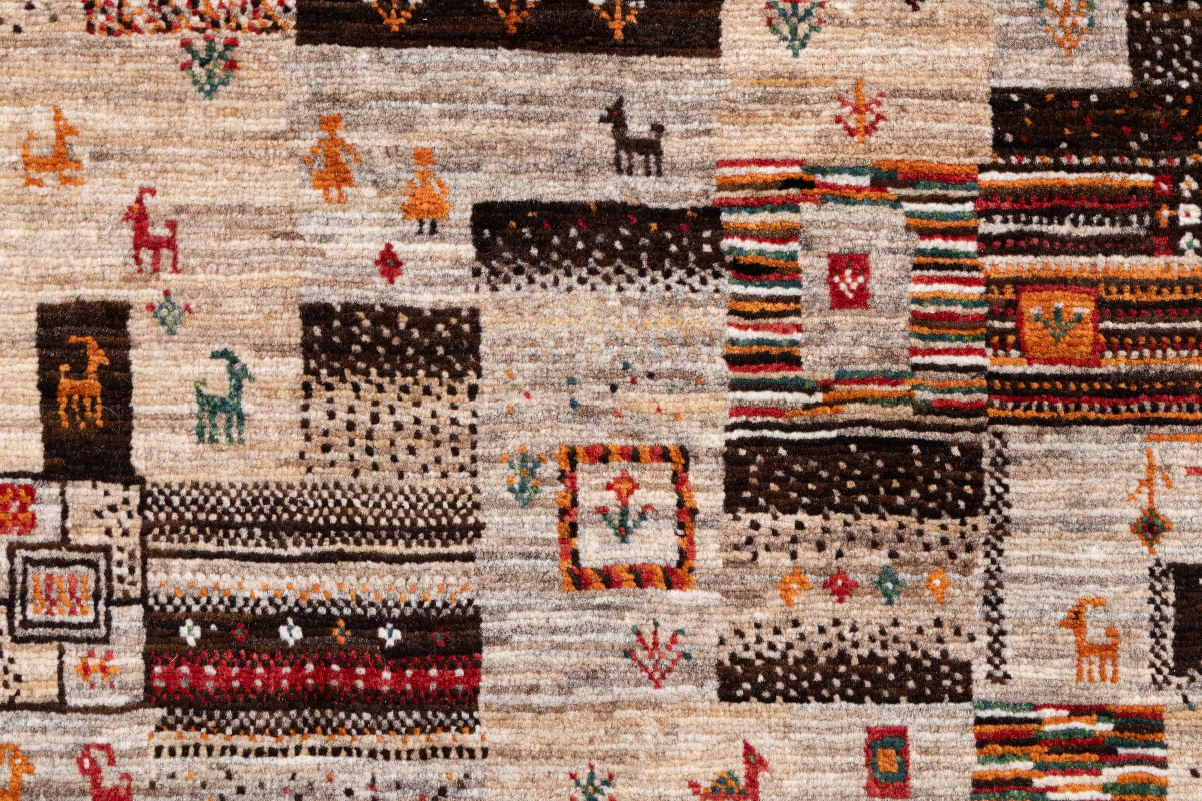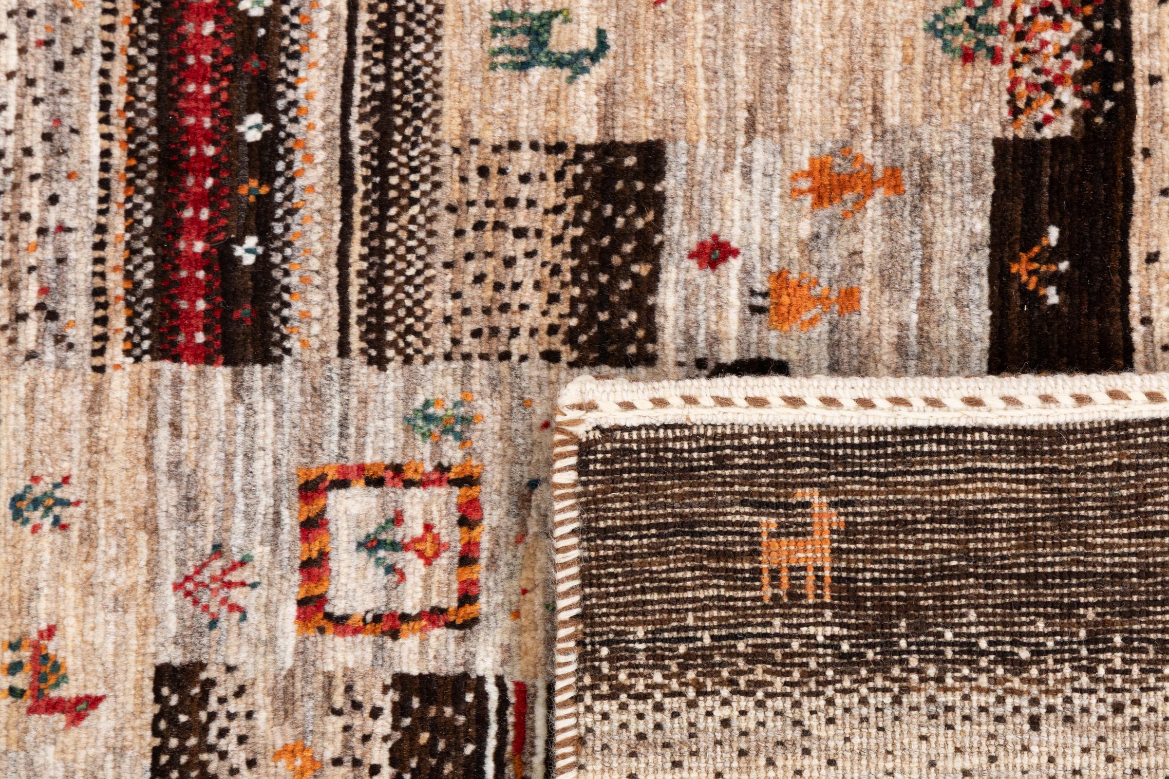 Dette smukke tæppe er en persisk Gabbeh og er en af ​​de højeste kvalitet Gabbeh tæpper. Tæpper er knyttet af nomader eller semi-nomader i Iran ved hjælp af traditionelt håndværk. De enkle motiver og mønstre er for det meste inspireret af nomadernes umiddelbare omgivelser. F.eks. Kan kameler, træer eller buske findes på traditionelle tæpper. Persiske Gabbeh-tæpper er lavet af uld fra lokale fårbesætninger. Ulden er derfor for det meste spundet for hånd. Hver af disse orientalske tæpper udgør en unik karakter af århundreder gammel kultur.