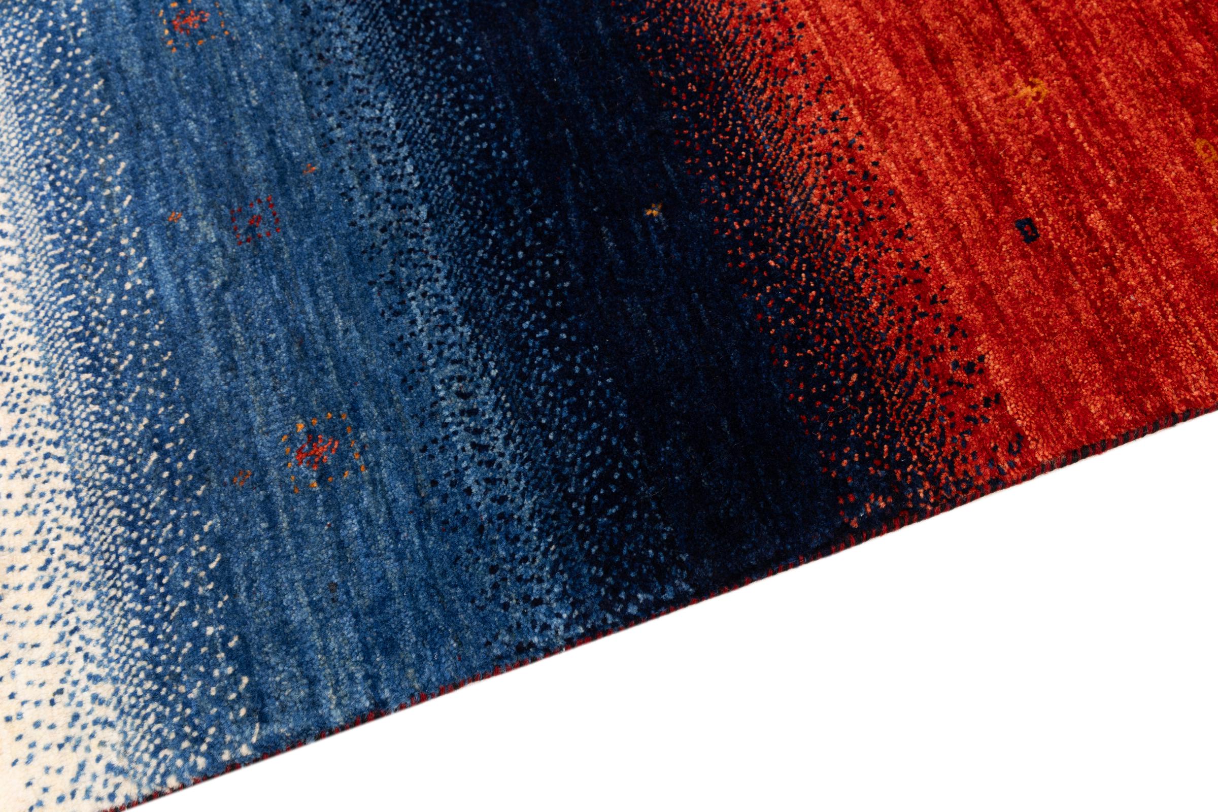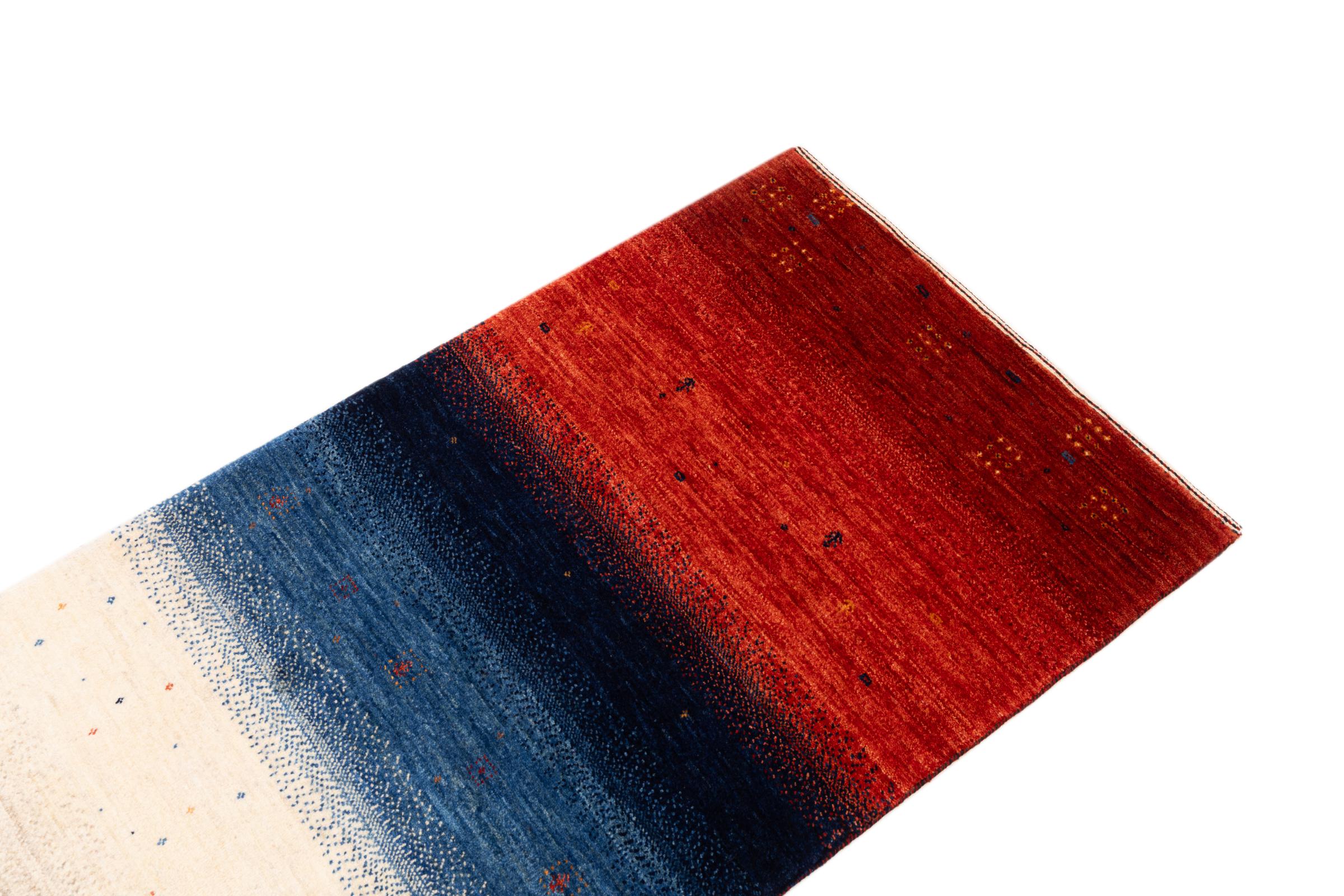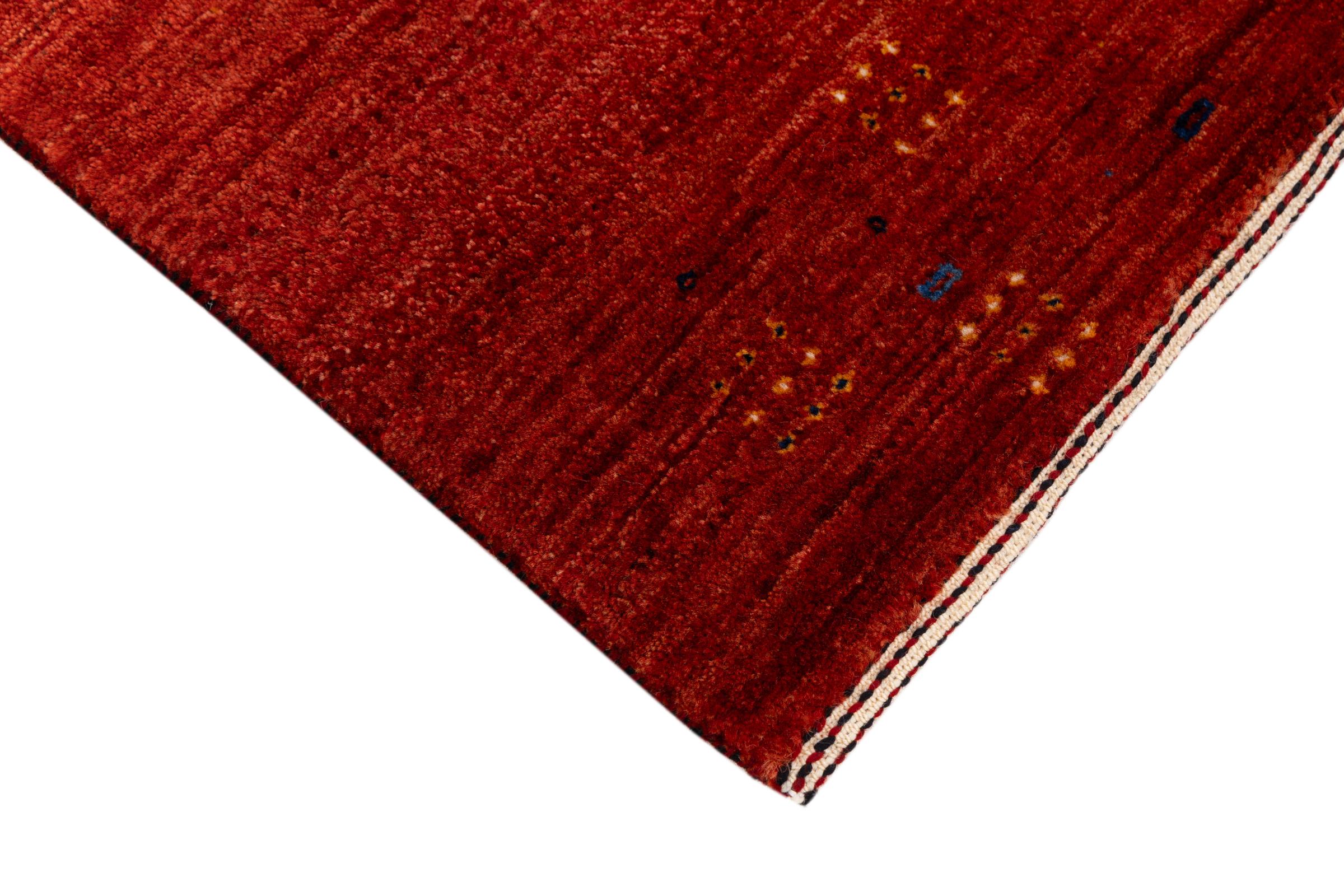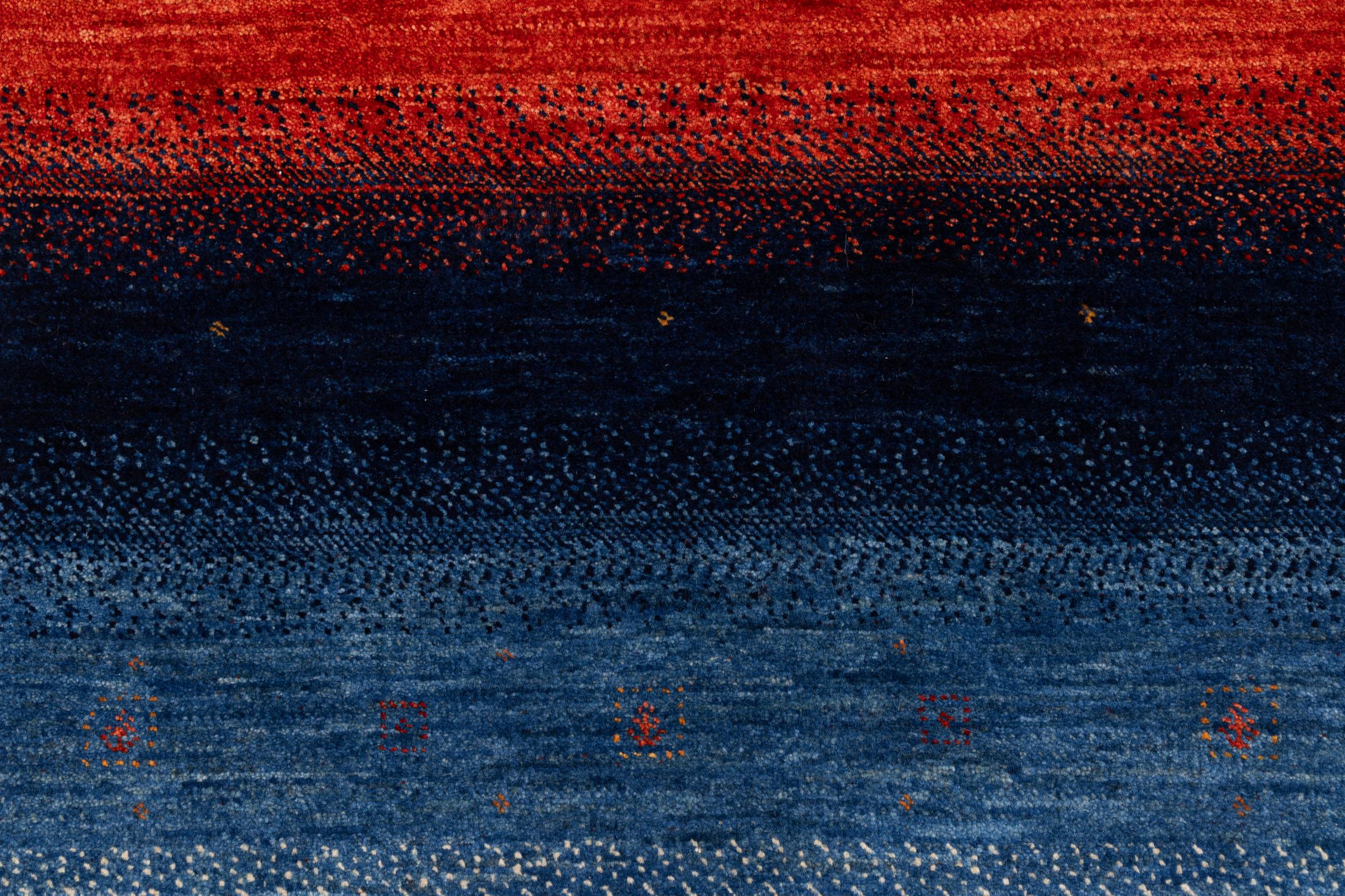 Dette smukke tæppe er en persisk Gabbeh og er en af ​​de højeste kvalitet Gabbeh tæpper. Tæpper er knyttet af nomader eller semi-nomader i Iran ved hjælp af traditionelt håndværk. De enkle motiver og mønstre er for det meste inspireret af nomadernes umiddelbare omgivelser. F.eks. Kan kameler, træer eller buske findes på traditionelle tæpper. Persiske Gabbeh-tæpper er lavet af uld fra lokale fårbesætninger. Ulden er derfor for det meste spundet for hånd. Hver af disse orientalske tæpper udgør en unik karakter af århundreder gammel kultur.