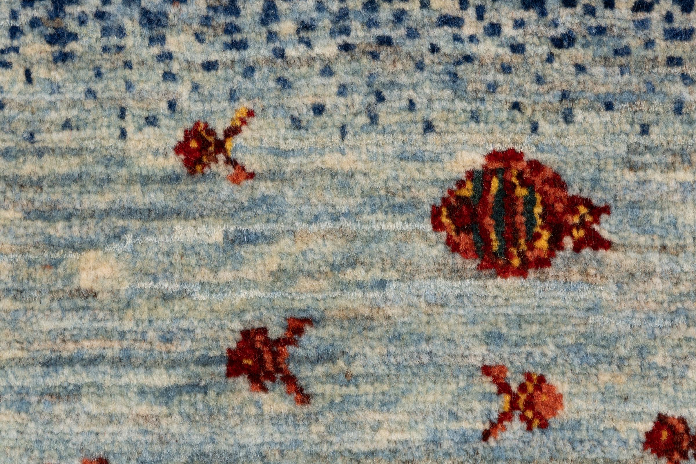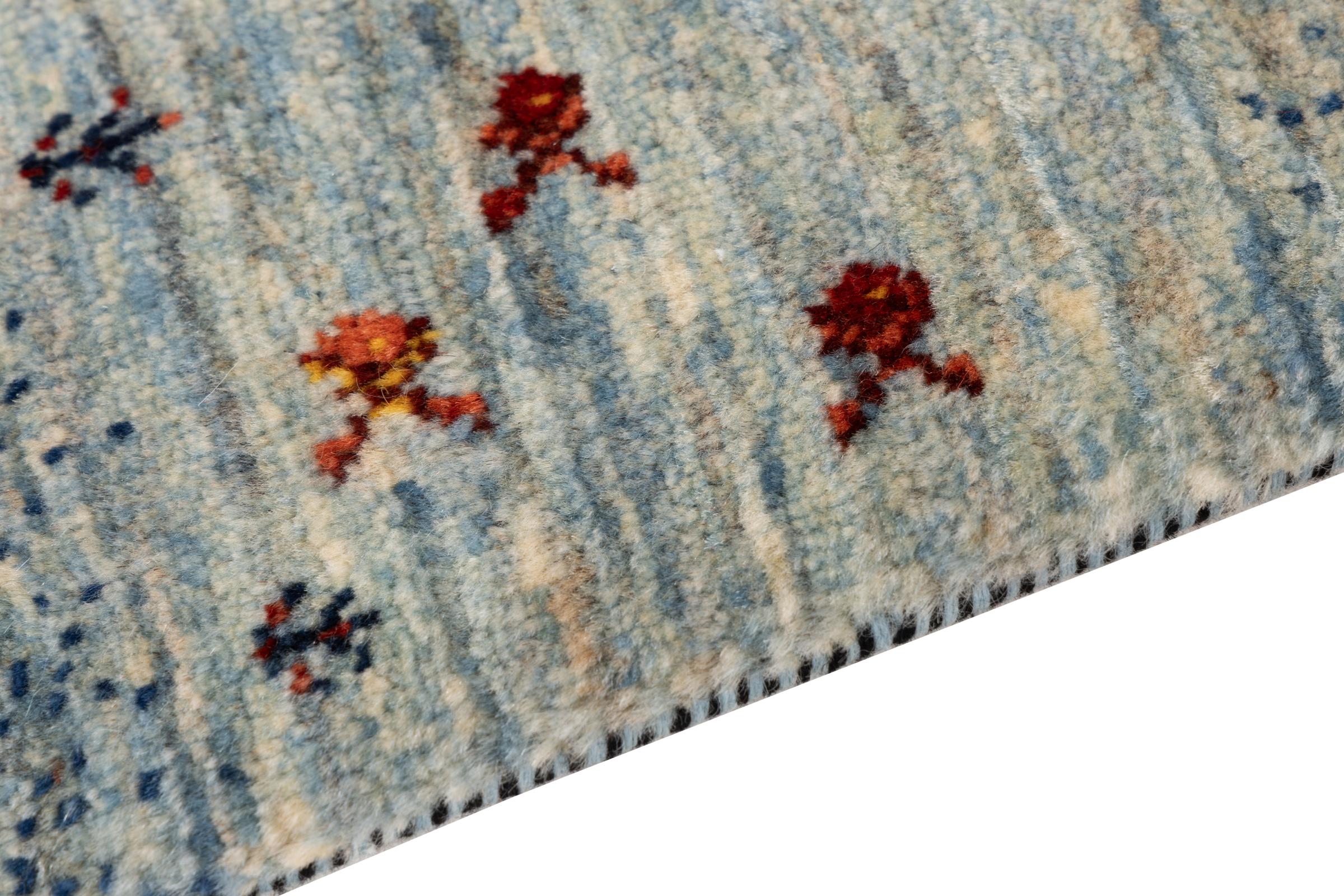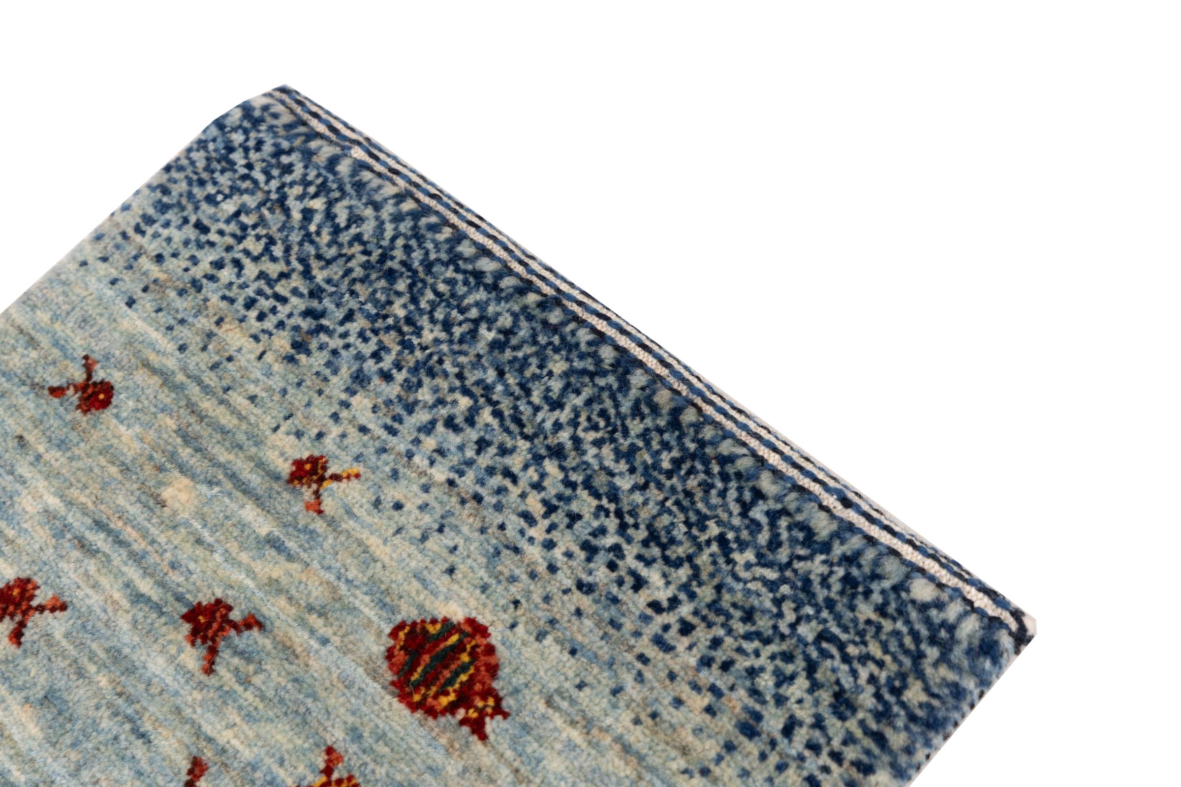 Dette smukke tæppe er en persisk Gabbeh og er en af ​​de højeste kvalitet Gabbeh tæpper. Tæpper er knyttet af nomader eller semi-nomader i Iran ved hjælp af traditionelt håndværk. De enkle motiver og mønstre er for det meste inspireret af nomadernes umiddelbare omgivelser. F.eks. Kan kameler, træer eller buske findes på traditionelle tæpper. Persiske Gabbeh-tæpper er lavet af uld fra lokale fårbesætninger. Ulden er derfor for det meste spundet for hånd. Hver af disse orientalske tæpper udgør en unik karakter af århundreder gammel kultur.