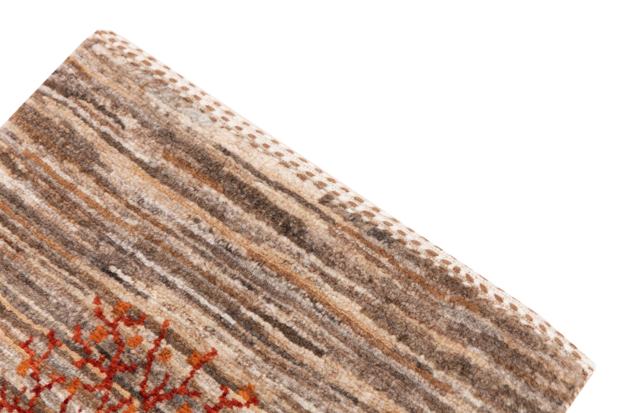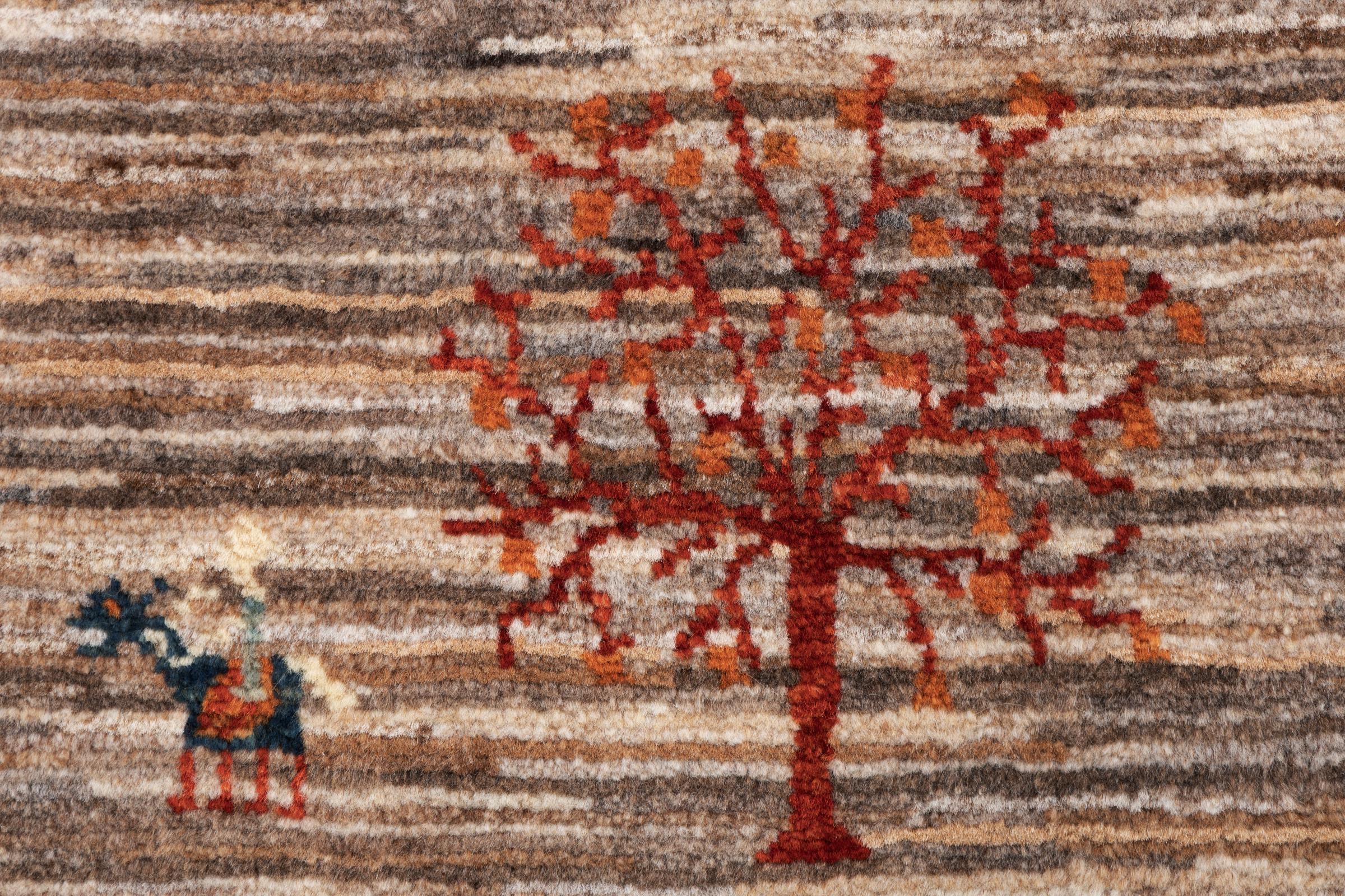 Dette smukke tæppe er en persisk Gabbeh og er en af ​​de højeste kvalitet Gabbeh tæpper. Tæpper er knyttet af nomader eller semi-nomader i Iran ved hjælp af traditionelt håndværk. De enkle motiver og mønstre er for det meste inspireret af nomadernes umiddelbare omgivelser. F.eks. Kan kameler, træer eller buske findes på traditionelle tæpper. Persiske Gabbeh-tæpper er lavet af uld fra lokale fårbesætninger. Ulden er derfor for det meste spundet for hånd. Hver af disse orientalske tæpper udgør en unik karakter af århundreder gammel kultur.