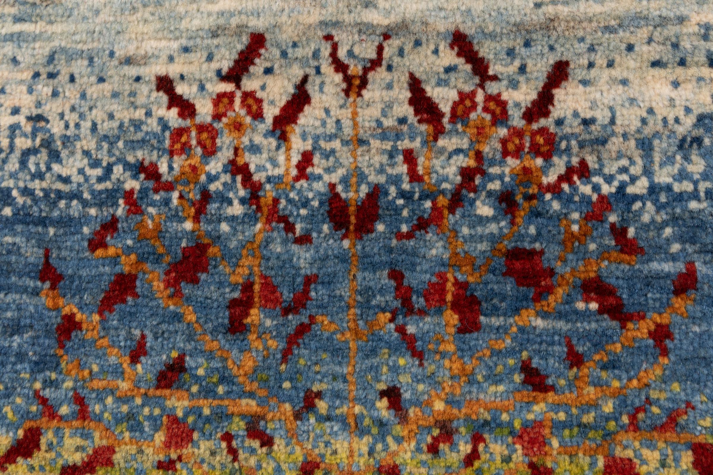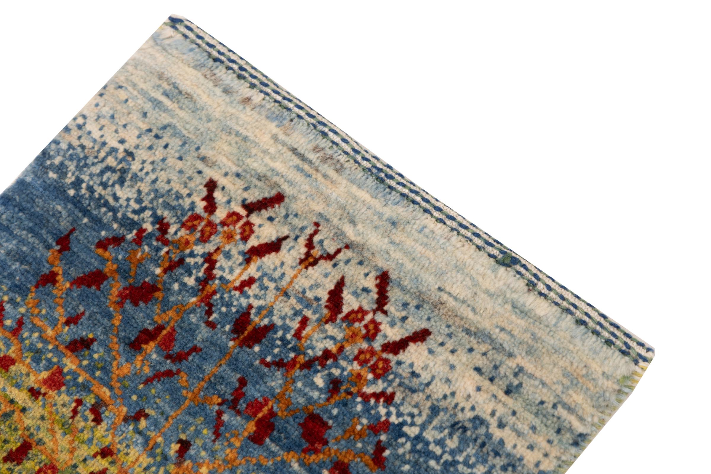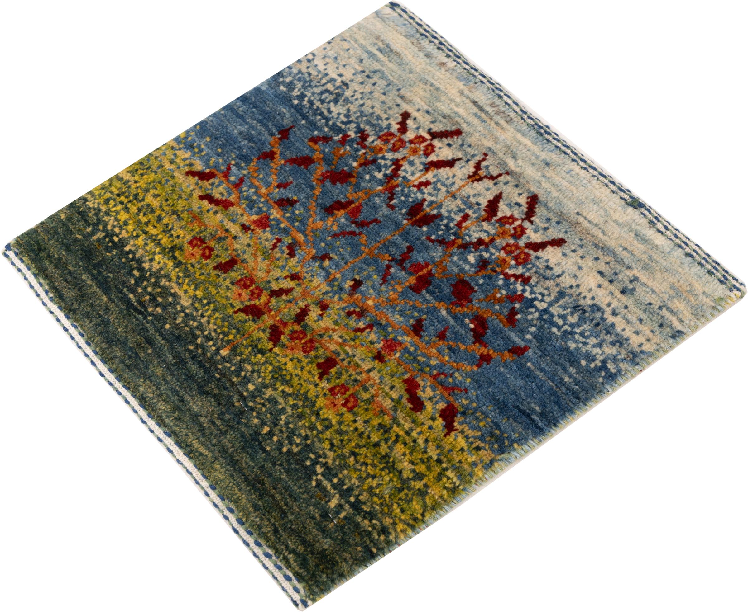 Dette smukke tæppe er en persisk Gabbeh og er en af ​​de højeste kvalitet Gabbeh tæpper. Tæpper er knyttet af nomader eller semi-nomader i Iran ved hjælp af traditionelt håndværk. De enkle motiver og mønstre er for det meste inspireret af nomadernes umiddelbare omgivelser. F.eks. Kan kameler, træer eller buske findes på traditionelle tæpper. Persiske Gabbeh-tæpper er lavet af uld fra lokale fårbesætninger. Ulden er derfor for det meste spundet for hånd. Hver af disse orientalske tæpper udgør en unik karakter af århundreder gammel kultur.