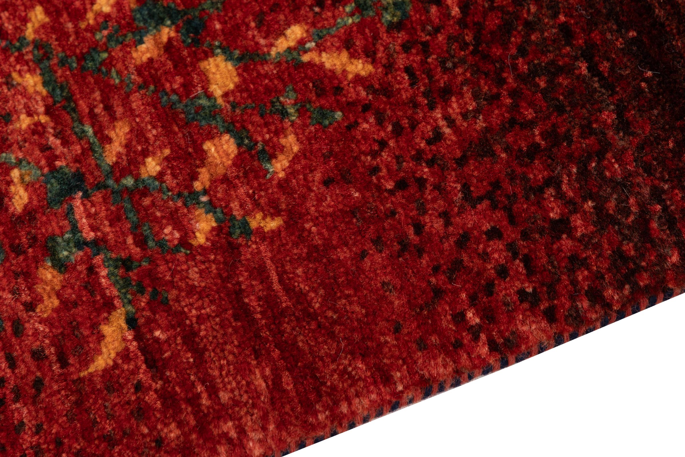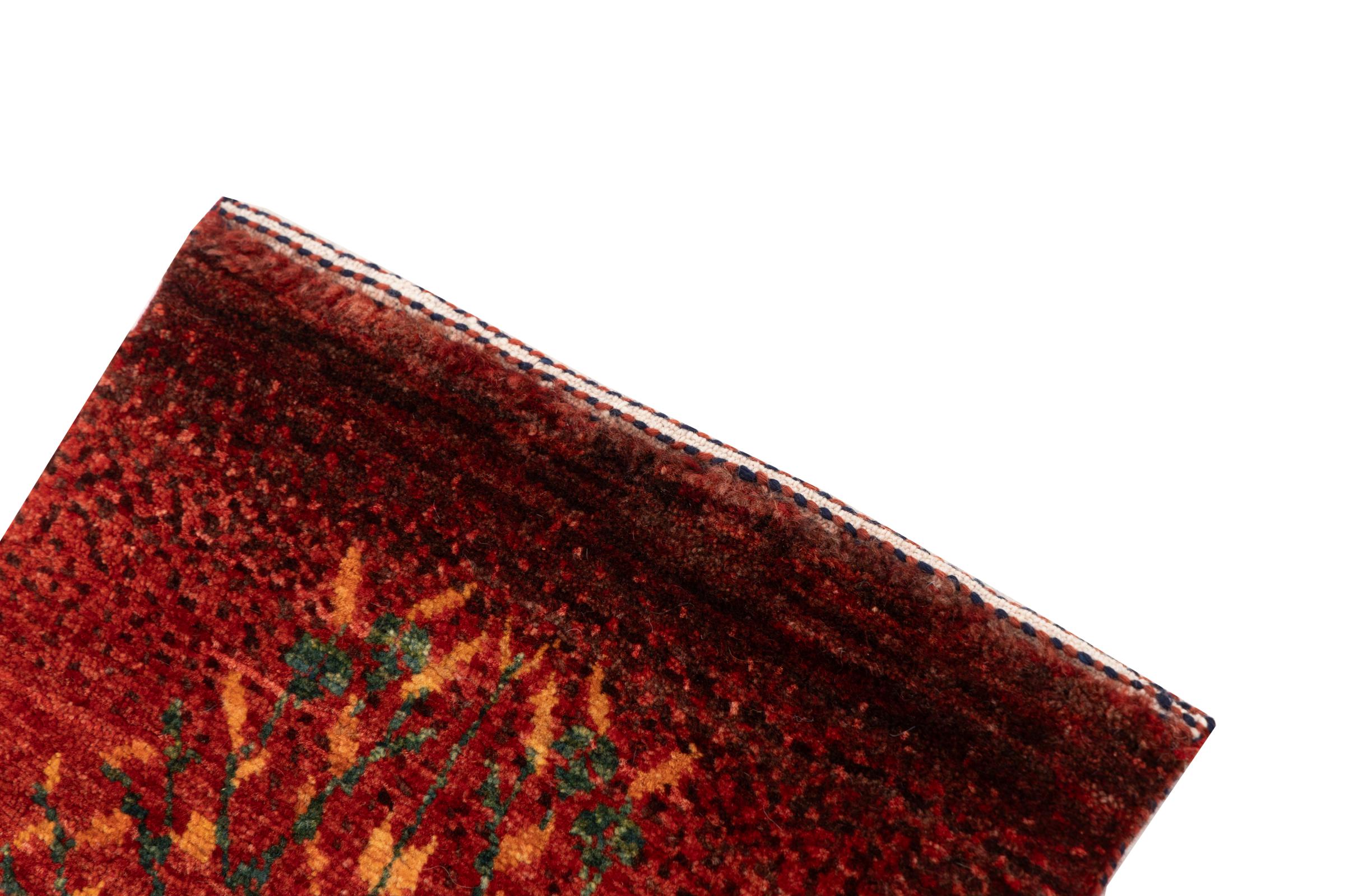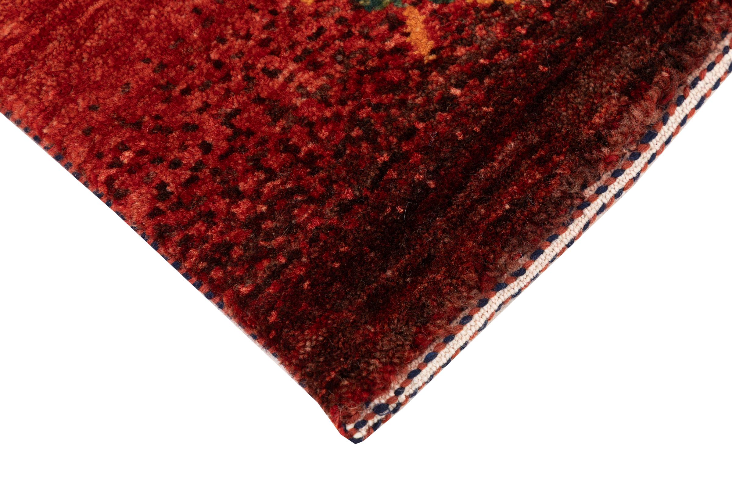 Dette smukke tæppe er en persisk Gabbeh og er en af ​​de højeste kvalitet Gabbeh tæpper. Tæpper er knyttet af nomader eller semi-nomader i Iran ved hjælp af traditionelt håndværk. De enkle motiver og mønstre er for det meste inspireret af nomadernes umiddelbare omgivelser. F.eks. Kan kameler, træer eller buske findes på traditionelle tæpper. Persiske Gabbeh-tæpper er lavet af uld fra lokale fårbesætninger. Ulden er derfor for det meste spundet for hånd. Hver af disse orientalske tæpper udgør en unik karakter af århundreder gammel kultur.