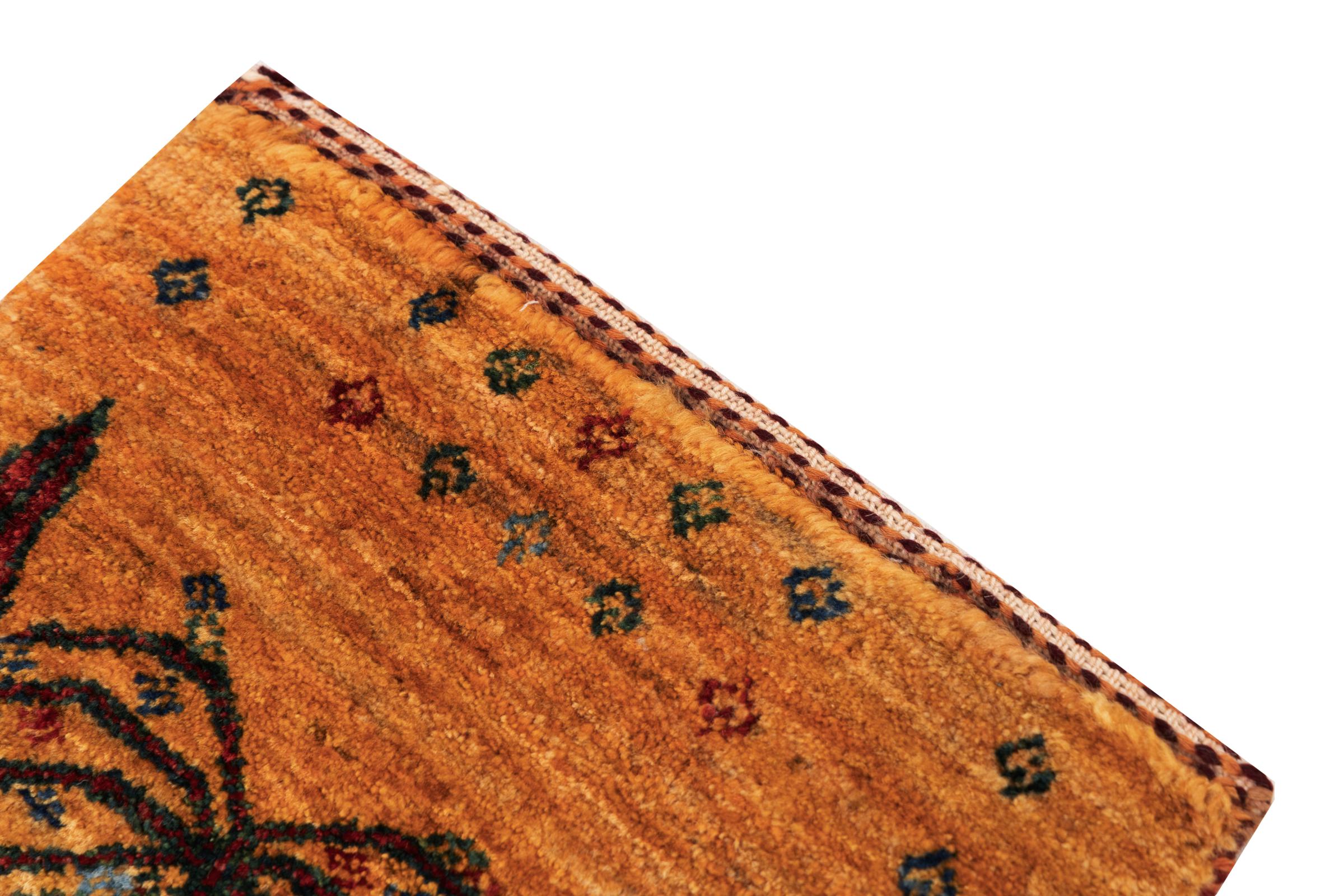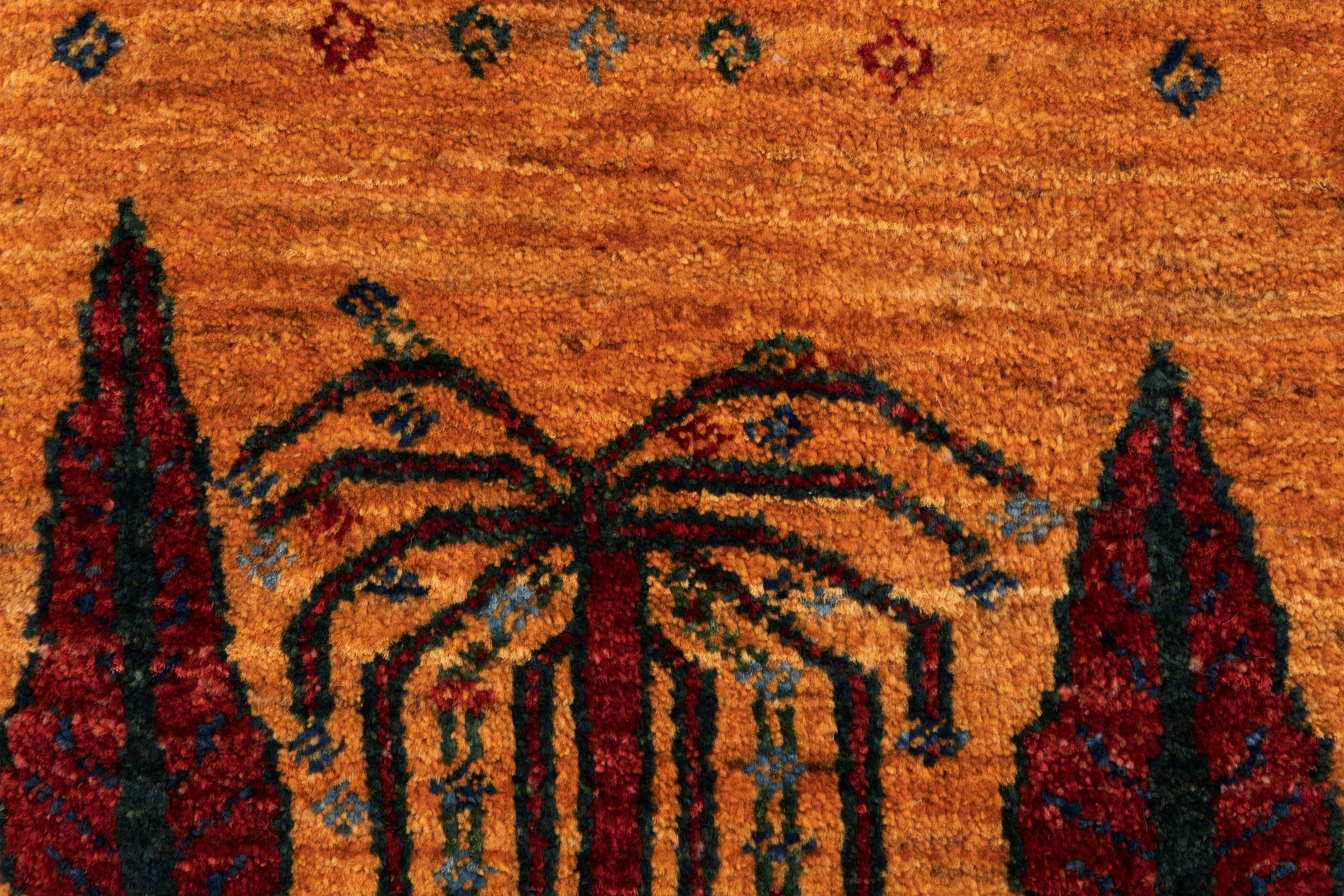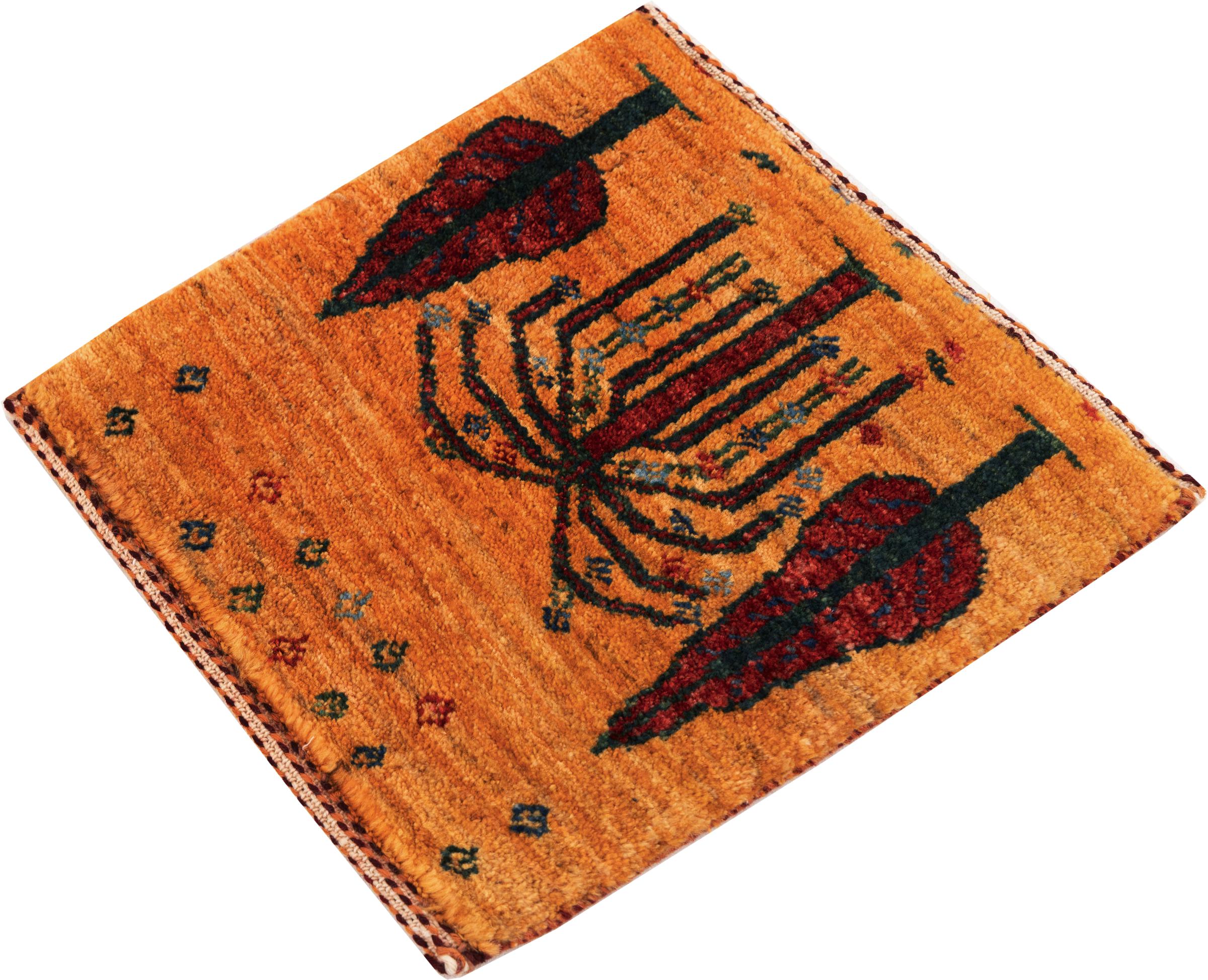 Dette smukke tæppe er en persisk Gabbeh og er en af ​​de højeste kvalitet Gabbeh tæpper. Tæpper er knyttet af nomader eller semi-nomader i Iran ved hjælp af traditionelt håndværk. De enkle motiver og mønstre er for det meste inspireret af nomadernes umiddelbare omgivelser. F.eks. Kan kameler, træer eller buske findes på traditionelle tæpper. Persiske Gabbeh-tæpper er lavet af uld fra lokale fårbesætninger. Ulden er derfor for det meste spundet for hånd. Hver af disse orientalske tæpper udgør en unik karakter af århundreder gammel kultur.