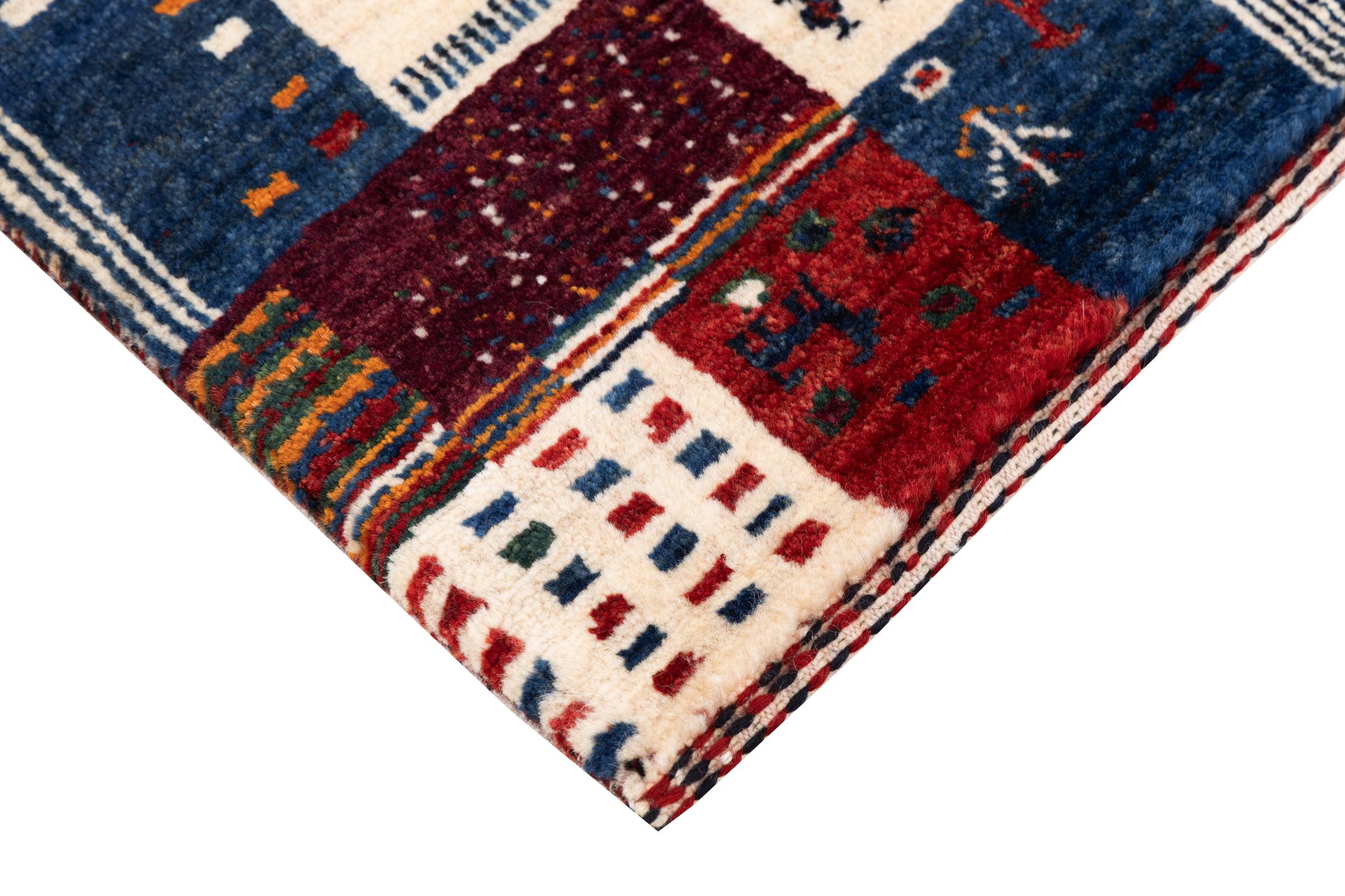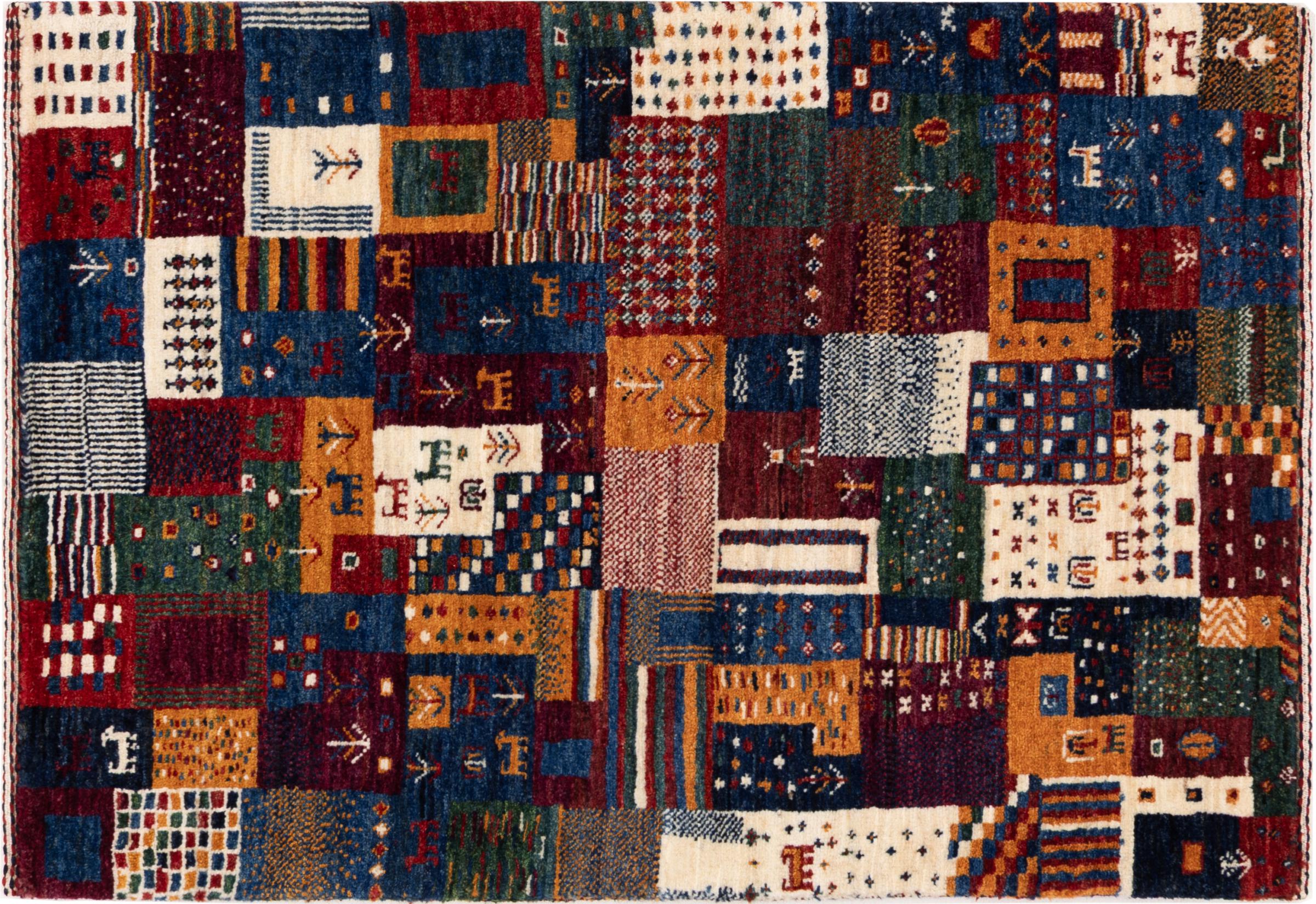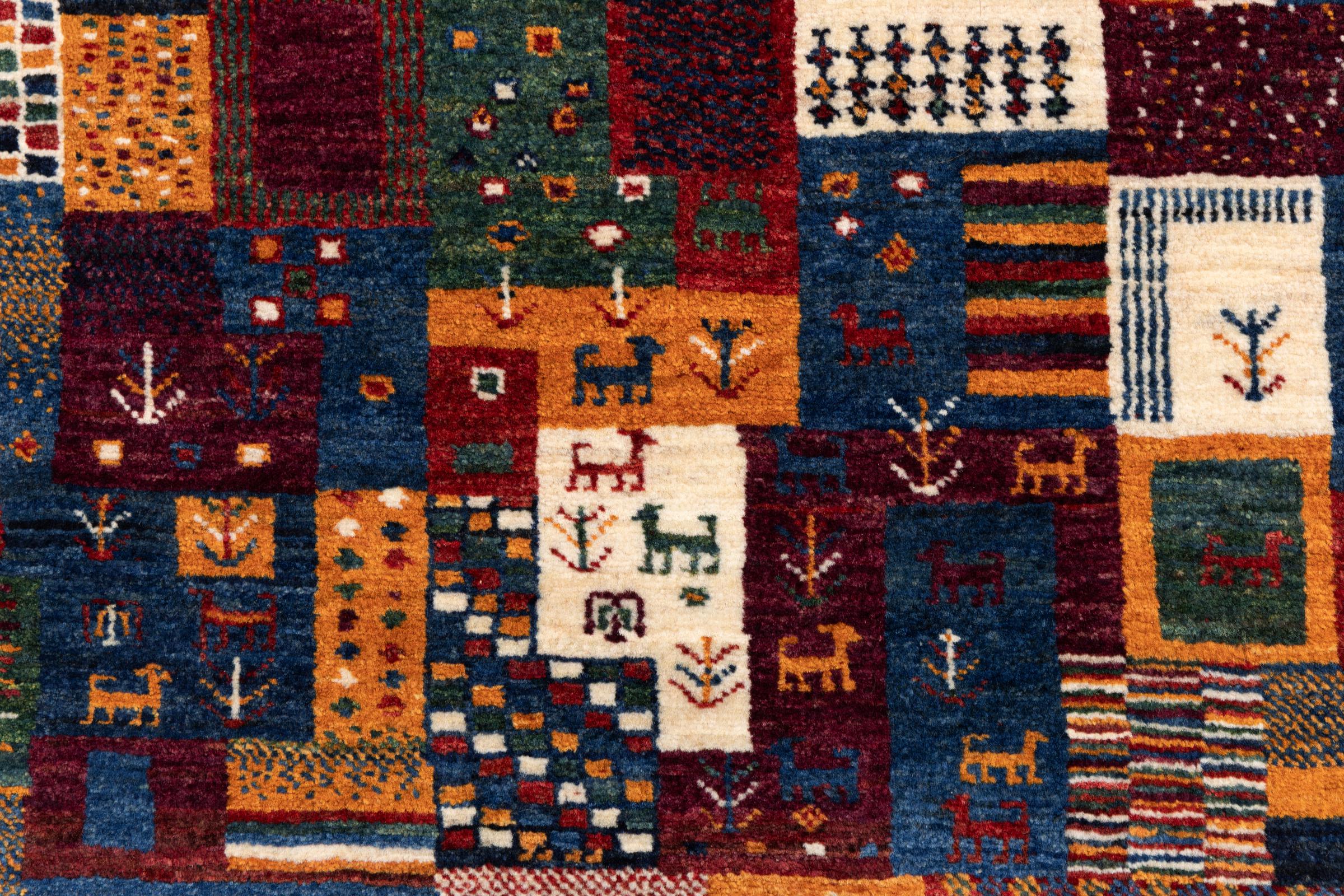 Dette smukke tæppe er en persisk Gabbeh og er en af ​​de højeste kvalitet Gabbeh tæpper. Tæpper er knyttet af nomader eller semi-nomader i Iran ved hjælp af traditionelt håndværk. De enkle motiver og mønstre er for det meste inspireret af nomadernes umiddelbare omgivelser. F.eks. Kan kameler, træer eller buske findes på traditionelle tæpper. Persiske Gabbeh-tæpper er lavet af uld fra lokale fårbesætninger. Ulden er derfor for det meste spundet for hånd. Hver af disse orientalske tæpper udgør en unik karakter af århundreder gammel kultur.