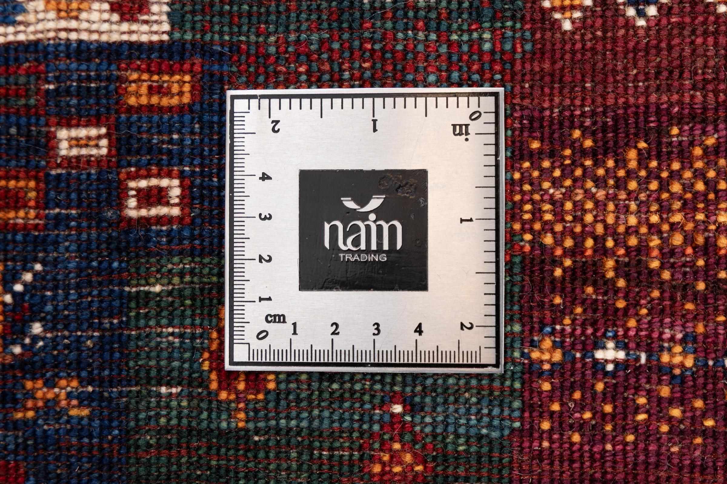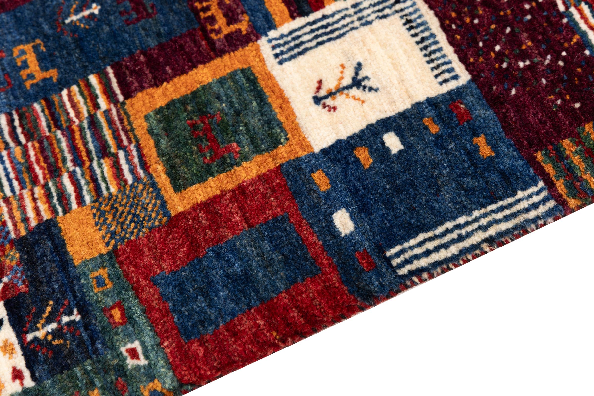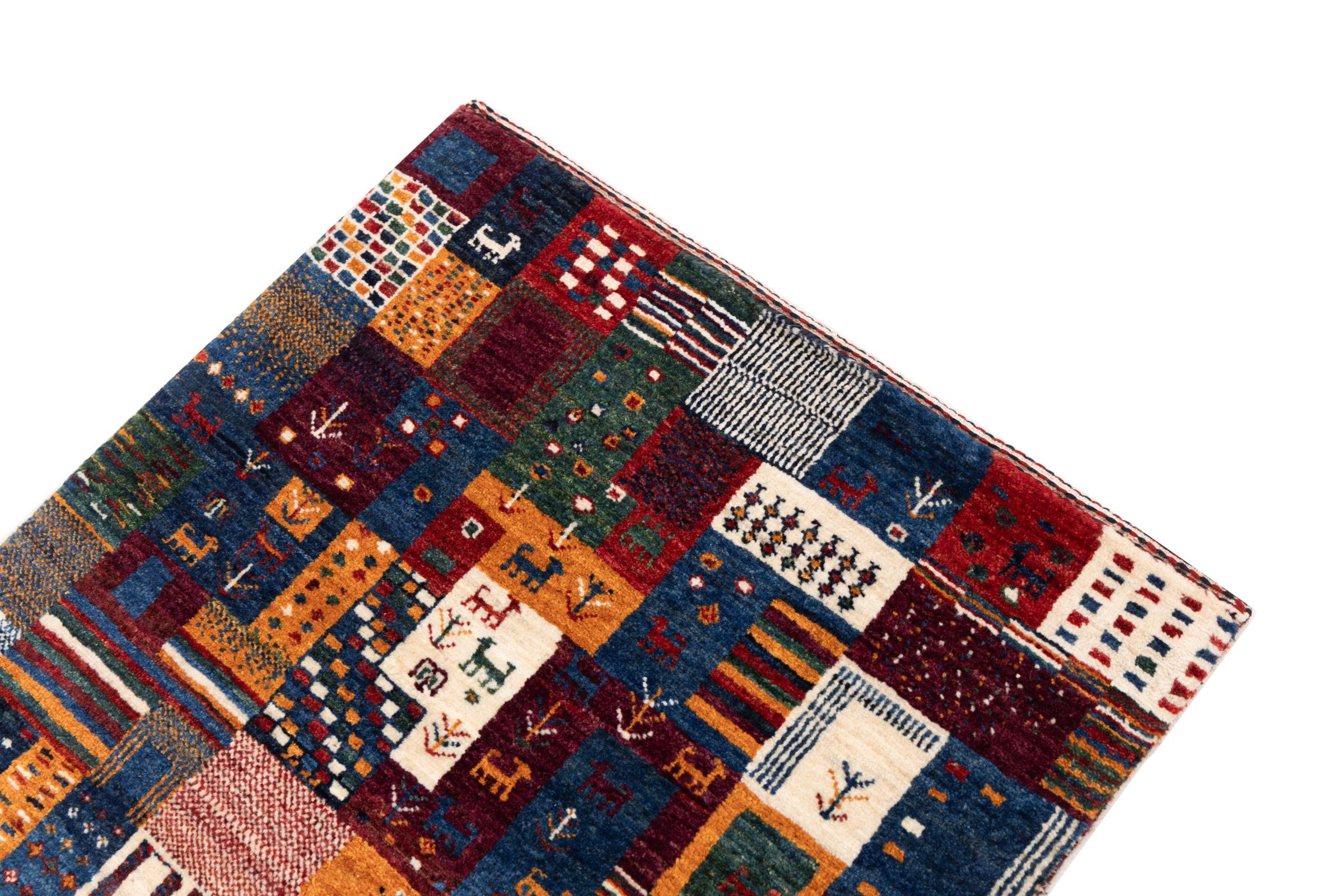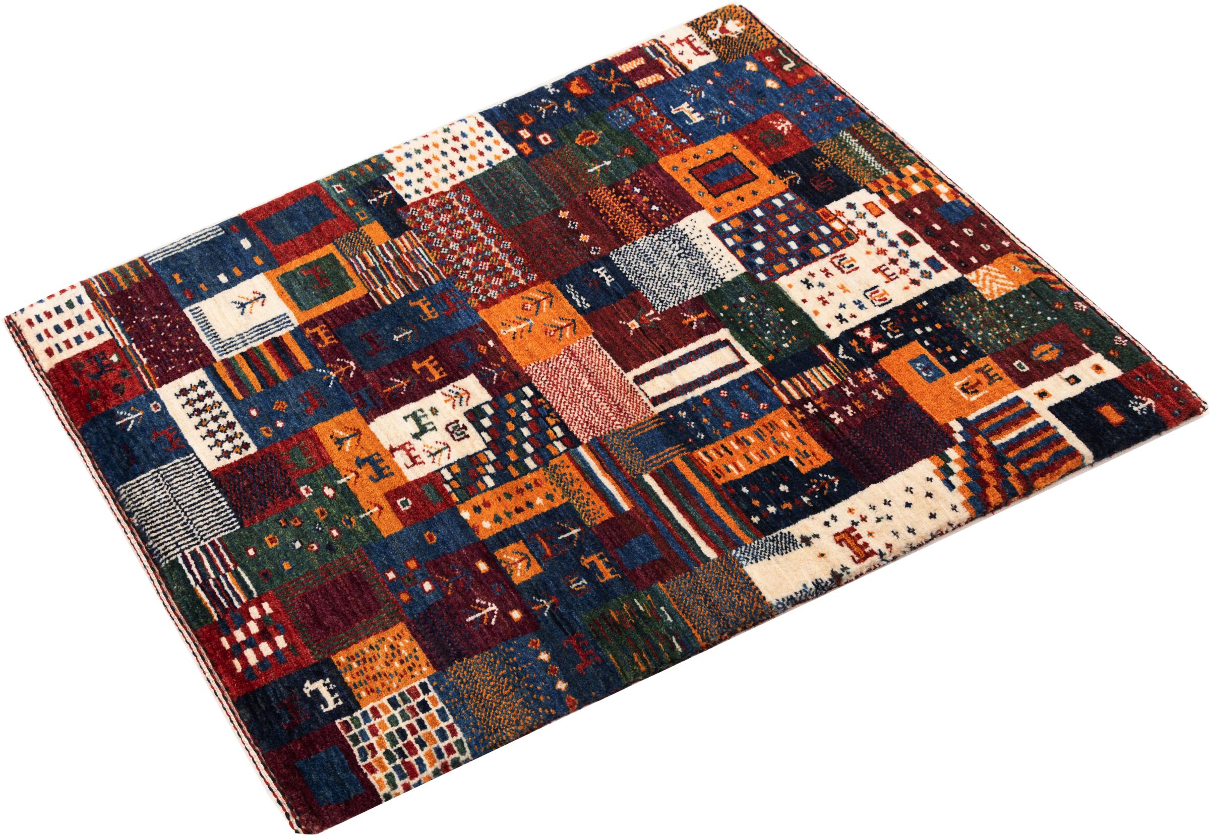Dette smukke tæppe er en persisk Gabbeh og er en af ​​de højeste kvalitet Gabbeh tæpper. Tæpper er knyttet af nomader eller semi-nomader i Iran ved hjælp af traditionelt håndværk. De enkle motiver og mønstre er for det meste inspireret af nomadernes umiddelbare omgivelser. F.eks. Kan kameler, træer eller buske findes på traditionelle tæpper. Persiske Gabbeh-tæpper er lavet af uld fra lokale fårbesætninger. Ulden er derfor for det meste spundet for hånd. Hver af disse orientalske tæpper udgør en unik karakter af århundreder gammel kultur.