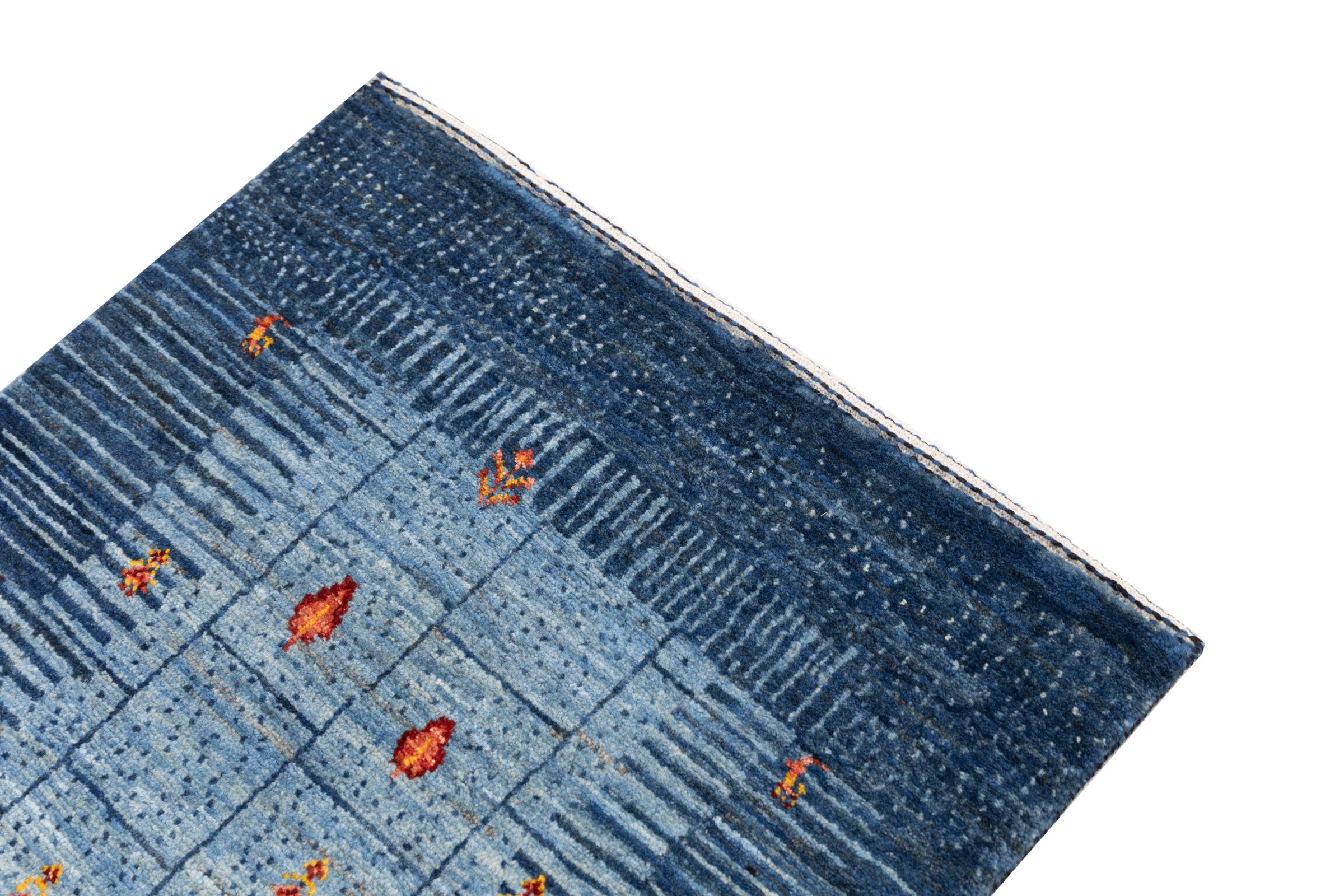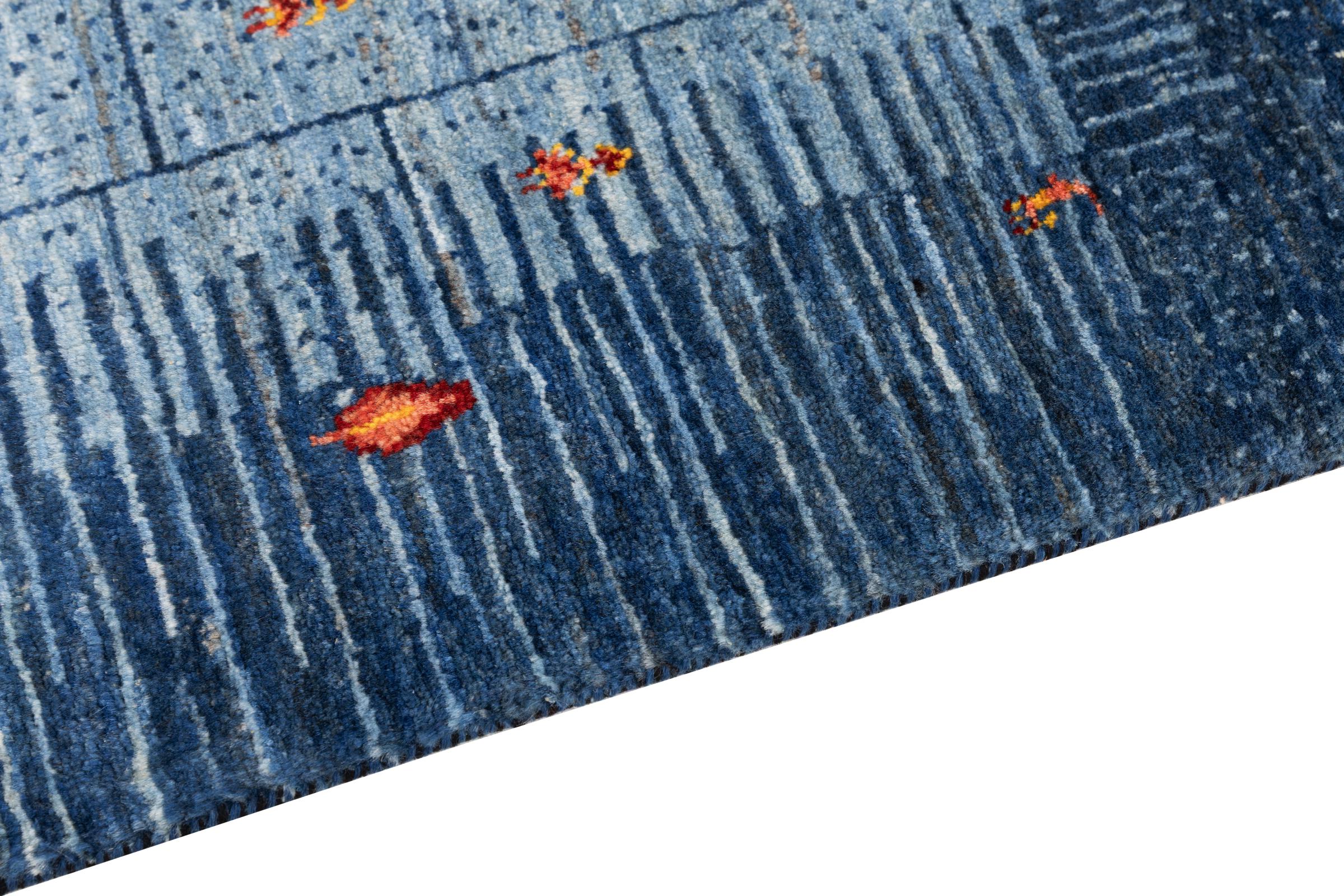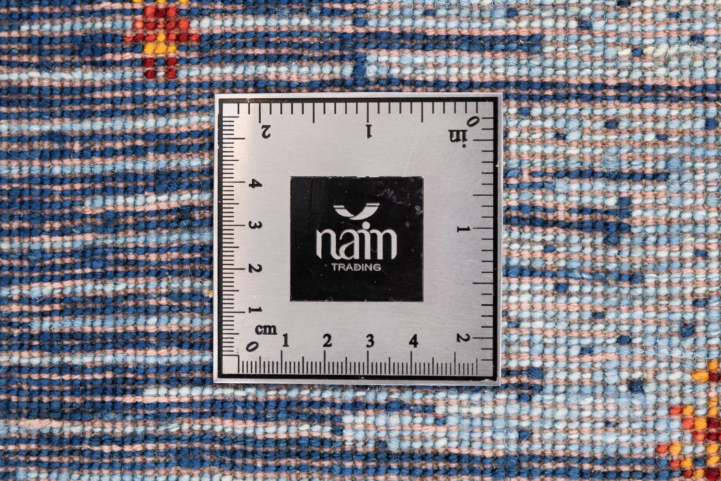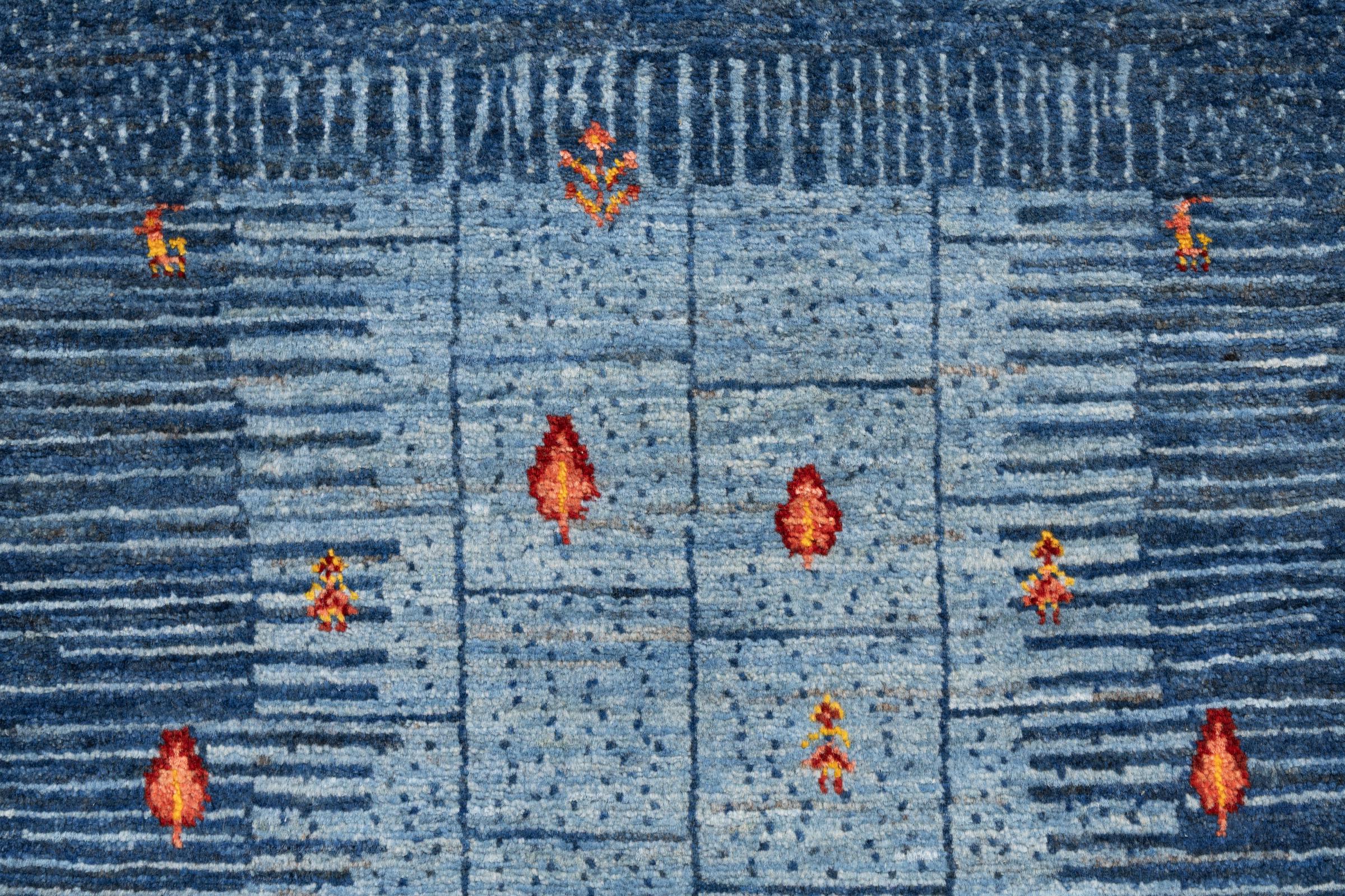 Dette smukke tæppe er en persisk Gabbeh og er en af ​​de højeste kvalitet Gabbeh tæpper. Tæpper er knyttet af nomader eller semi-nomader i Iran ved hjælp af traditionelt håndværk. De enkle motiver og mønstre er for det meste inspireret af nomadernes umiddelbare omgivelser. F.eks. Kan kameler, træer eller buske findes på traditionelle tæpper. Persiske Gabbeh-tæpper er lavet af uld fra lokale fårbesætninger. Ulden er derfor for det meste spundet for hånd. Hver af disse orientalske tæpper udgør en unik karakter af århundreder gammel kultur.