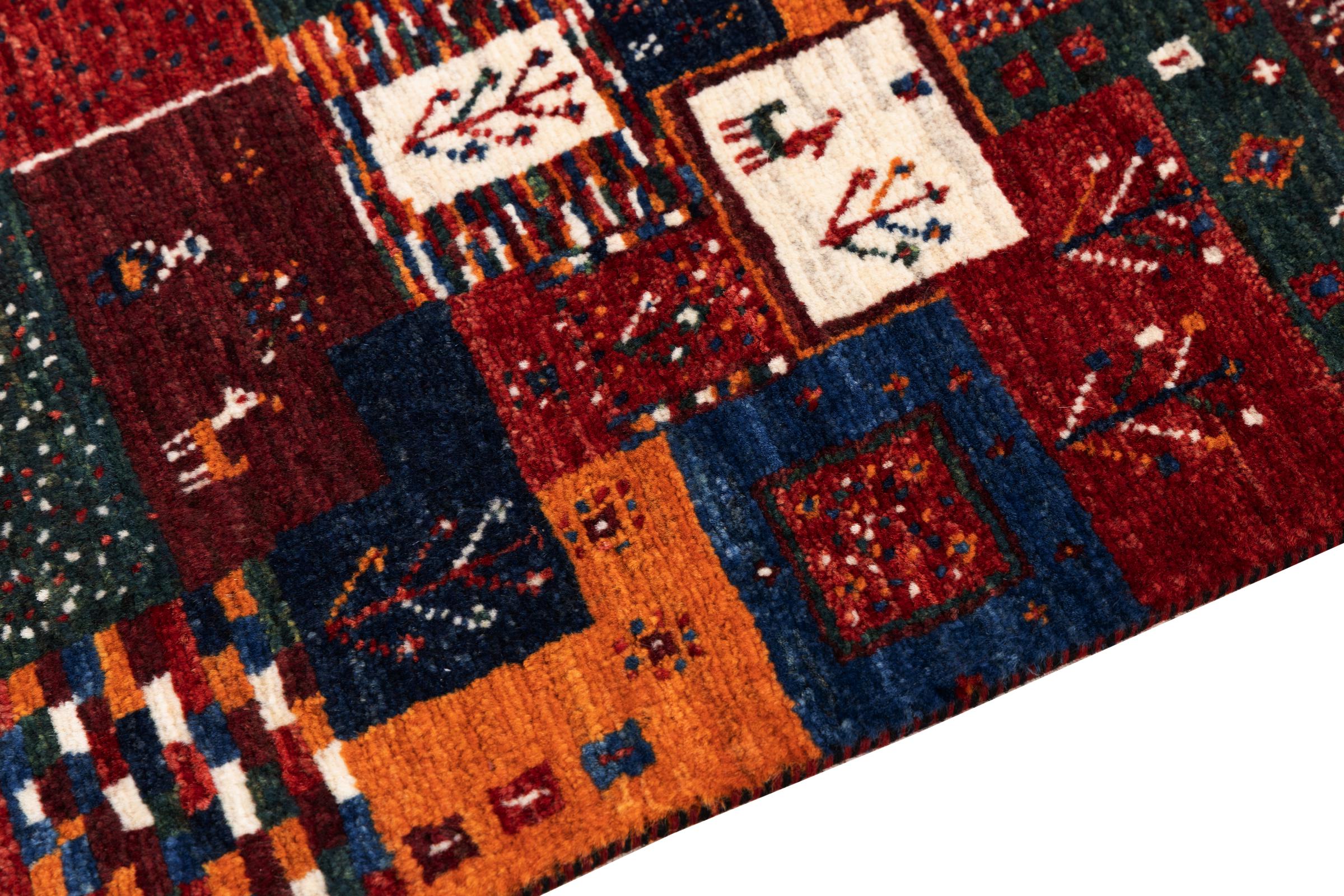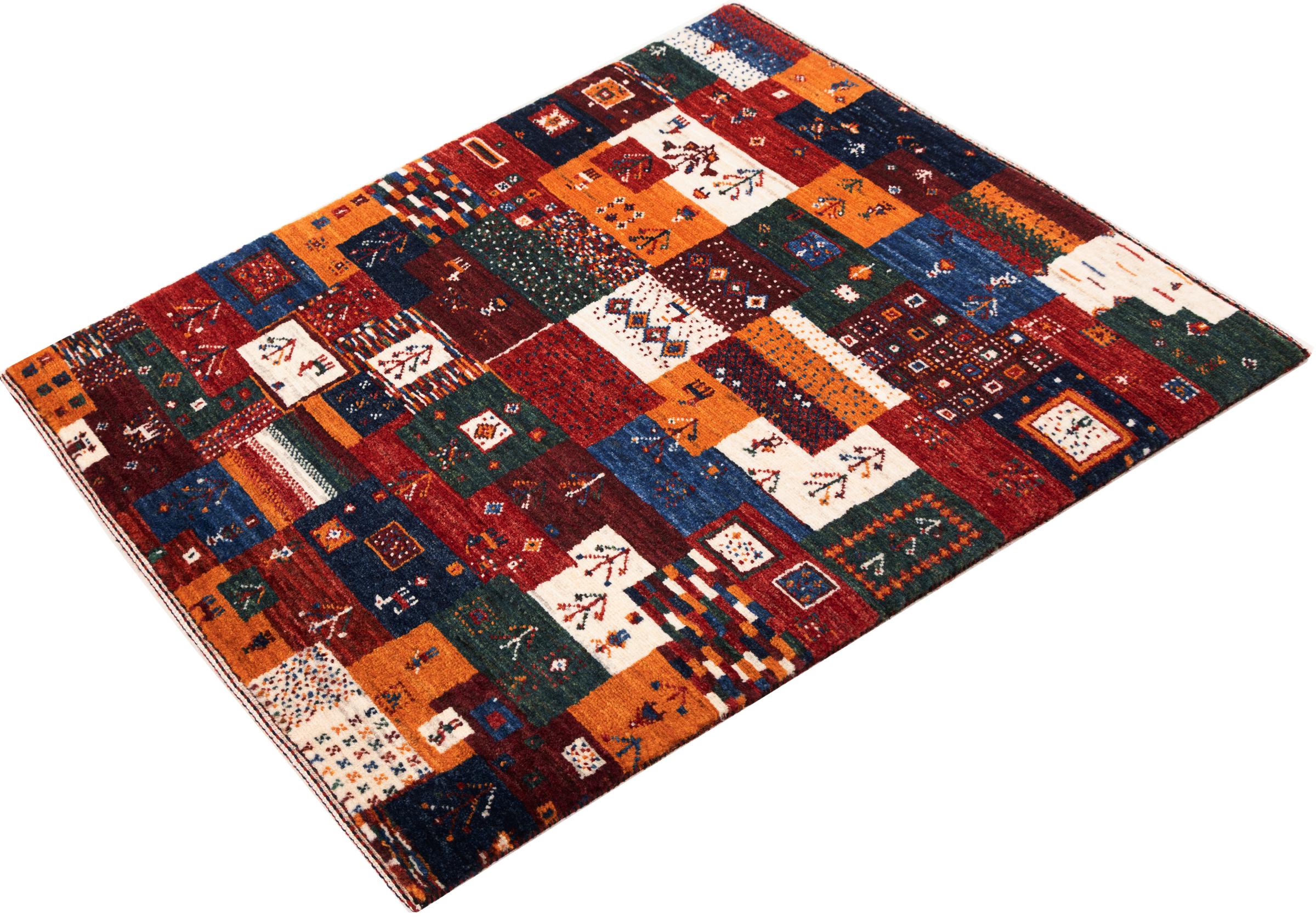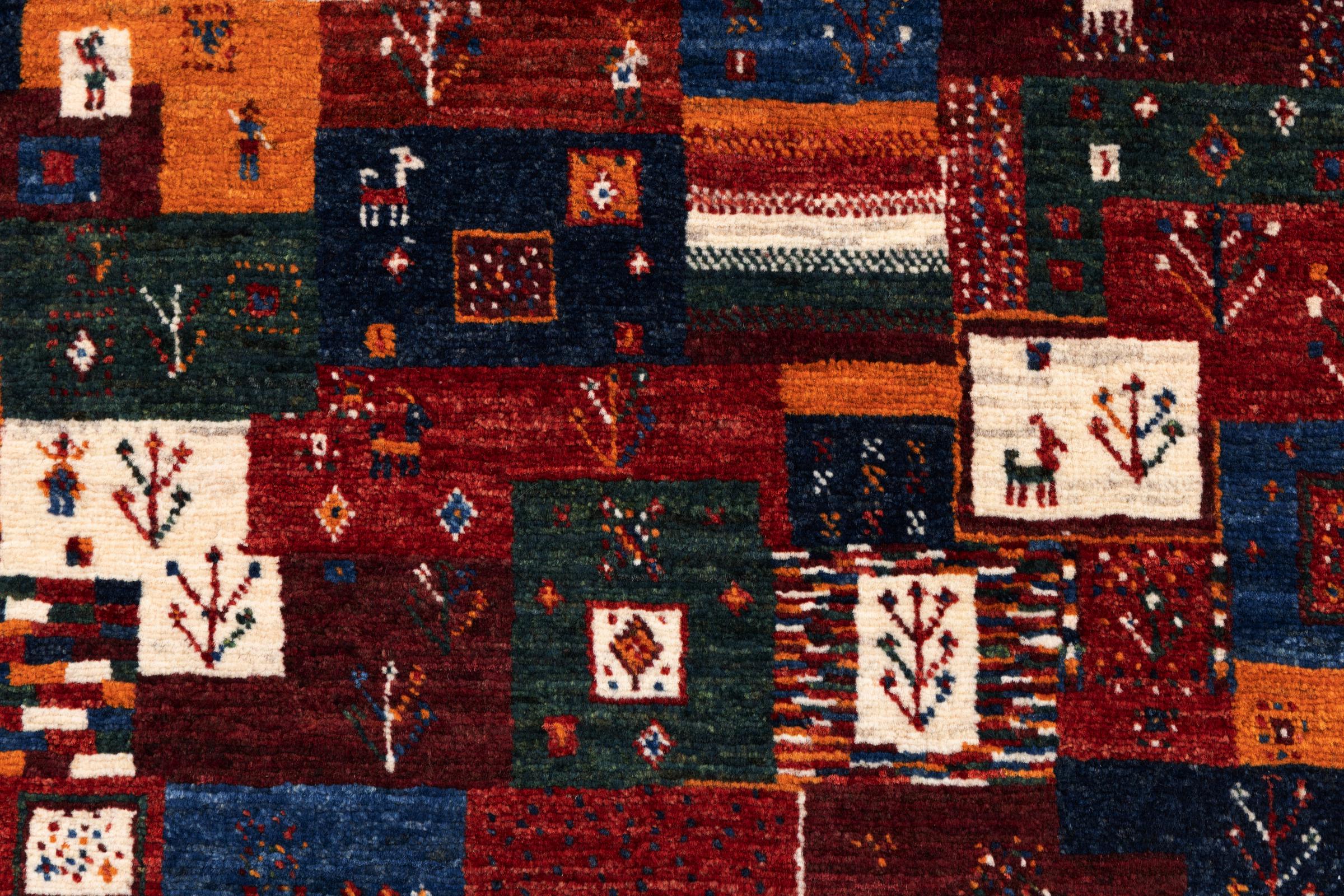 Dette smukke tæppe er en persisk Gabbeh og er en af ​​de højeste kvalitet Gabbeh tæpper. Tæpper er knyttet af nomader eller semi-nomader i Iran ved hjælp af traditionelt håndværk. De enkle motiver og mønstre er for det meste inspireret af nomadernes umiddelbare omgivelser. F.eks. Kan kameler, træer eller buske findes på traditionelle tæpper. Persiske Gabbeh-tæpper er lavet af uld fra lokale fårbesætninger. Ulden er derfor for det meste spundet for hånd. Hver af disse orientalske tæpper udgør en unik karakter af århundreder gammel kultur.