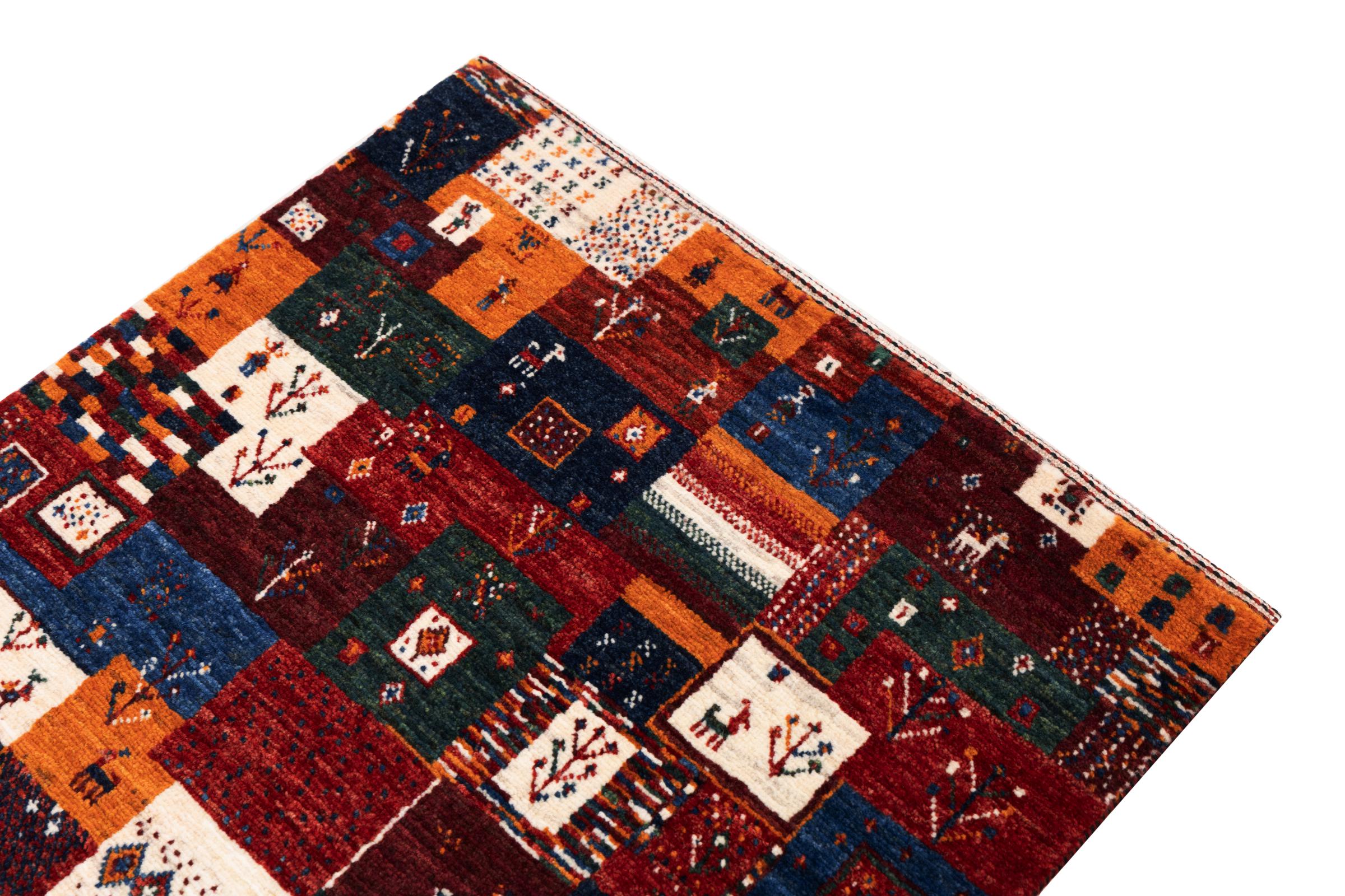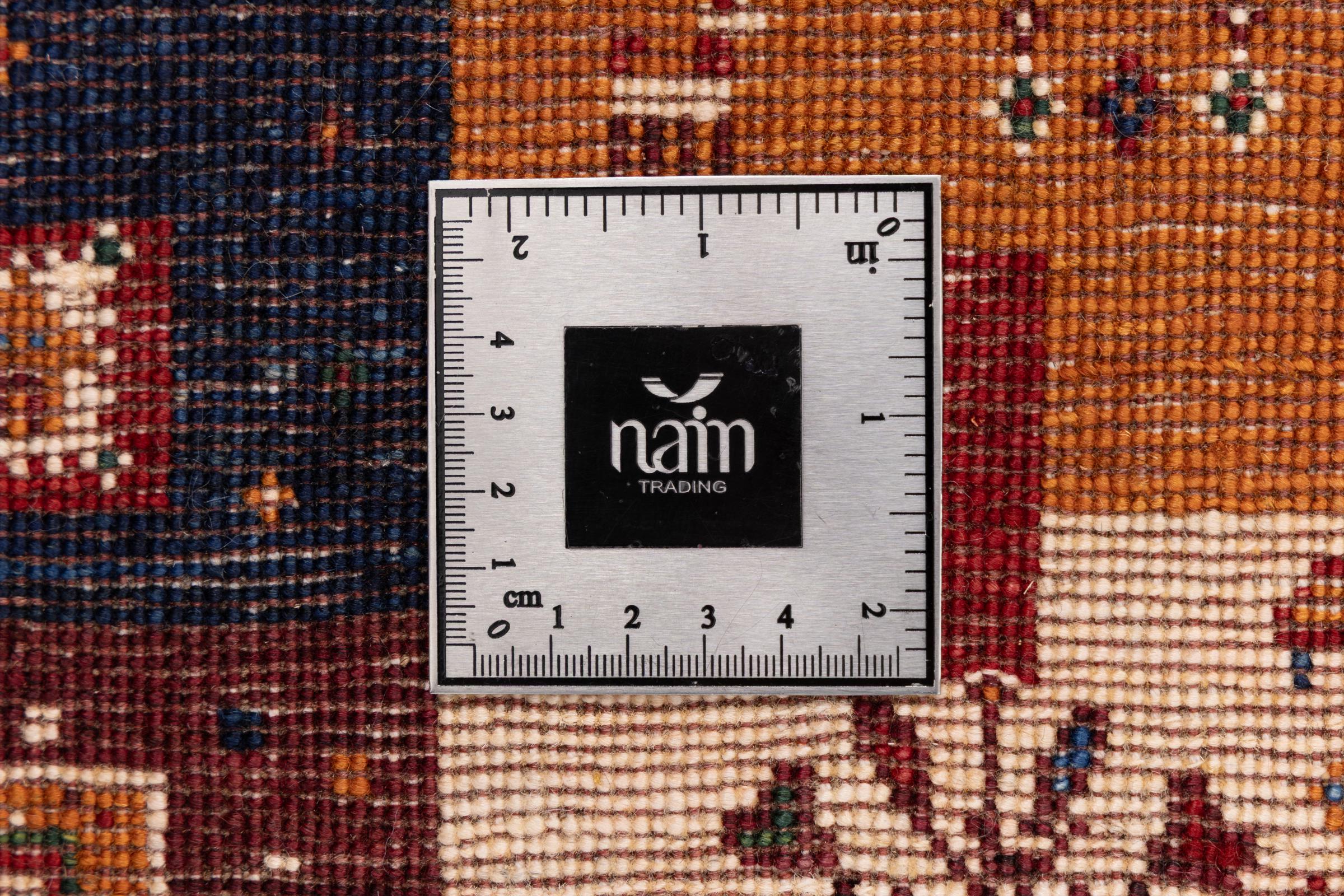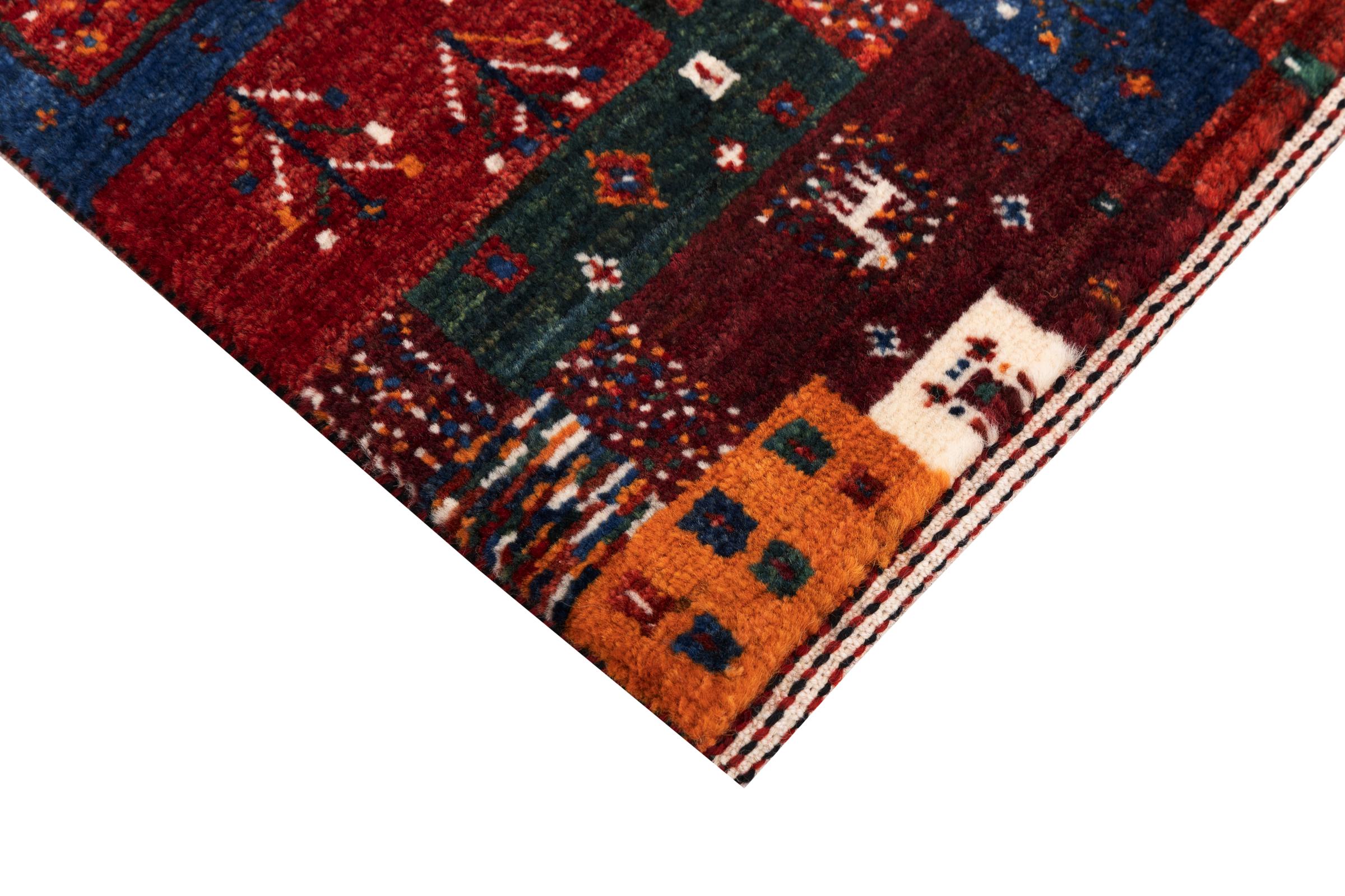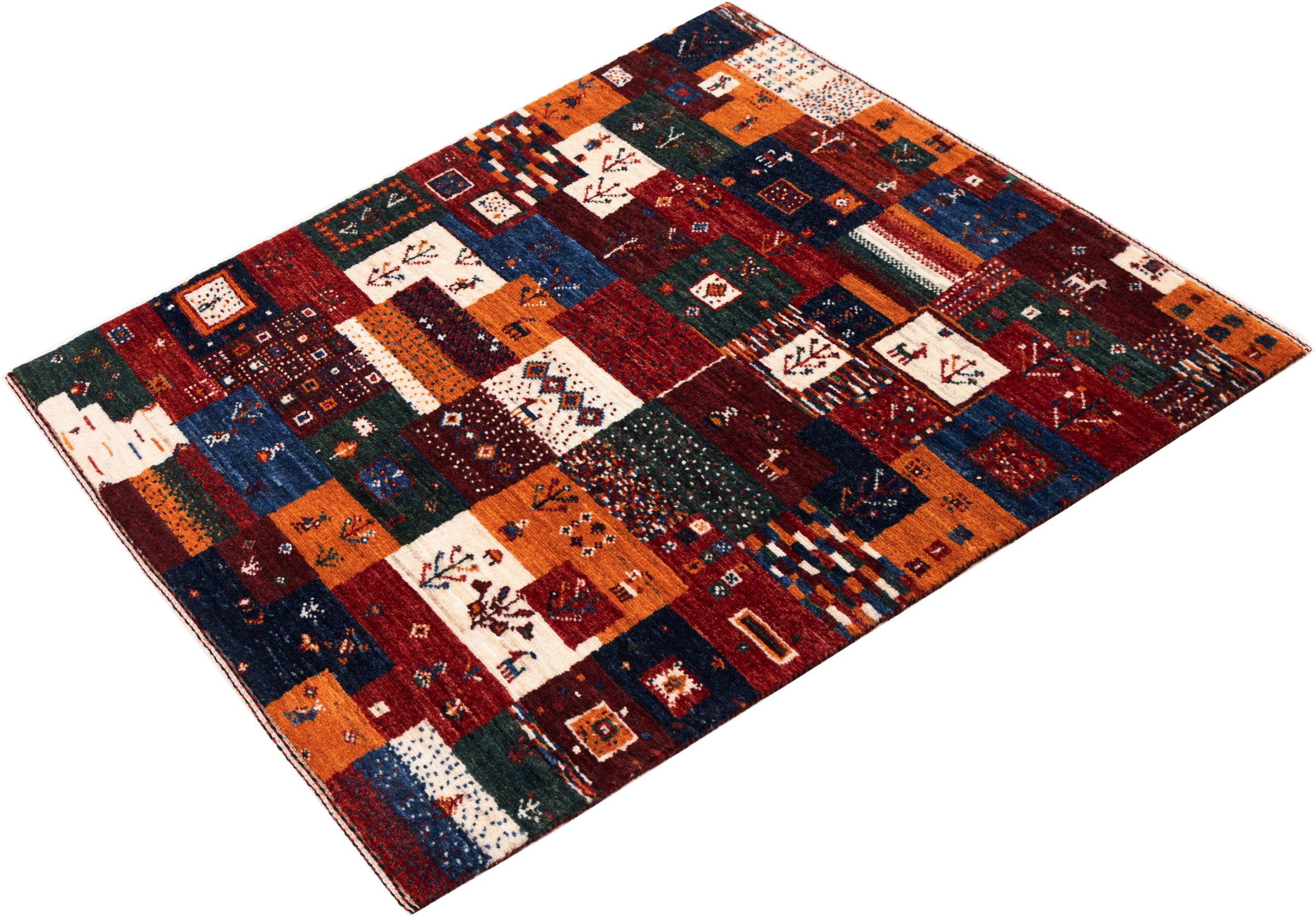 Dette smukke tæppe er en persisk Gabbeh og er en af ​​de højeste kvalitet Gabbeh tæpper. Tæpper er knyttet af nomader eller semi-nomader i Iran ved hjælp af traditionelt håndværk. De enkle motiver og mønstre er for det meste inspireret af nomadernes umiddelbare omgivelser. F.eks. Kan kameler, træer eller buske findes på traditionelle tæpper. Persiske Gabbeh-tæpper er lavet af uld fra lokale fårbesætninger. Ulden er derfor for det meste spundet for hånd. Hver af disse orientalske tæpper udgør en unik karakter af århundreder gammel kultur.