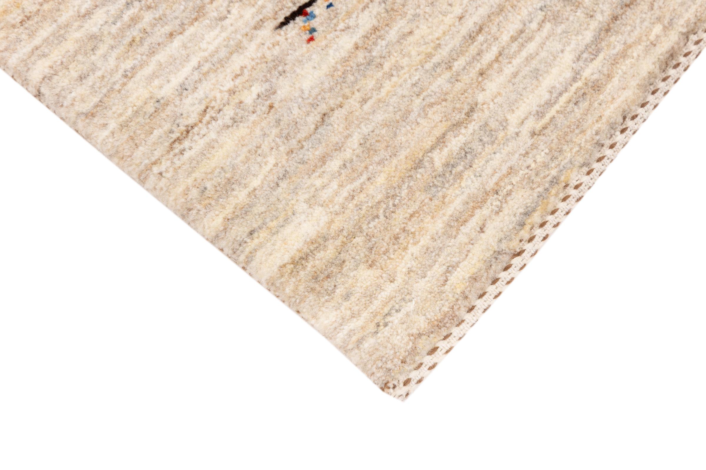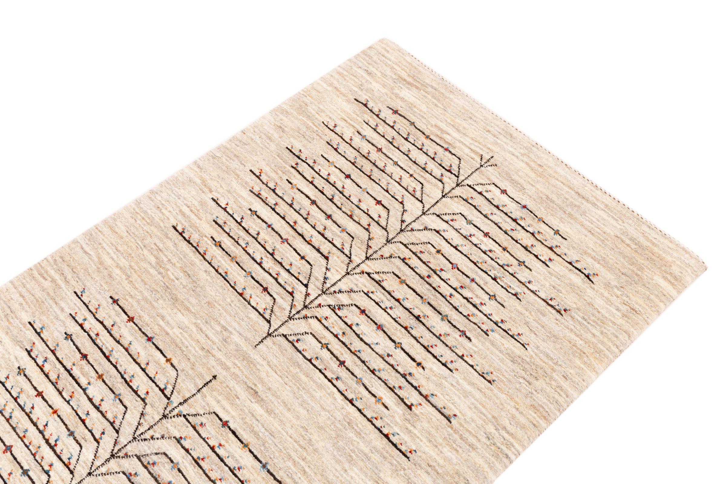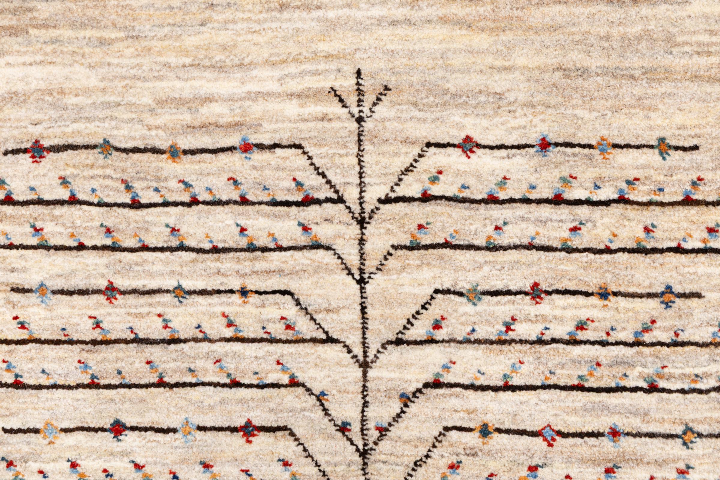 Dette smukke tæppe er en persisk Gabbeh og er en af ​​de højeste kvalitet Gabbeh tæpper. Tæpper er knyttet af nomader eller semi-nomader i Iran ved hjælp af traditionelt håndværk. De enkle motiver og mønstre er for det meste inspireret af nomadernes umiddelbare omgivelser. F.eks. Kan kameler, træer eller buske findes på traditionelle tæpper. Persiske Gabbeh-tæpper er lavet af uld fra lokale fårbesætninger. Ulden er derfor for det meste spundet for hånd. Hver af disse orientalske tæpper udgør en unik karakter af århundreder gammel kultur.