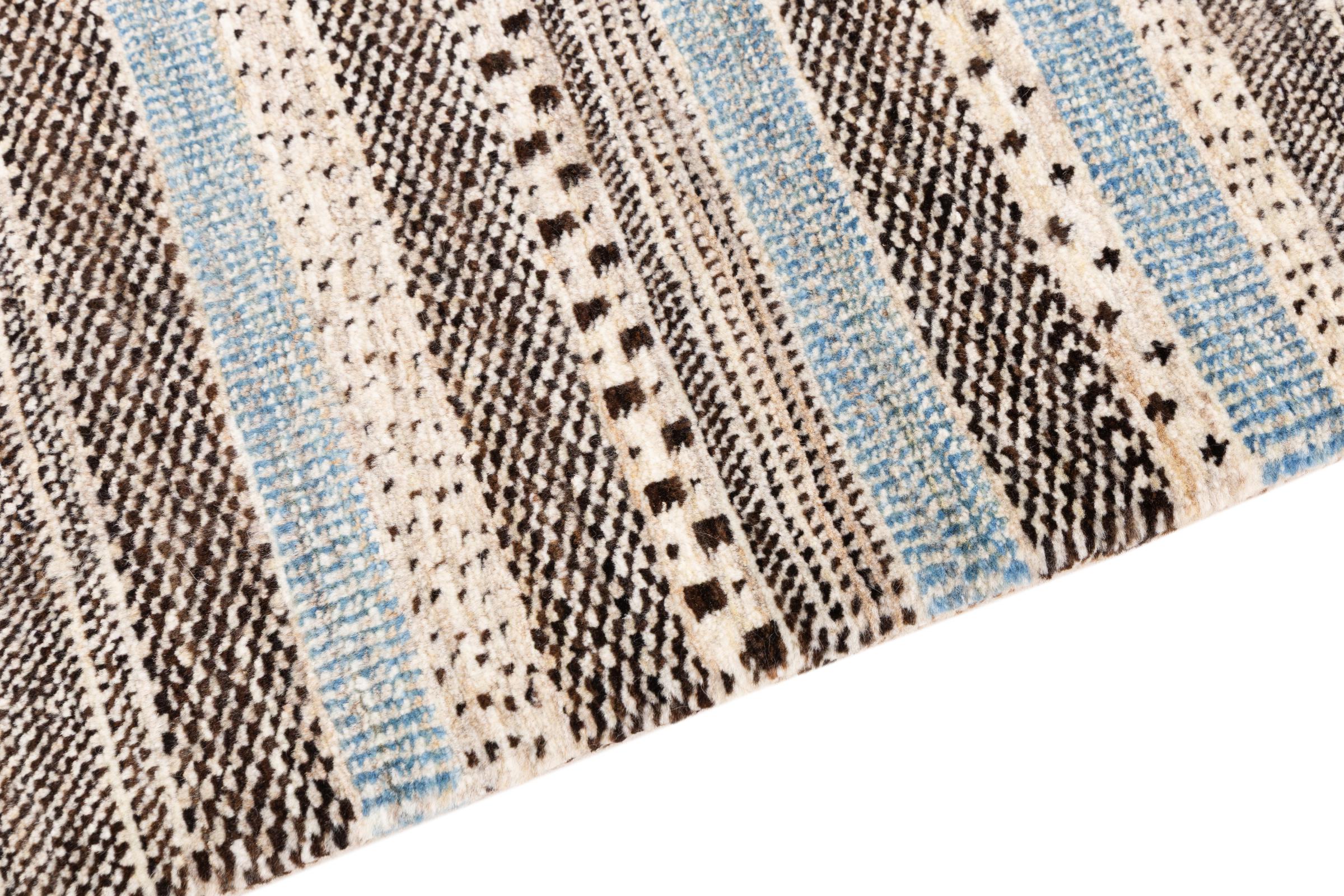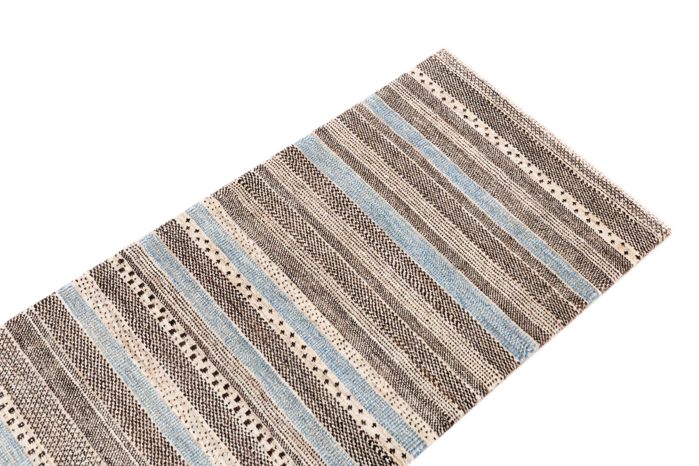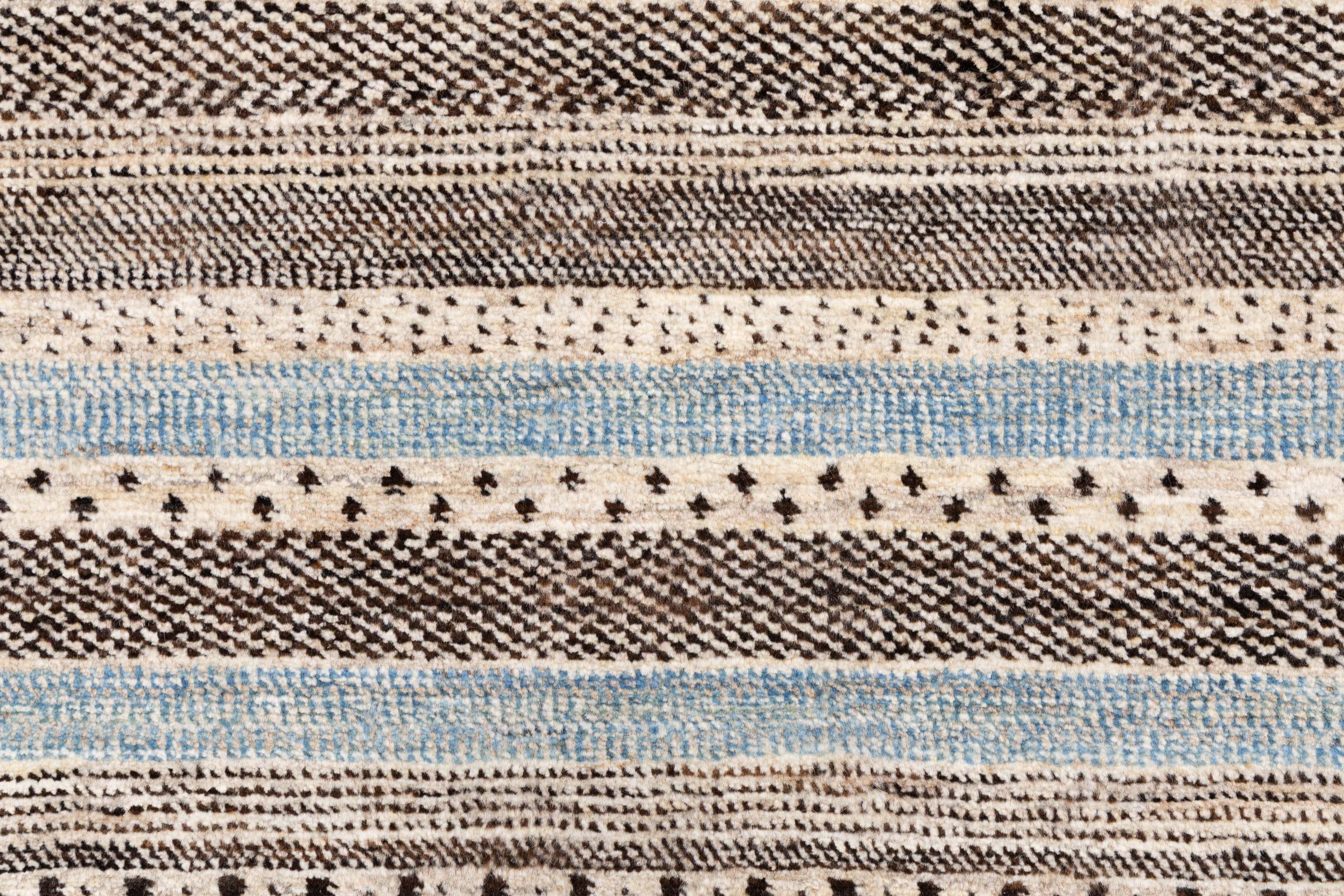 Dette smukke tæppe er en persisk Gabbeh og er en af ​​de højeste kvalitet Gabbeh tæpper. Tæpper er knyttet af nomader eller semi-nomader i Iran ved hjælp af traditionelt håndværk. De enkle motiver og mønstre er for det meste inspireret af nomadernes umiddelbare omgivelser. F.eks. Kan kameler, træer eller buske findes på traditionelle tæpper. Persiske Gabbeh-tæpper er lavet af uld fra lokale fårbesætninger. Ulden er derfor for det meste spundet for hånd. Hver af disse orientalske tæpper udgør en unik karakter af århundreder gammel kultur.