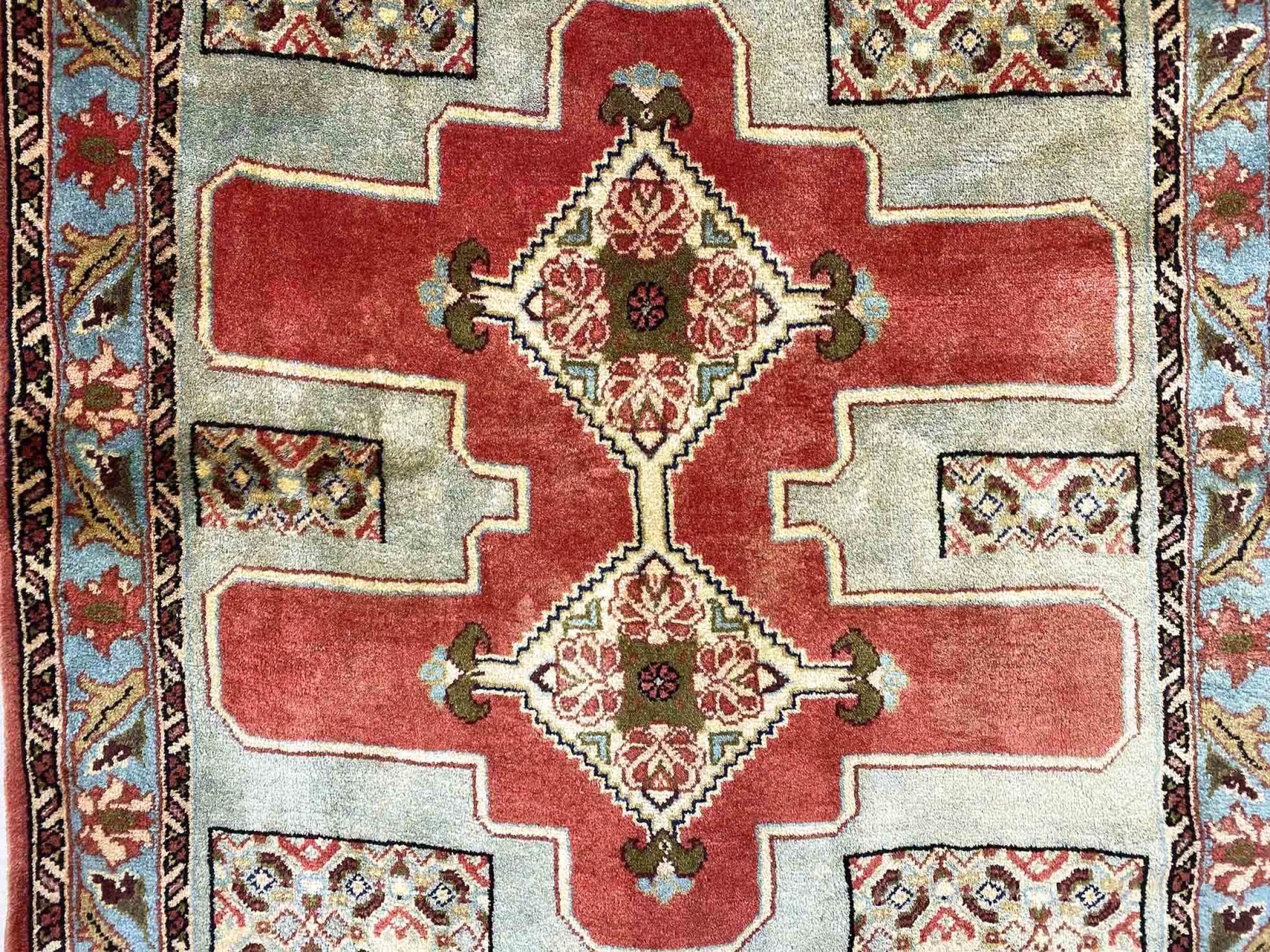 Tæppe-nr.: 317474009317606 Størrelse: 219x101 cm Tykkelse: ca. 12 mm Knuder: 200 000 - 250 000 / m² Forarbejdelse: Knyttet i hånden Luv: Håndspunden uld Kæde: Bomuld Oprindelse: Persien / Iran Alder: Ny Vægt: ca. 7 kg Antal på lager: Unik - Kun 1 tilbage på lager