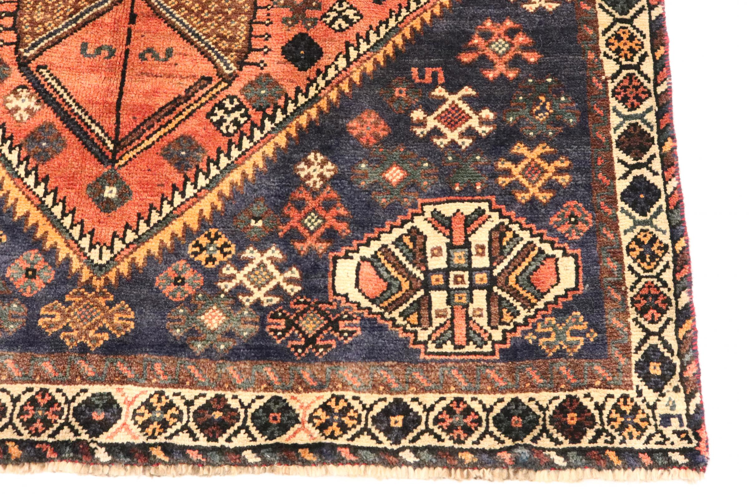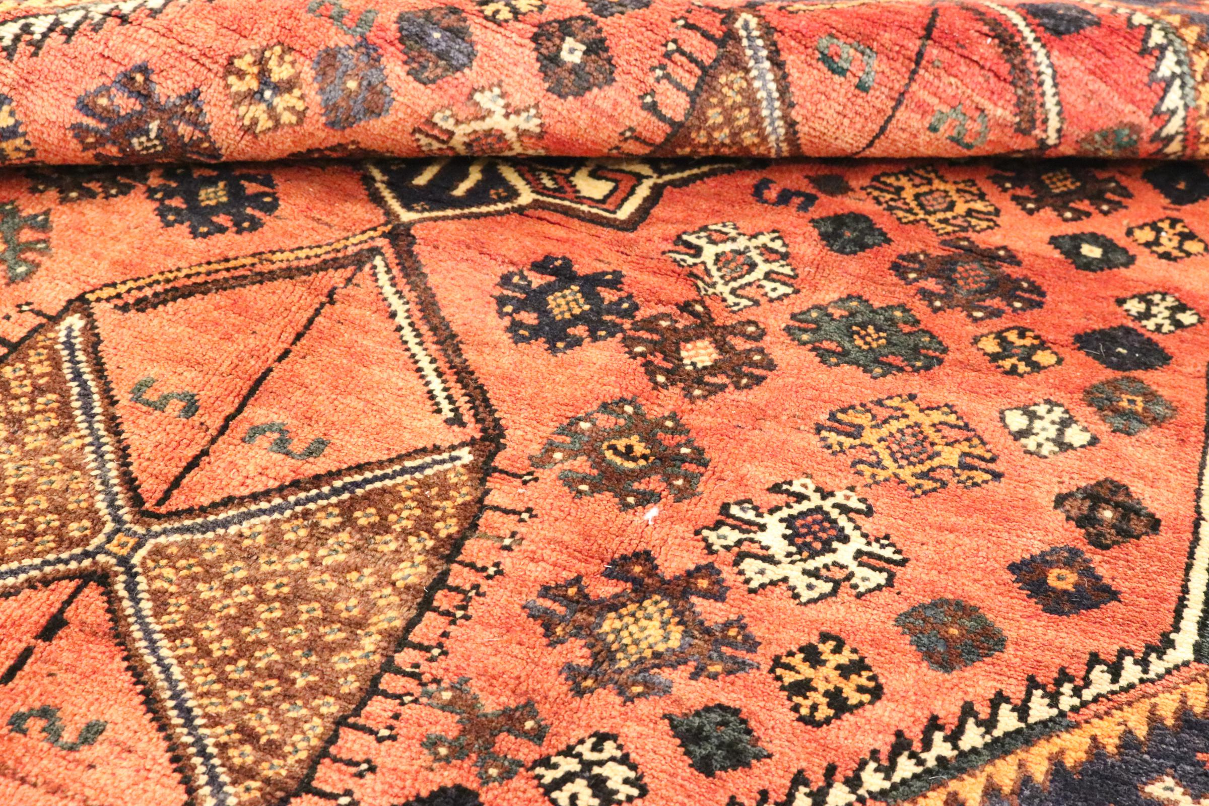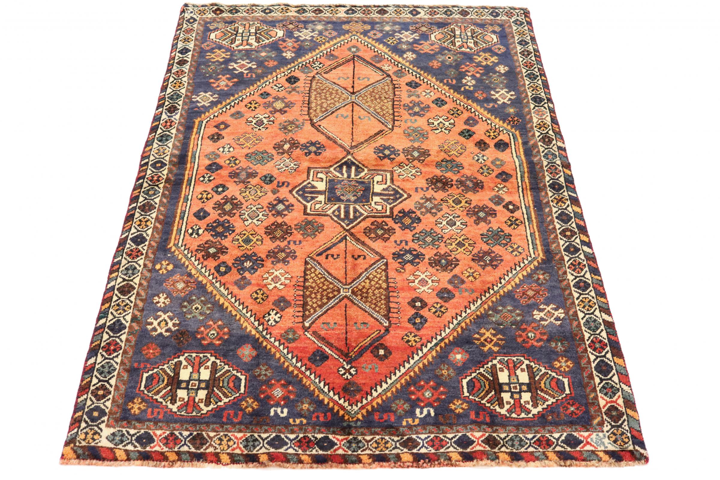 Dette Shiraz tæppe afspejler håndværk af nomader i Fars-provinsen. Bare dens enkle design, de smukke farver og den god kvalitet taler for ham, lige som dens lange liv. Dem som værdsætter persiske tæpper, vil elske en Shiraz.