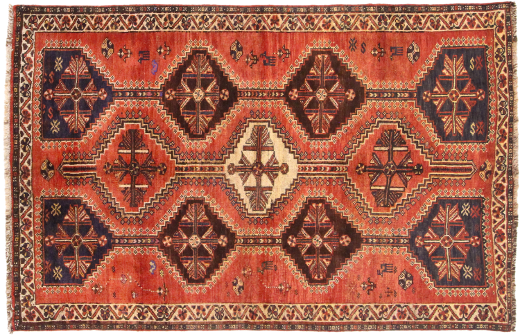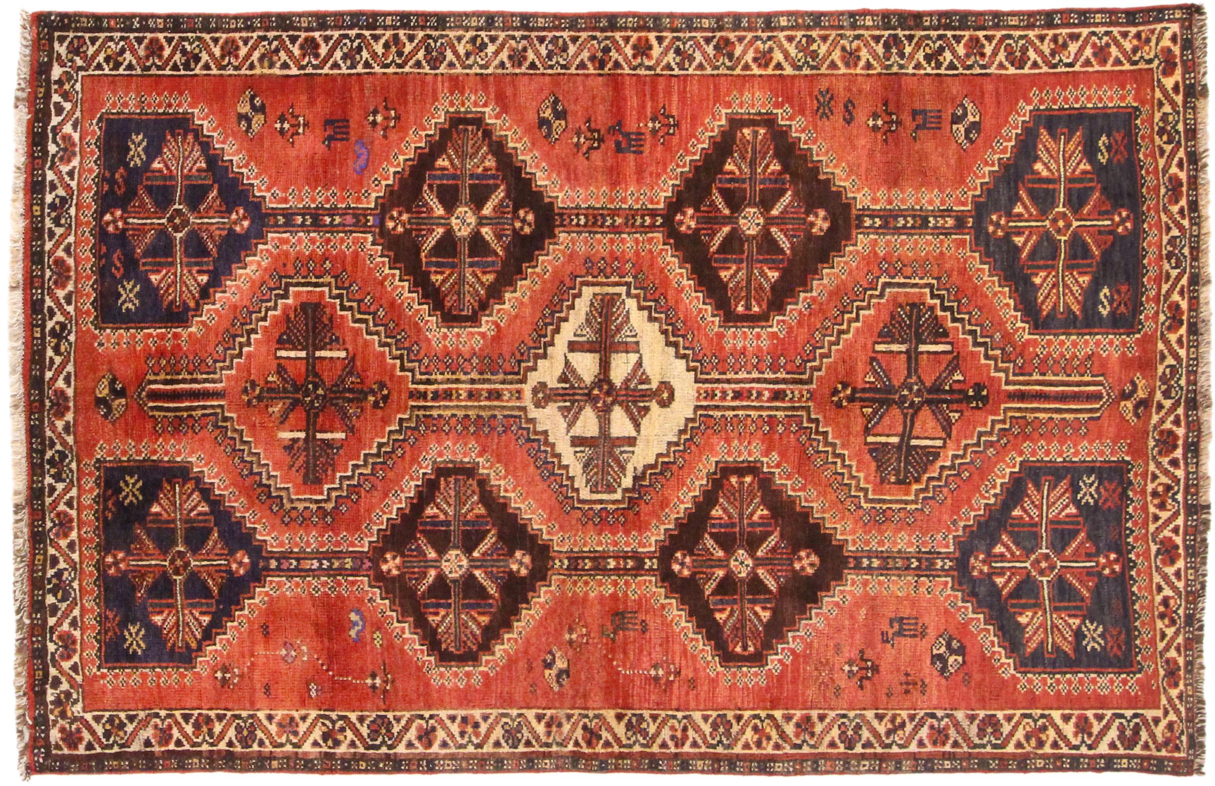 Dette Shiraz tæppe afspejler håndværk af nomader i Fars-provinsen. Bare dens enkle design, de smukke farver og den god kvalitet taler for ham, lige som dens lange liv. Dem som værdsætter persiske tæpper, vil elske en Shiraz.