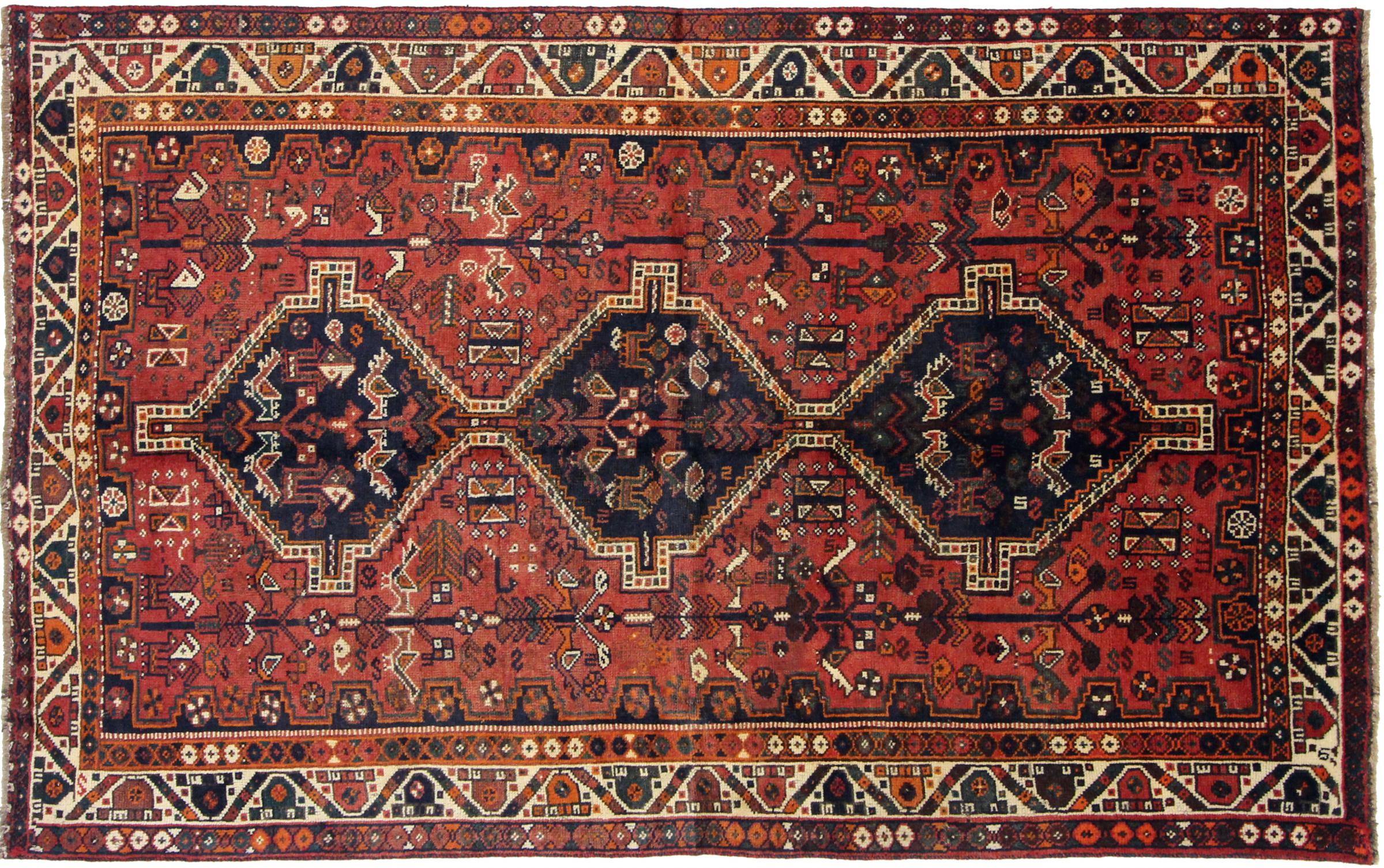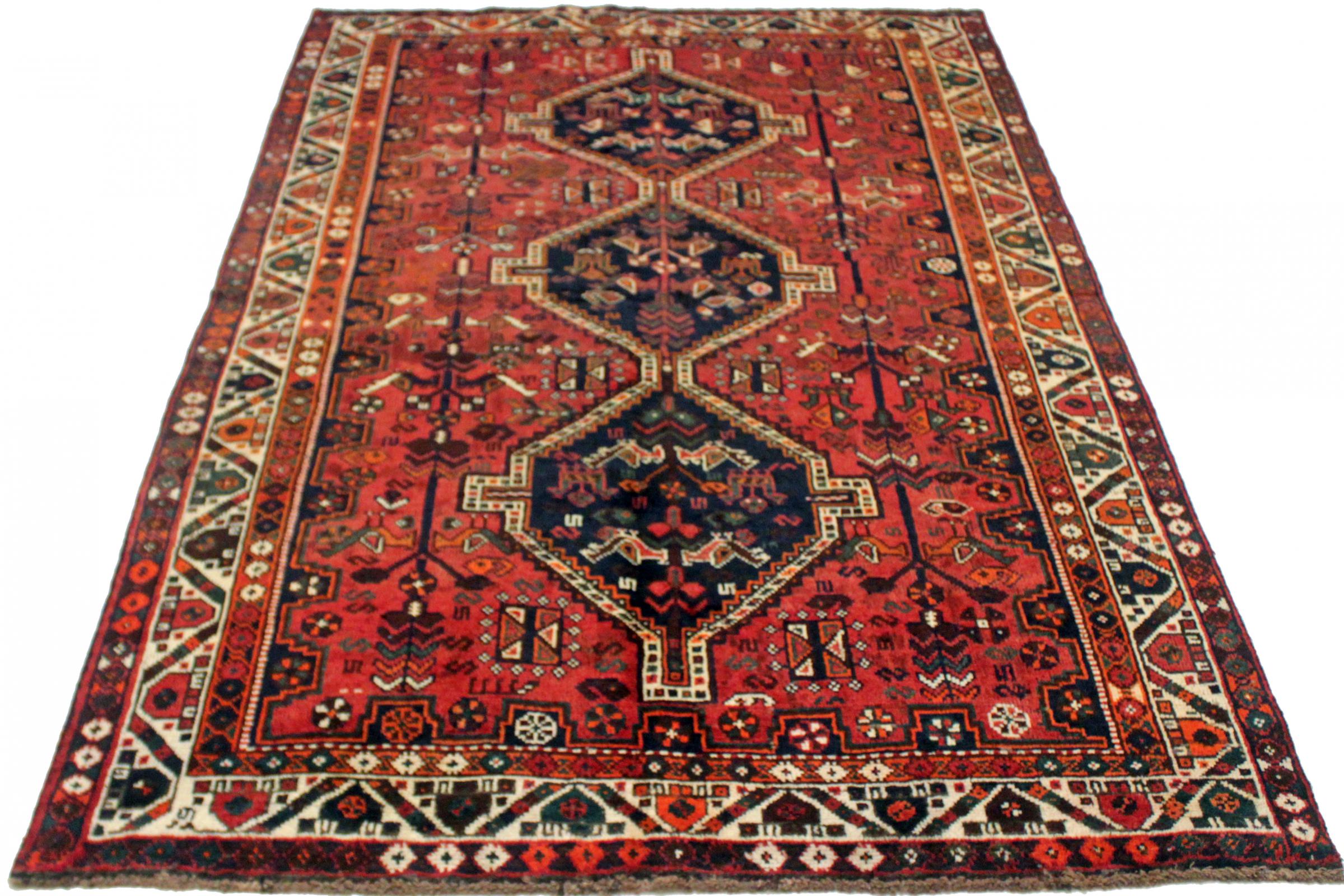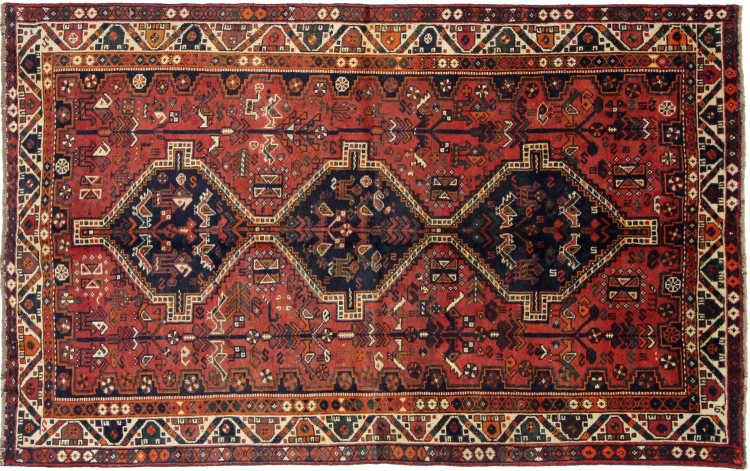 Dette Shiraz tæppe afspejler håndværk af nomader i Fars-provinsen. Bare dens enkle design, de smukke farver og den god kvalitet taler for ham, lige som dens lange liv. Dem som værdsætter persiske tæpper, vil elske en Shiraz.