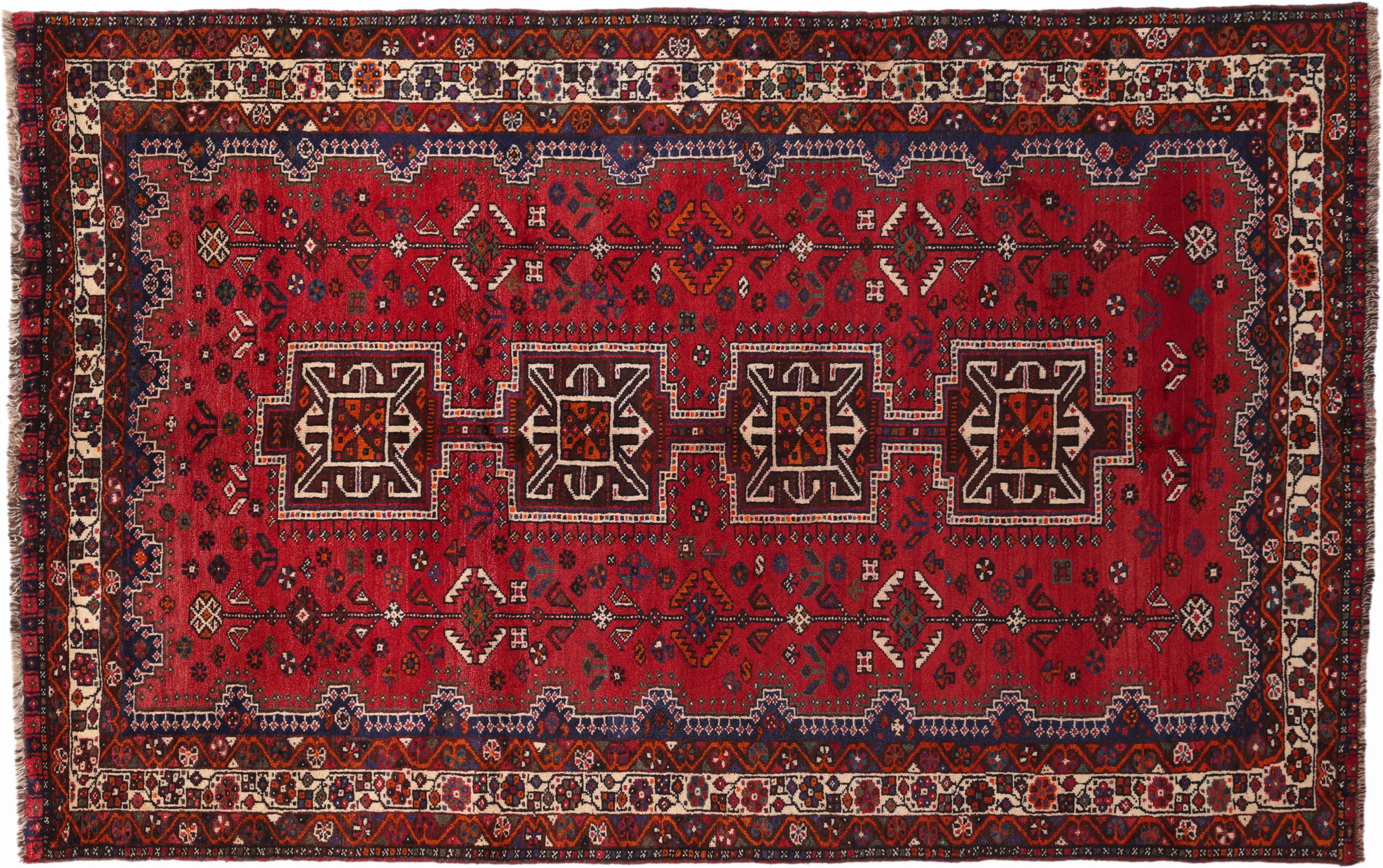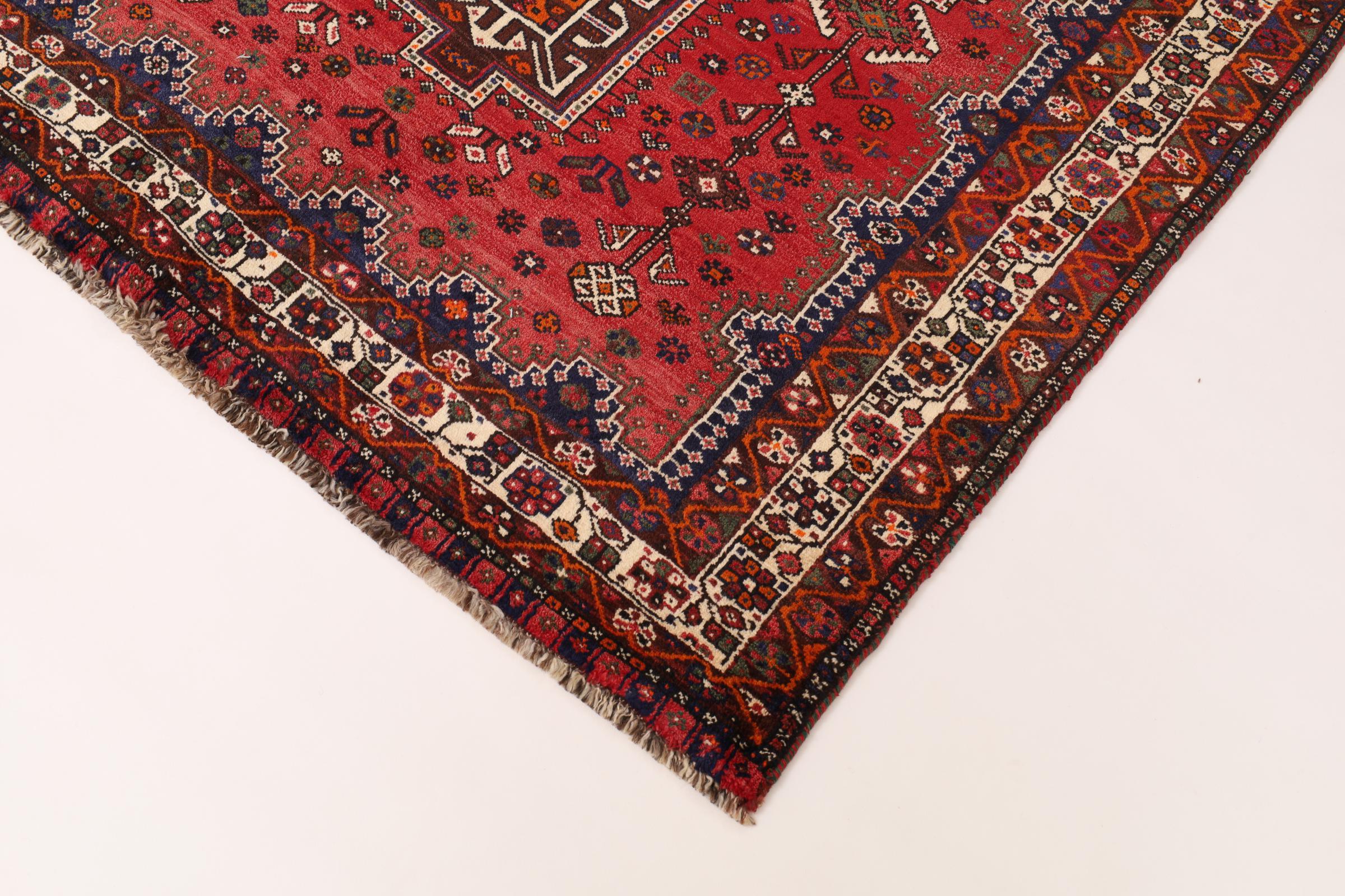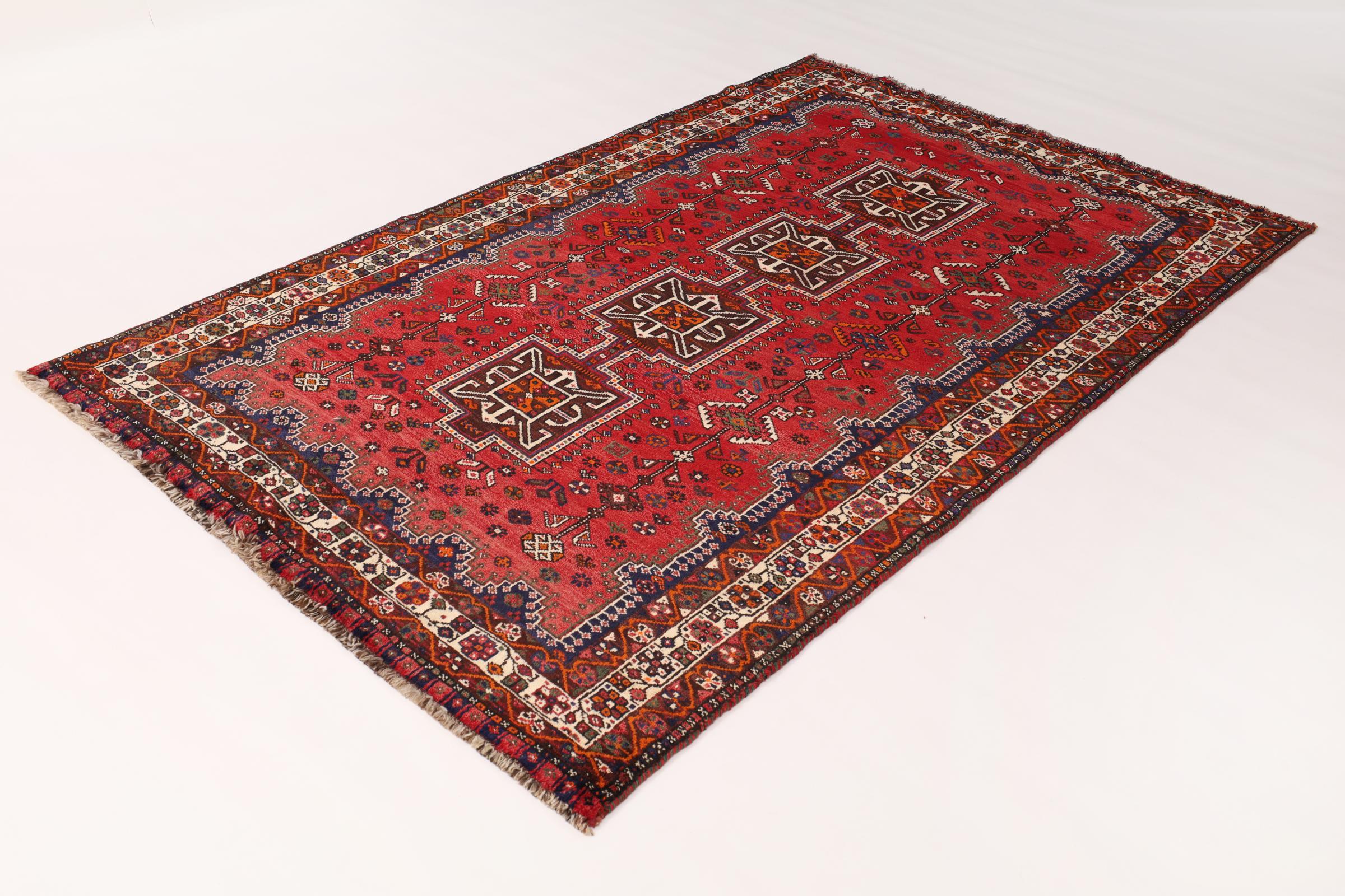 Dette Shiraz tæppe afspejler håndværk af nomader i Fars-provinsen. Bare dens enkle design, de smukke farver og den god kvalitet taler for ham, lige som dens lange liv. Dem som værdsætter persiske tæpper, vil elske en Shiraz.