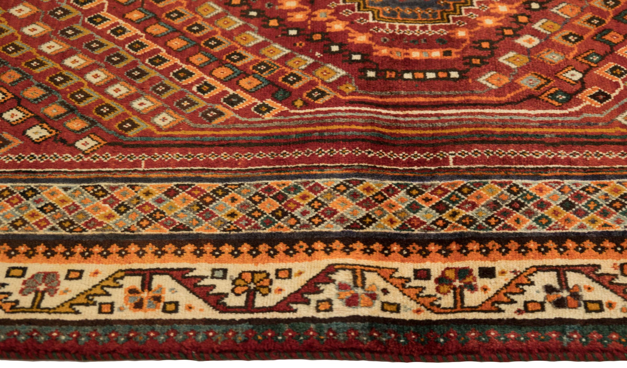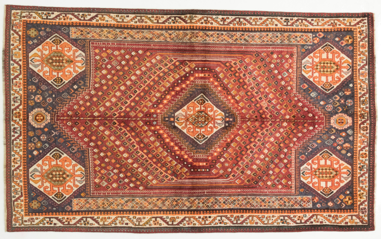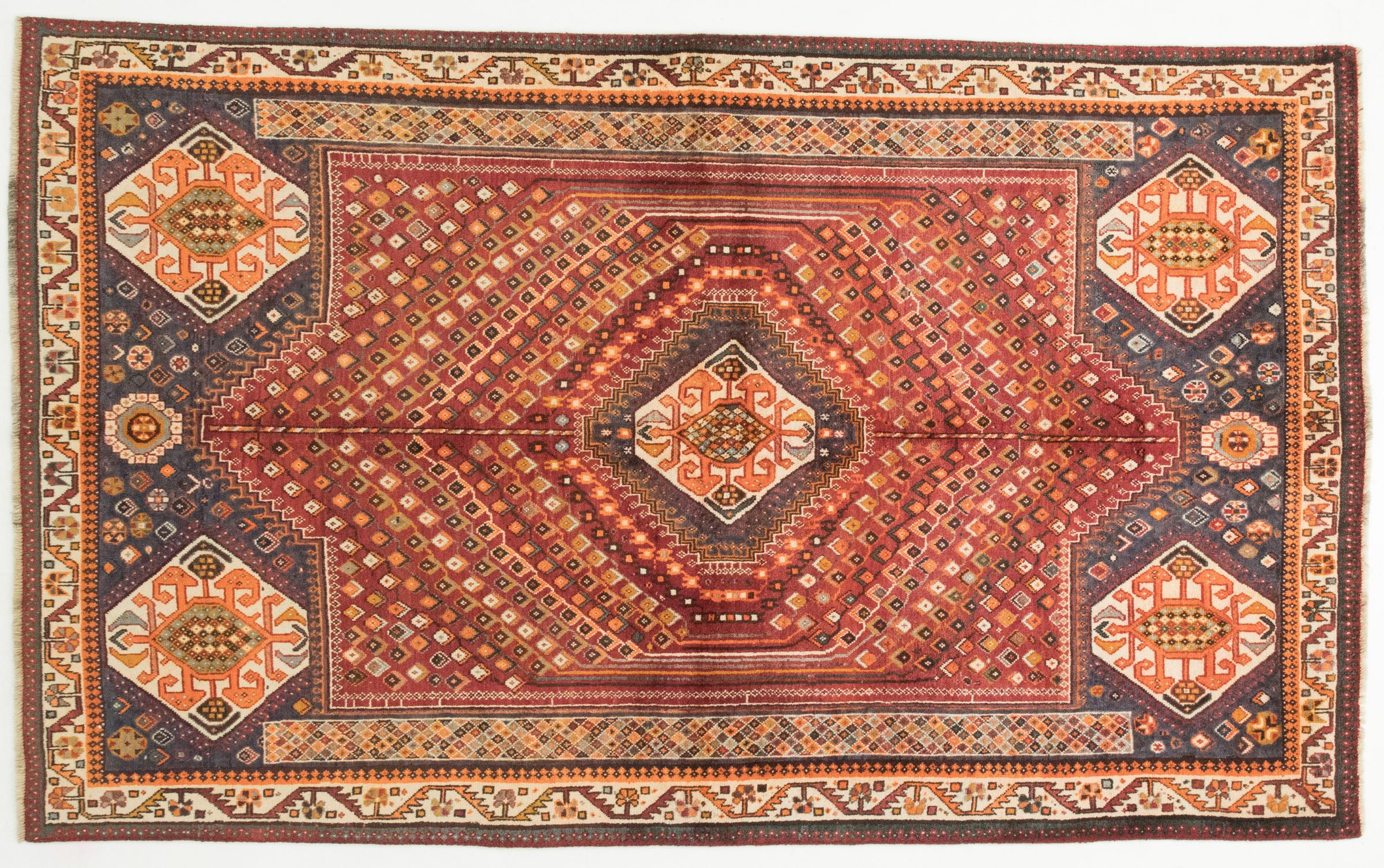Dette Shiraz tæppe afspejler håndværk af nomader i Fars-provinsen. Bare dens enkle design, de smukke farver og den god kvalitet taler for ham, lige som dens lange liv. Dem som værdsætter persiske tæpper, vil elske en Shiraz.