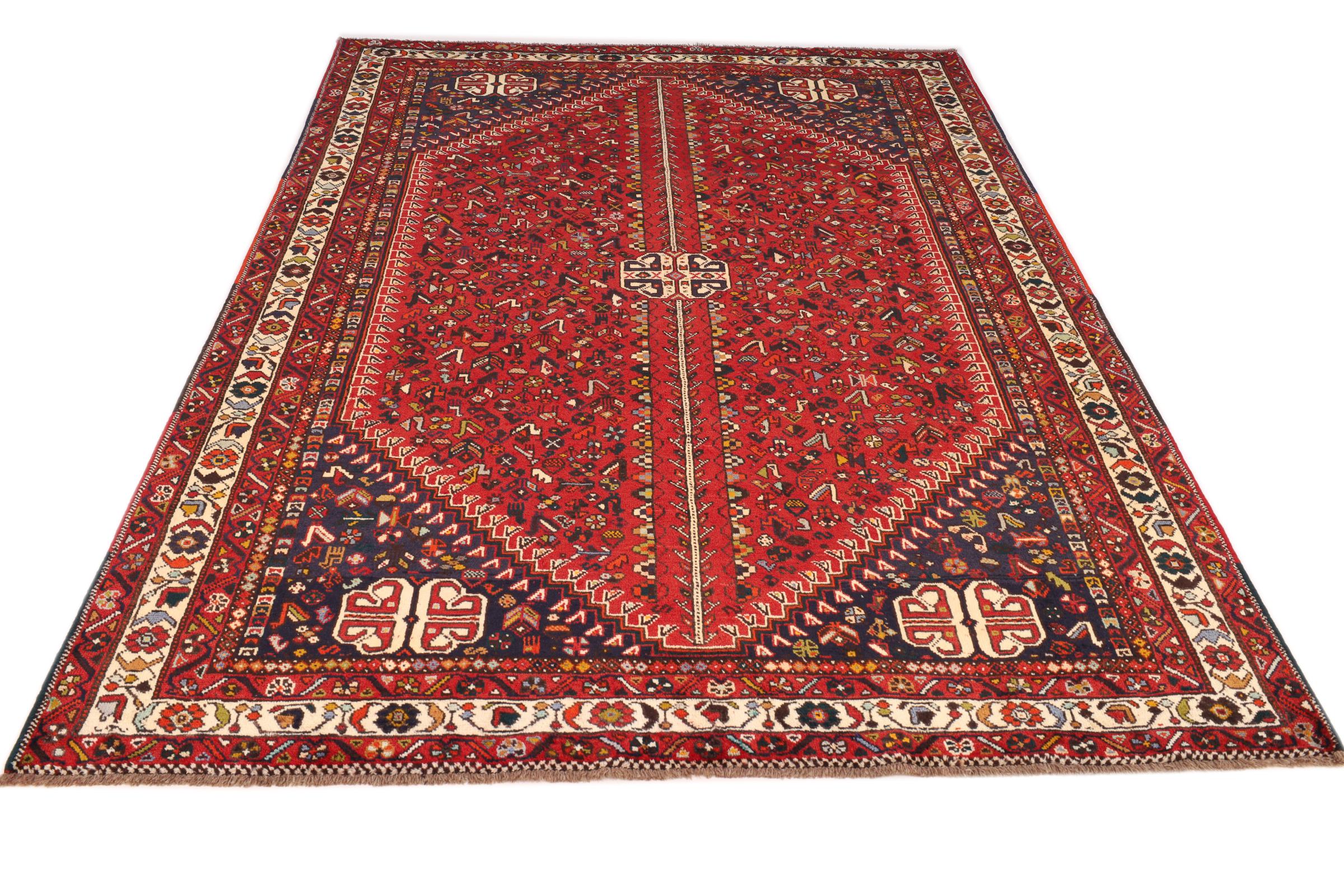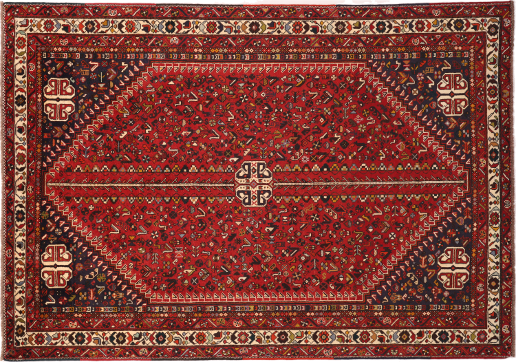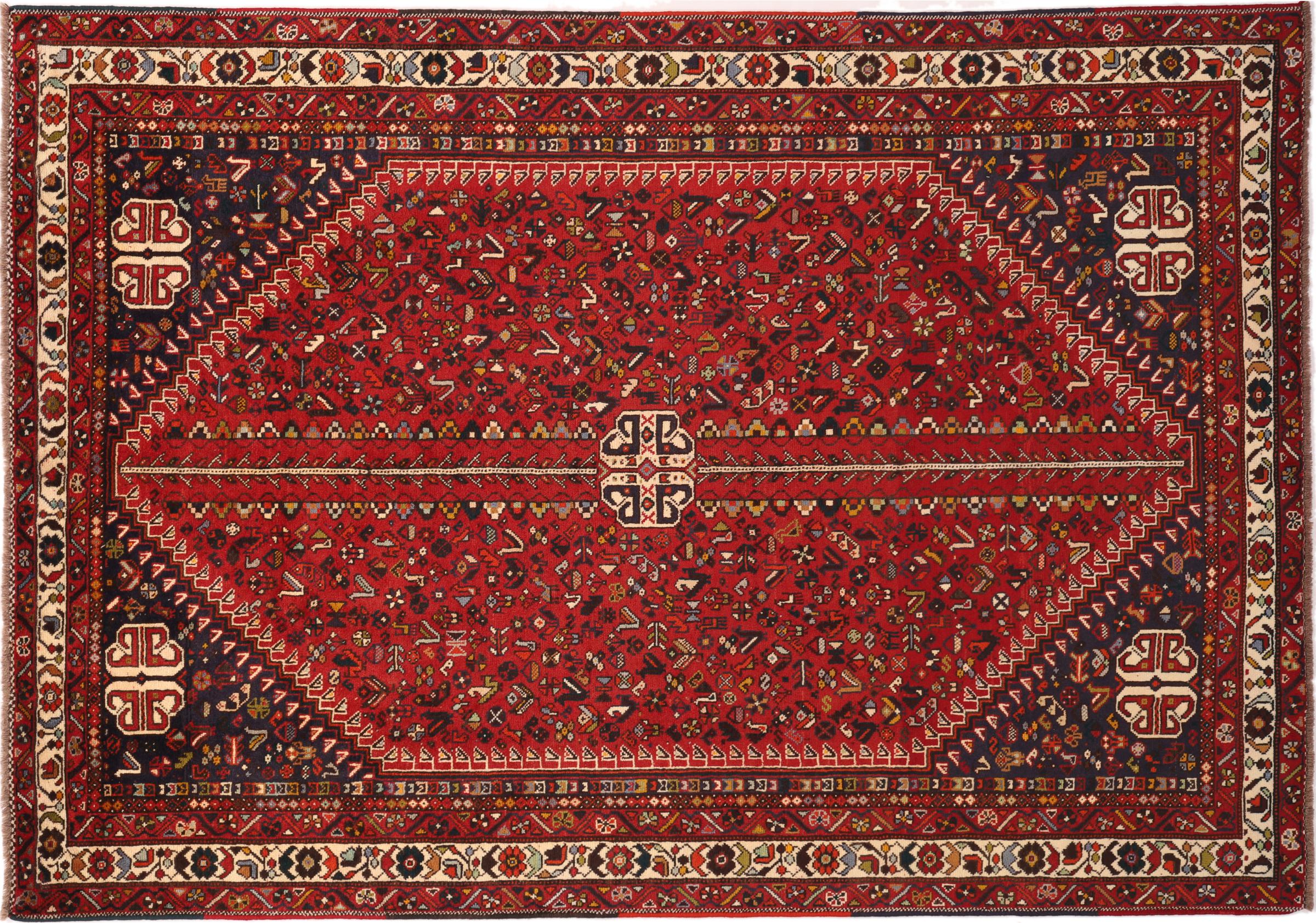 Dette Shiraz tæppe afspejler håndværk af nomader i Fars-provinsen. Bare dens enkle design, de smukke farver og den god kvalitet taler for ham, lige som dens lange liv. Dem som værdsætter persiske tæpper, vil elske en Shiraz.
