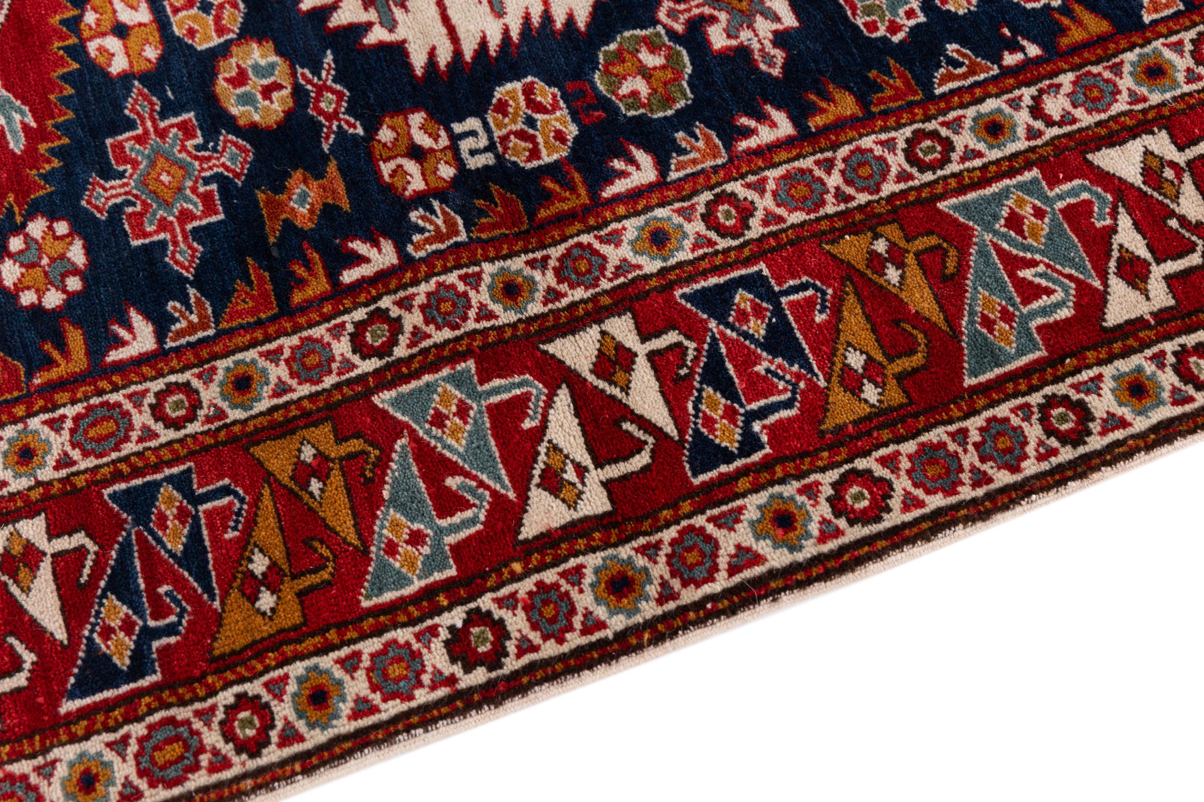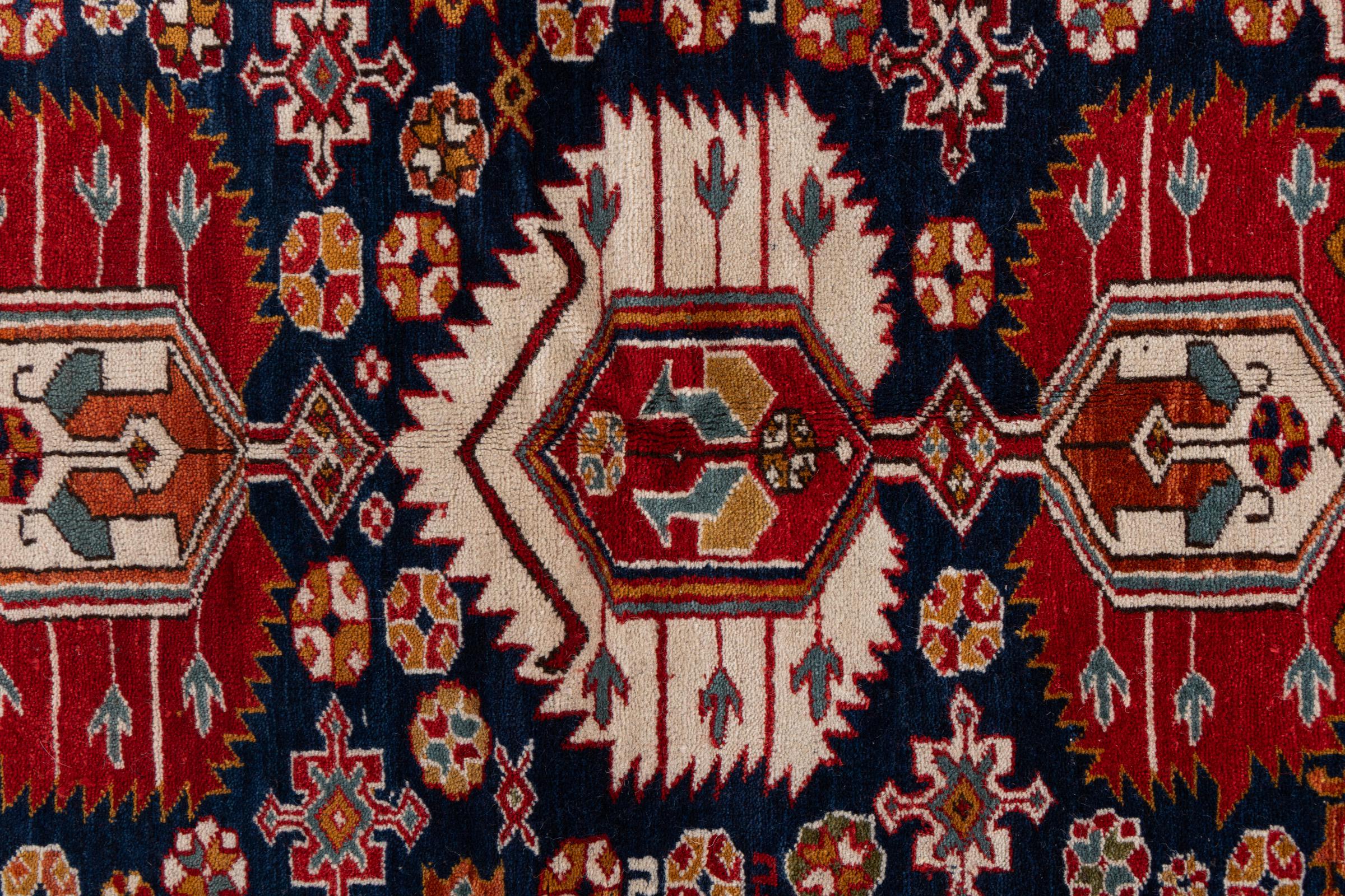 Denne håndknyttede Shirvan er en meget robust tæppe fra det østlige Kaukasus, der med sine pragtfulde farver og smukke dekorative elementer forkæler øjnene. Takket være dens tætte vævning, at levetiden er meget lang.