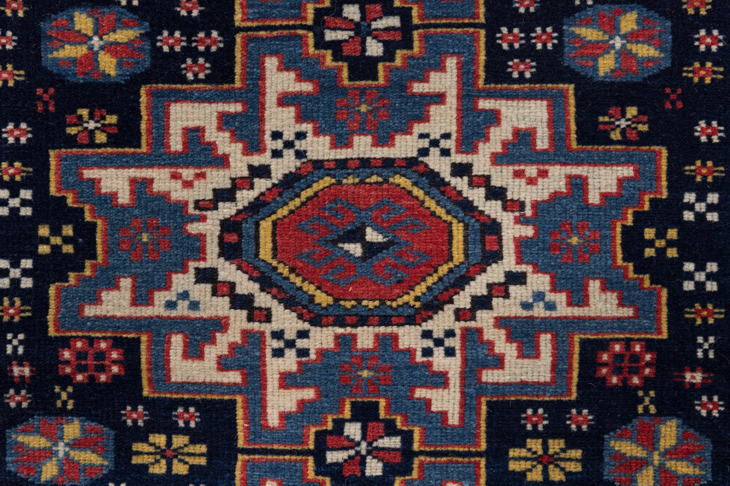 Denne håndknyttede Shirvan er en meget robust tæppe fra det østlige Kaukasus, der med sine pragtfulde farver og smukke dekorative elementer forkæler øjnene. Takket være dens tætte vævning, at levetiden er meget lang.