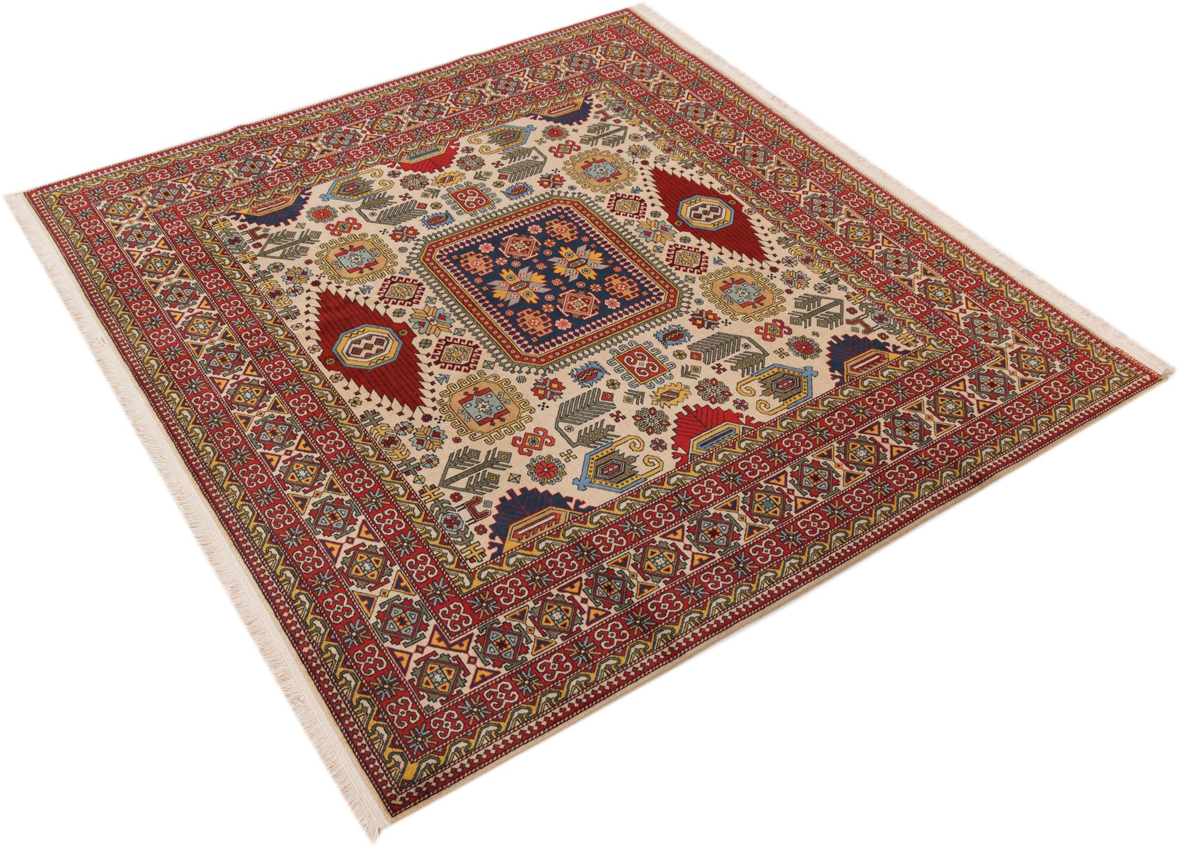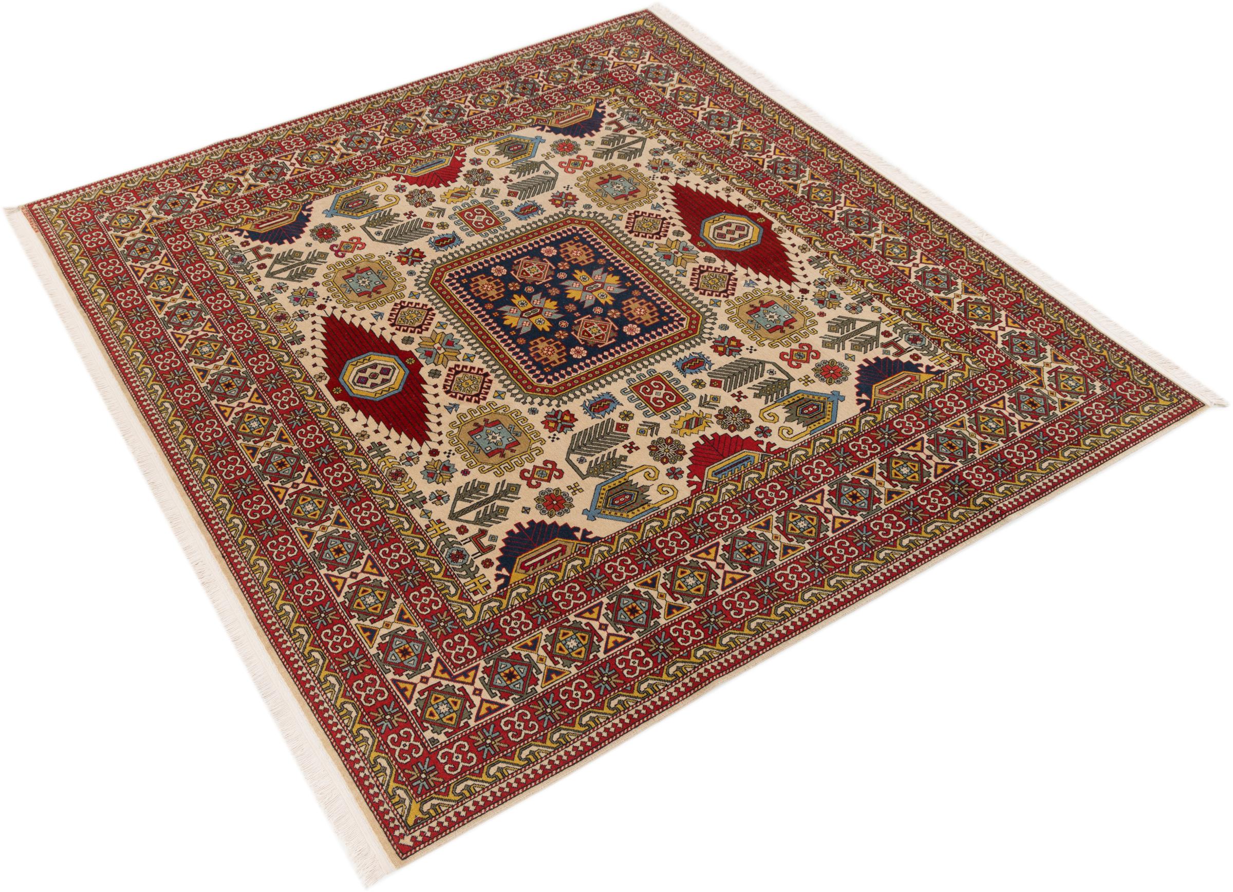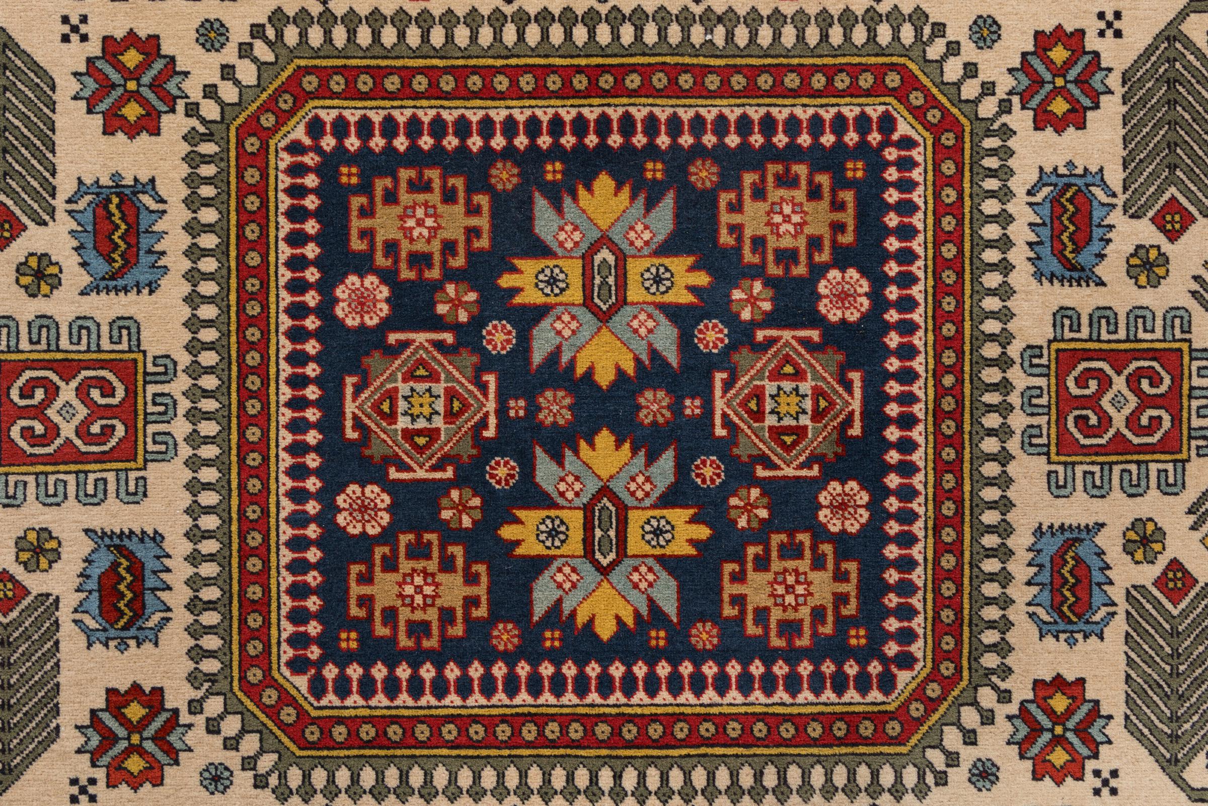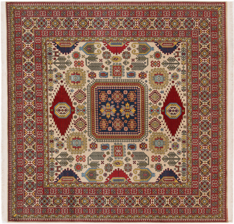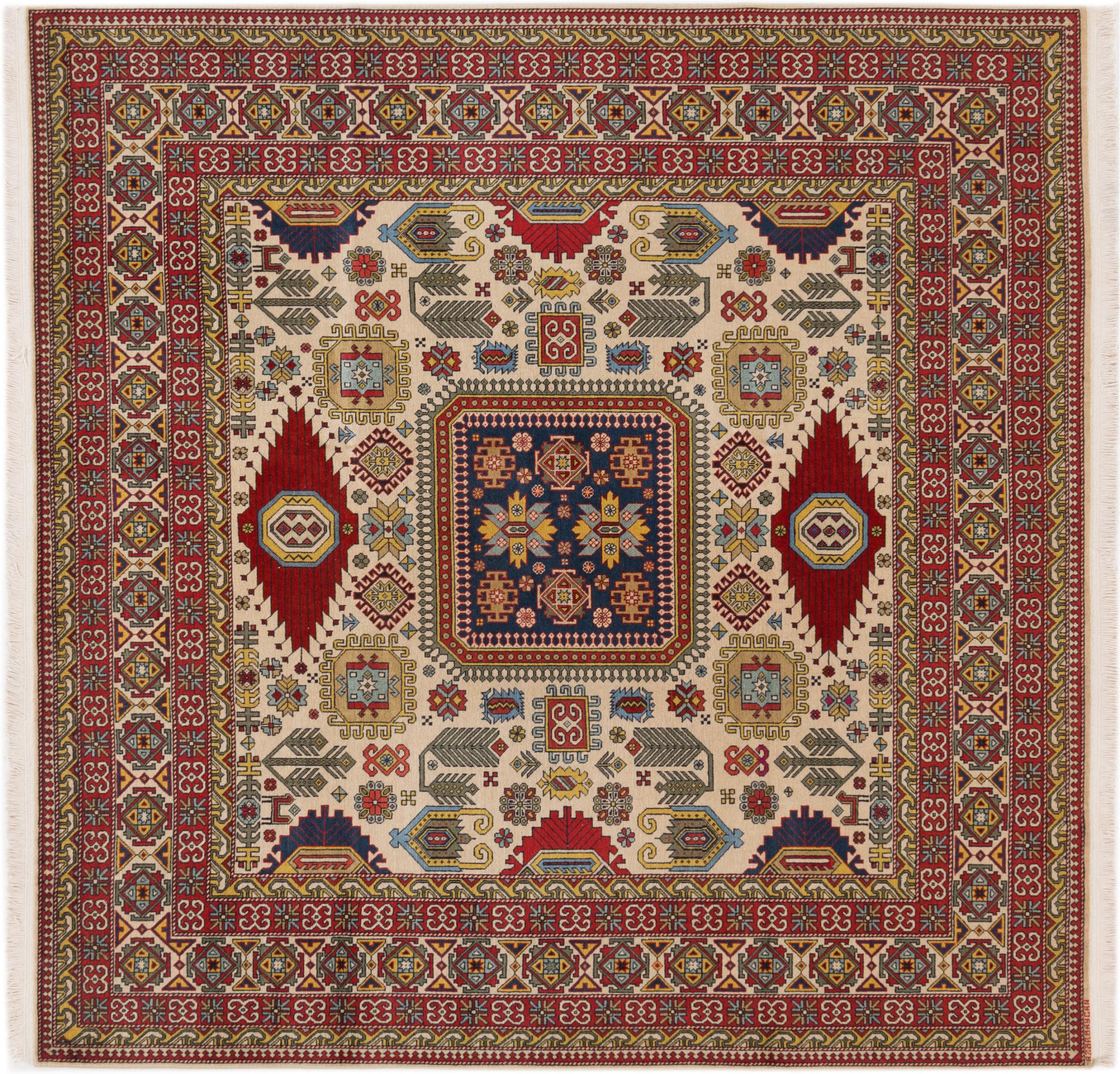 Tæppe-nr.: 296282001964 Størrelse: 197x200 cm Tykkelse: ca. 12 mm Knuder: 200 000 - 250 000 / m² Forarbejdelse: Knyttet i hånden Luv: Håndspunden uld Kæde: Bomuld Oprindelse: Azerbaijan / Rusland Alder: Ny Vægt: ca. 12 kg Også kendt som Afghan Shirvan, Kaukasisch Antal på lager: Unik - Kun 1 tilbage på lager