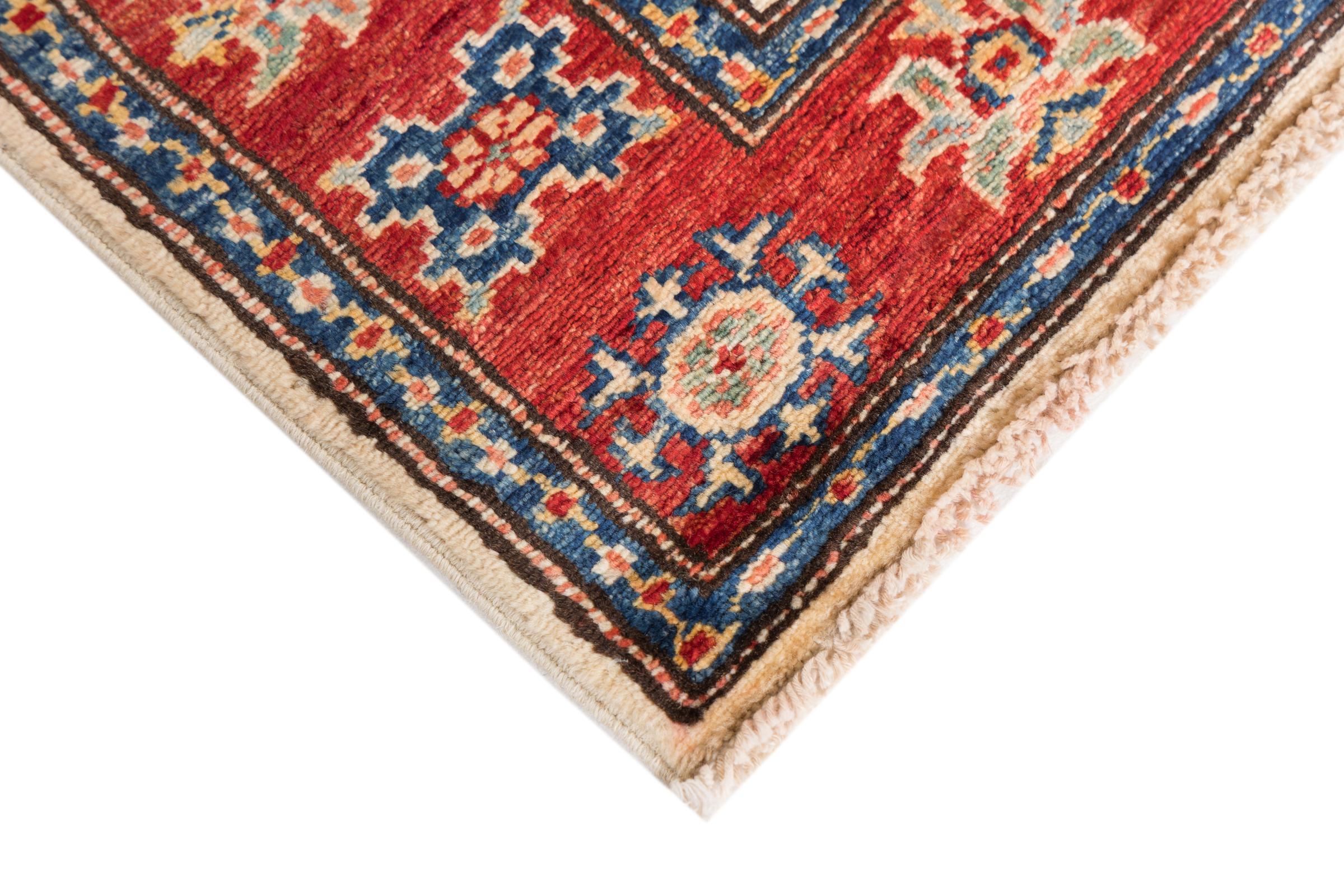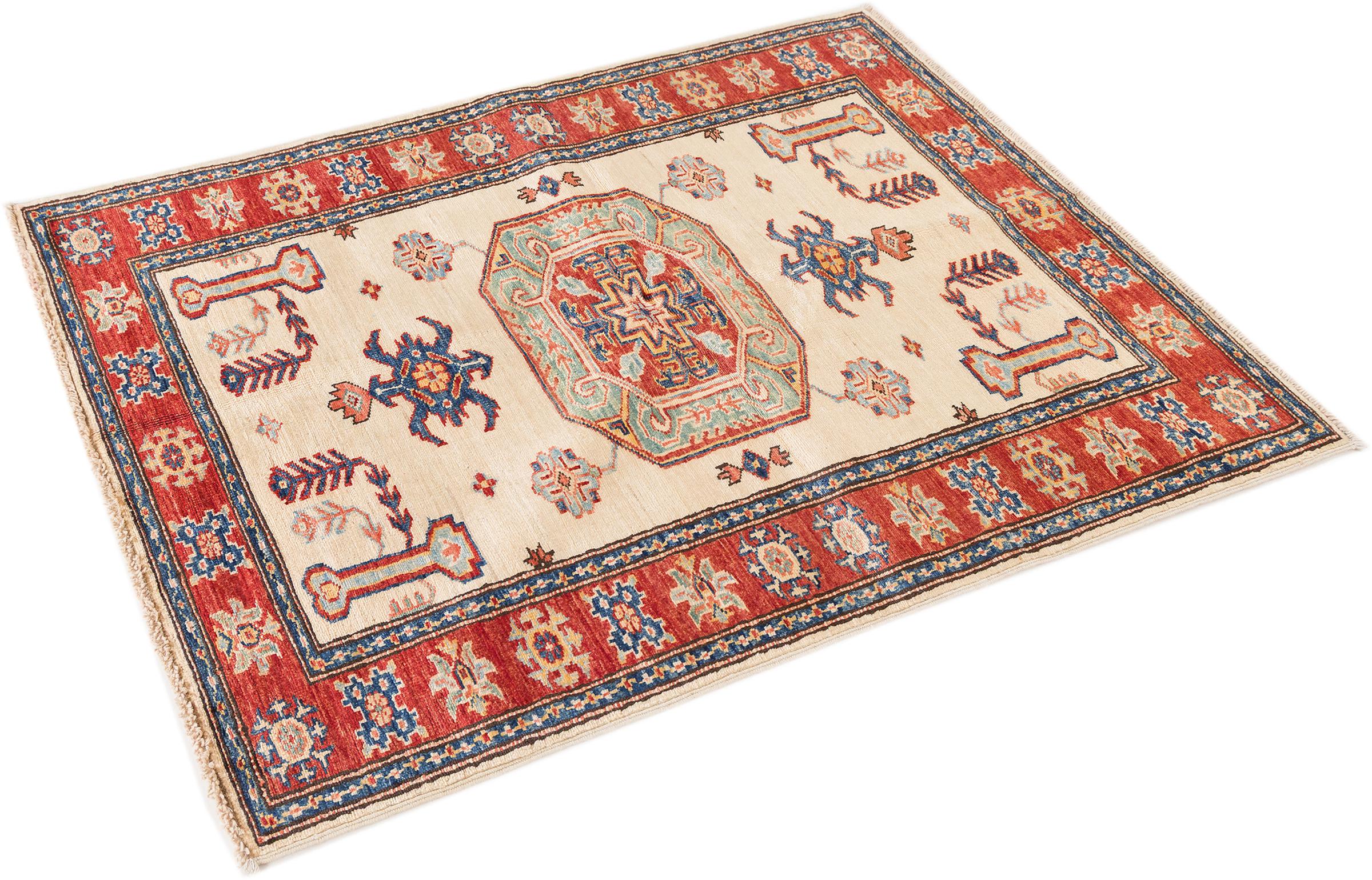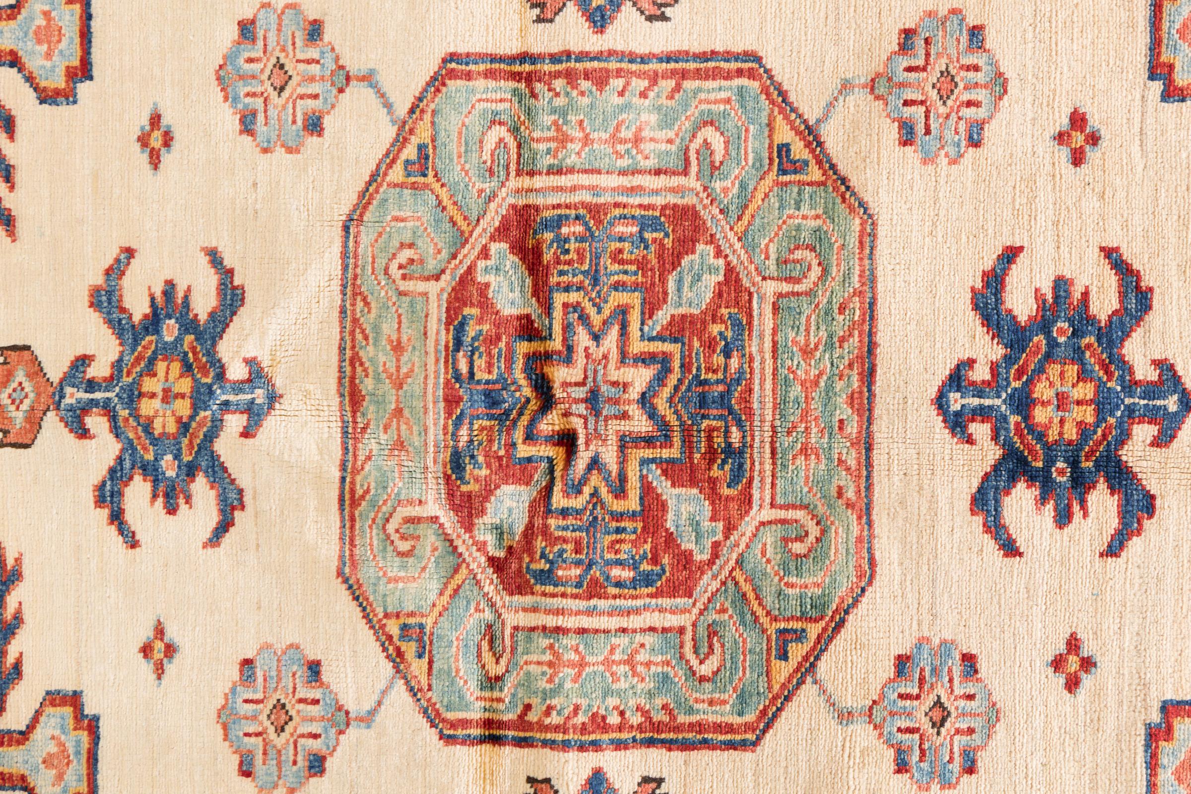 Dette håndknyttede Kazak er håndknyttet i stil med kaukasiske tæpper og imponerer med sin høje robusthed og levende farver. Det afspejler således kulturen i Kaukasus i en smuk komposition. En kultur, der i århundreder har mestret kunsten at væve tæpper og præsenterer den for omverdenen med charmerende enkle former i imponerende levende farver.