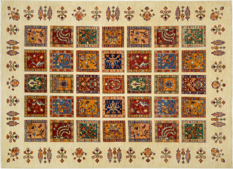 Tæppe-nr.: 303552001307281 Størrelse: 234x176 cm Tykkelse: ca. 5 mm Knuder: 128 000 - 160 000 / m² Forarbejdelse: Knyttet i hånden Luv: Håndspunden uld Kæde: Bomuld Oprindelse: Afghanistan Alder: Ny Vægt: ca. 14 kg Antal på lager: Unik - Kun 1 tilbage på lager
