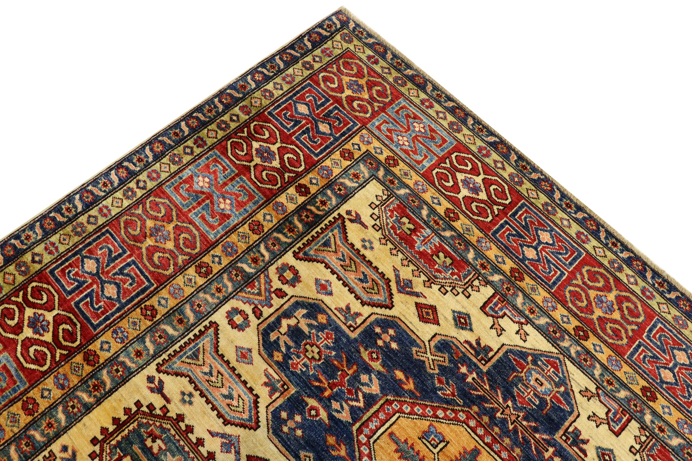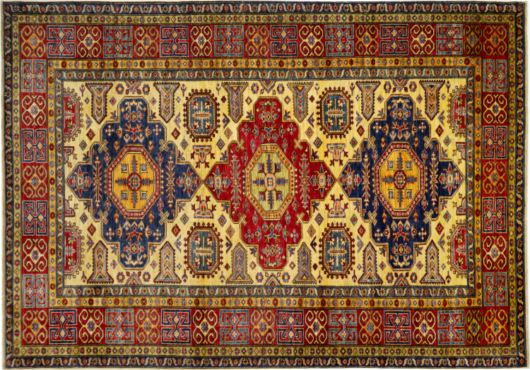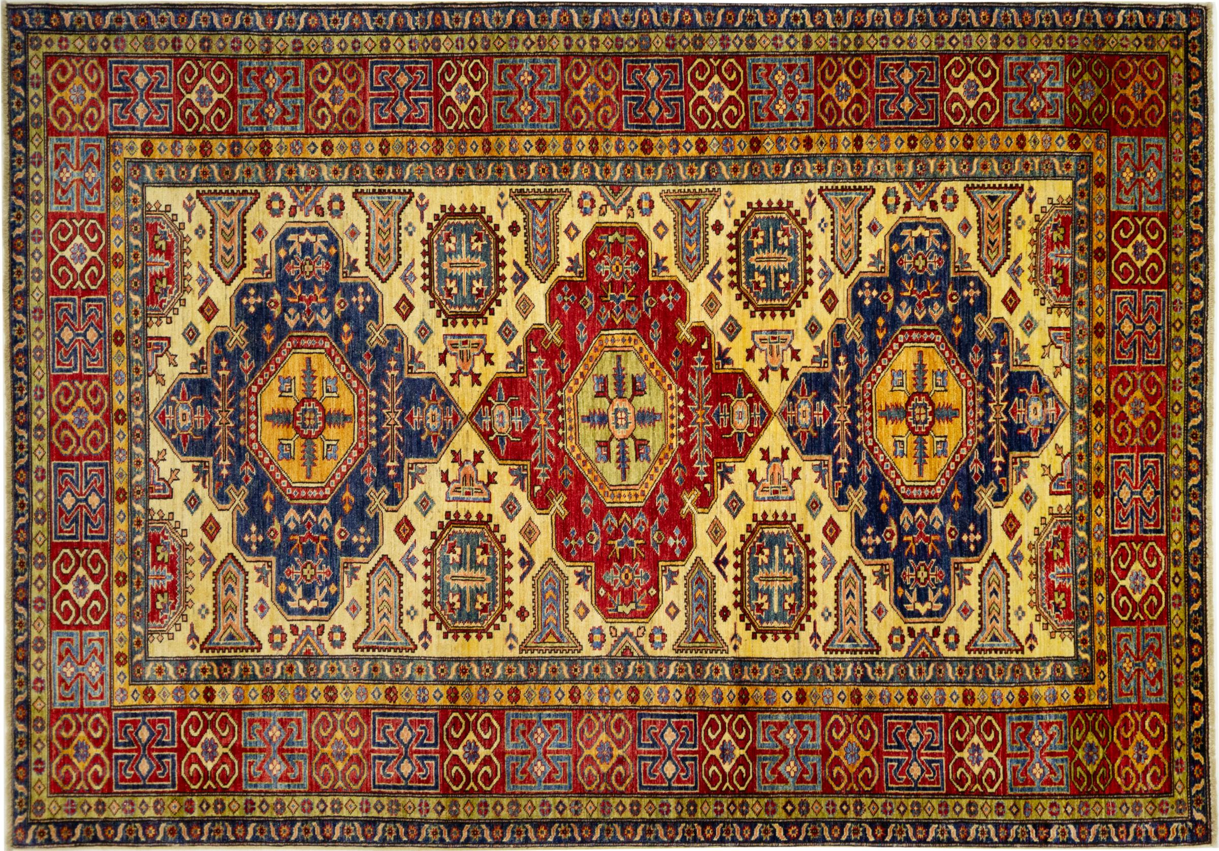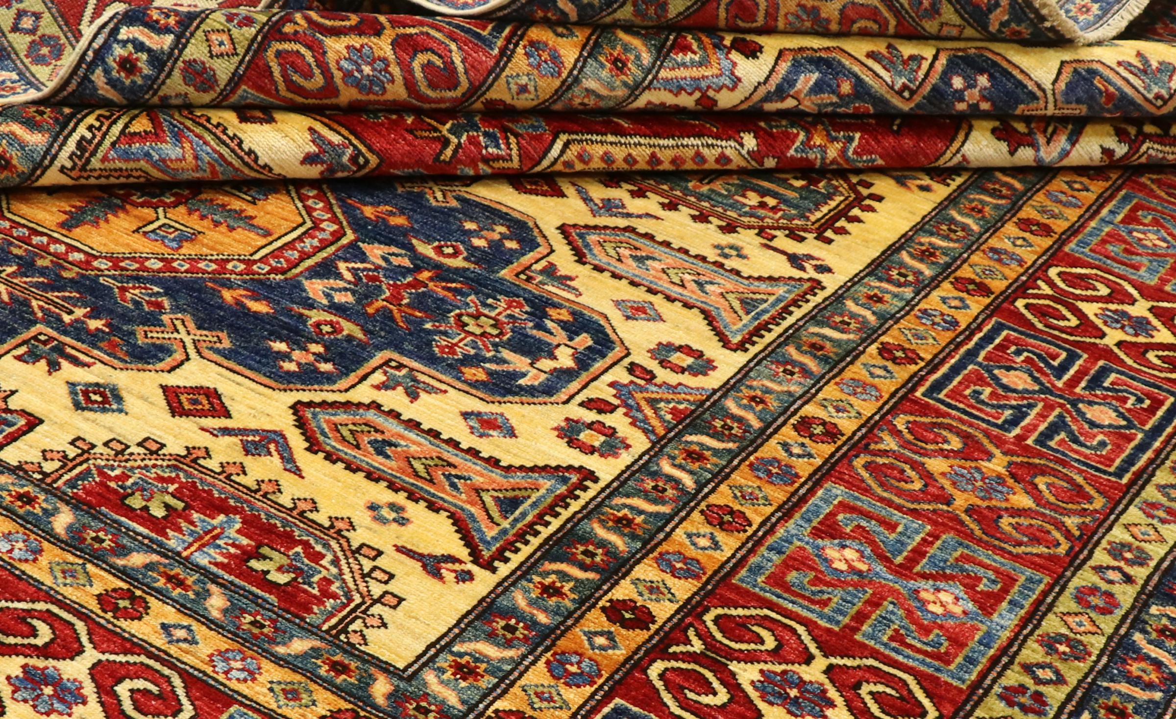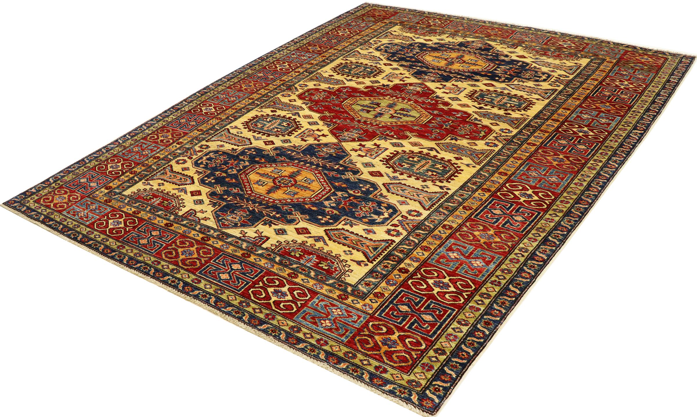 Dette håndknyttede Kazak er håndknyttet i stil med kaukasiske tæpper og imponerer med sin høje robusthed og levende farver. Det afspejler således kulturen i Kaukasus i en smuk komposition. En kultur, der i århundreder har mestret kunsten at væve tæpper og præsenterer den for omverdenen med charmerende enkle former i imponerende levende farver.