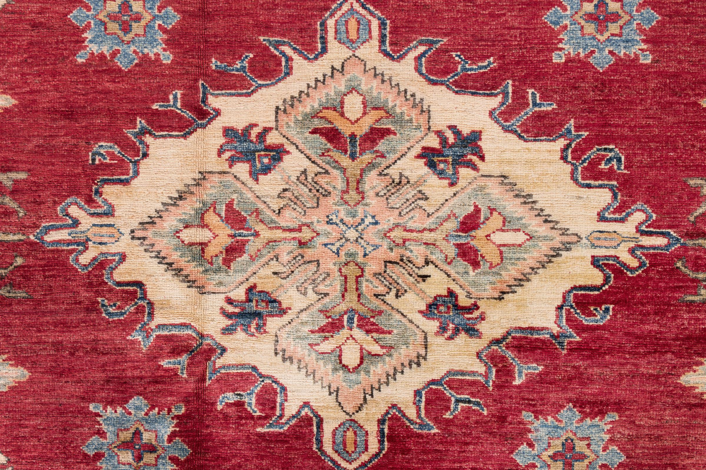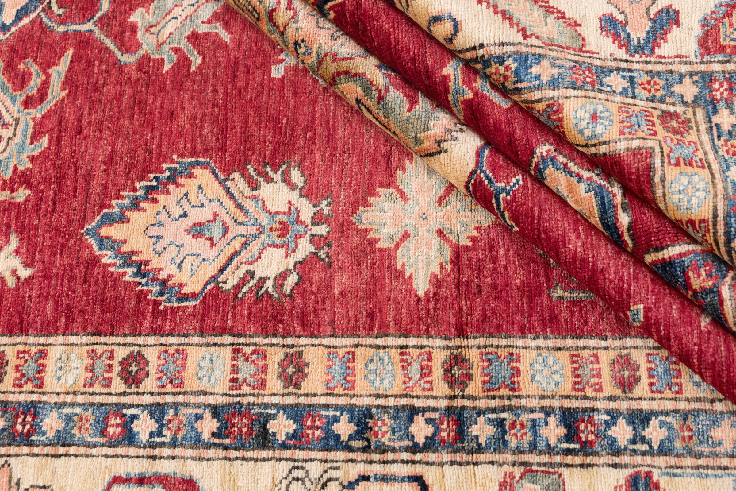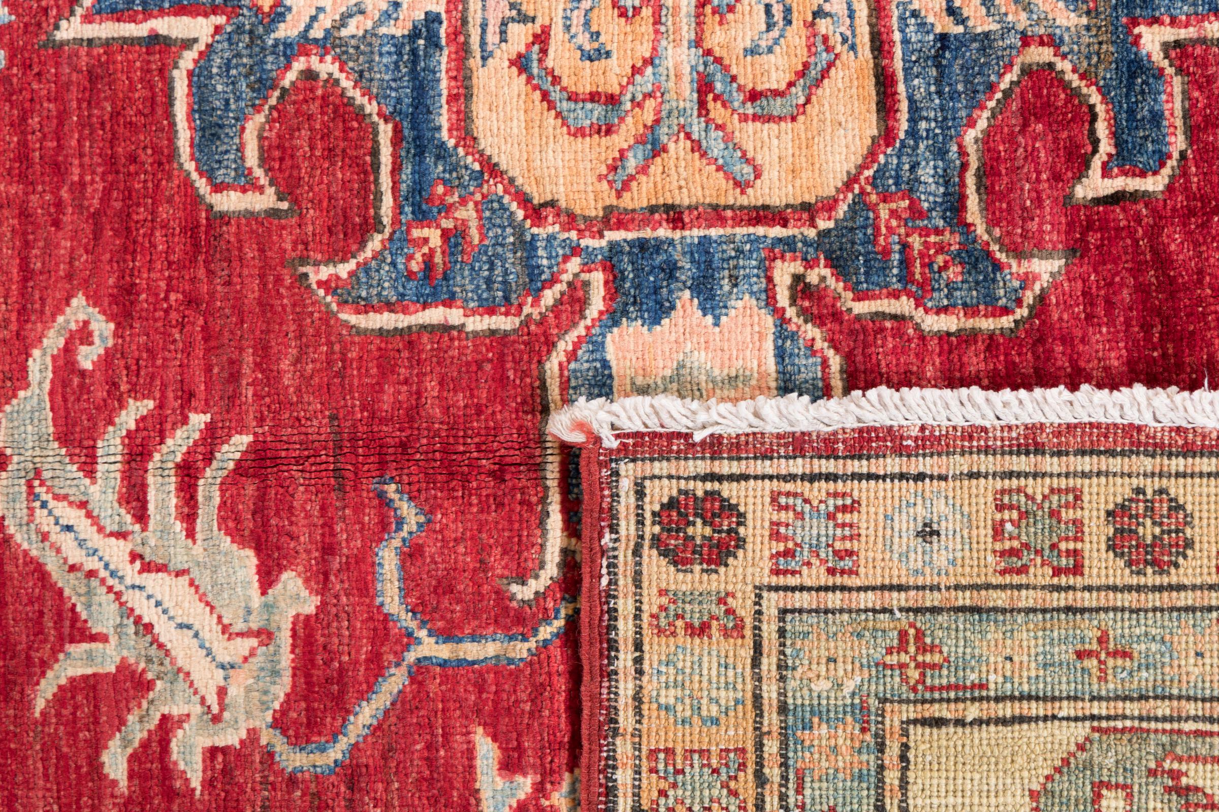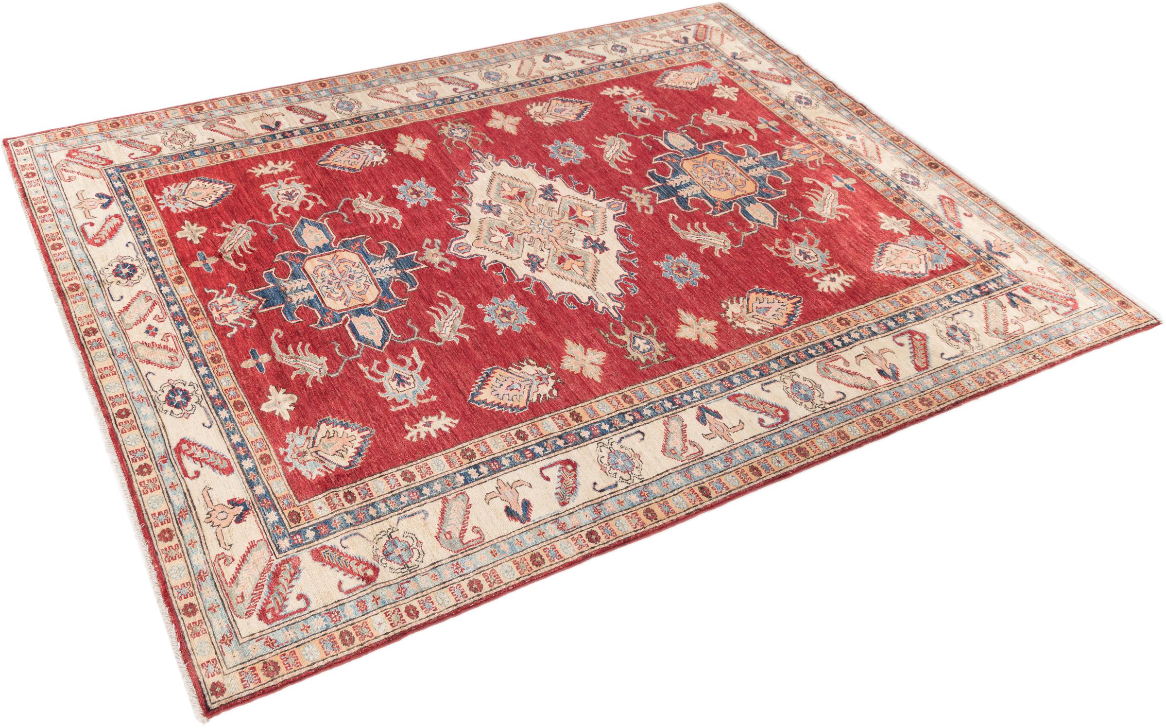 Dette håndknyttede Kazak er håndknyttet i stil med kaukasiske tæpper og imponerer med sin høje robusthed og levende farver. Det afspejler således kulturen i Kaukasus i en smuk komposition. En kultur, der i århundreder har mestret kunsten at væve tæpper og præsenterer den for omverdenen med charmerende enkle former i imponerende levende farver.